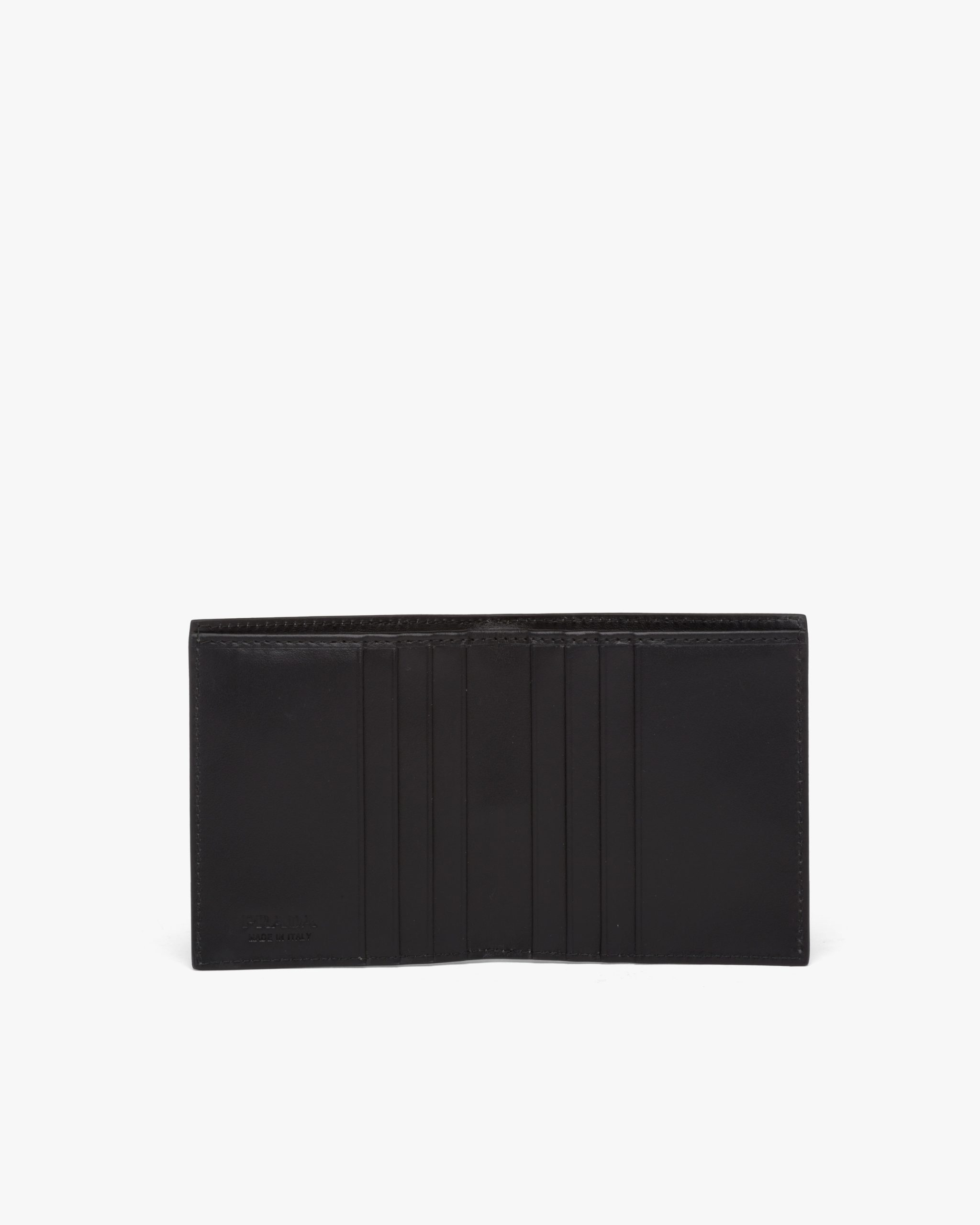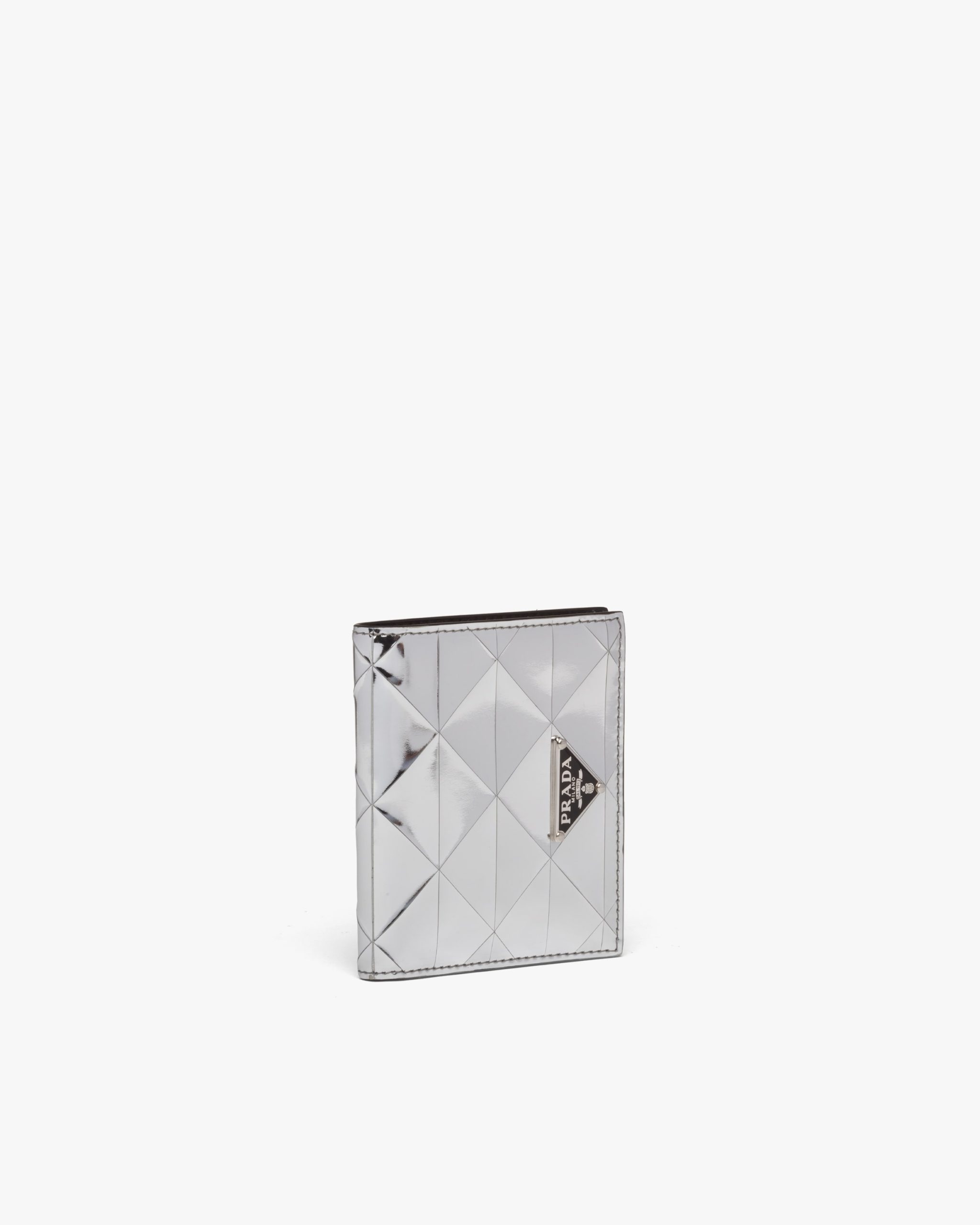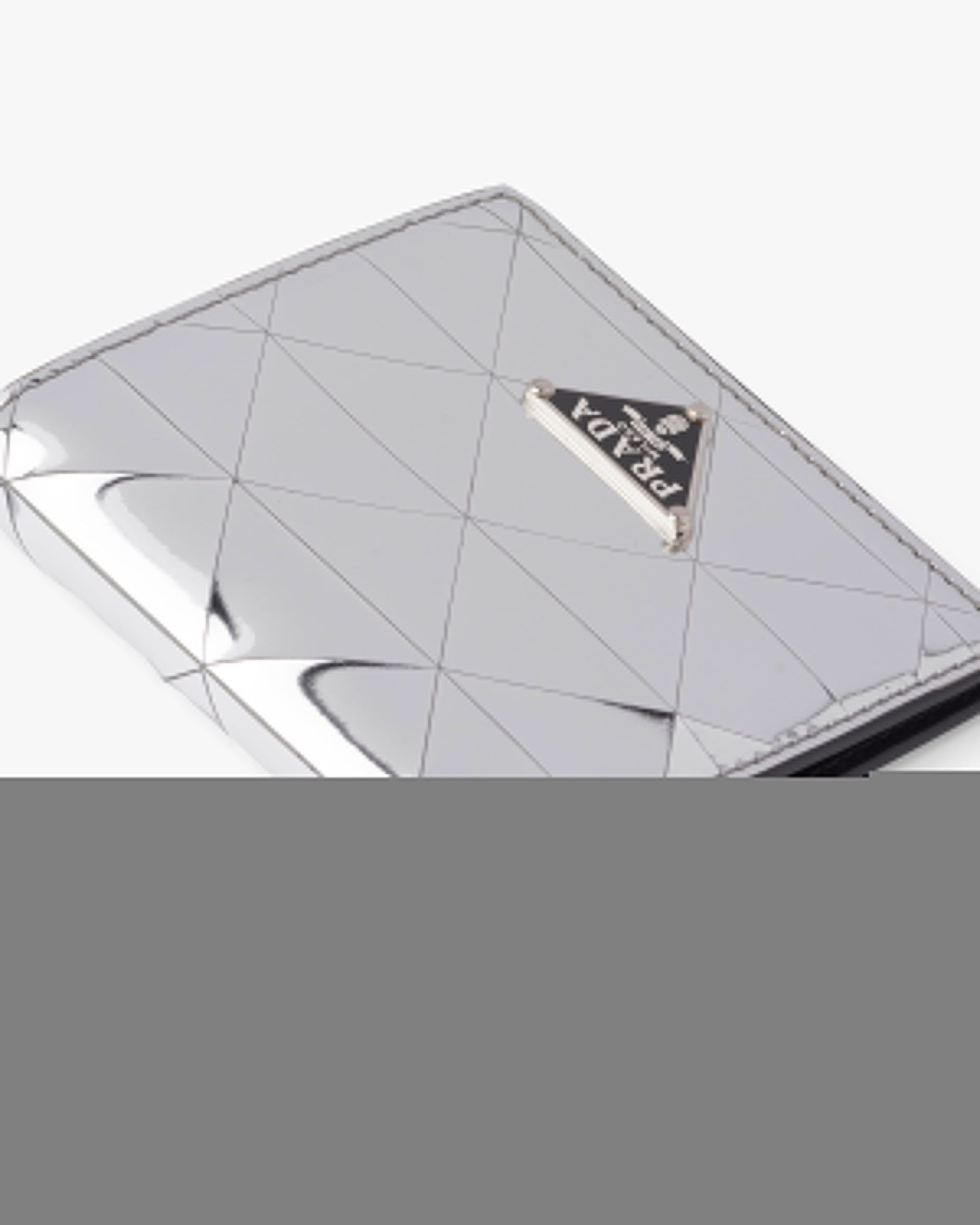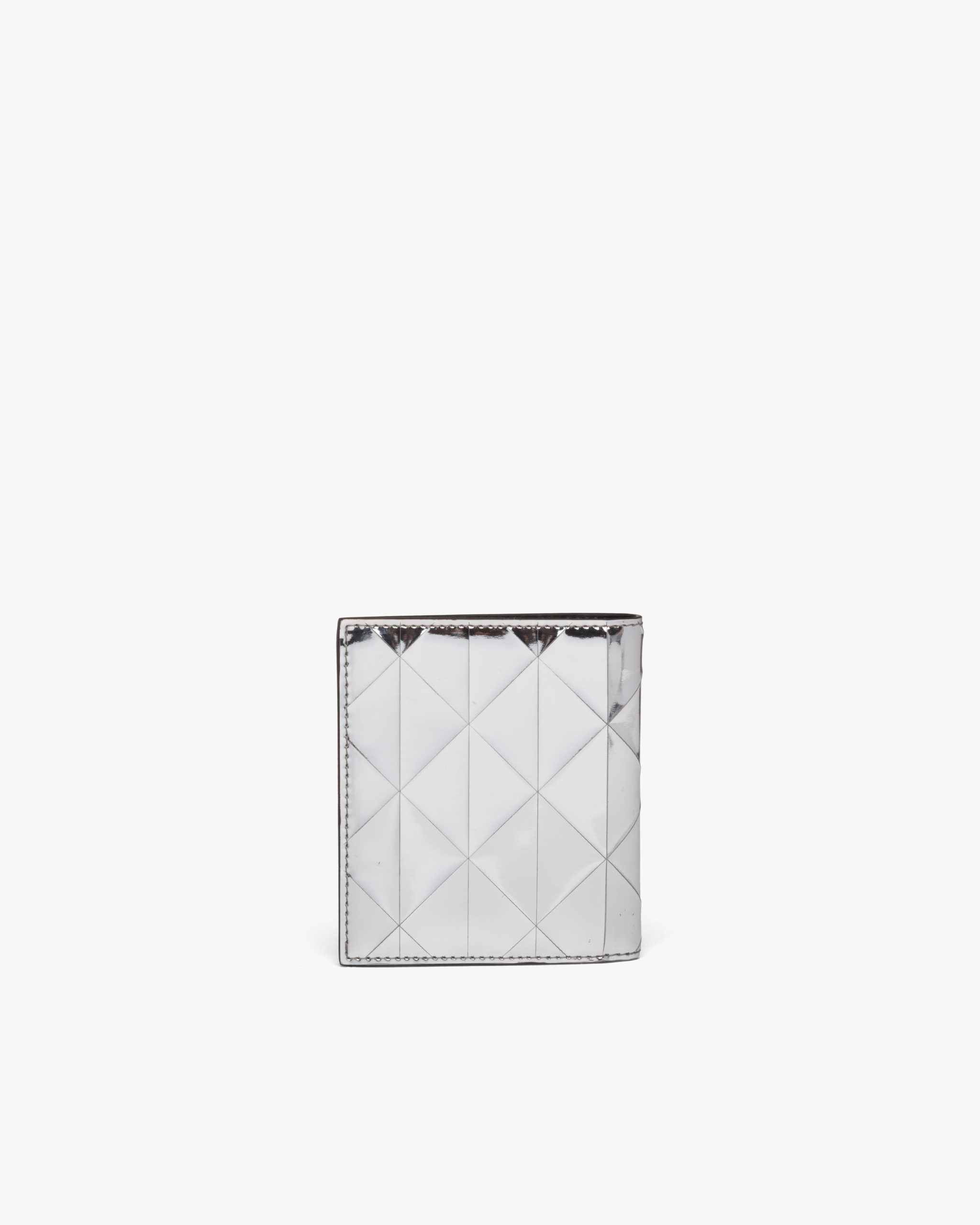 The compact, versatile design of this wallet is enhanced by an elegant interpretation of the iconic triangle that creates an original motif, accentuating the lustrous finish of the material. The enameled metal triangle logo decorates the accessory.