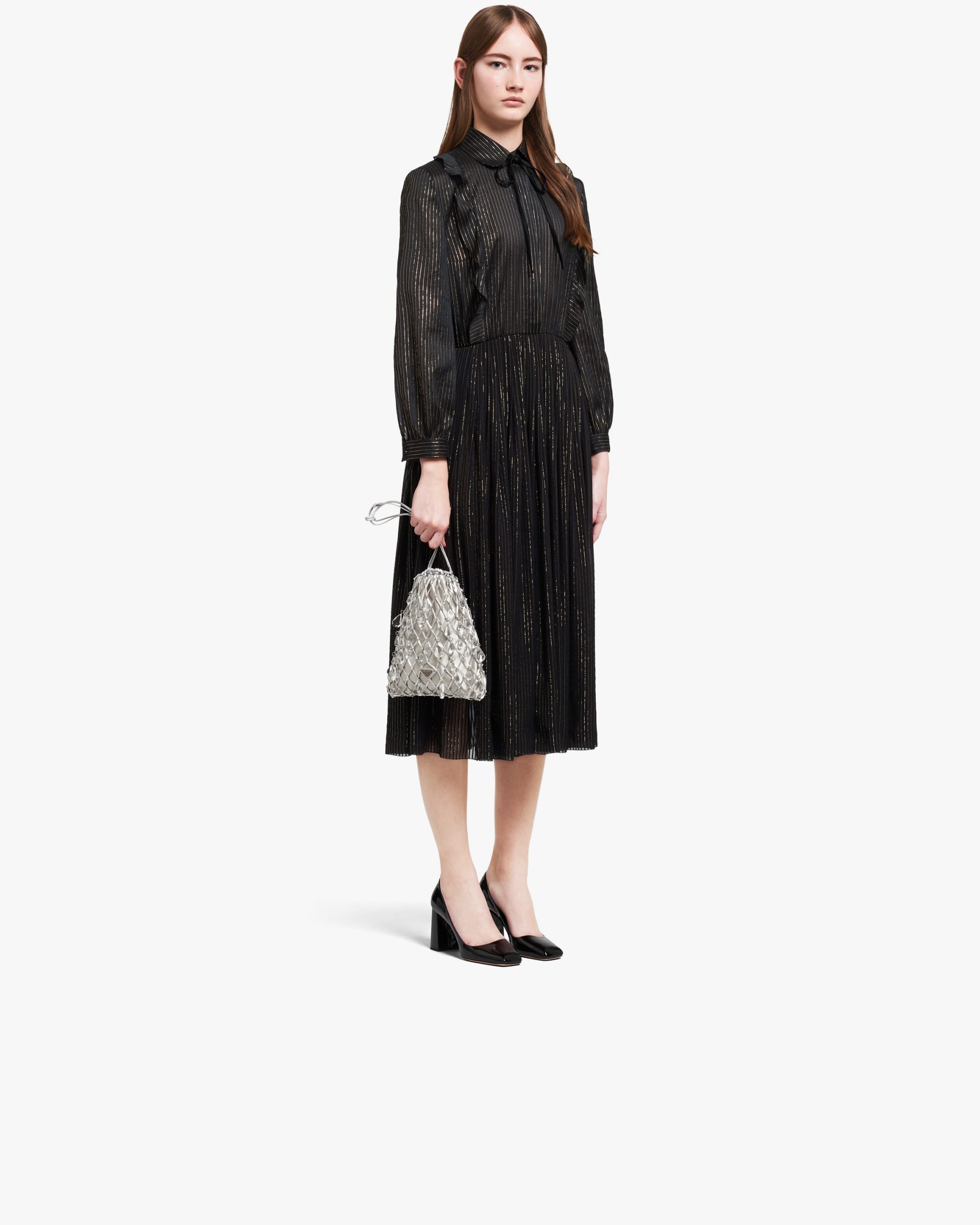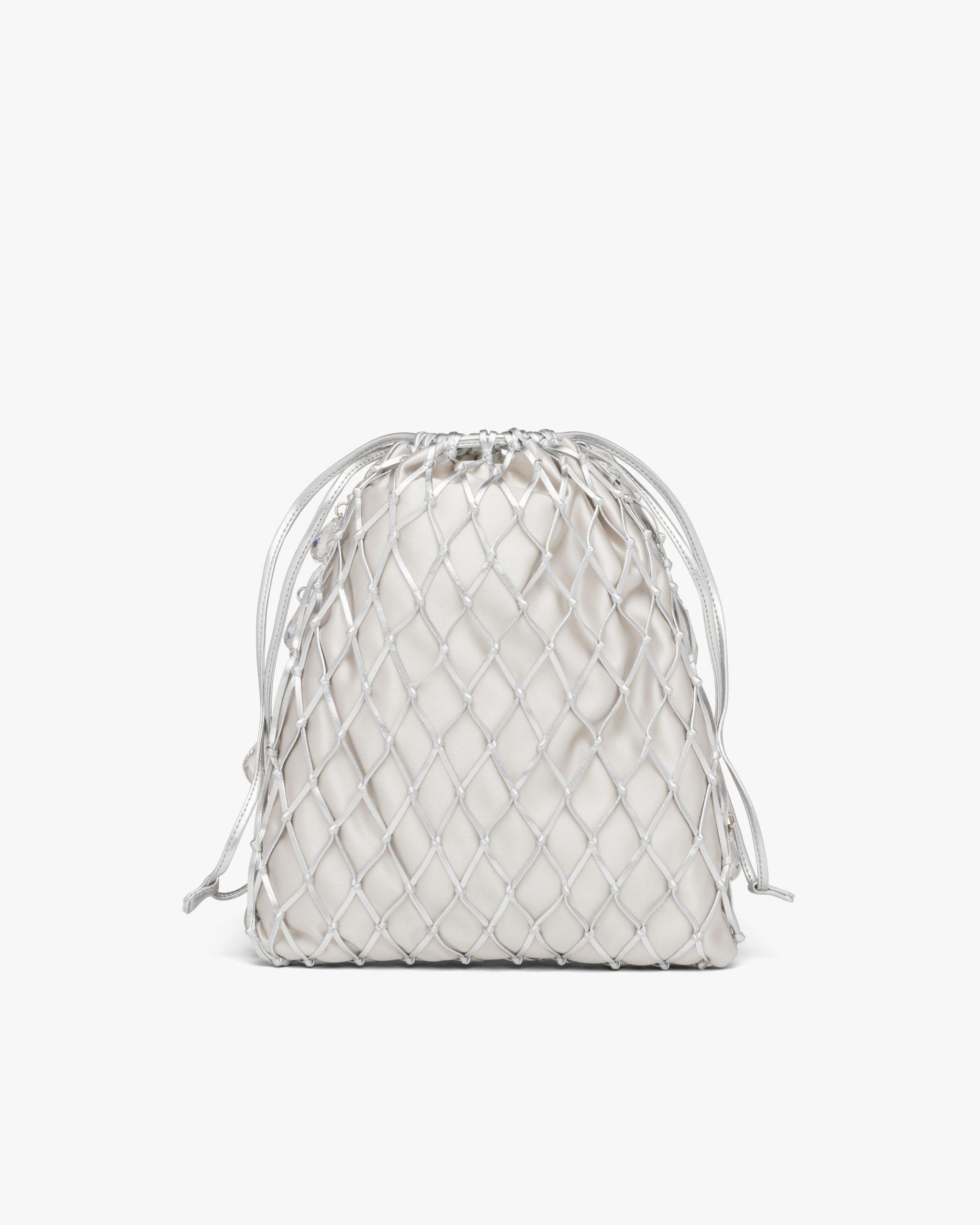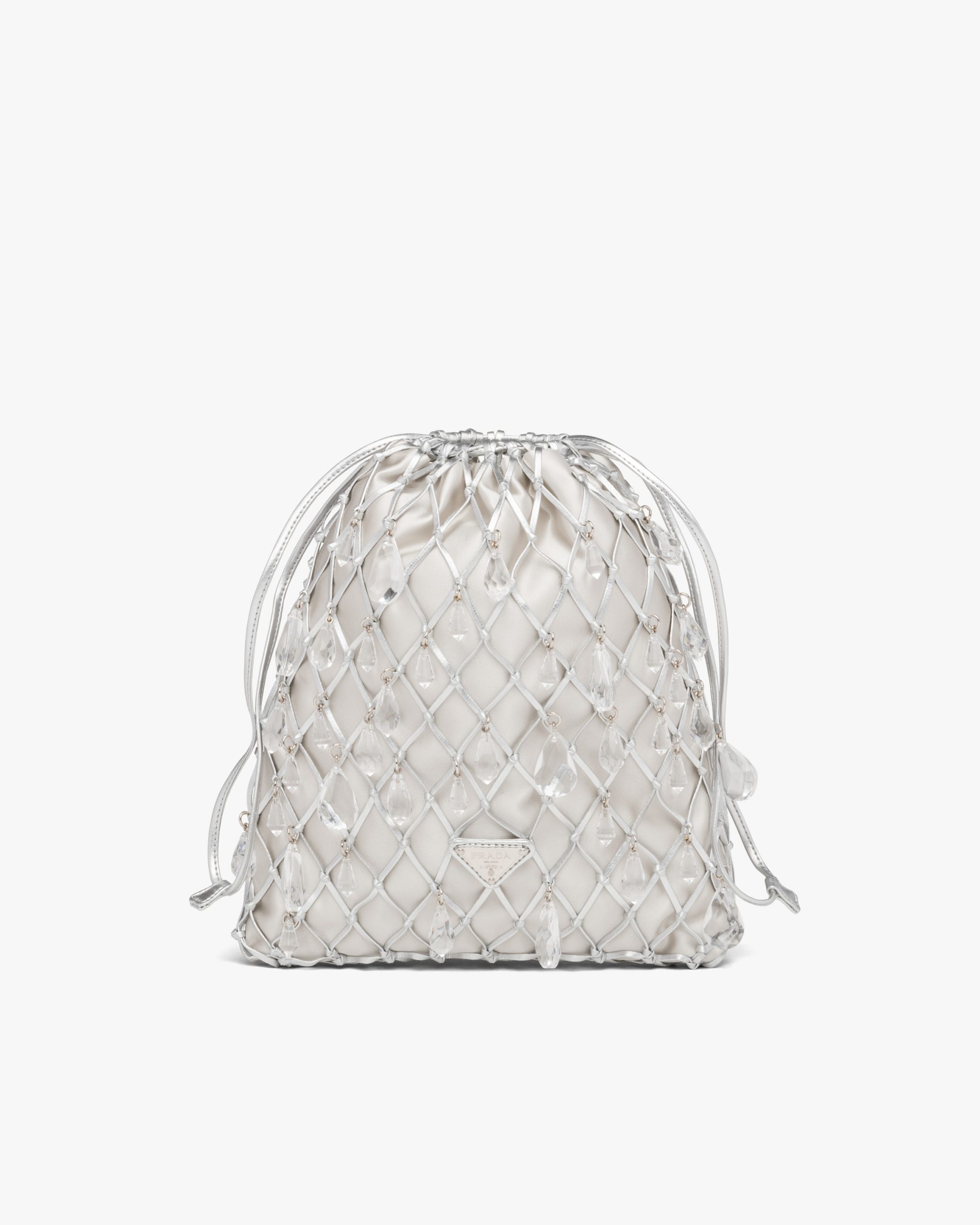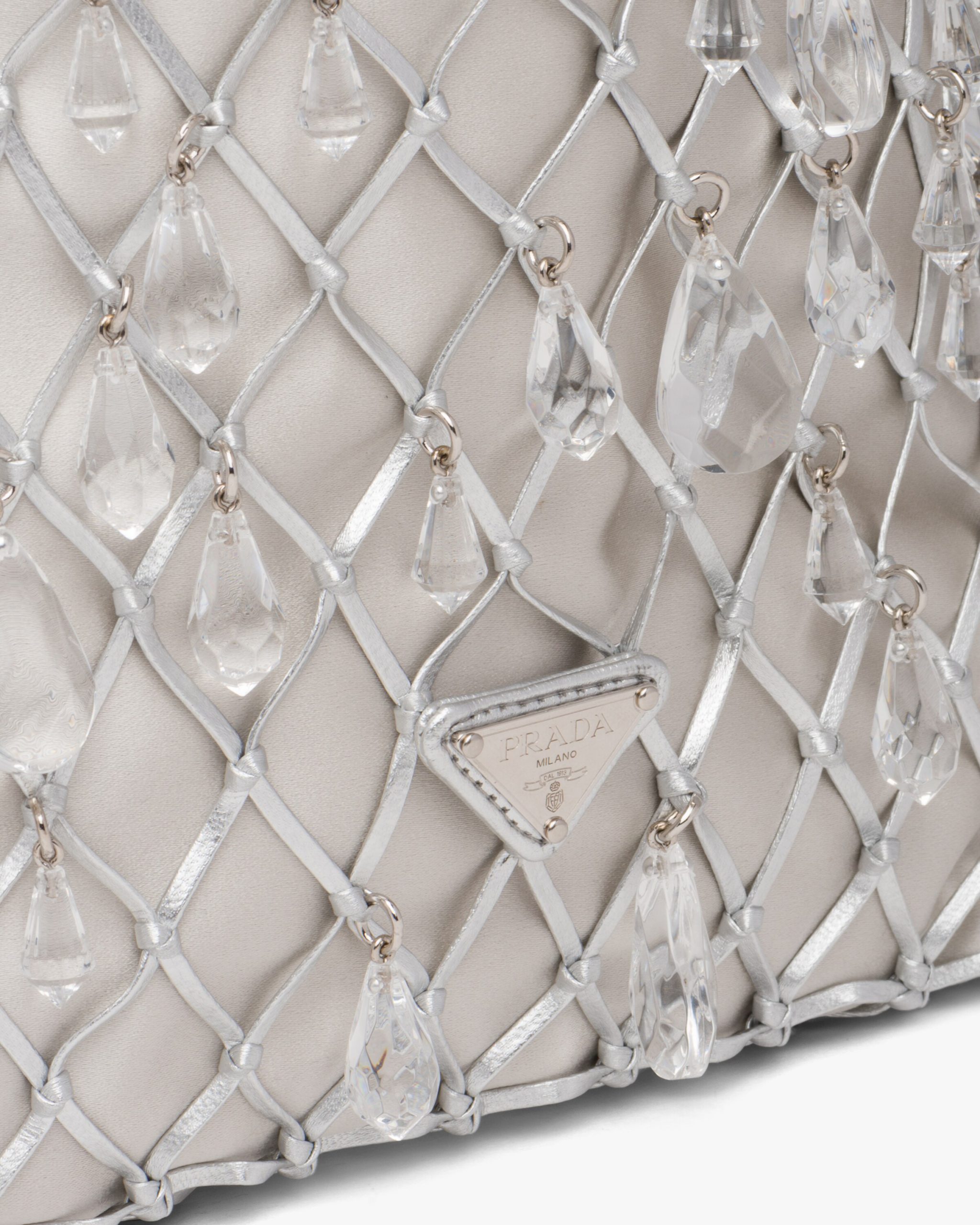 This satin clutch is enhanced by its leather mesh design and the triangle logo.