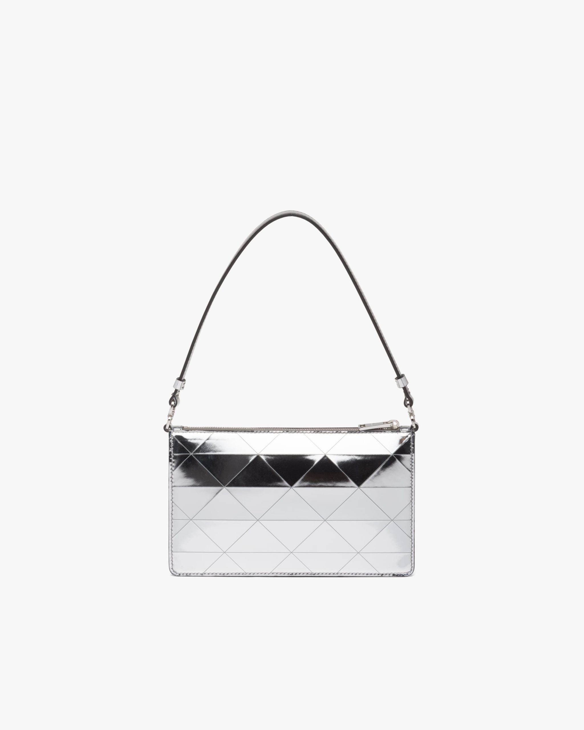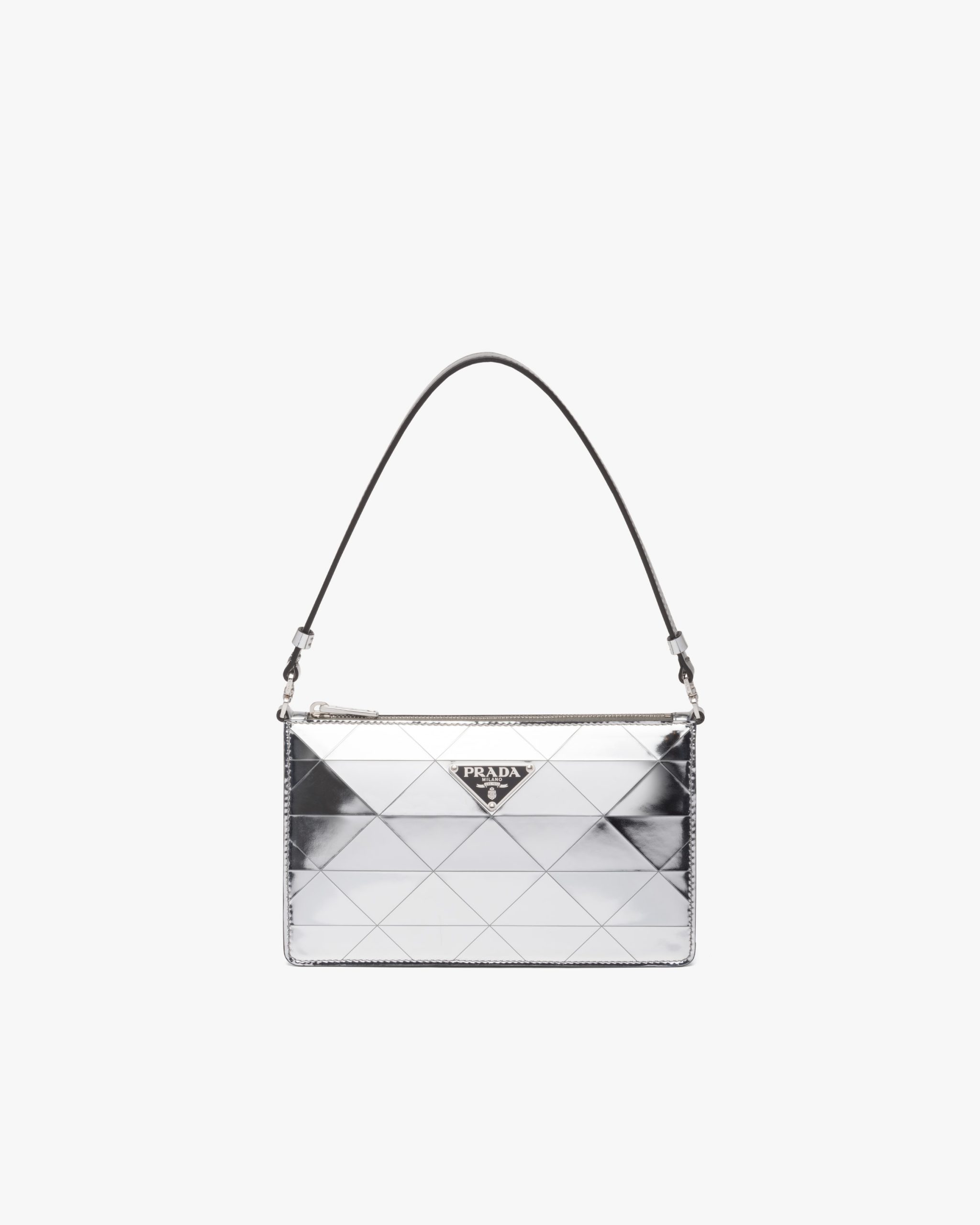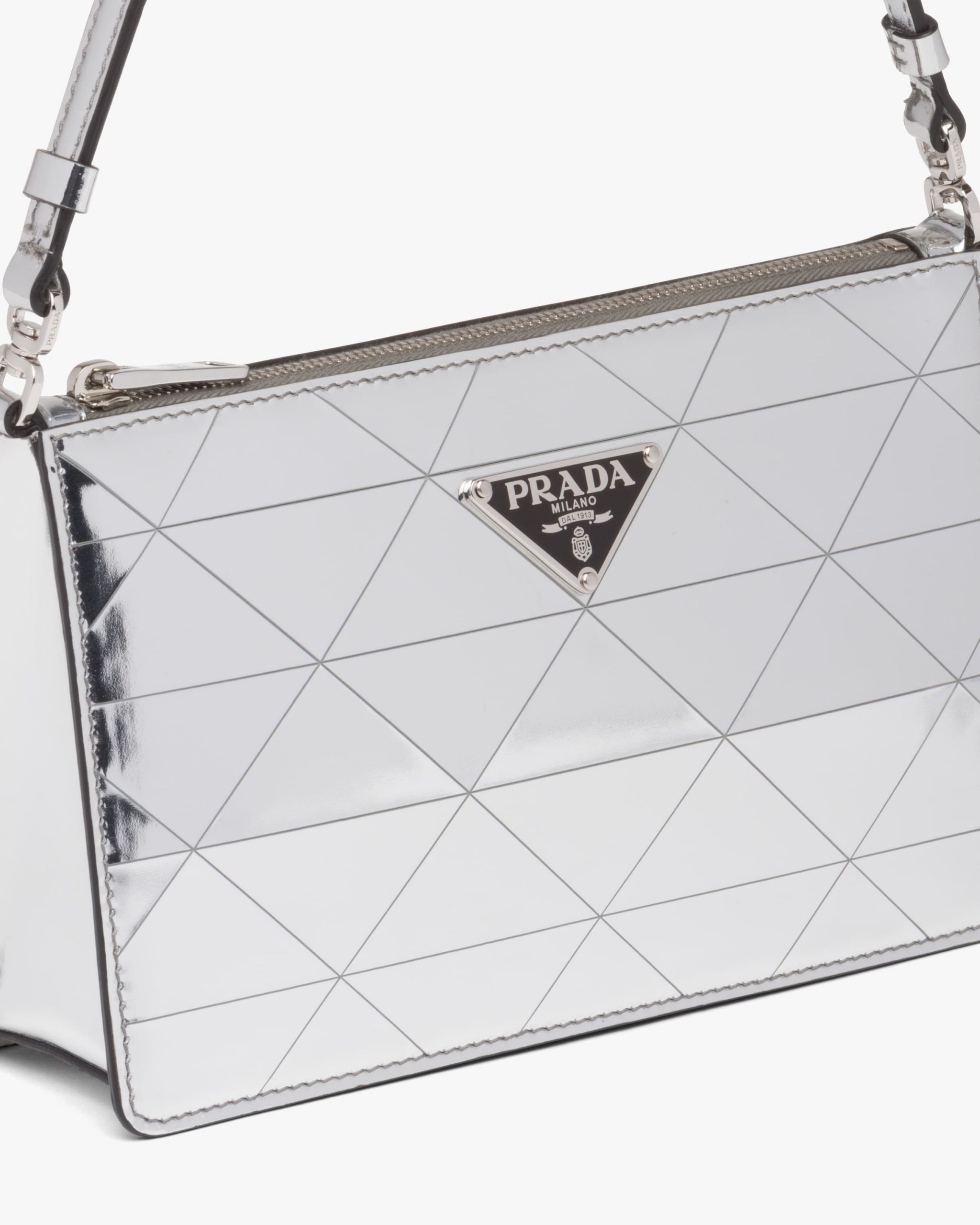 This mini-bag decorated with the enameled triangle logo and defined by its structured design comes in metallic leather featuring fine workmanship. A study of the triangle inspires new geometric shapes and unique interpretations of Prada’s historic code. The iconic shape is echoed in the motif that decorates the surface for a faceted and luminous effect.