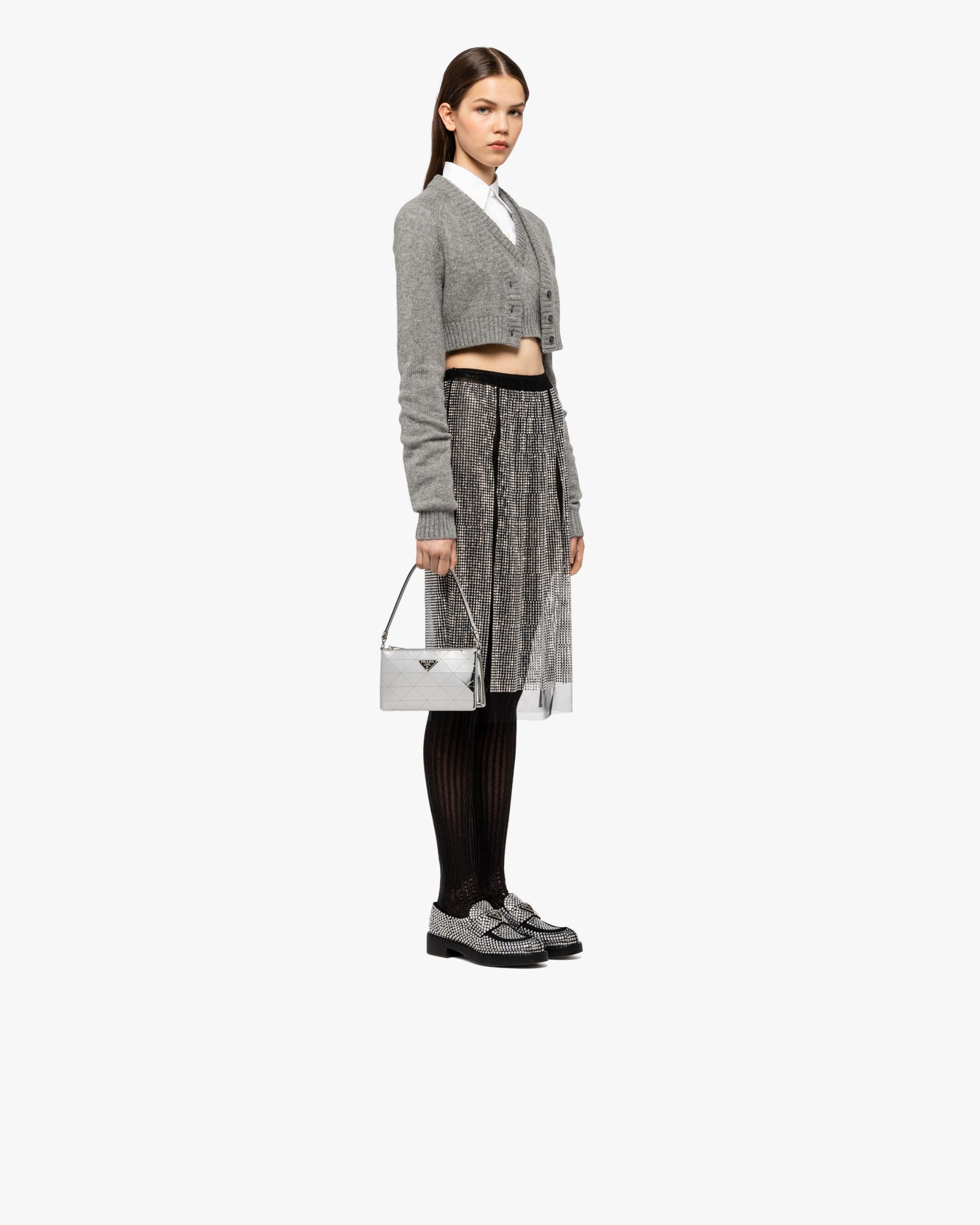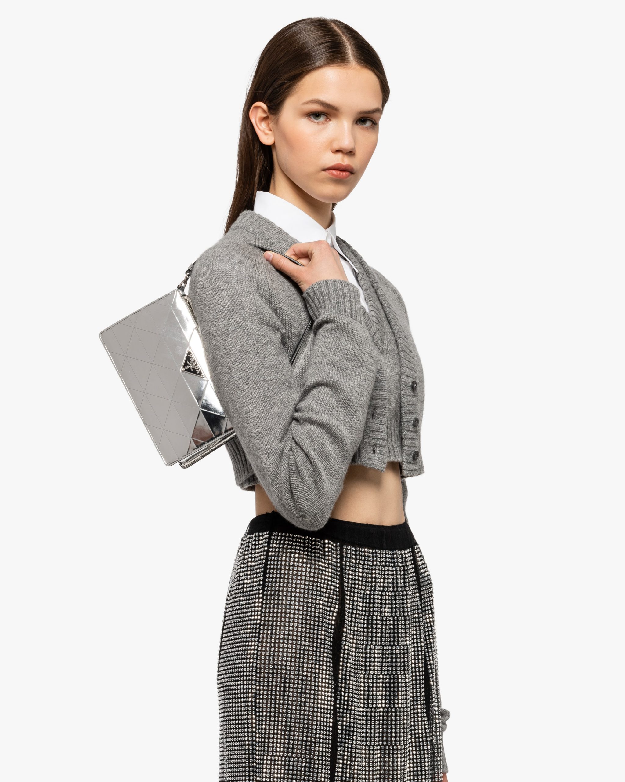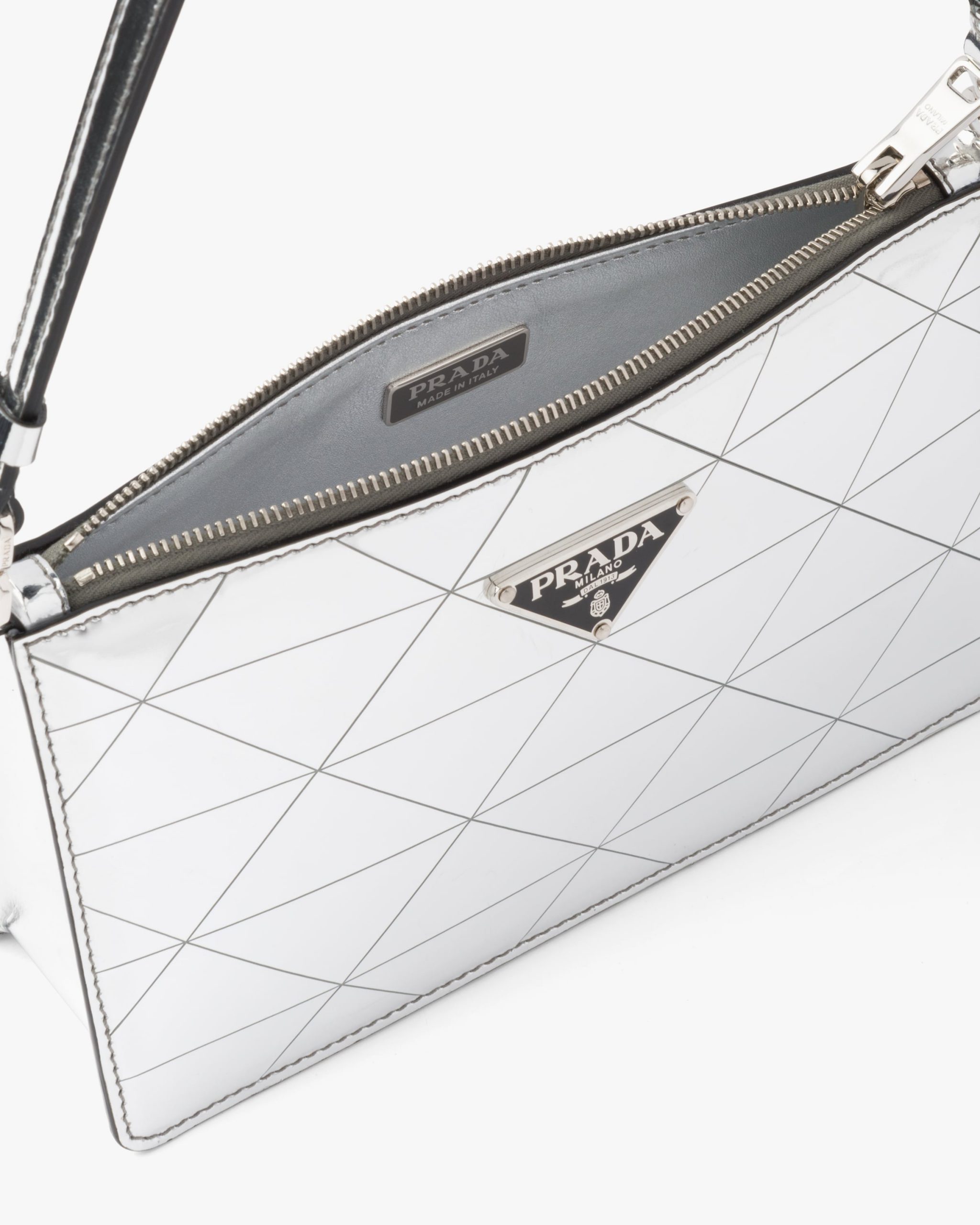 This mini-bag decorated with the enameled triangle logo and defined by its structured design comes in metallic leather featuring fine workmanship. A study of the triangle inspires new geometric shapes and unique interpretations of Prada’s historic code. The iconic shape is echoed in the motif that decorates the surface for a faceted and luminous effect.