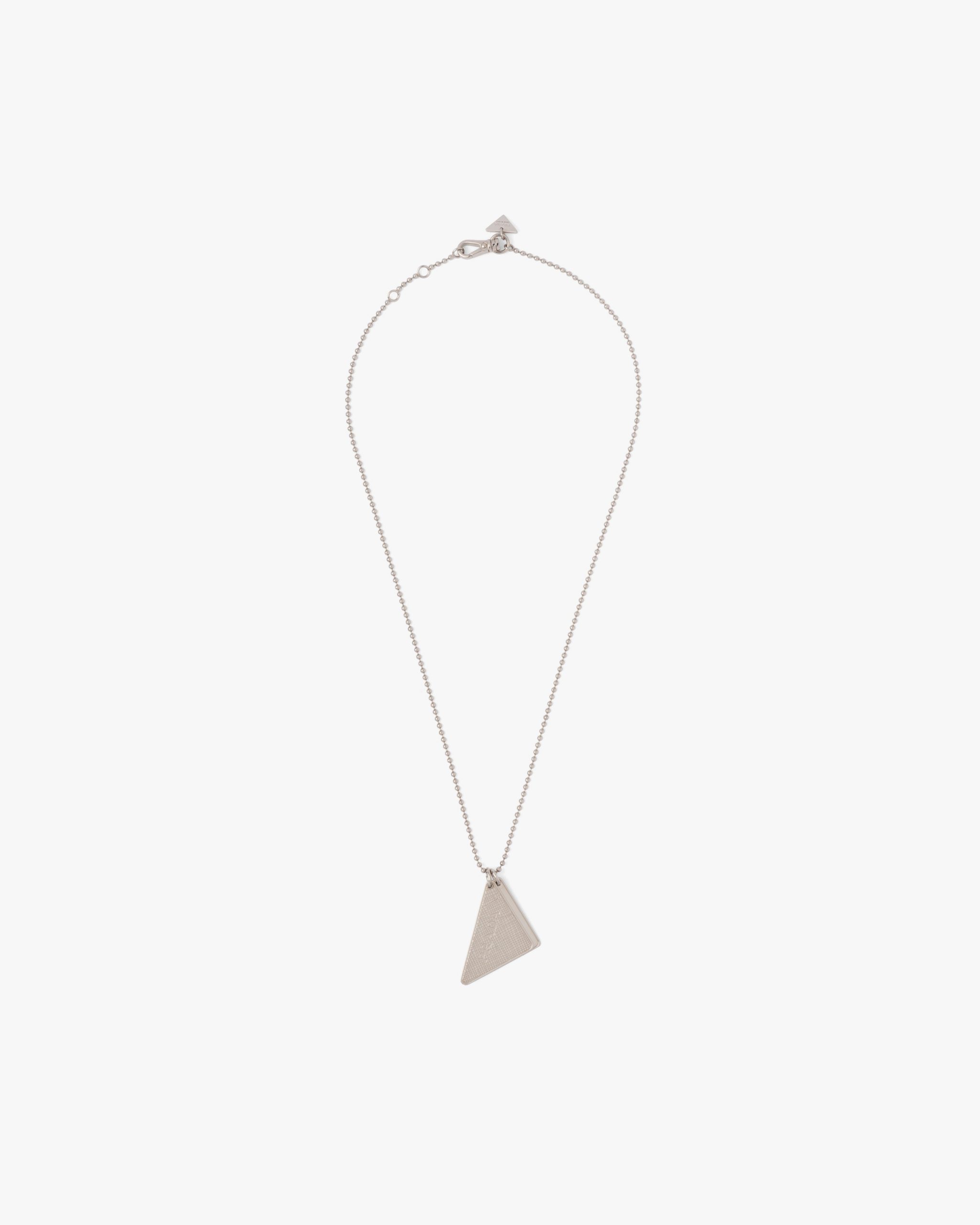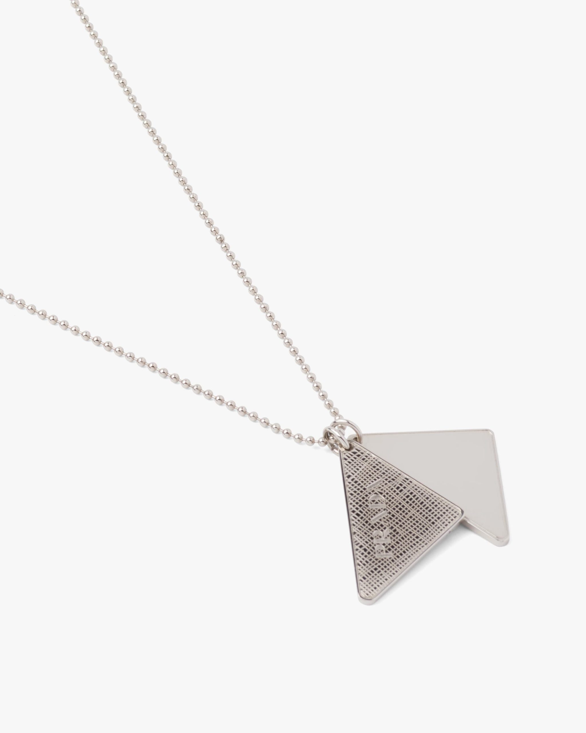 Prada’s iconic triangle logo transforms into a double pendant that decorates this chain necklace, creating a dynamic play of layering and texture. Iconic and essential in form, the triangle is the protagonist of a new line of jewelry made of 925 sterling silver.