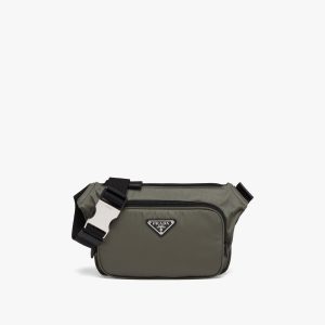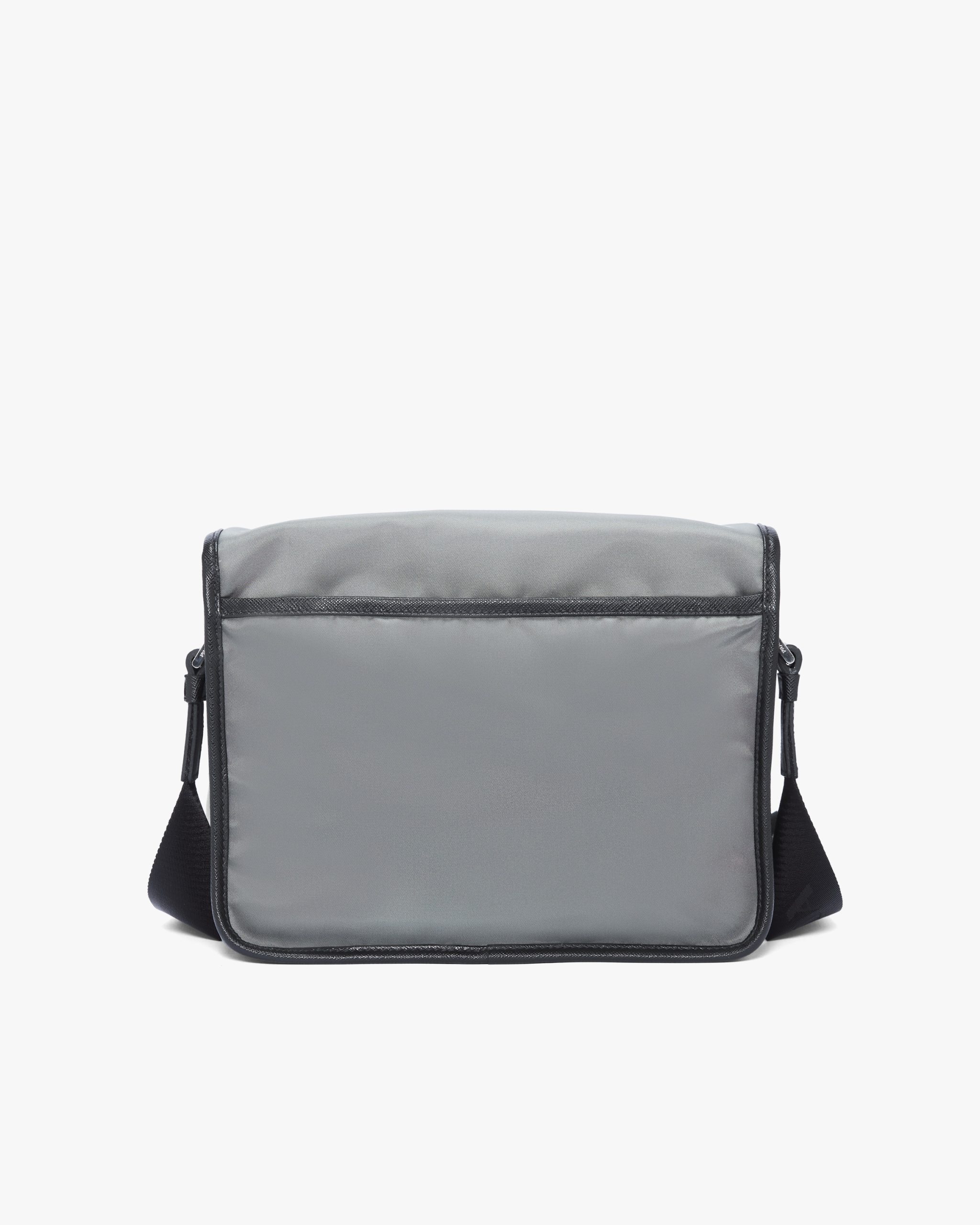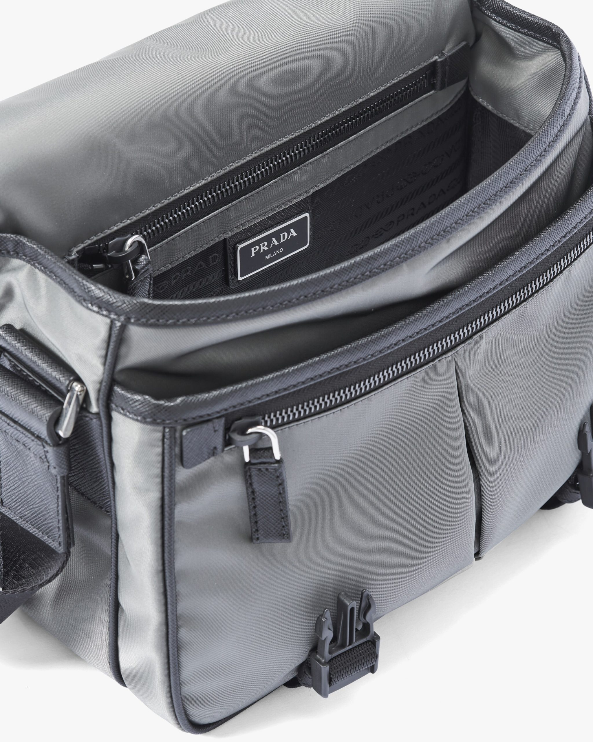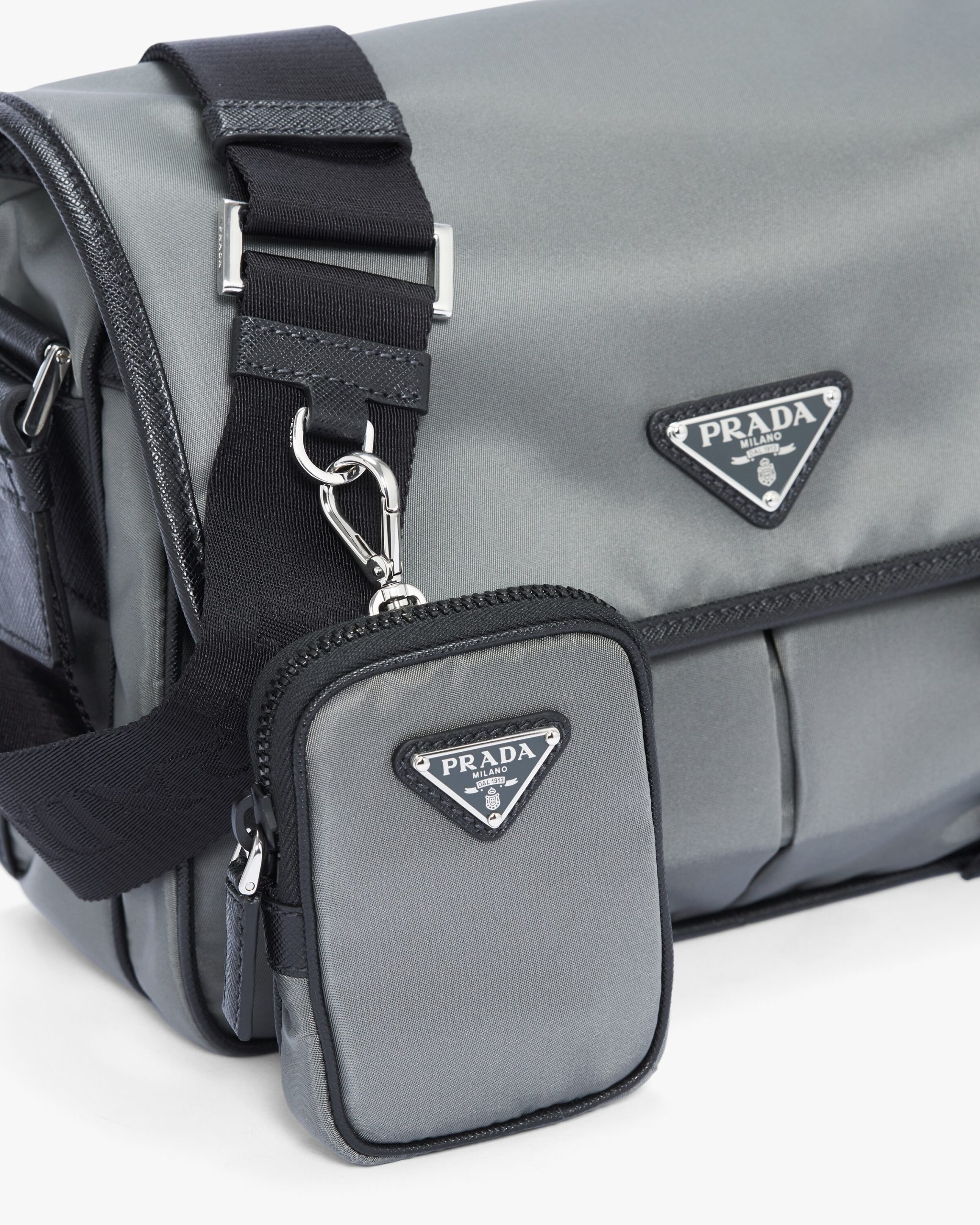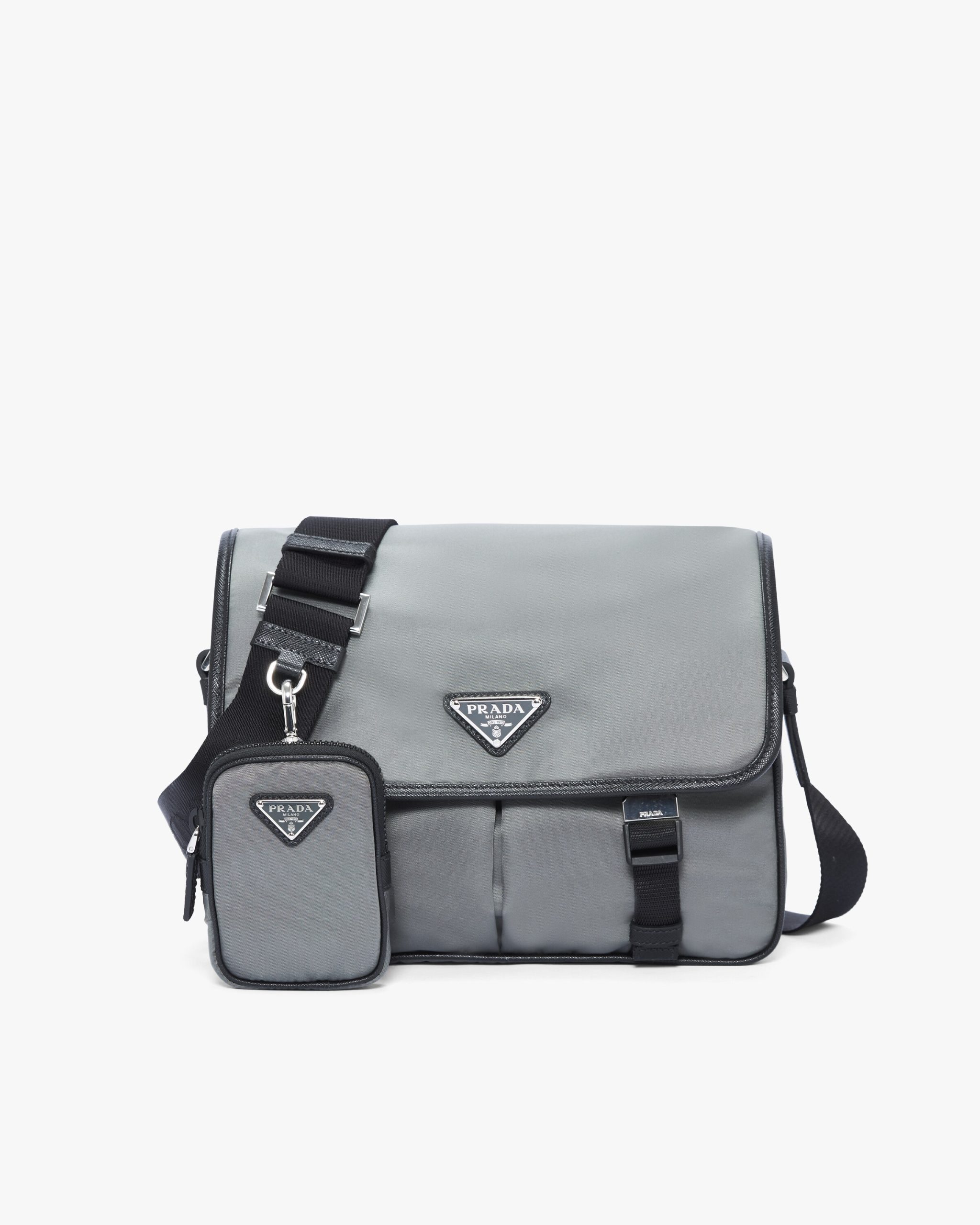 This nylon shoulder bag is characterized by its functional, masculine design. The bag, with flap and two side-release buckles, has a removable pouch and is decorated with the metal triangle logo.