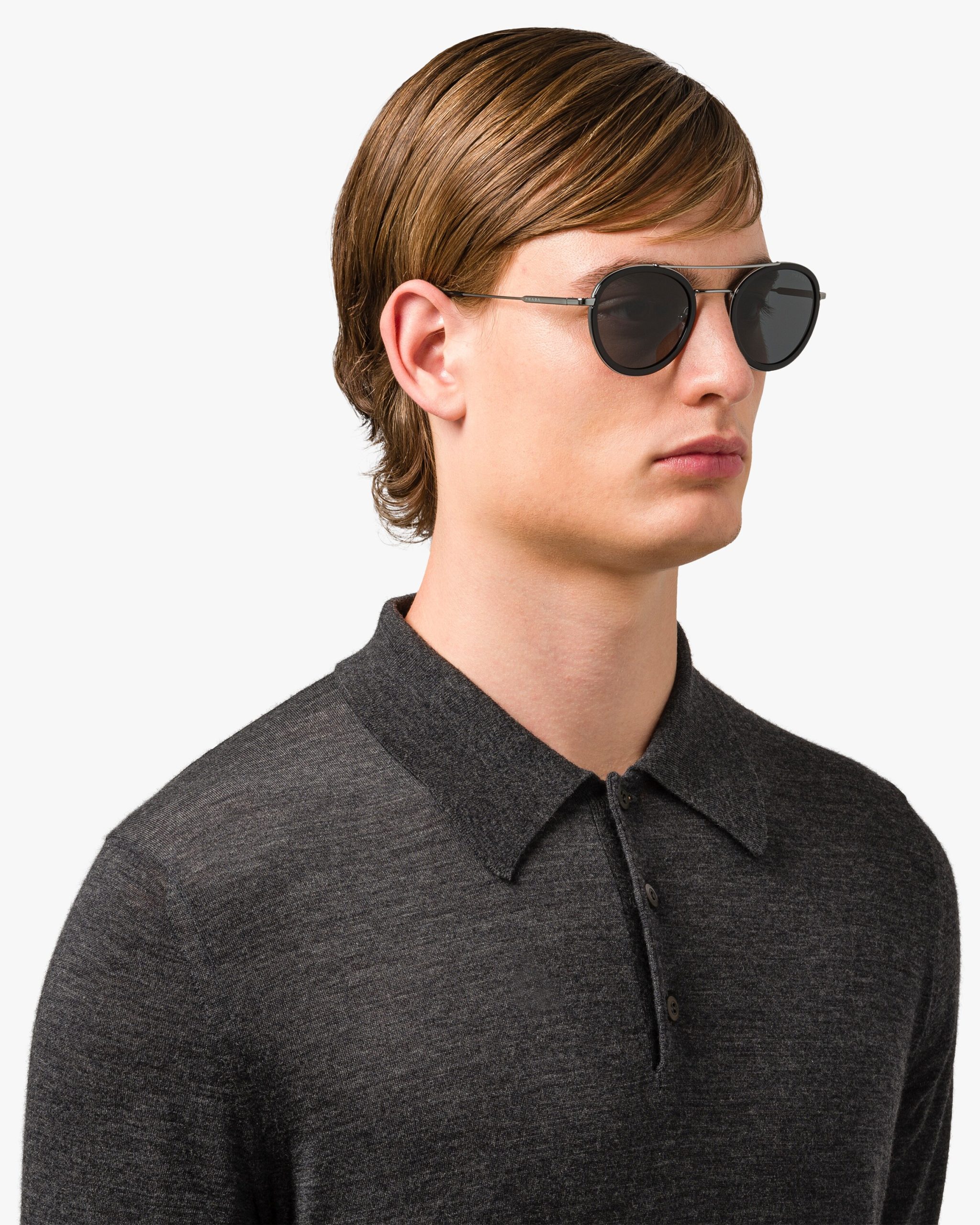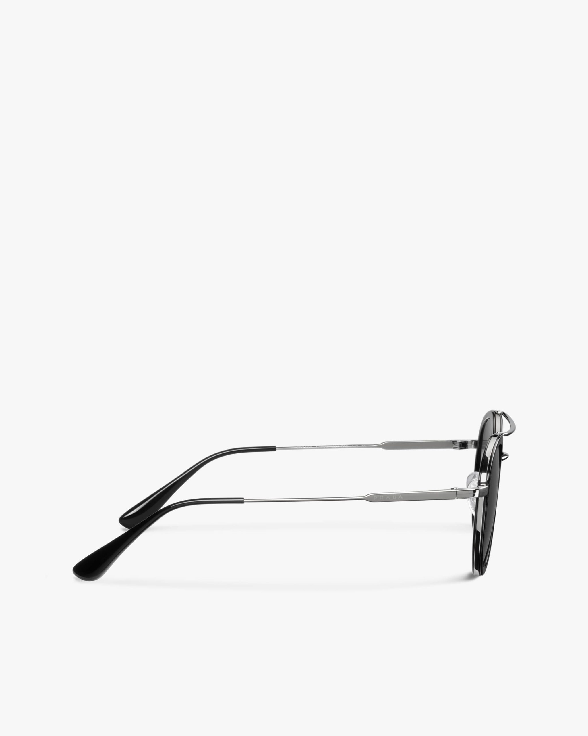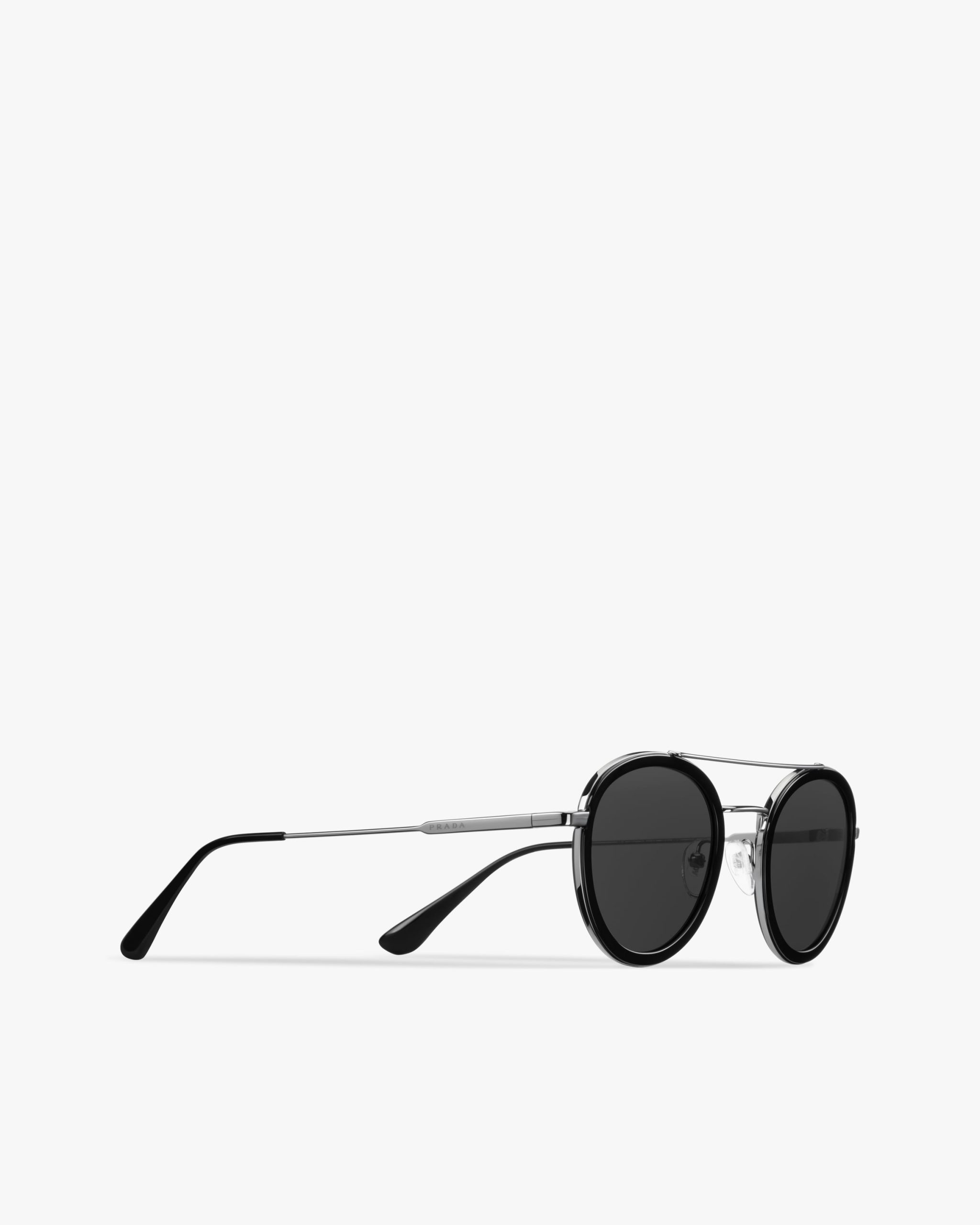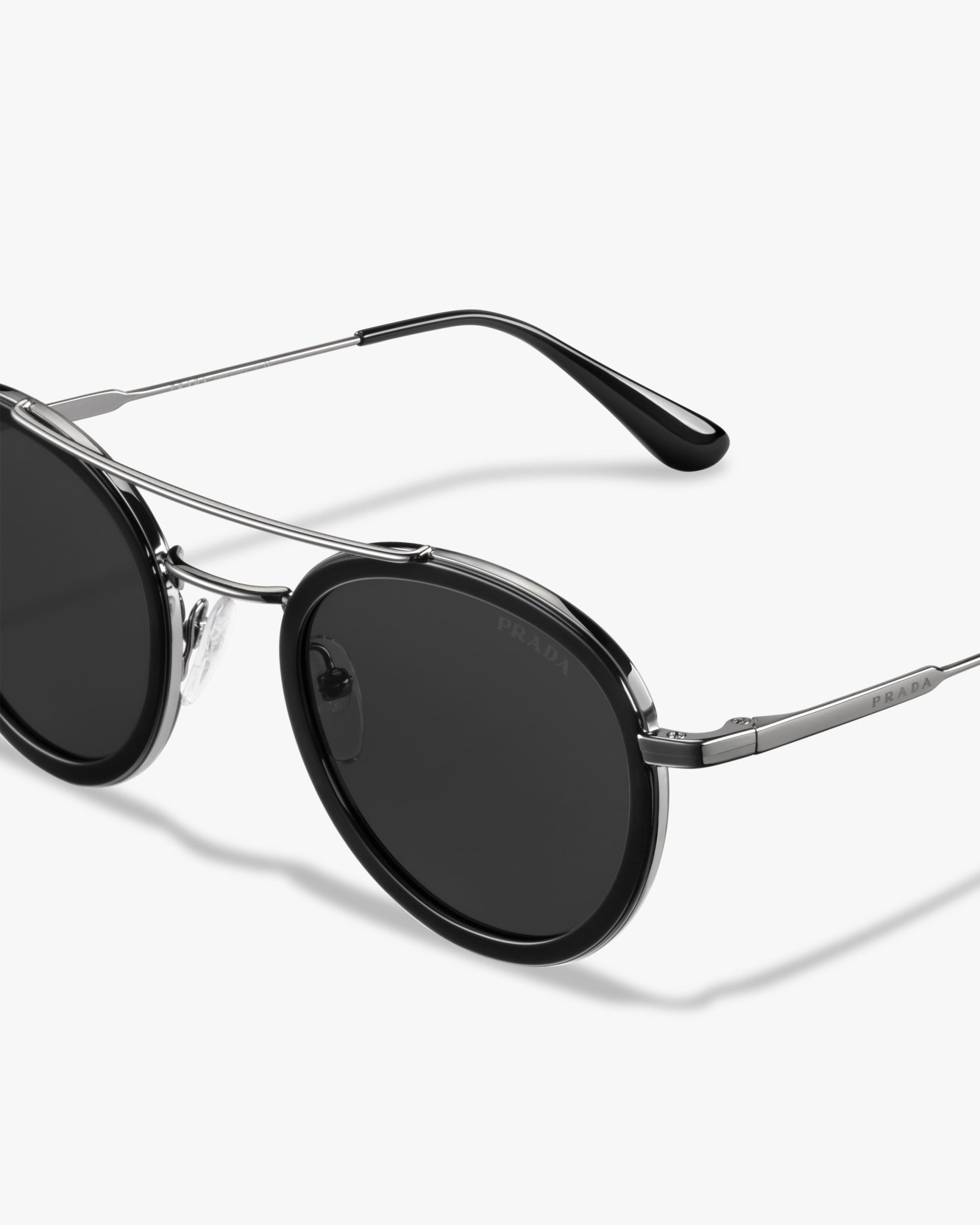 These sunglasses are defined by their pantos silhouette, elegant acetate rims and a double metal bridge with a contemporary touch. Prada lettering logo.