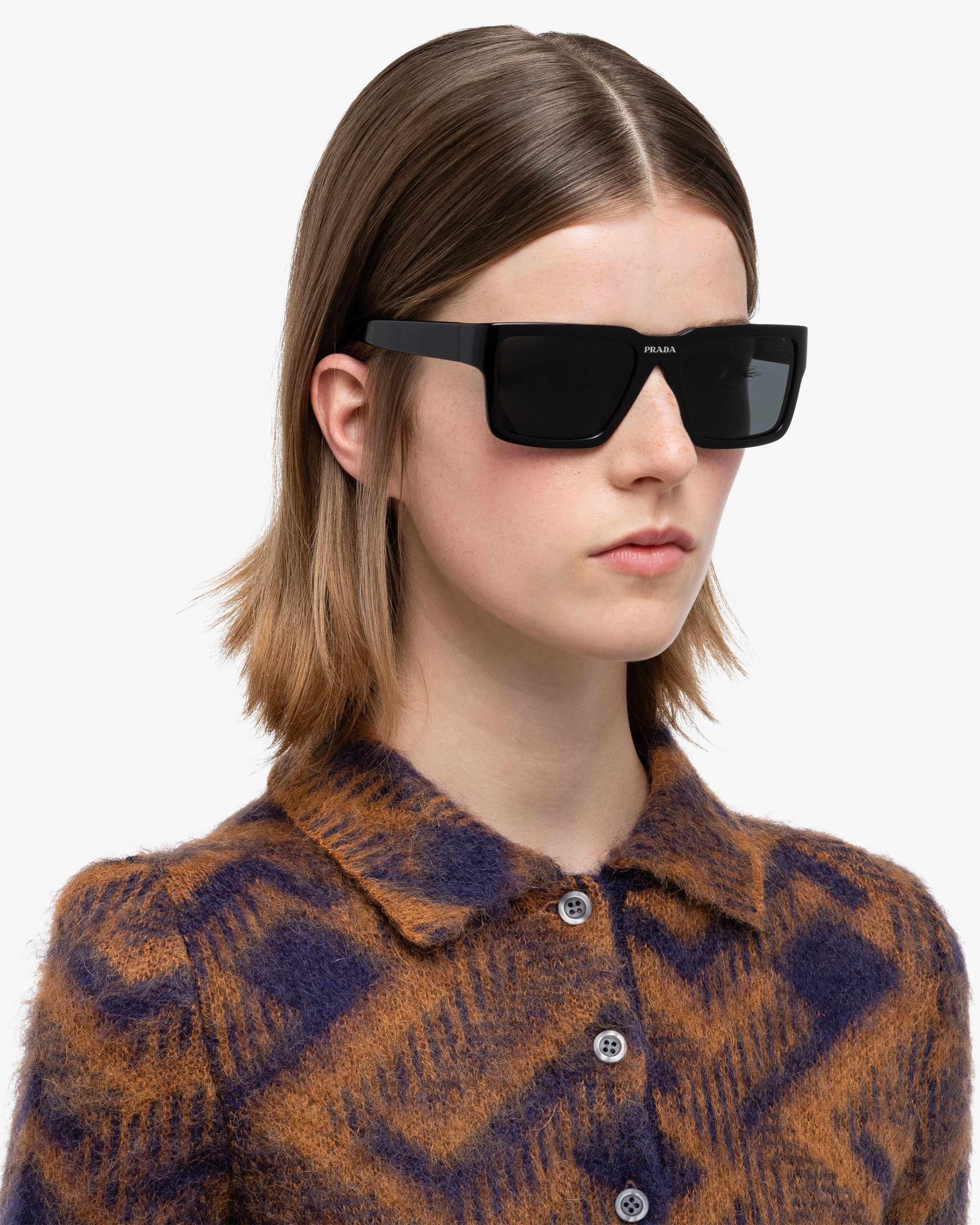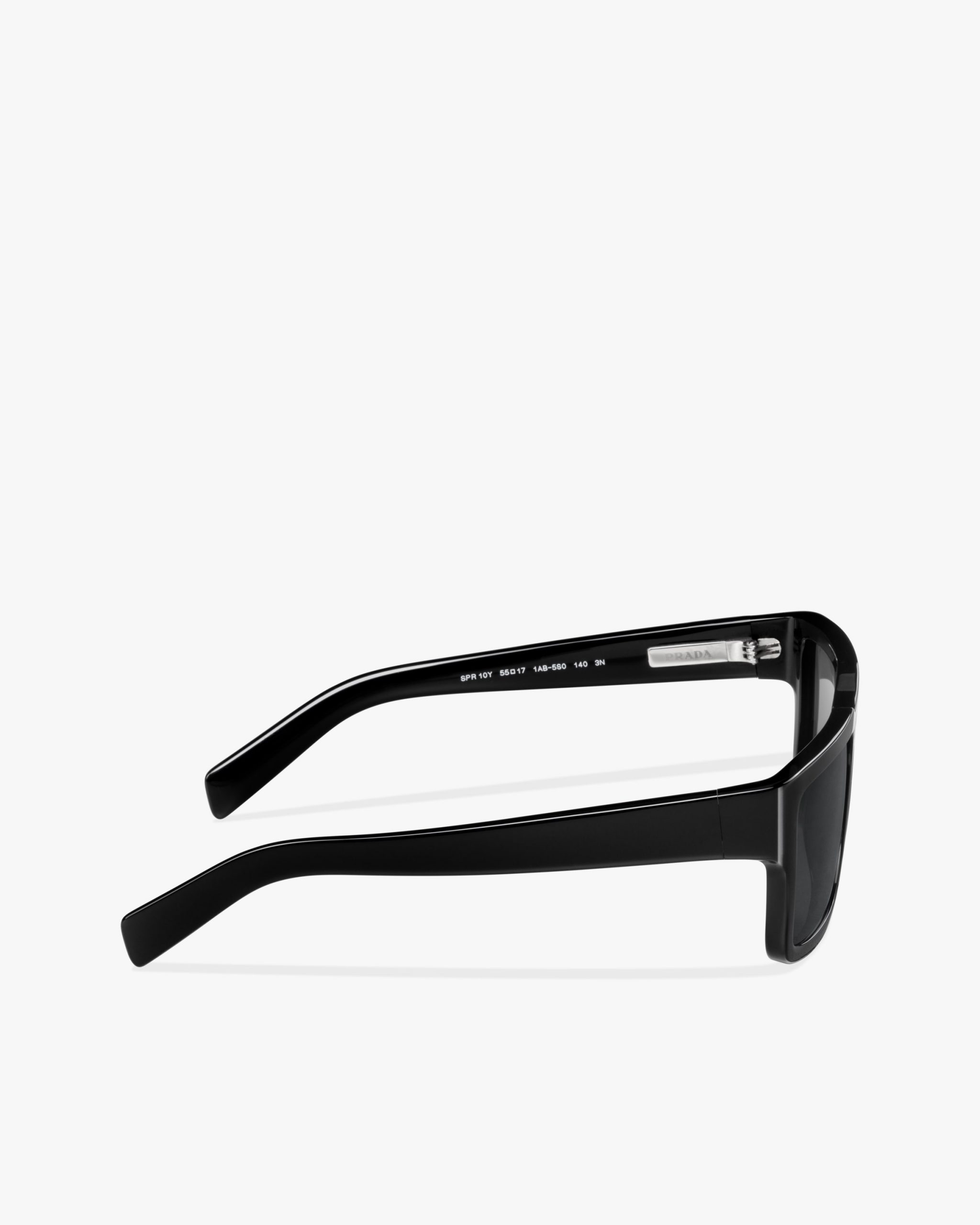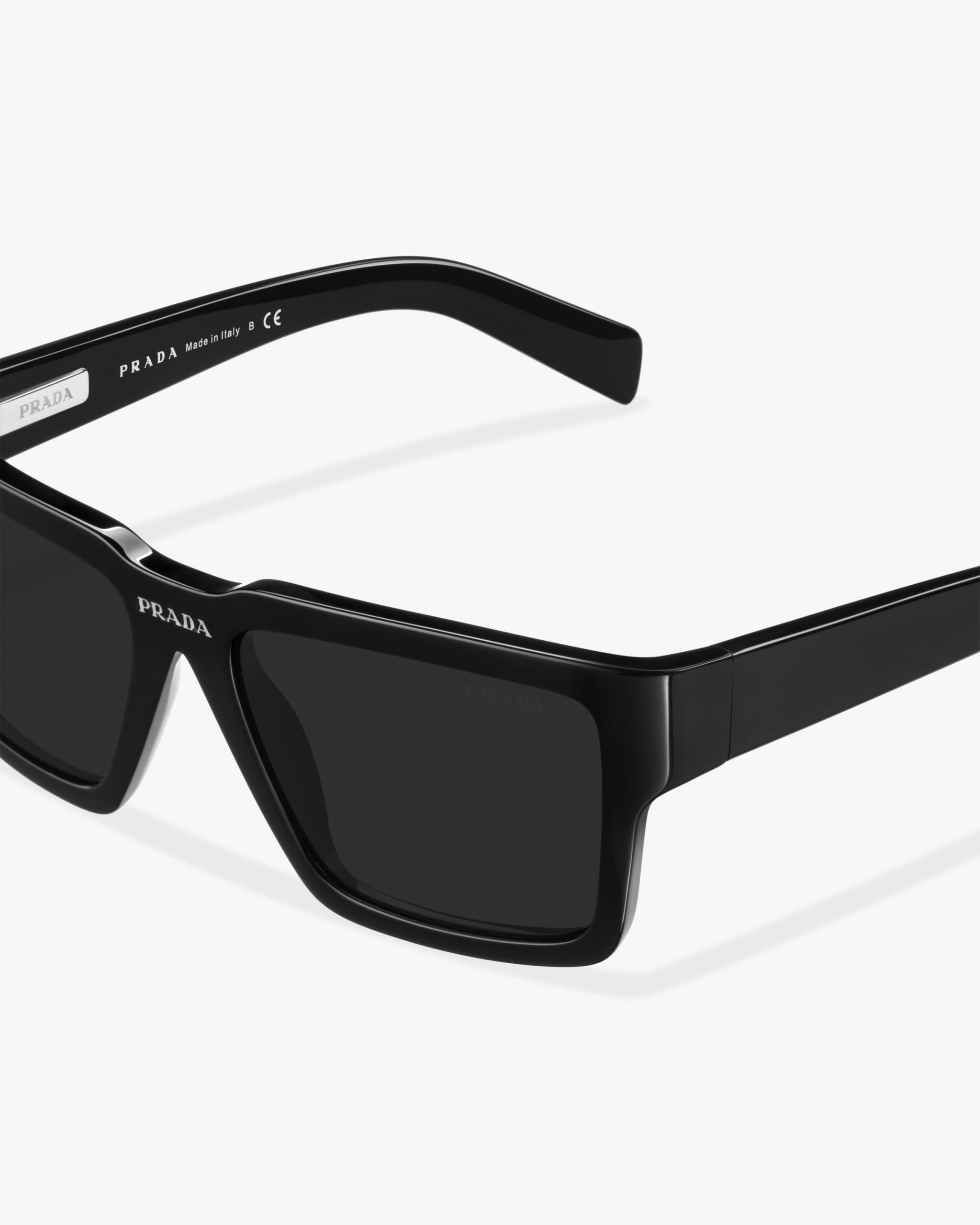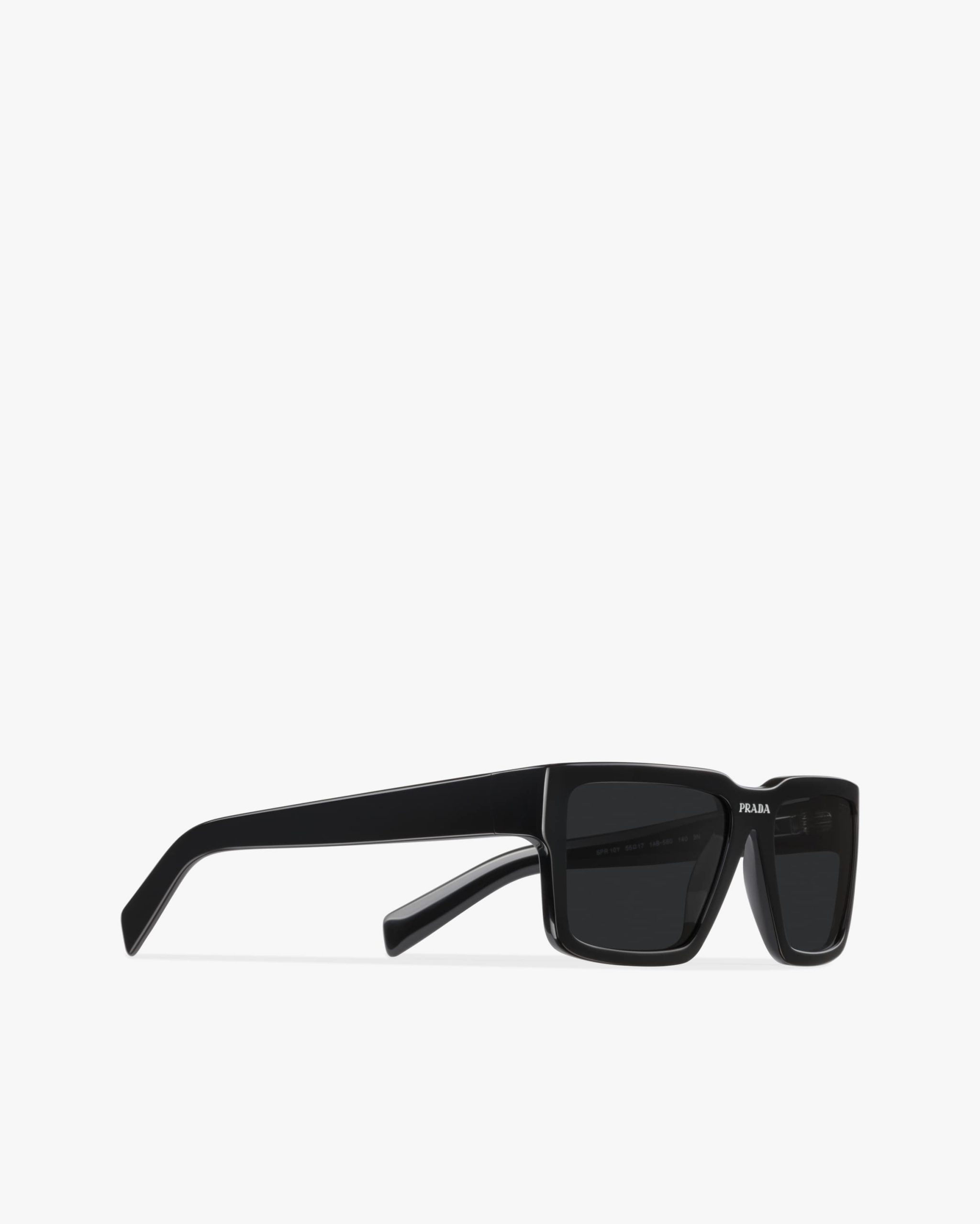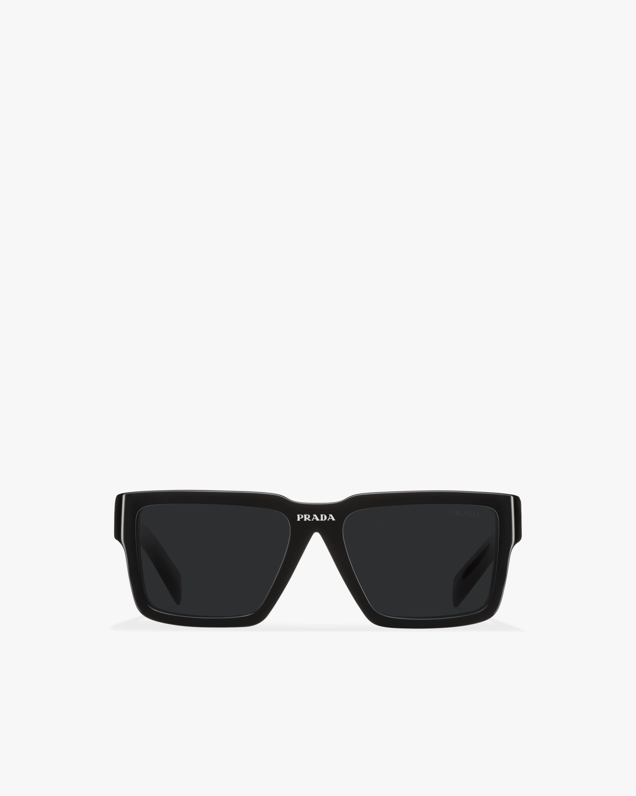 Rectangular acetate sunglasses available in exclusive transparent shades. The contemporary, slightly curved frame front is paired with wide temples that reveal metal details. The bridge area features the Prada lettering logo and was redesigned to iconographically reinterpret the maison’s historic triangle logo.