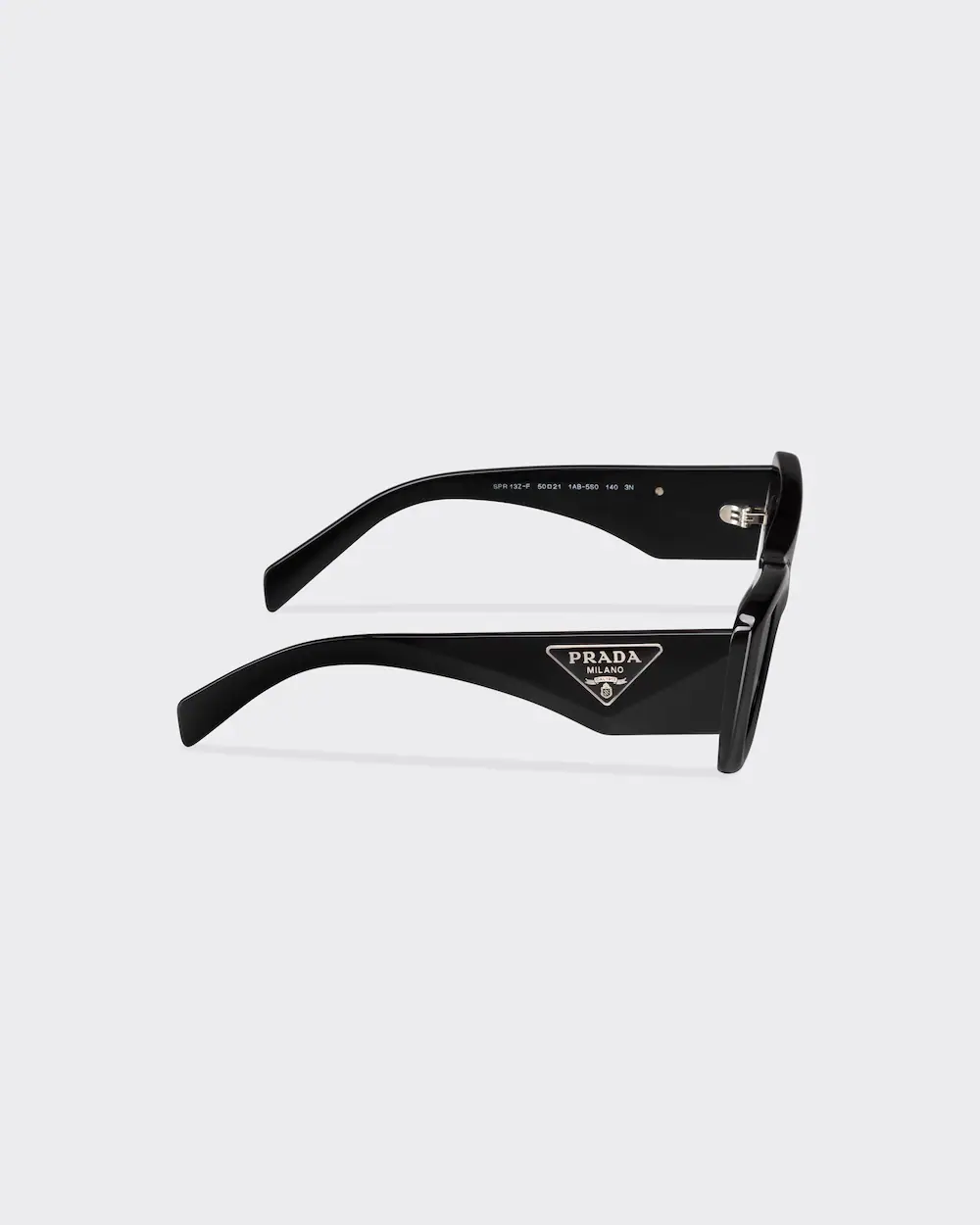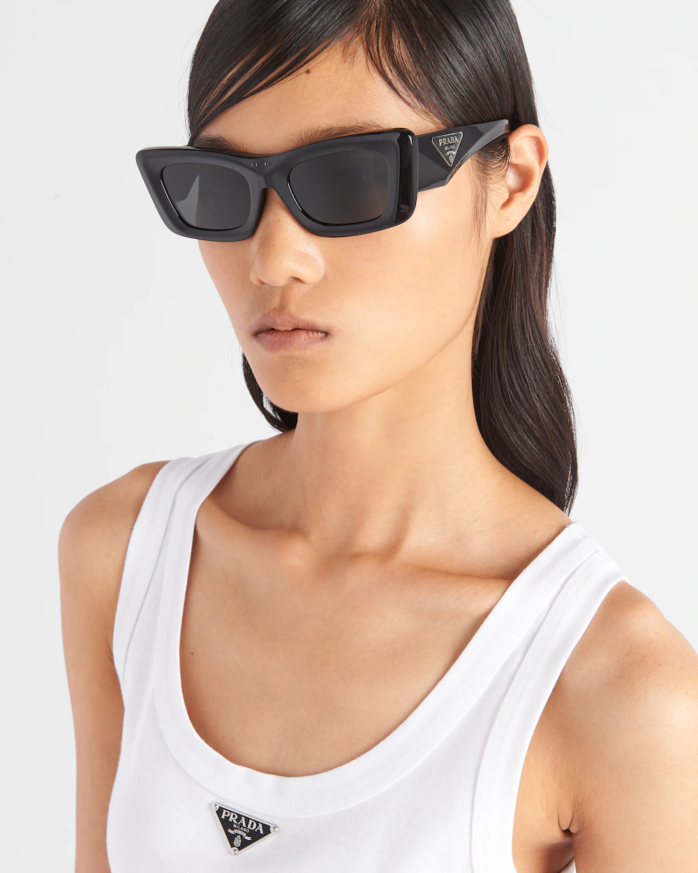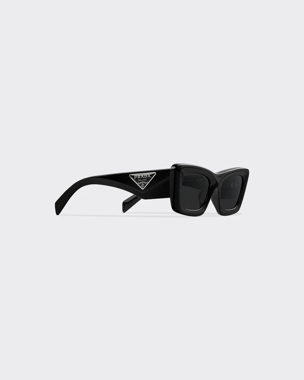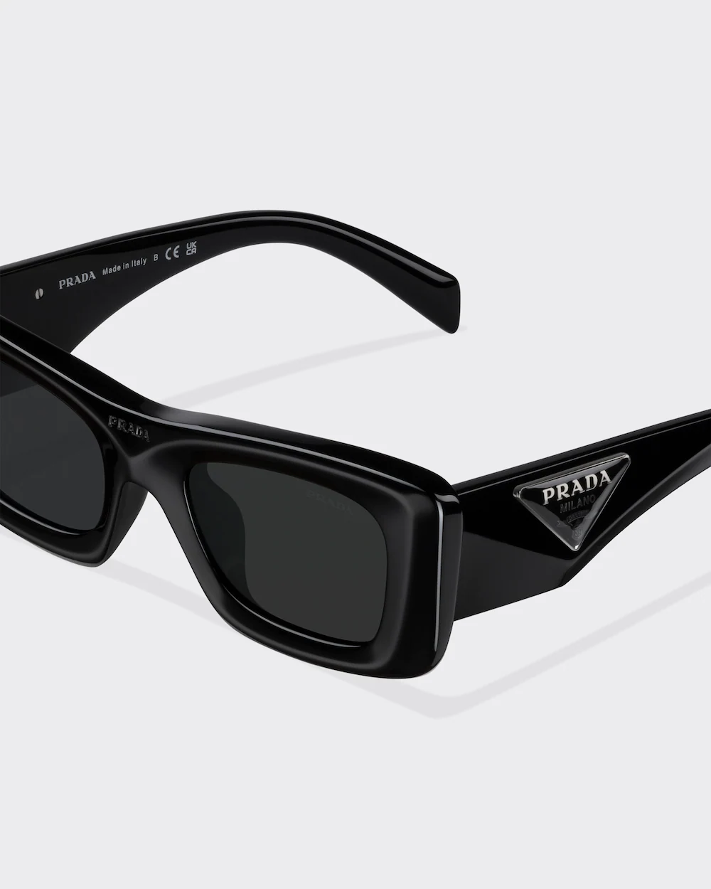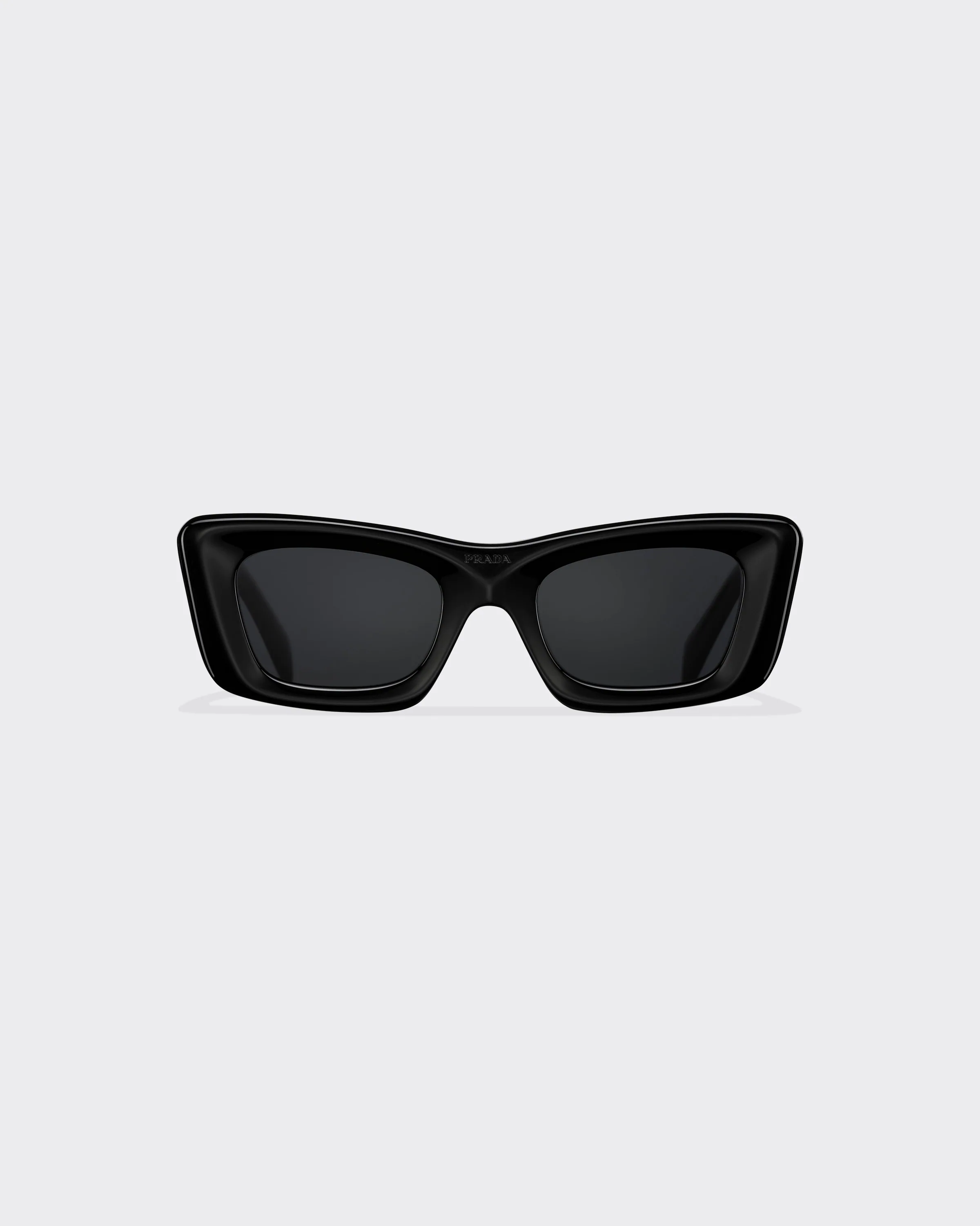 Acetate replica sunglasses with a sophisticated design and important volumes. The bold frame with slightly rounded edges expresses contemporary femininity. The temples are decorated with an exclusive metal plaque featuring the iconic triangle logo of the maison.