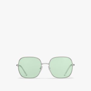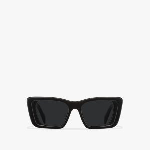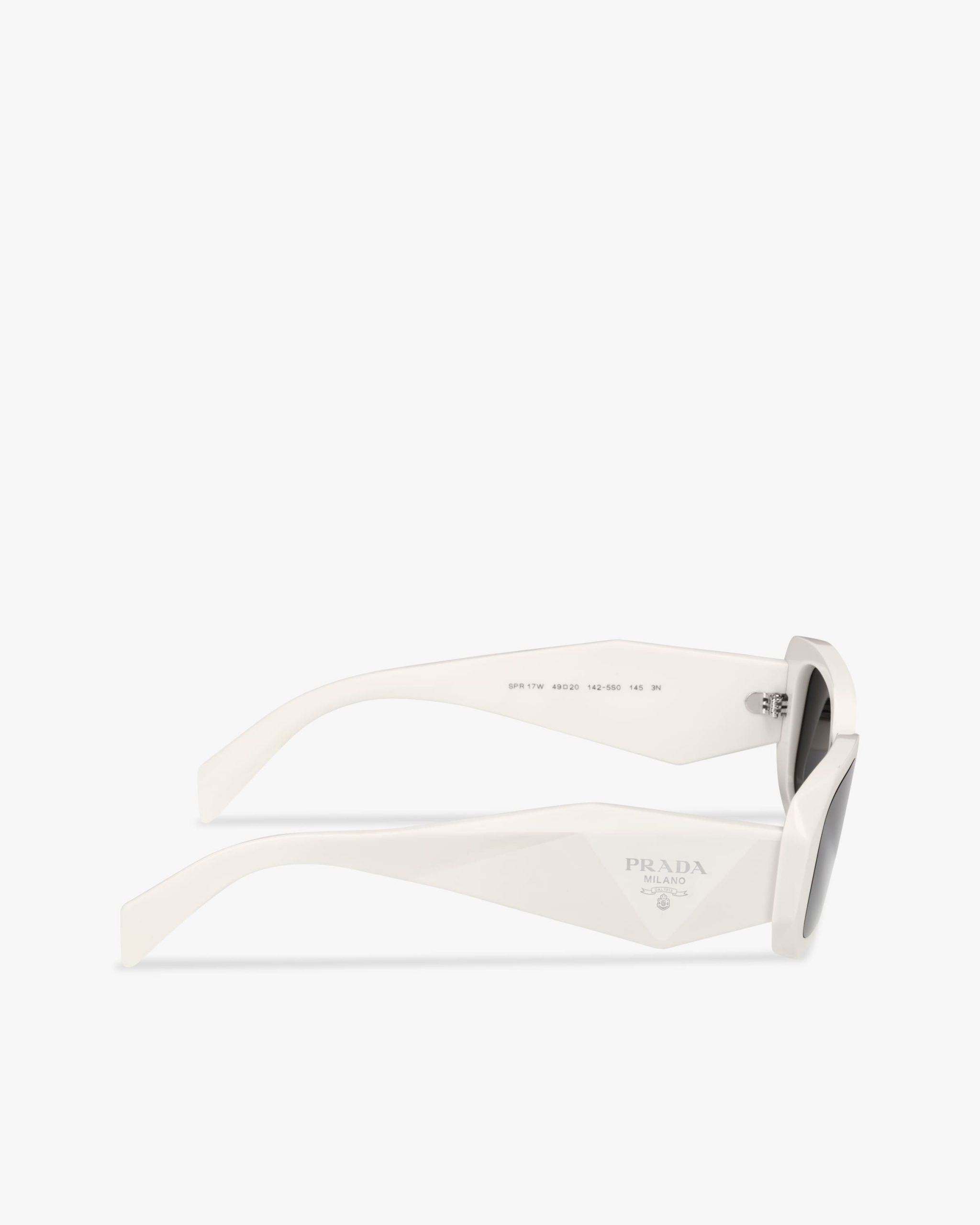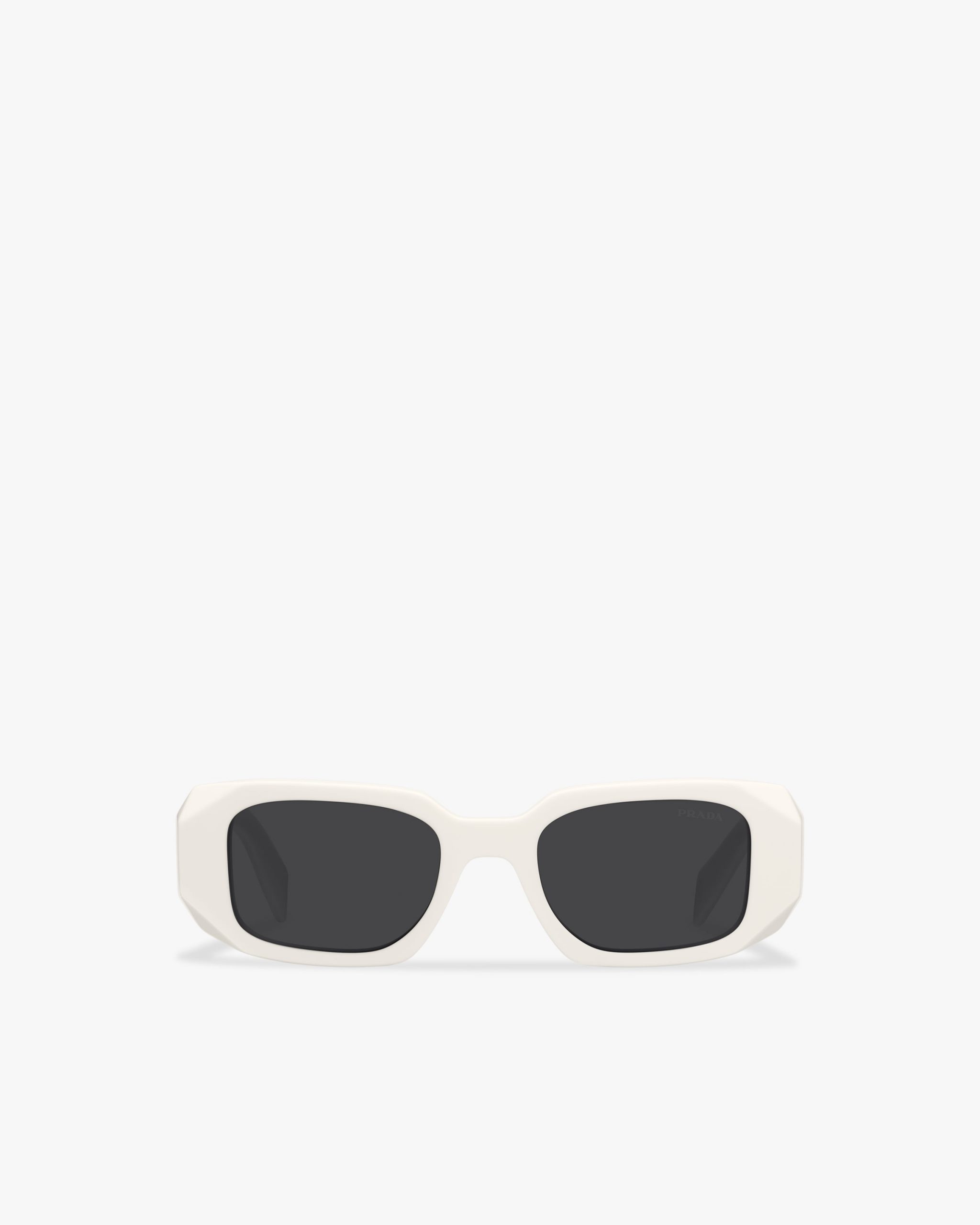 Acetate sunglasses with an oversized, geometric design. The bold frame front has an avant-garde silhouette defined by the extreme angled cut of the outer corners. The three-dimensional design of the temples is decorated with an iconographic interpretation of the traditional Prada triangle logo.