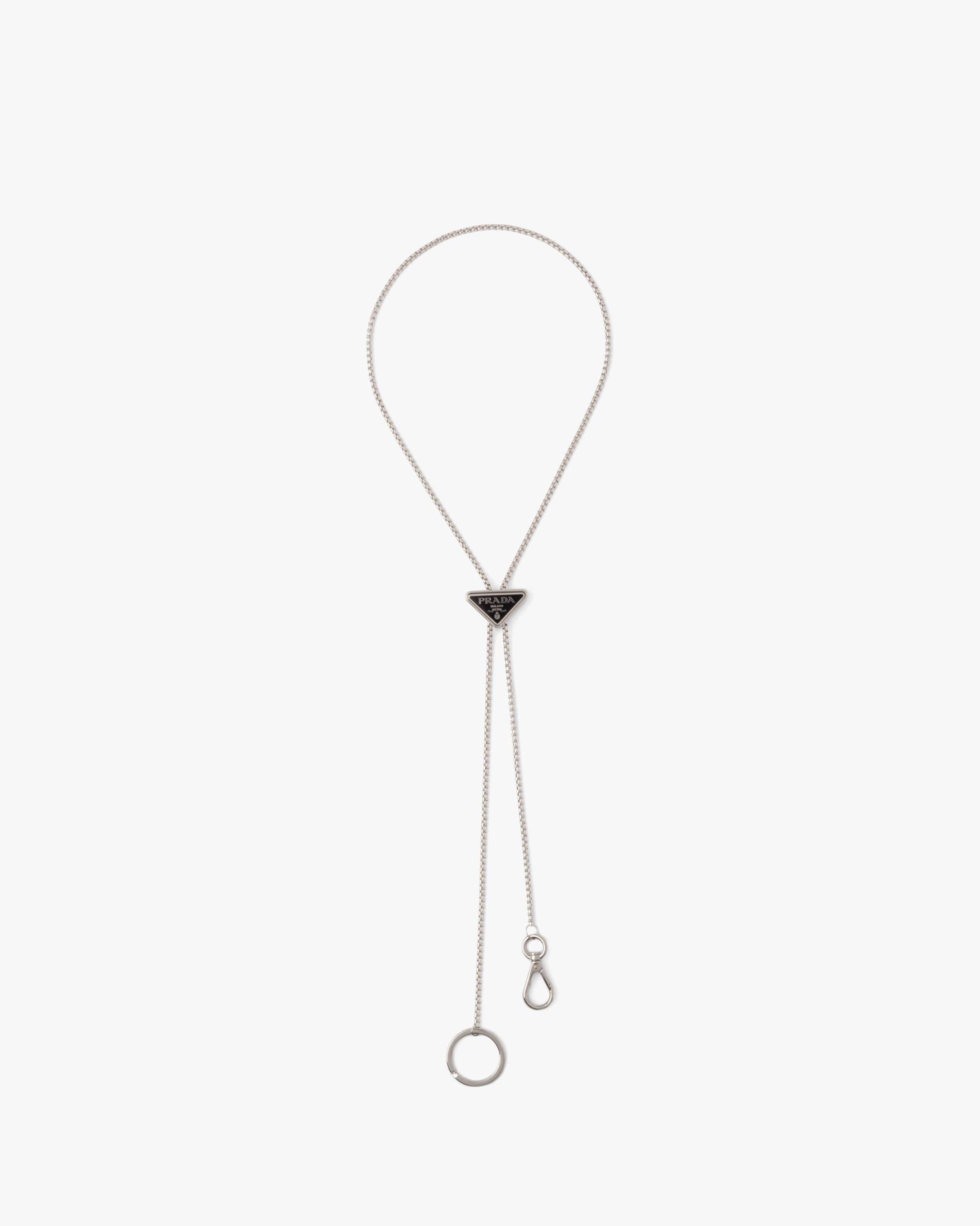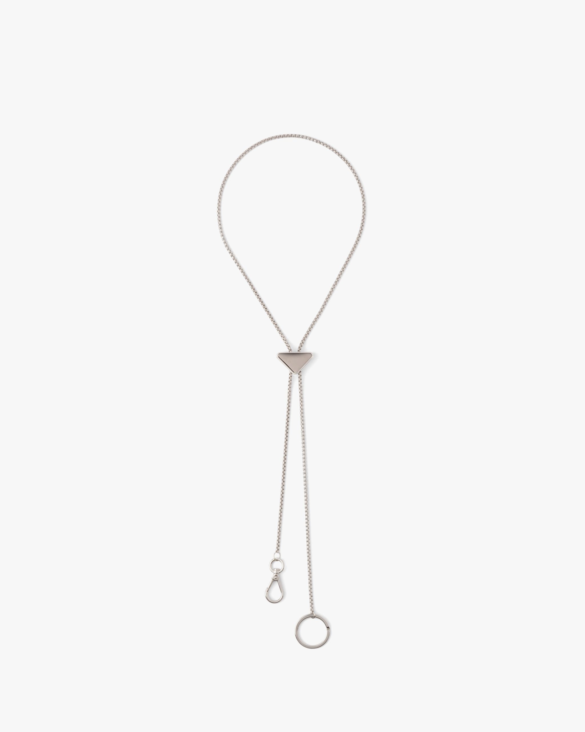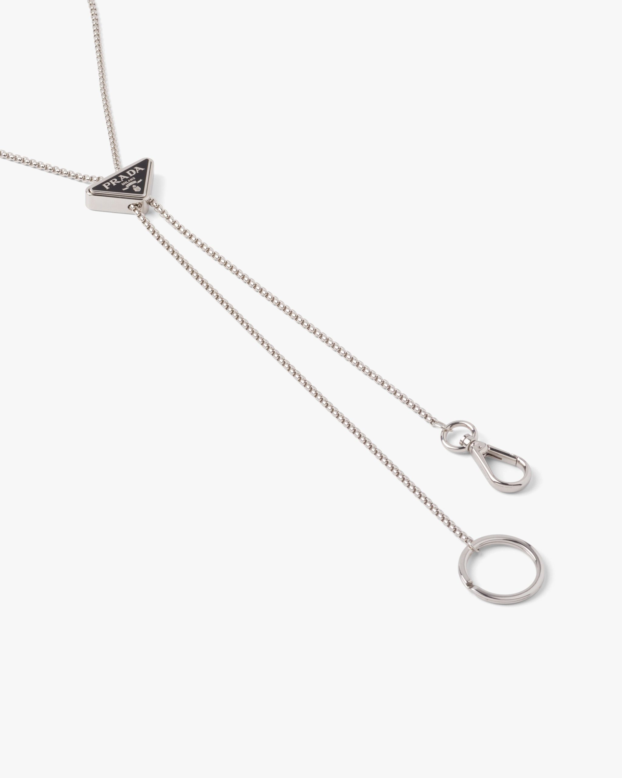 Presented in new versions each season, the emblematic enameled triangle logo that first appeared on Prada trunks in 1913 is transformed into a precious detail that decorates this metal keychain.