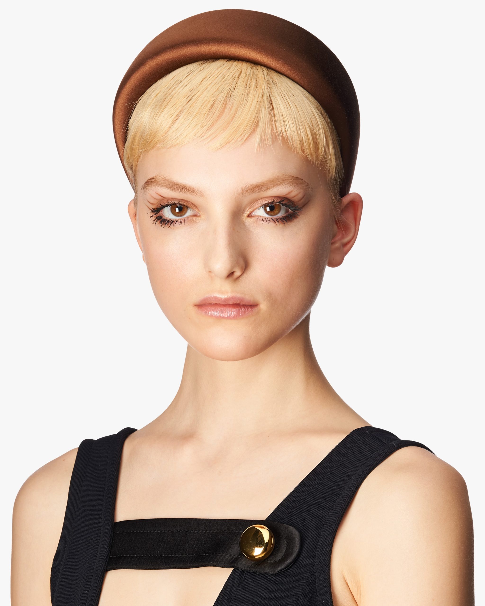 This wide satin headband has a wraparound design that gives a refined touch to the look.