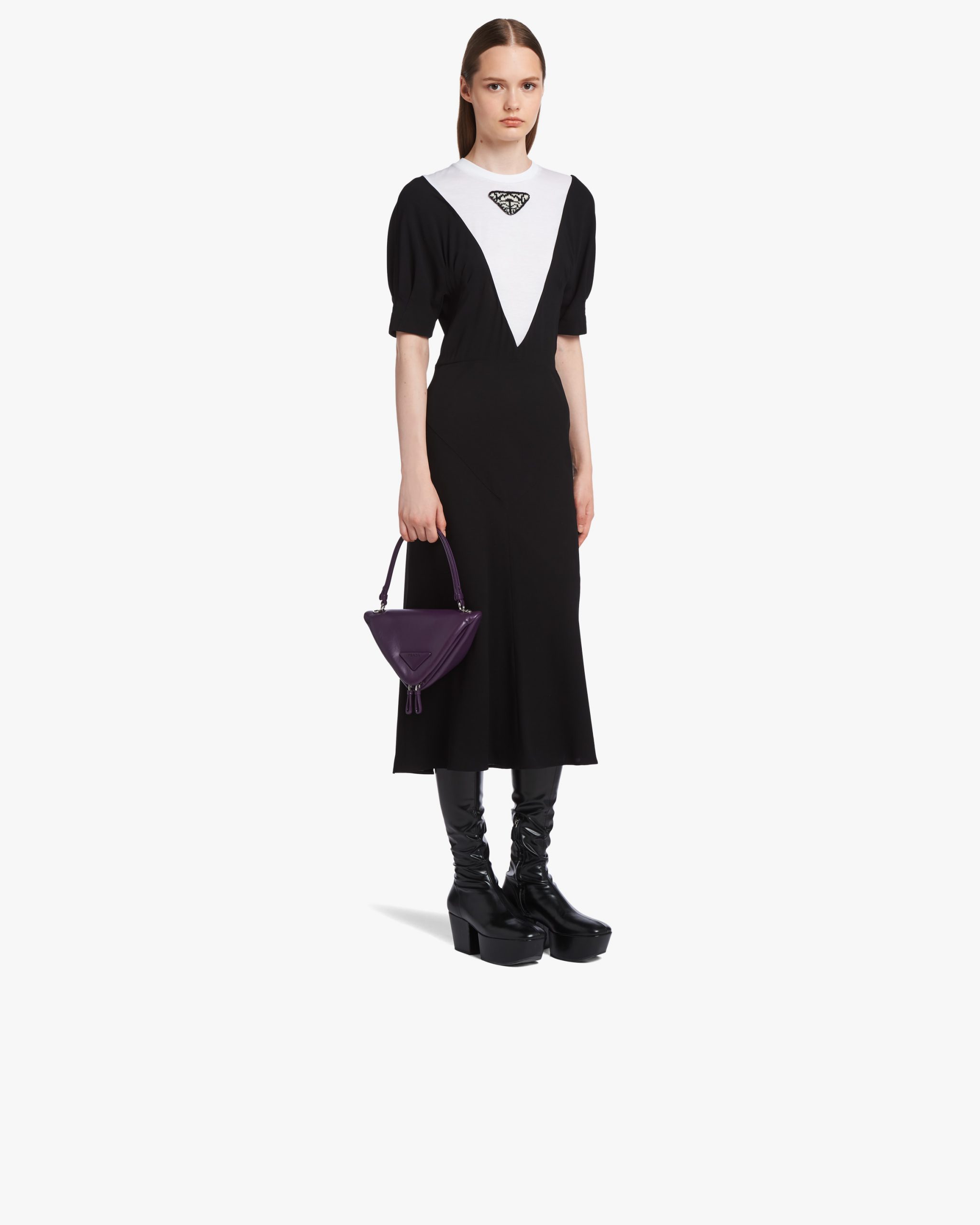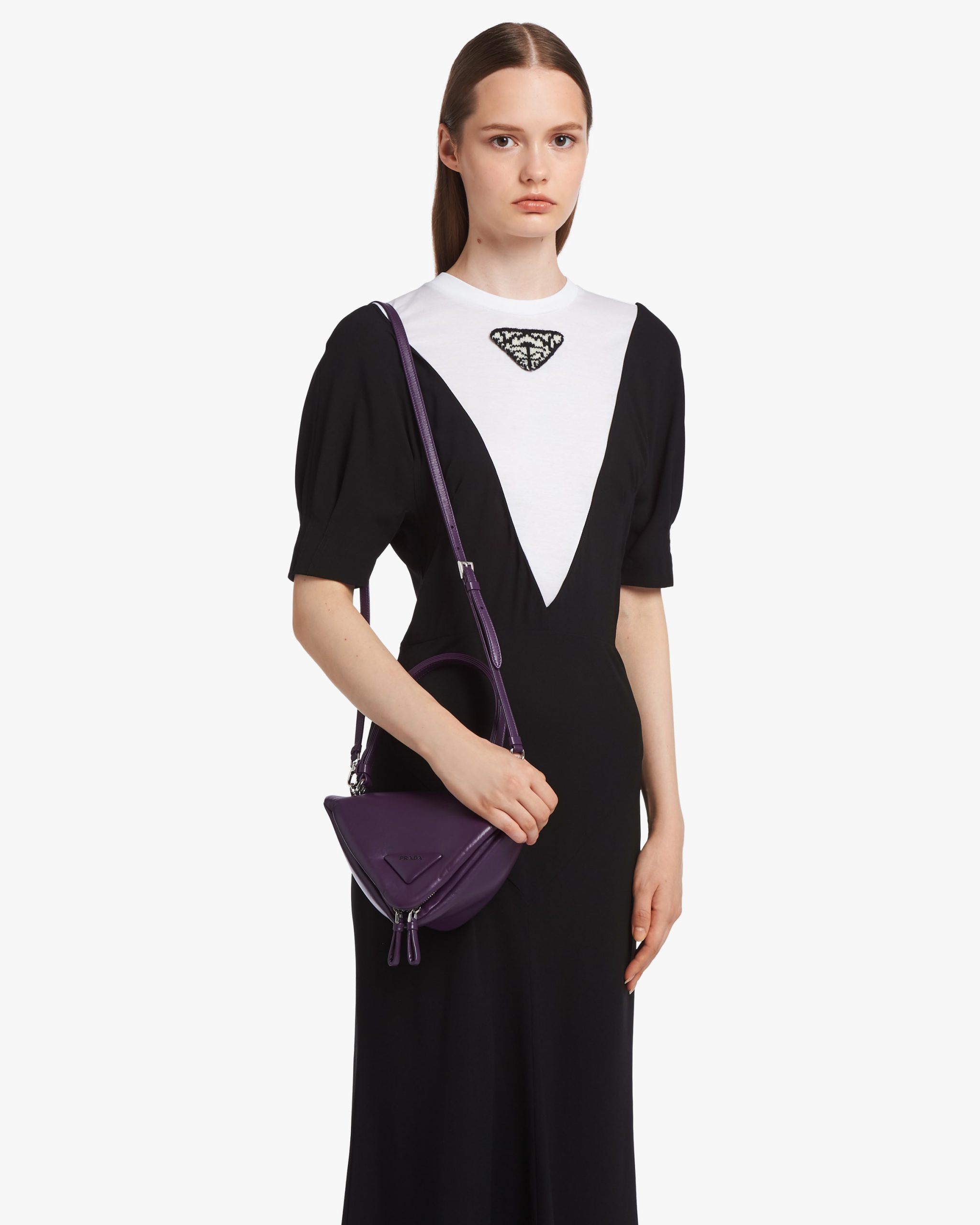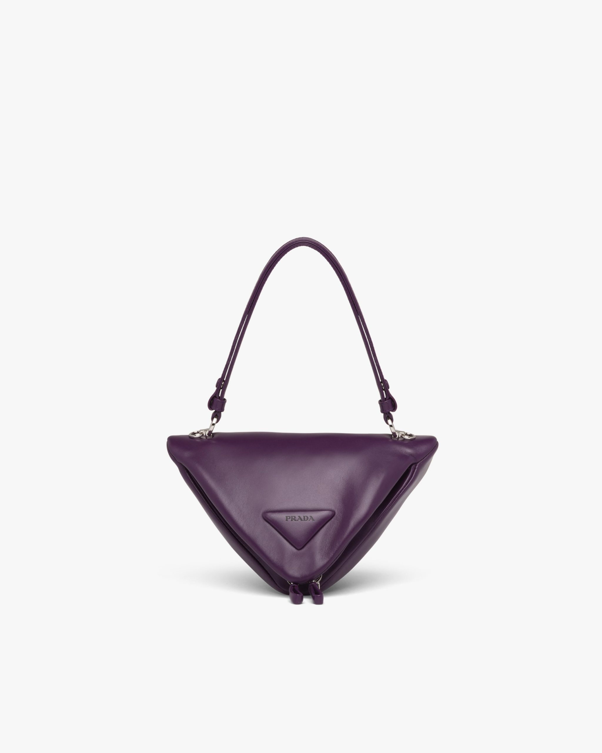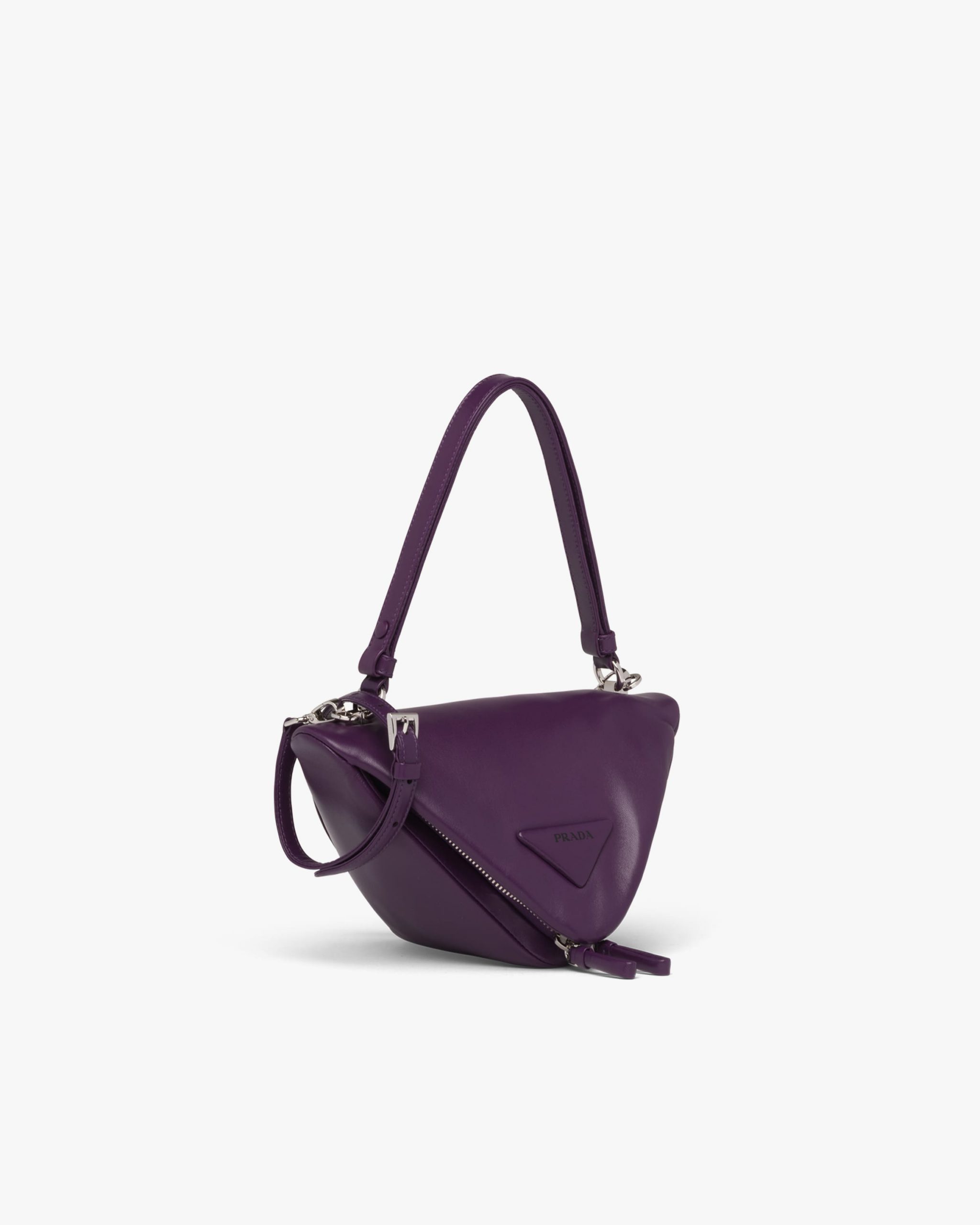 A study of the triangle inspires new geometric details and unique interpretations of the historic Prada logo. The iconic shape is reworked in the design of this handbag with soft reverse stitch construction, completed by a handle and detachable shoulder strap that lets it be worn in different ways.