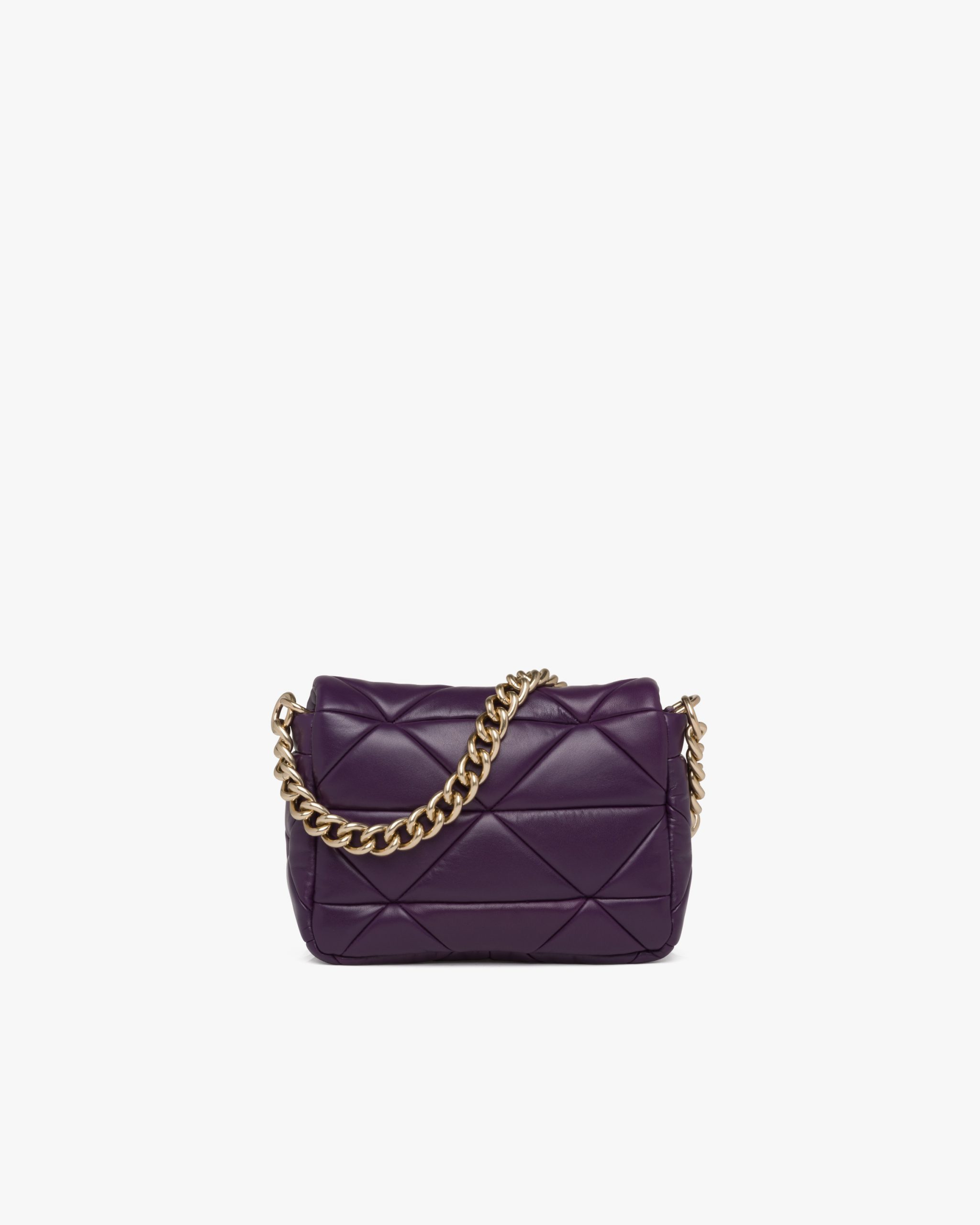 Reinterpreted in always new ways, Prada’s iconic triangle appears in the stitched perforated motif of this shoulder bag in soft leather, creating a patchwork pattern. A removable mini-pouch, a distinctive element among the brand’s accessories, completes the shoulder bag and adds a contemporary, versatile note to the style.