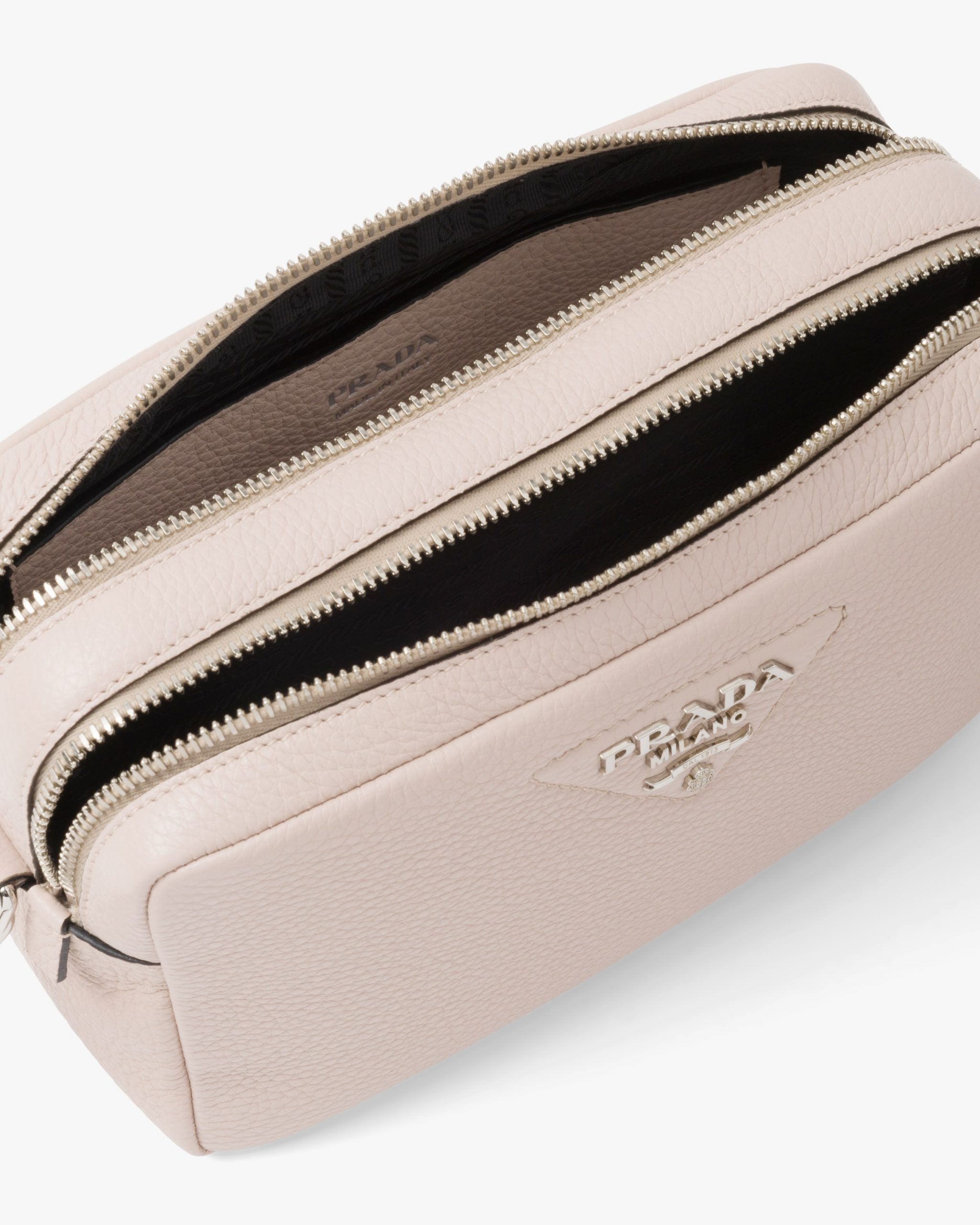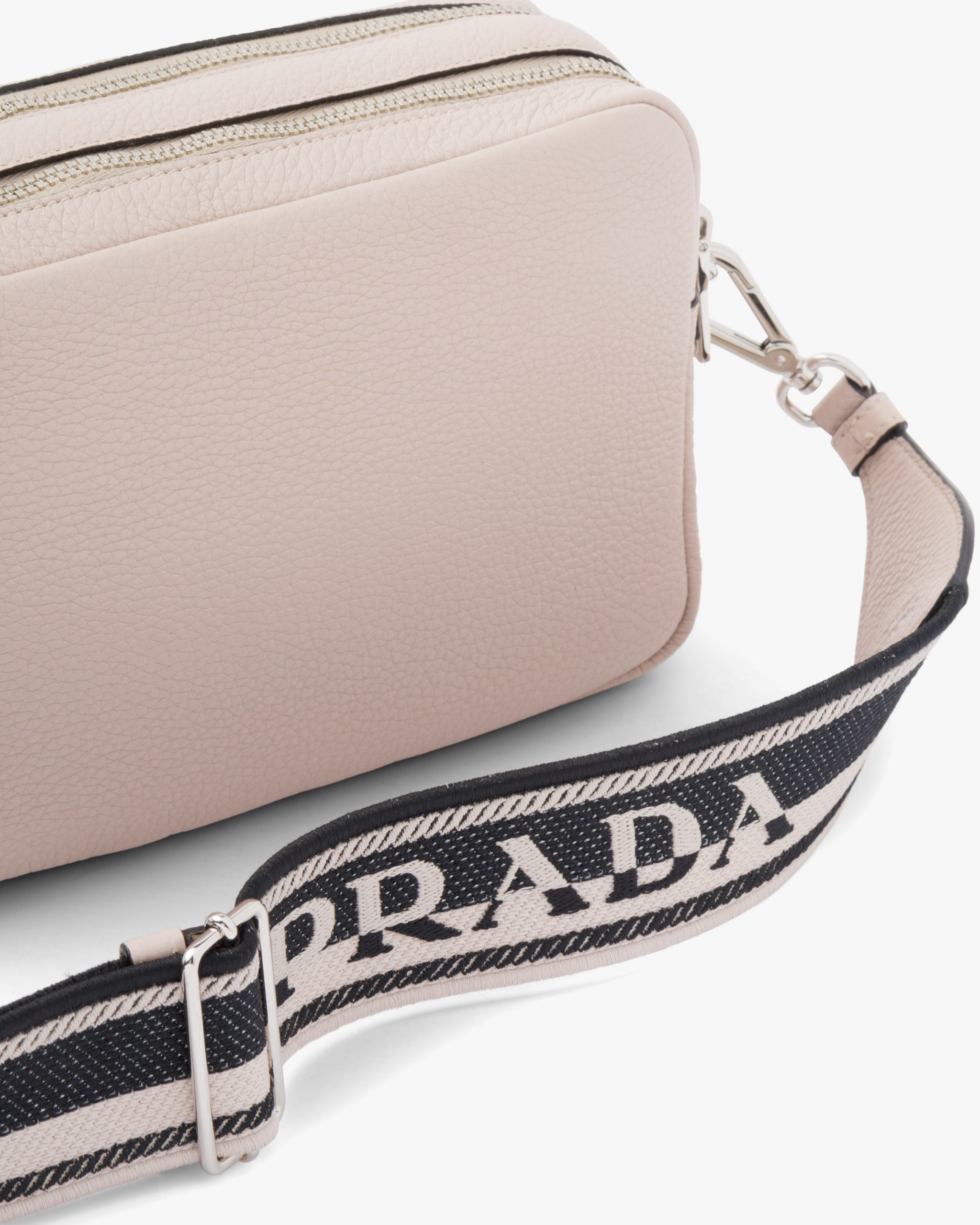 This Prada Flou leather shoulder bag with a double zipper is made of soft leather and illuminated by metal hardware for a modern accent. The accessory is completed by the detachable woven tape shoulder strap embroidered with the logo in a contrasting color, that makes it wearable as a crossbody or shoulder bag.