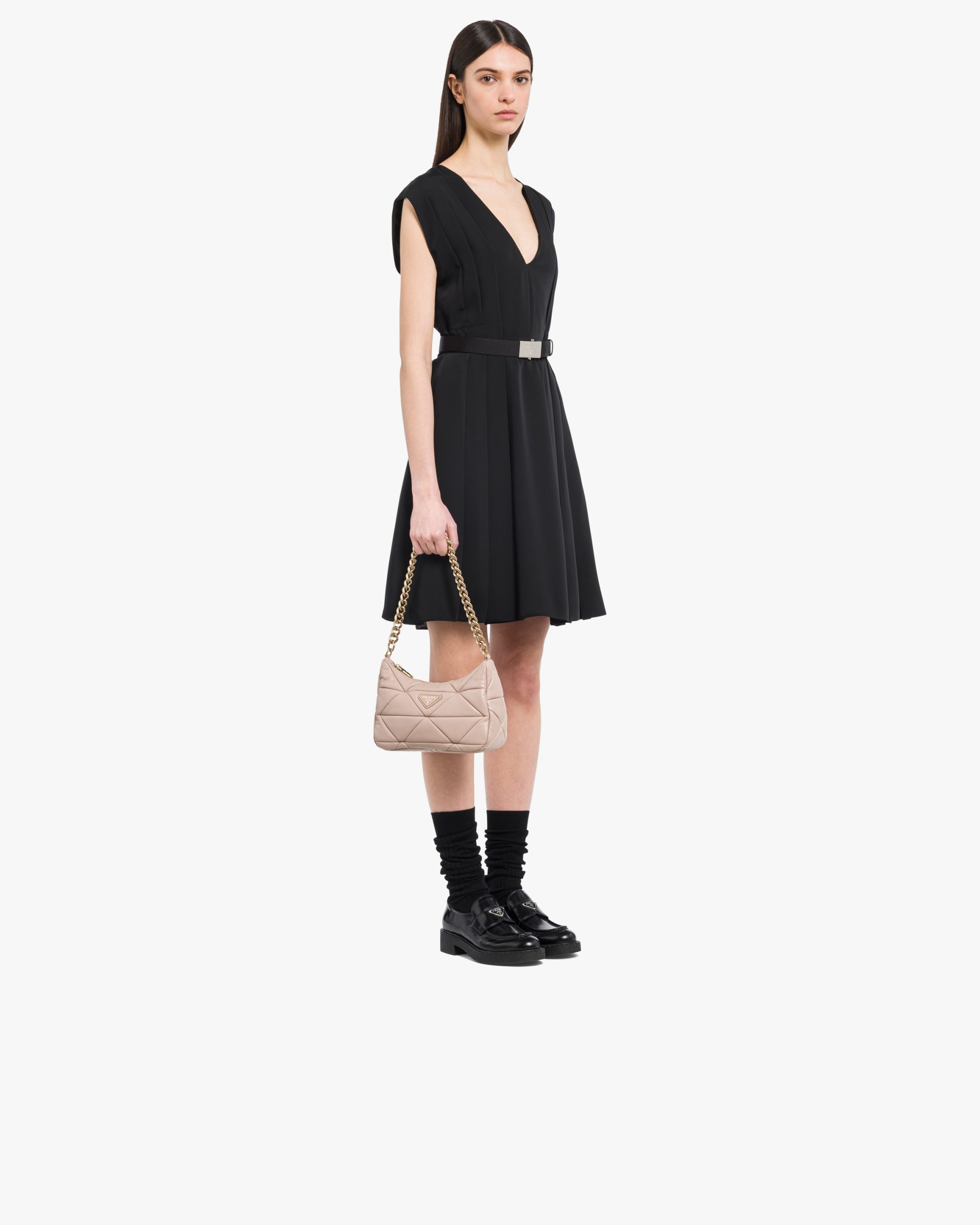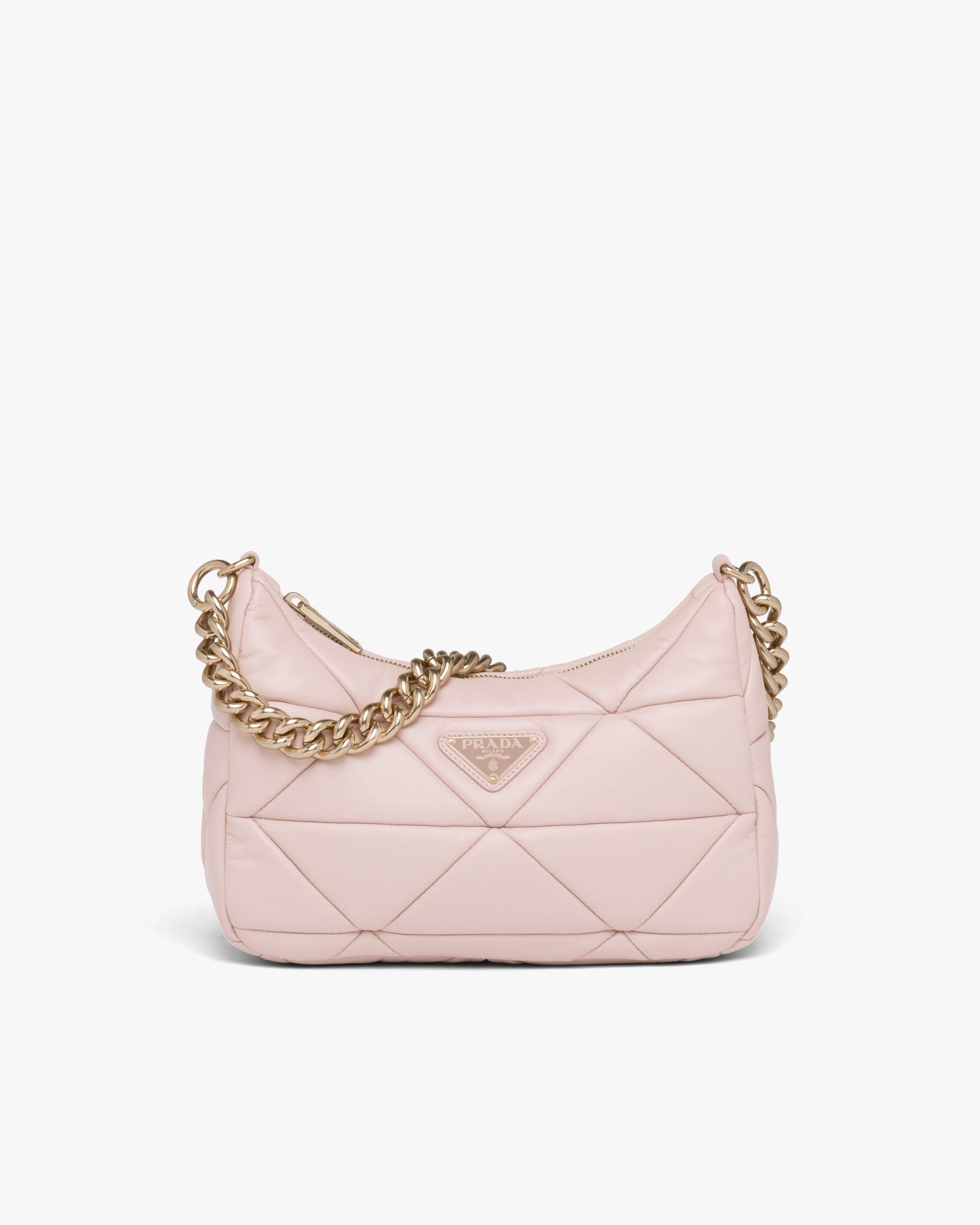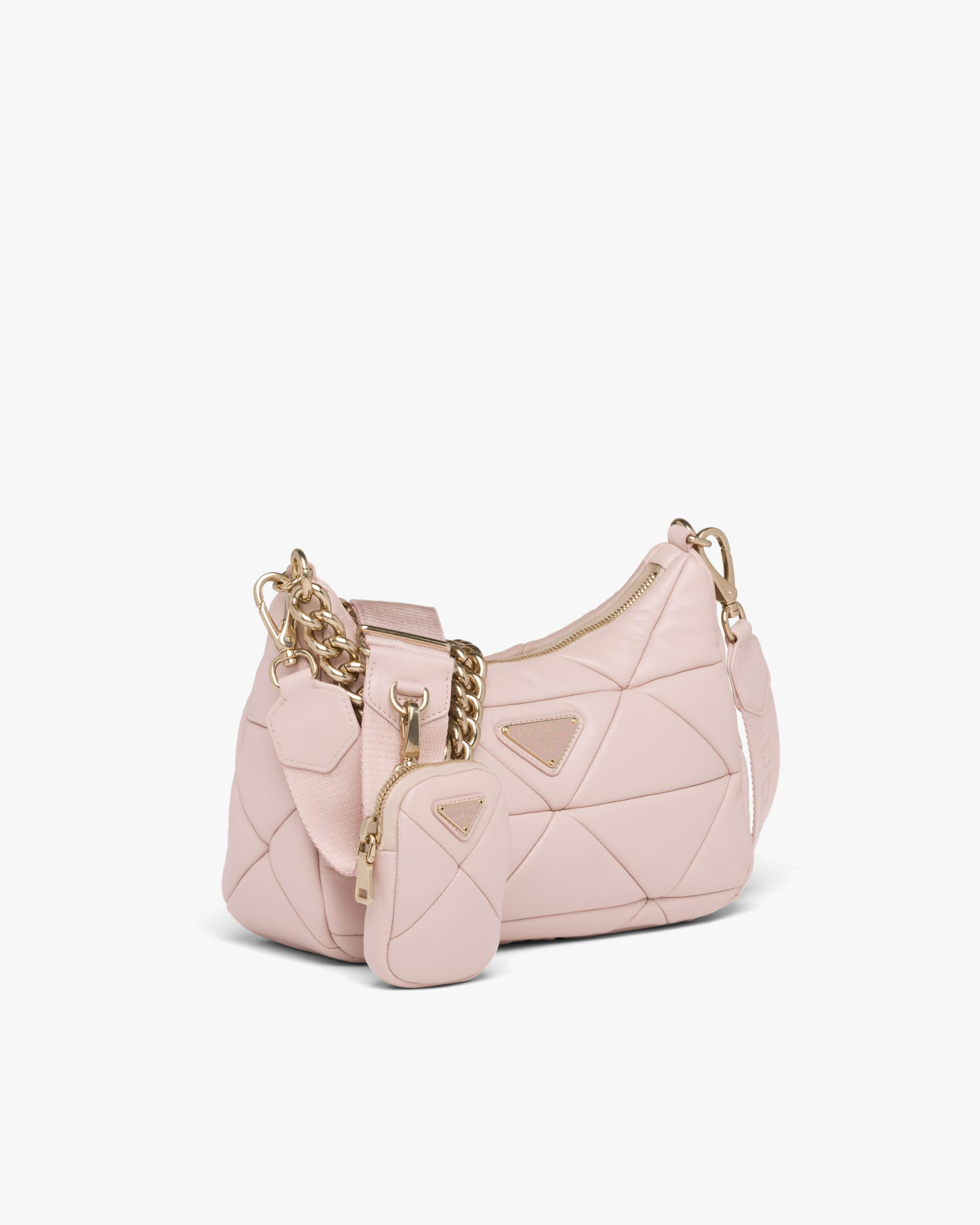 An exquisite patchwork technique, an expression of brand know-how, forms a triangle motif on this Prada System shoulder bag with chain handle. The detachable woven nylon shoulder strap, which allows the accessory to be worn in different ways, has a detachable pouch, a recurring detail of Prada collectsions.