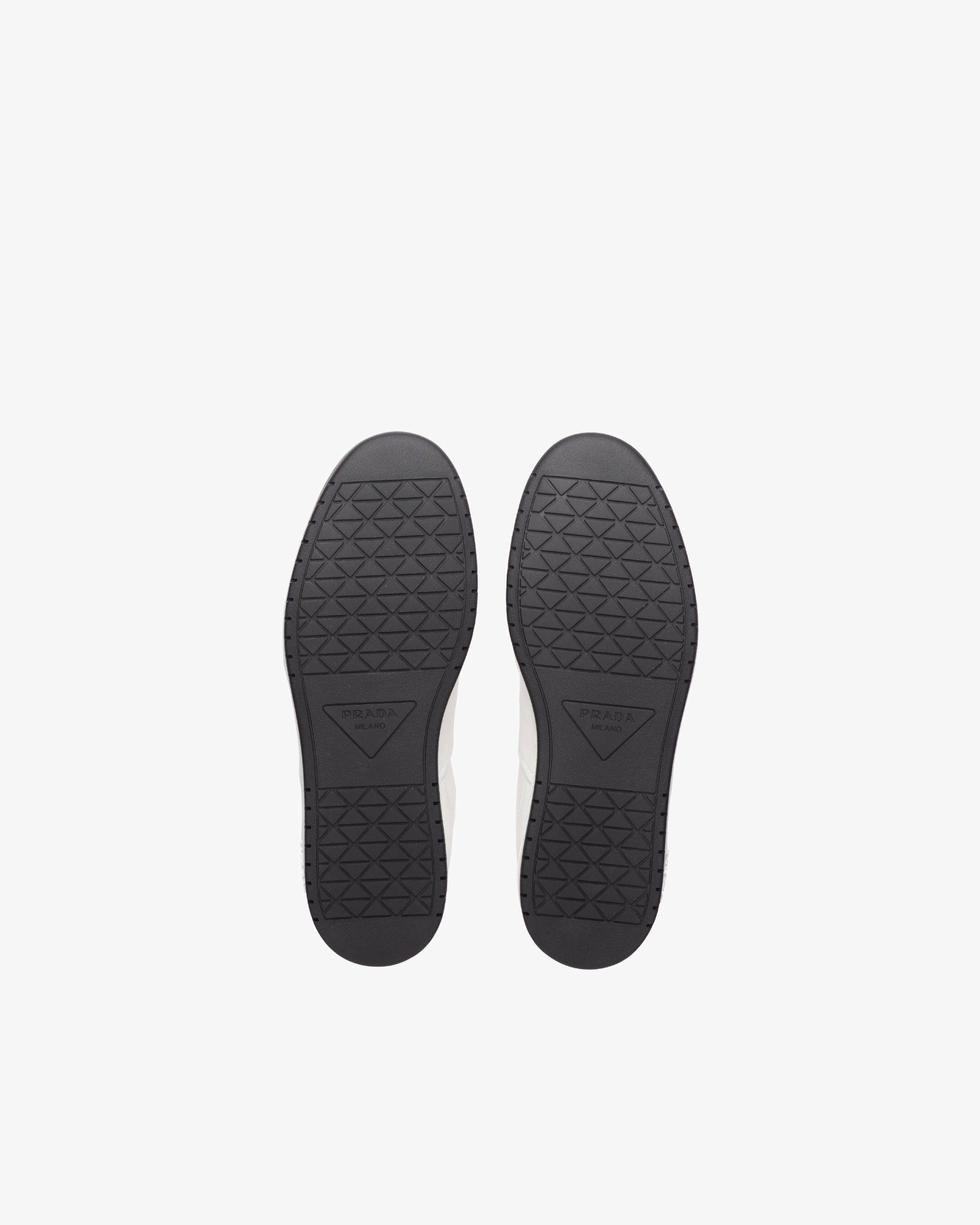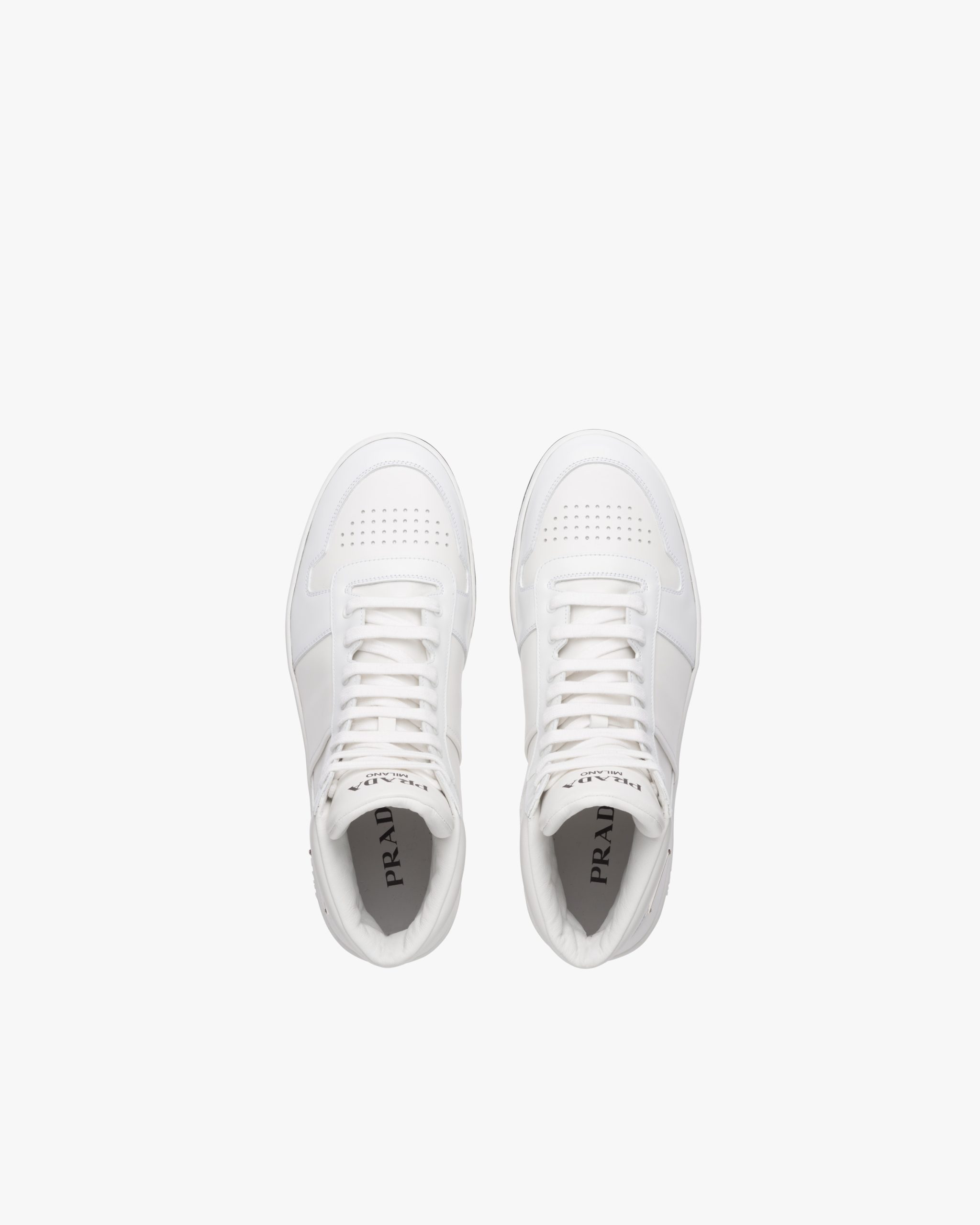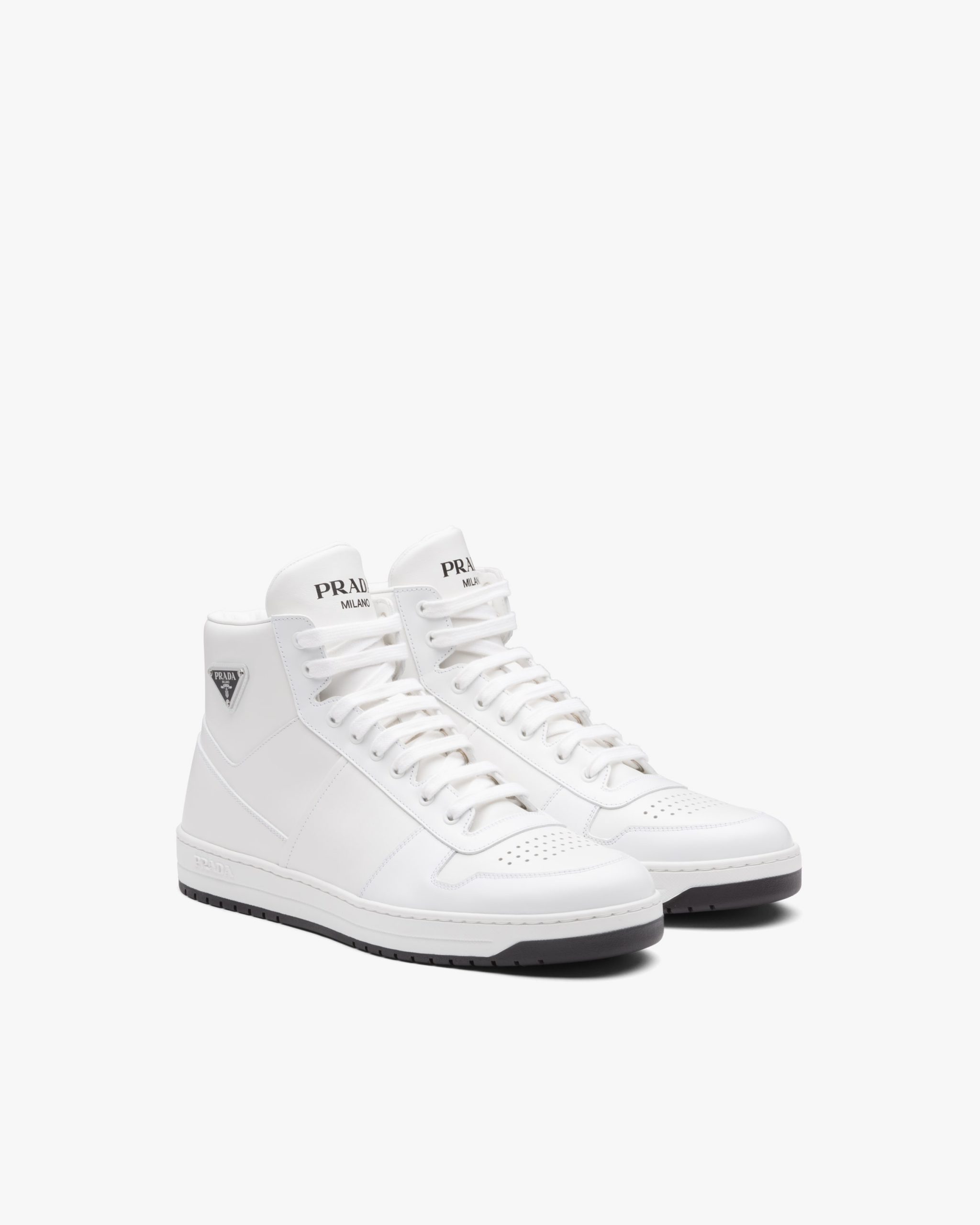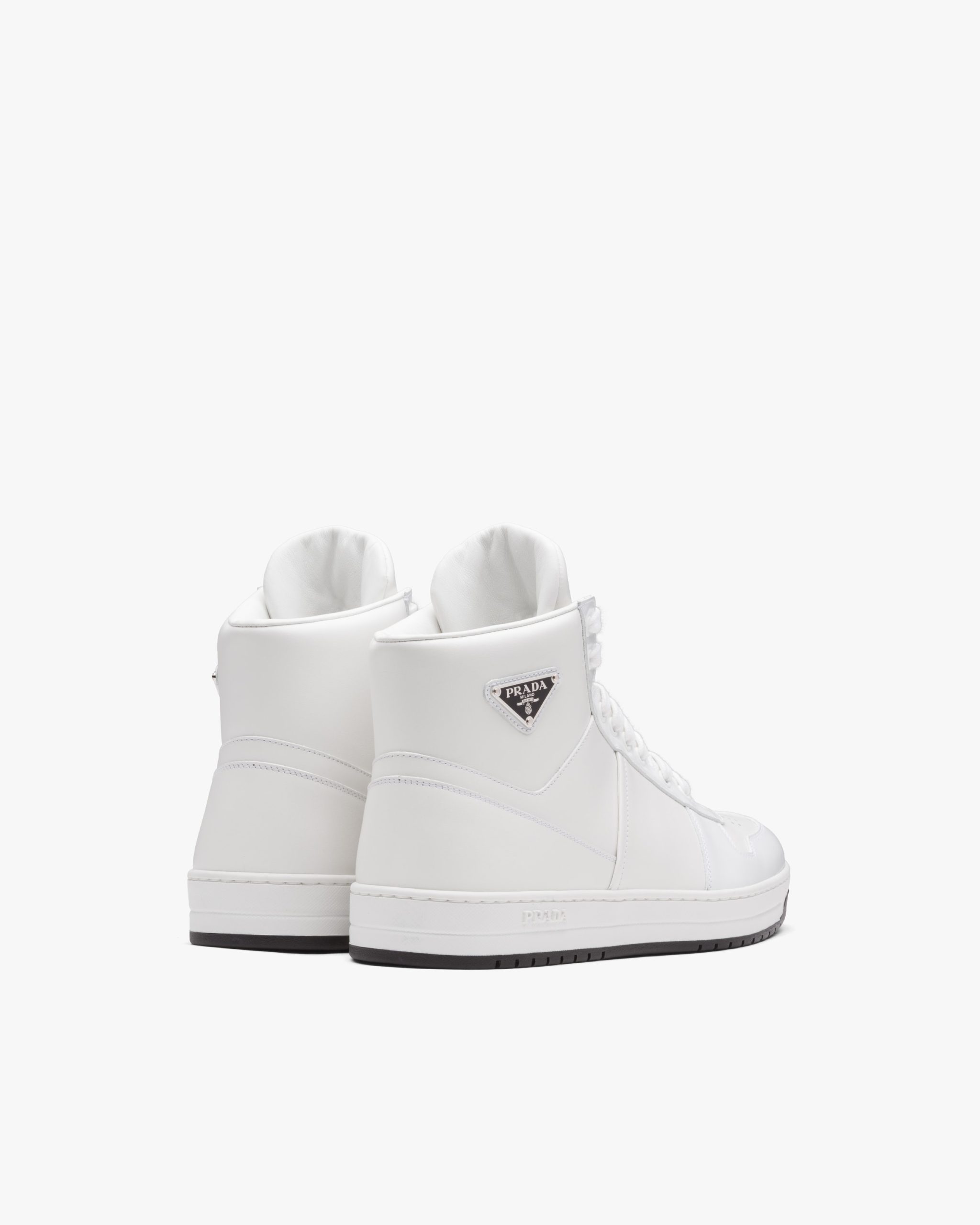 These sporty leather high-top sneakers are accented with different interpretations of the Prada logo that appears on the tongue, along the light rubber sole, and as the iconic enameled metal triangle decorating the ankle.