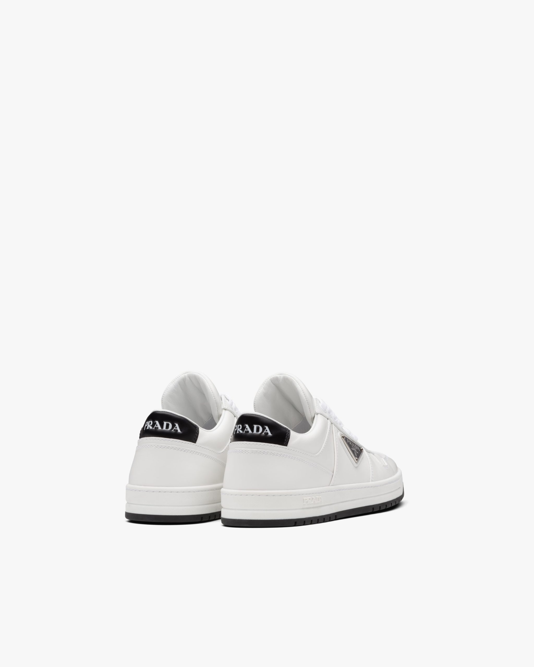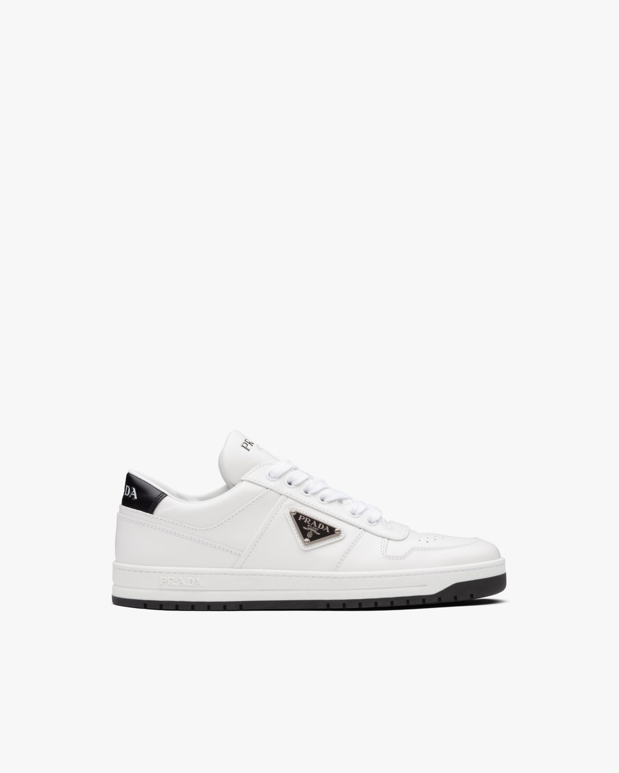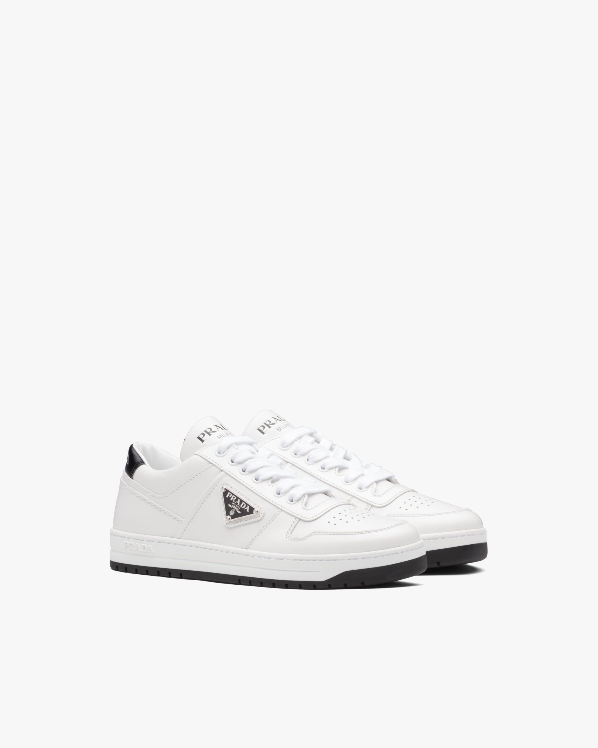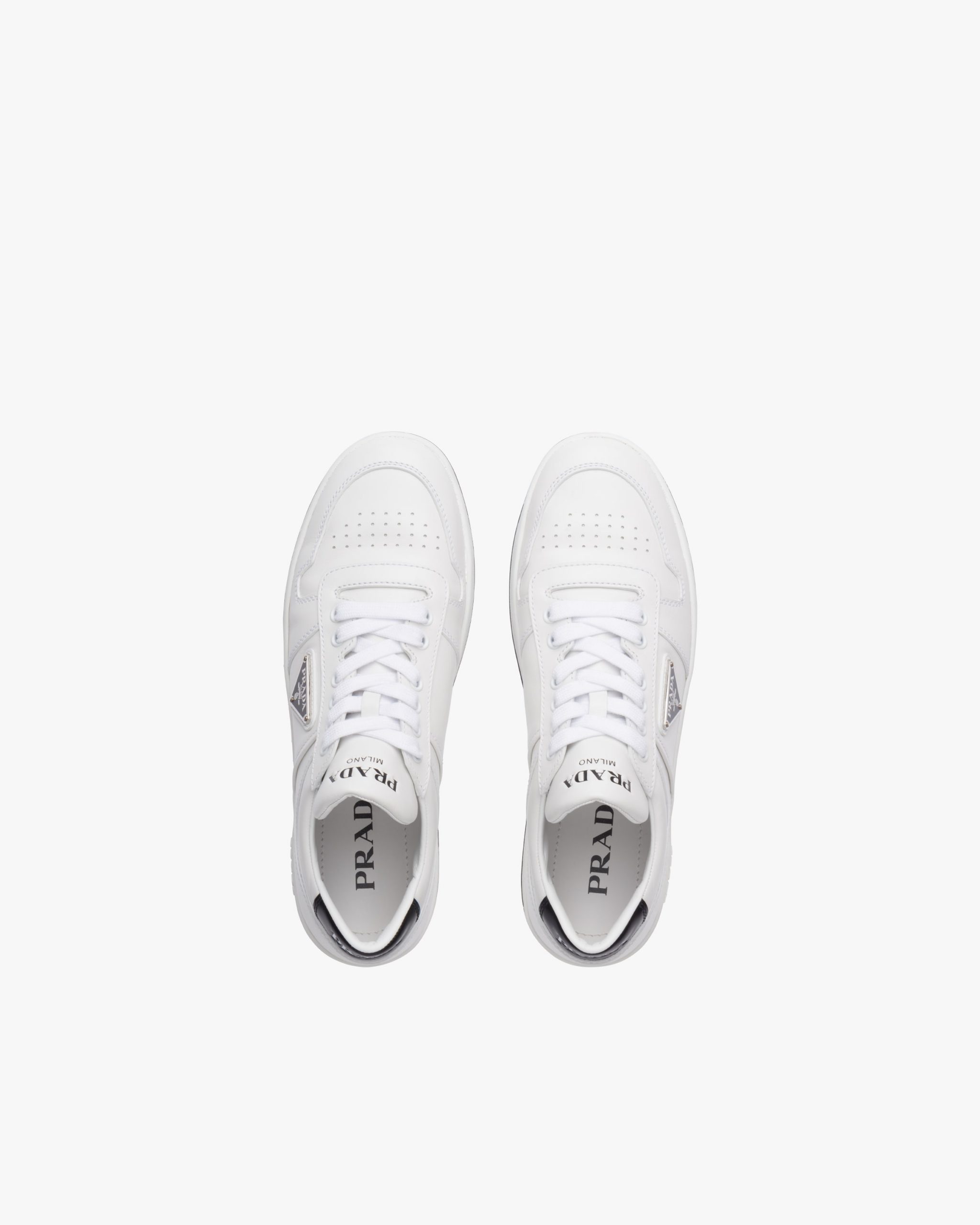 These sporty sneakers made of perforated leather feature various interpretations of the Prada logo that appears on the tongue, along the light rubber sole, and in the form of the iconic enameled triangle logo decorating the side.