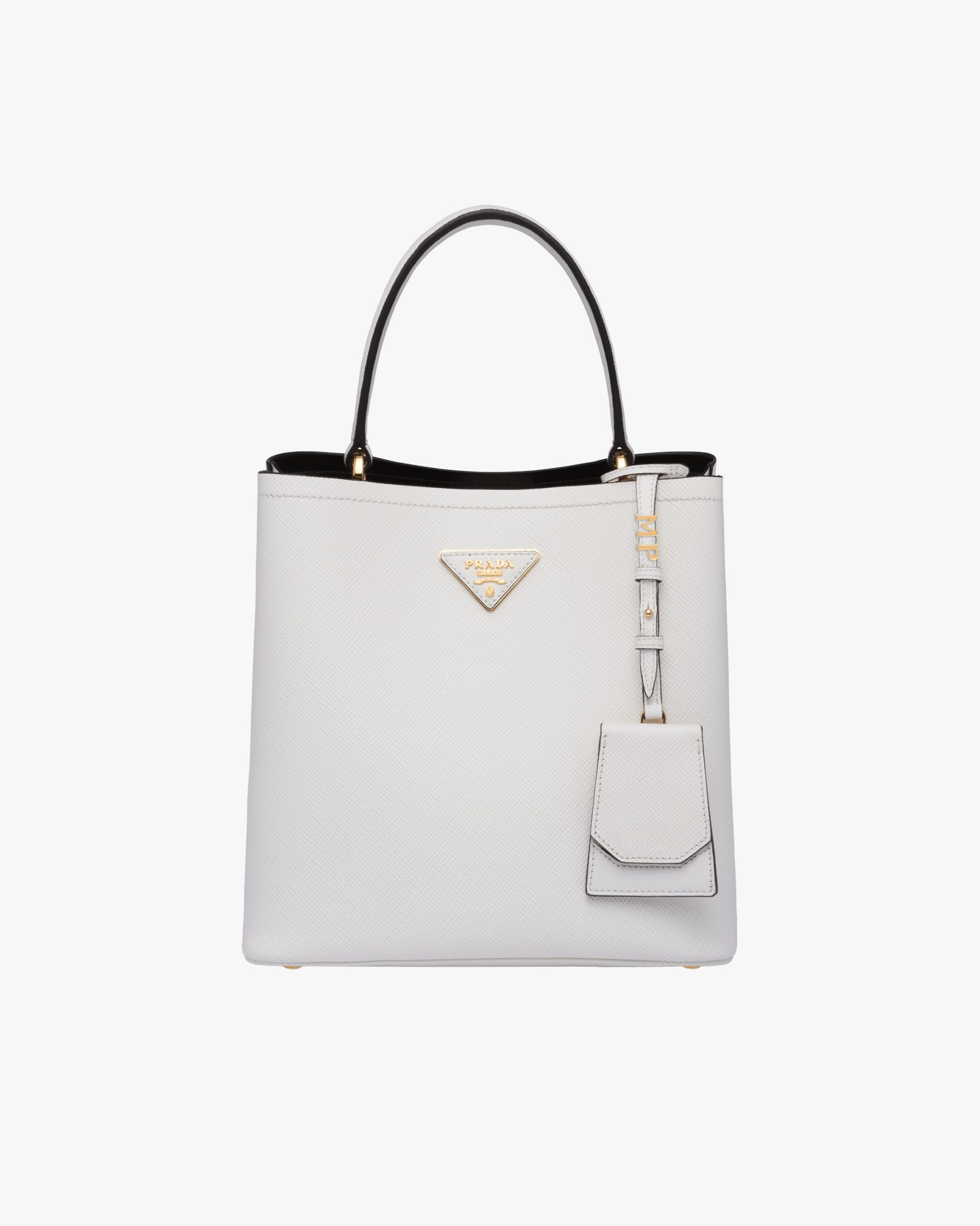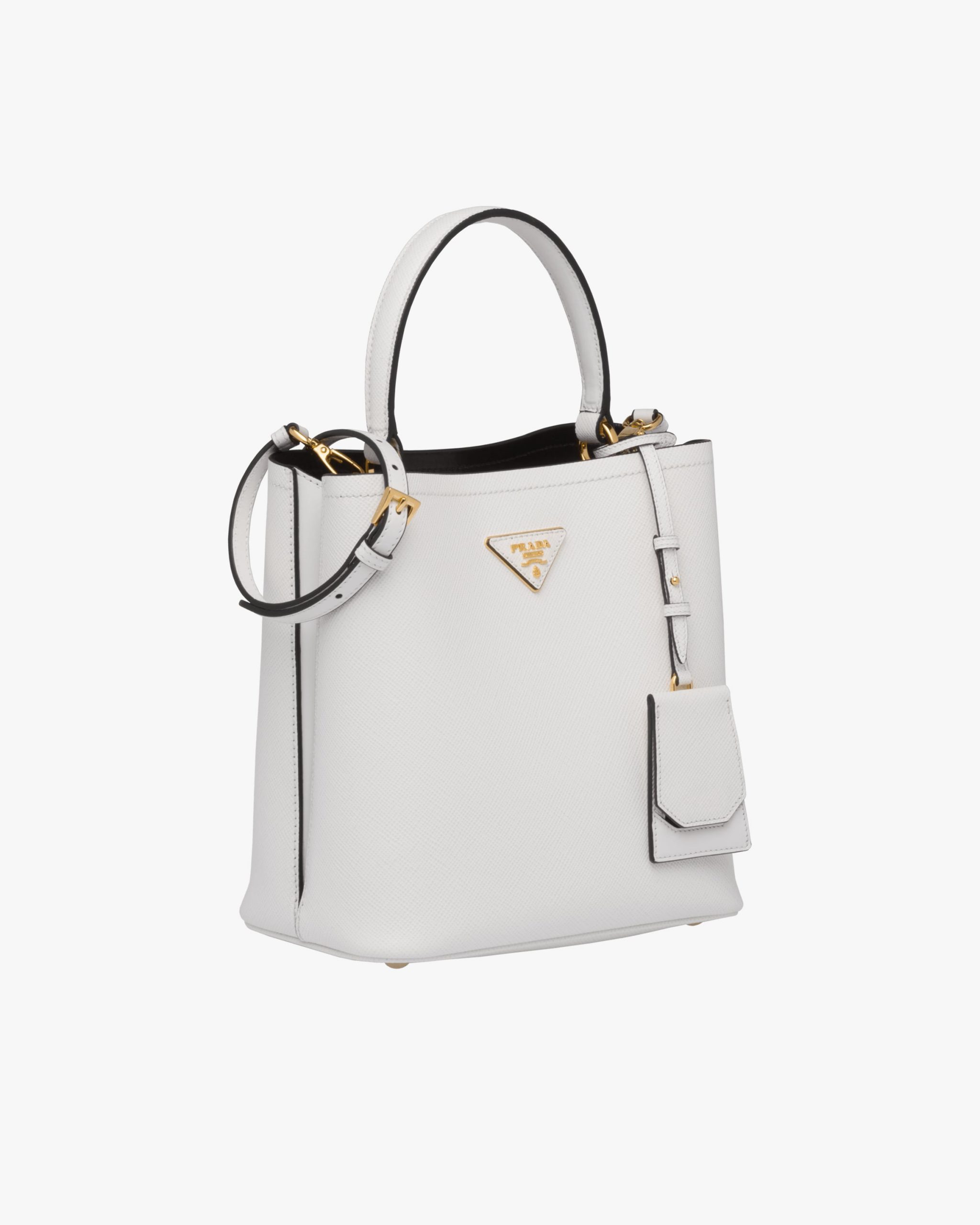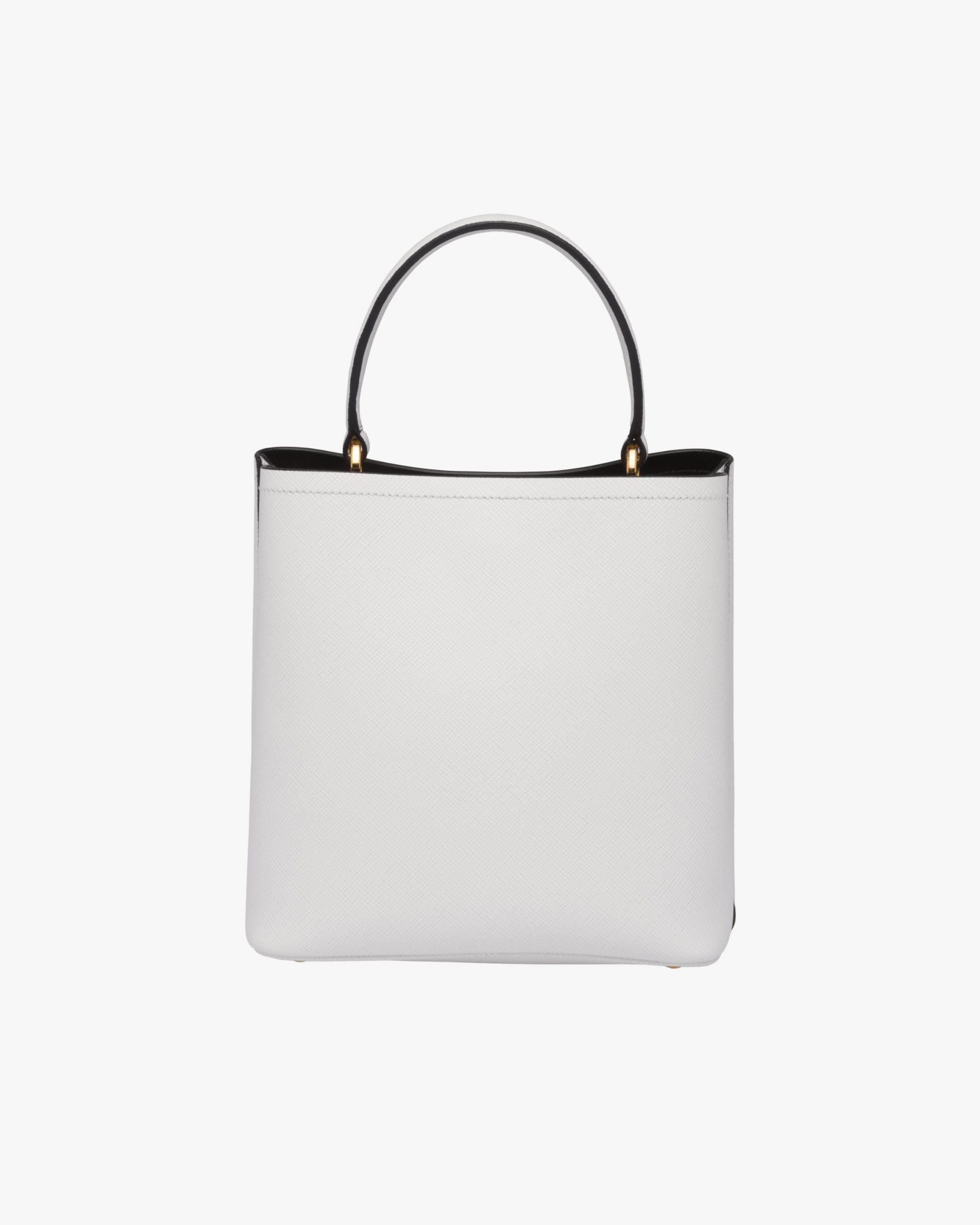 The elegant design of the Prada Panier bag is emphasized by the unmistakable texture of Saffiano leather. The bag has a detachable shoulder strap and an exclusive leather name tag with metal logo.