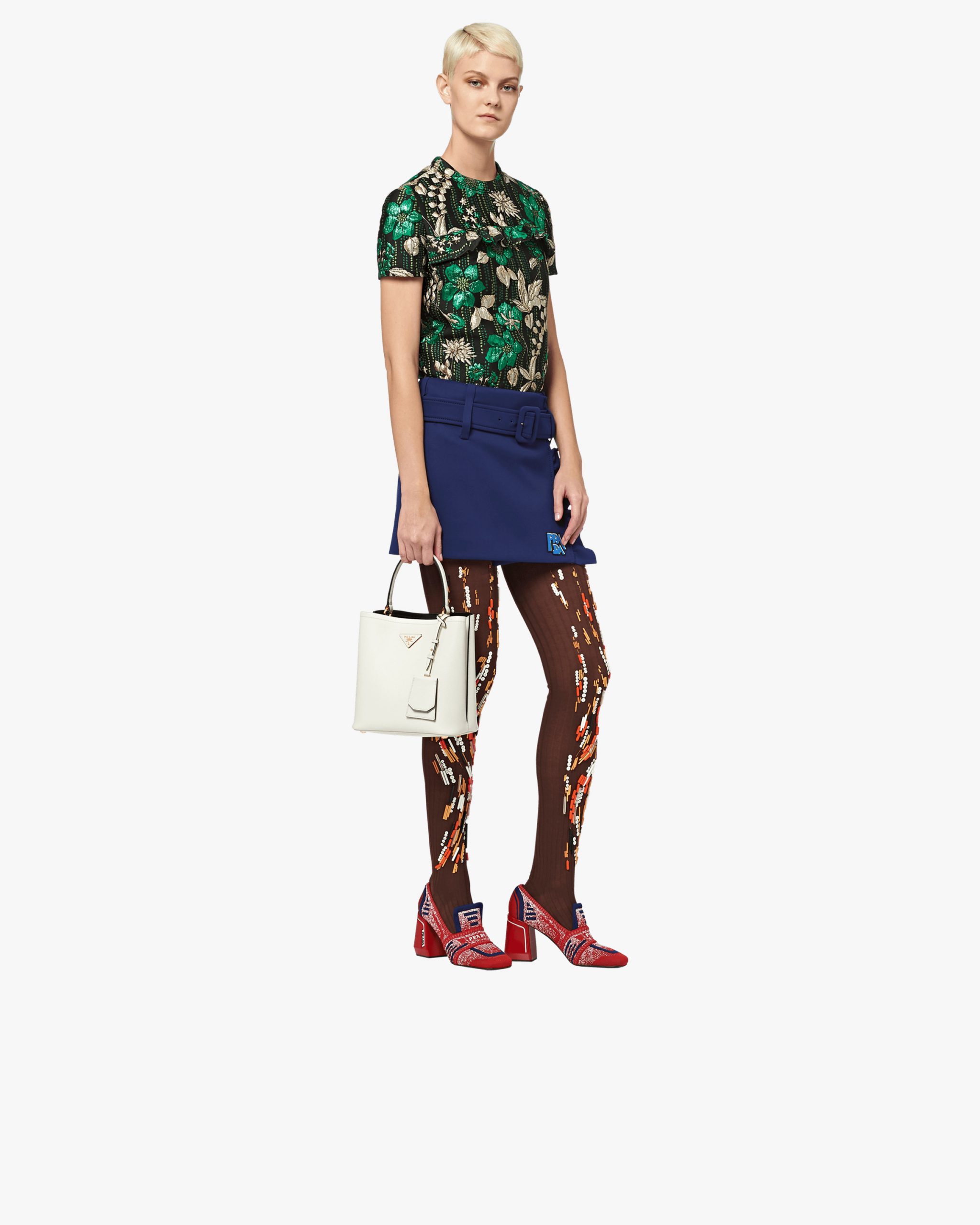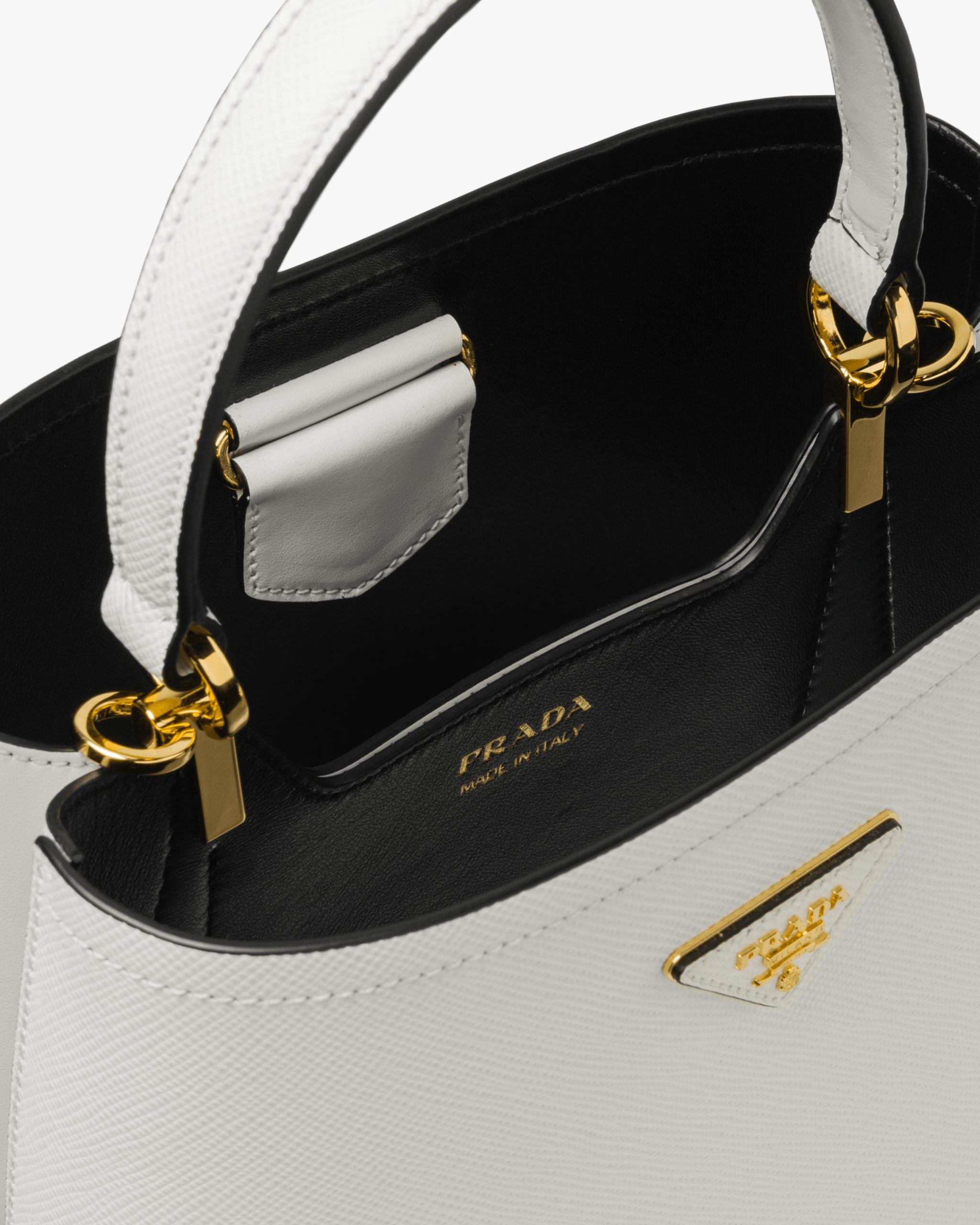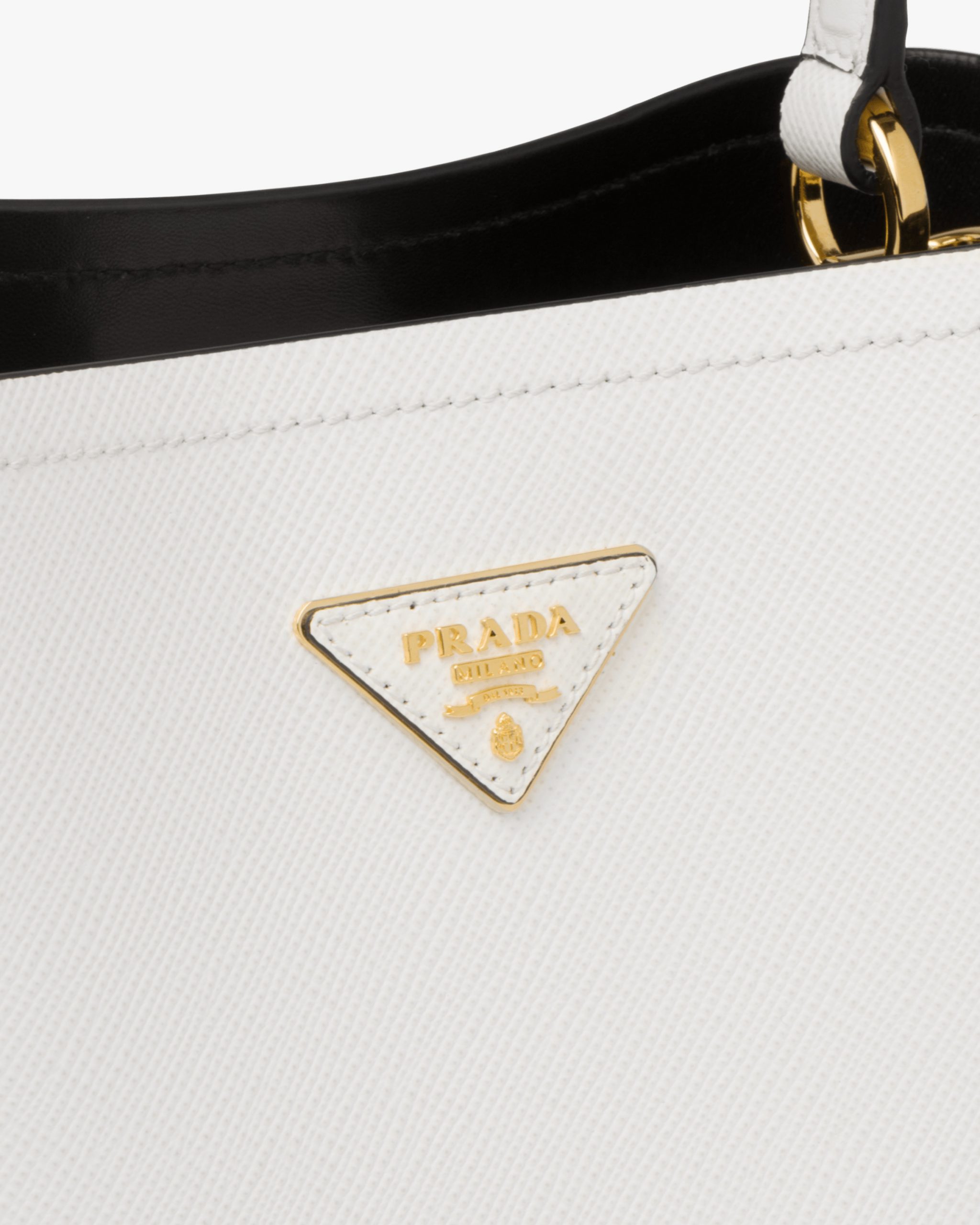 The elegant design of the Prada Panier bag is emphasized by the unmistakable texture of Saffiano leather. The bag has a detachable shoulder strap and an exclusive leather name tag with metal logo.