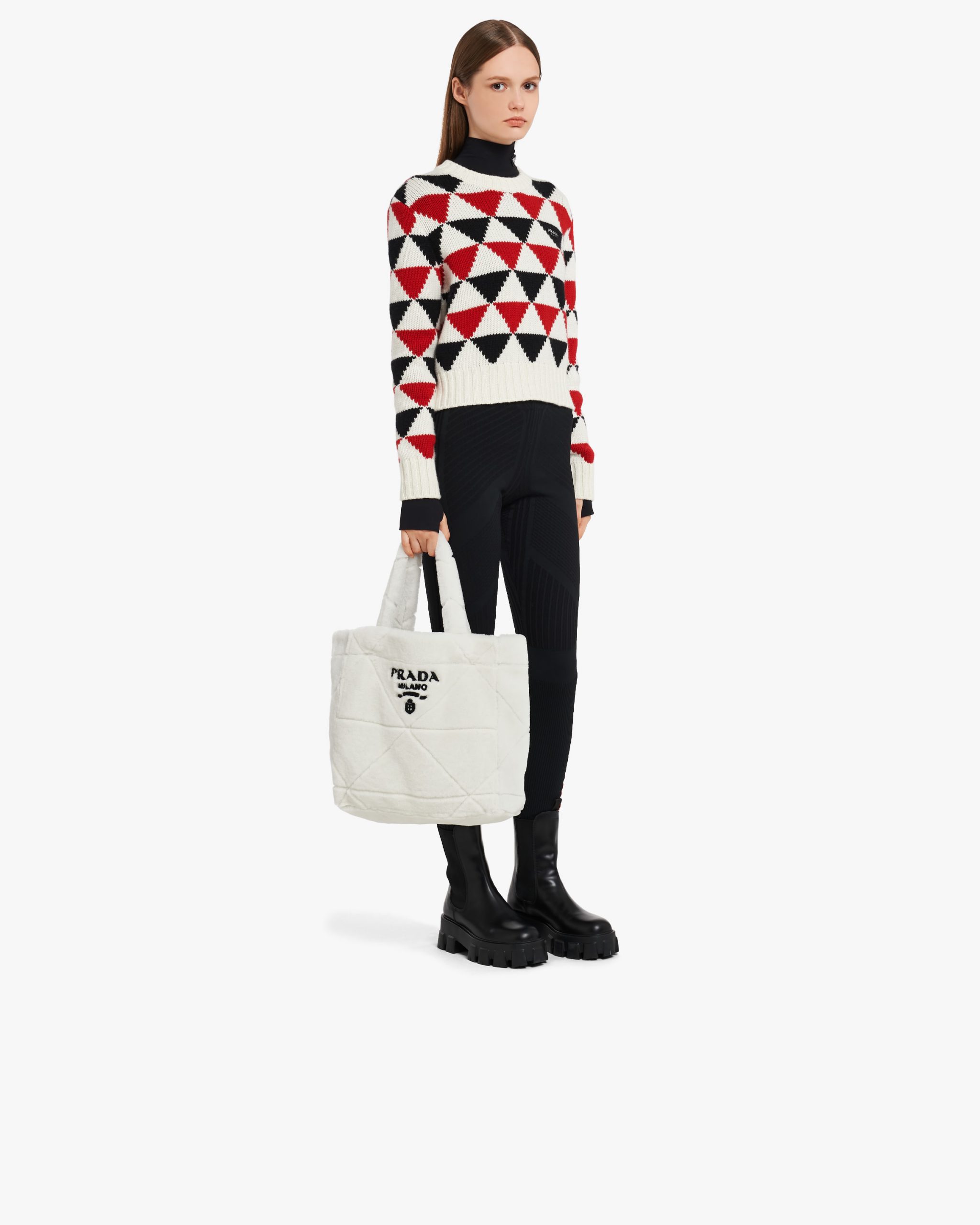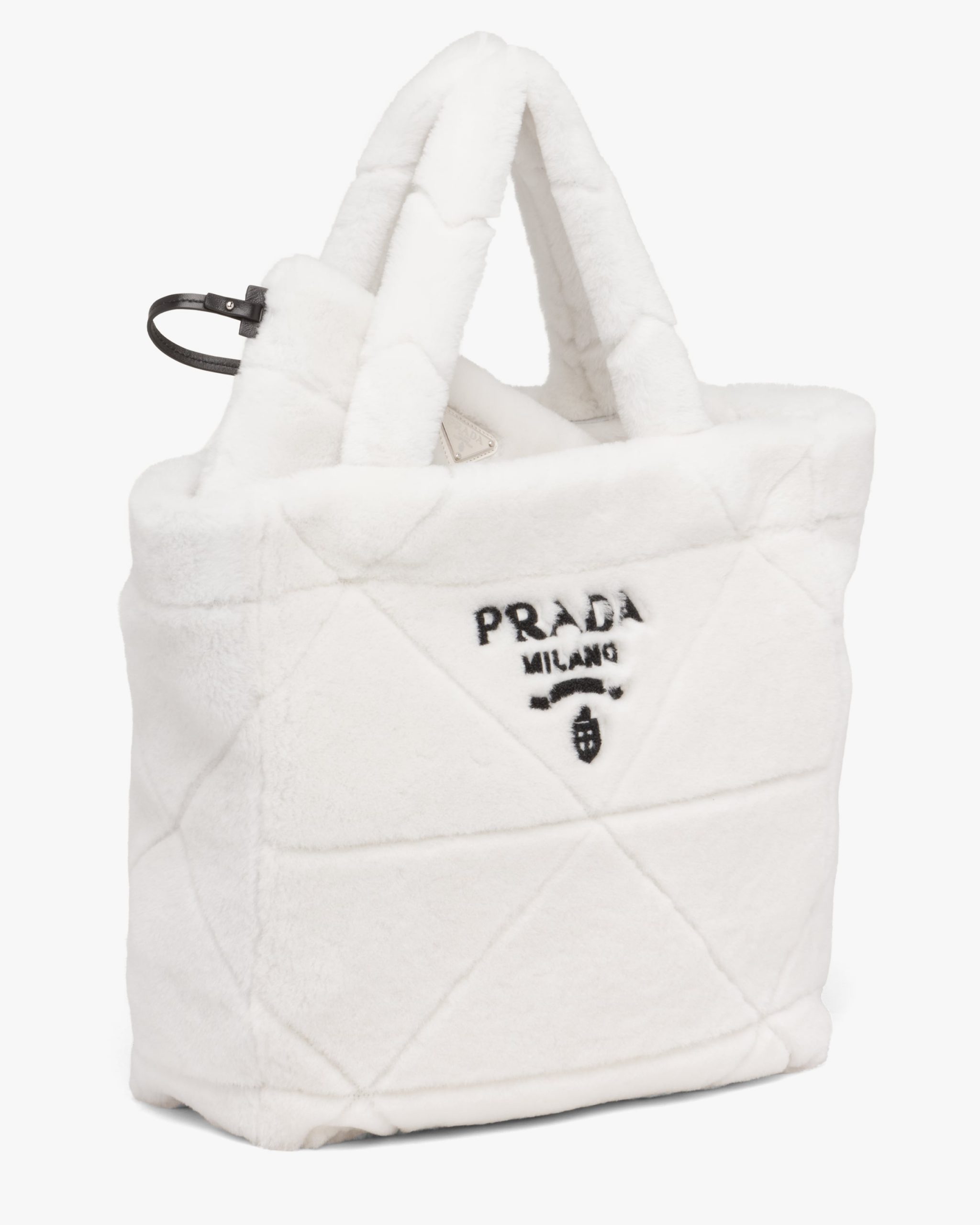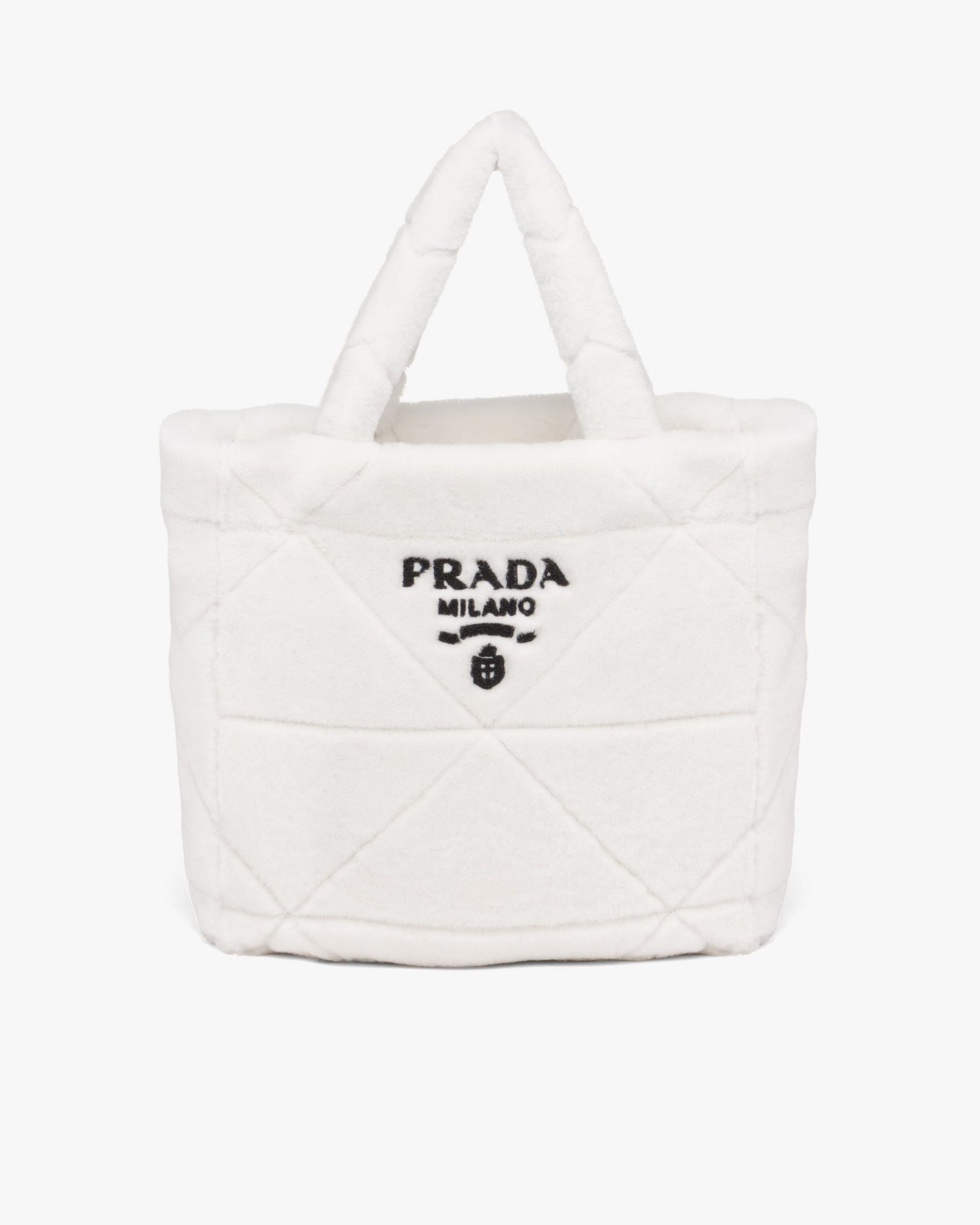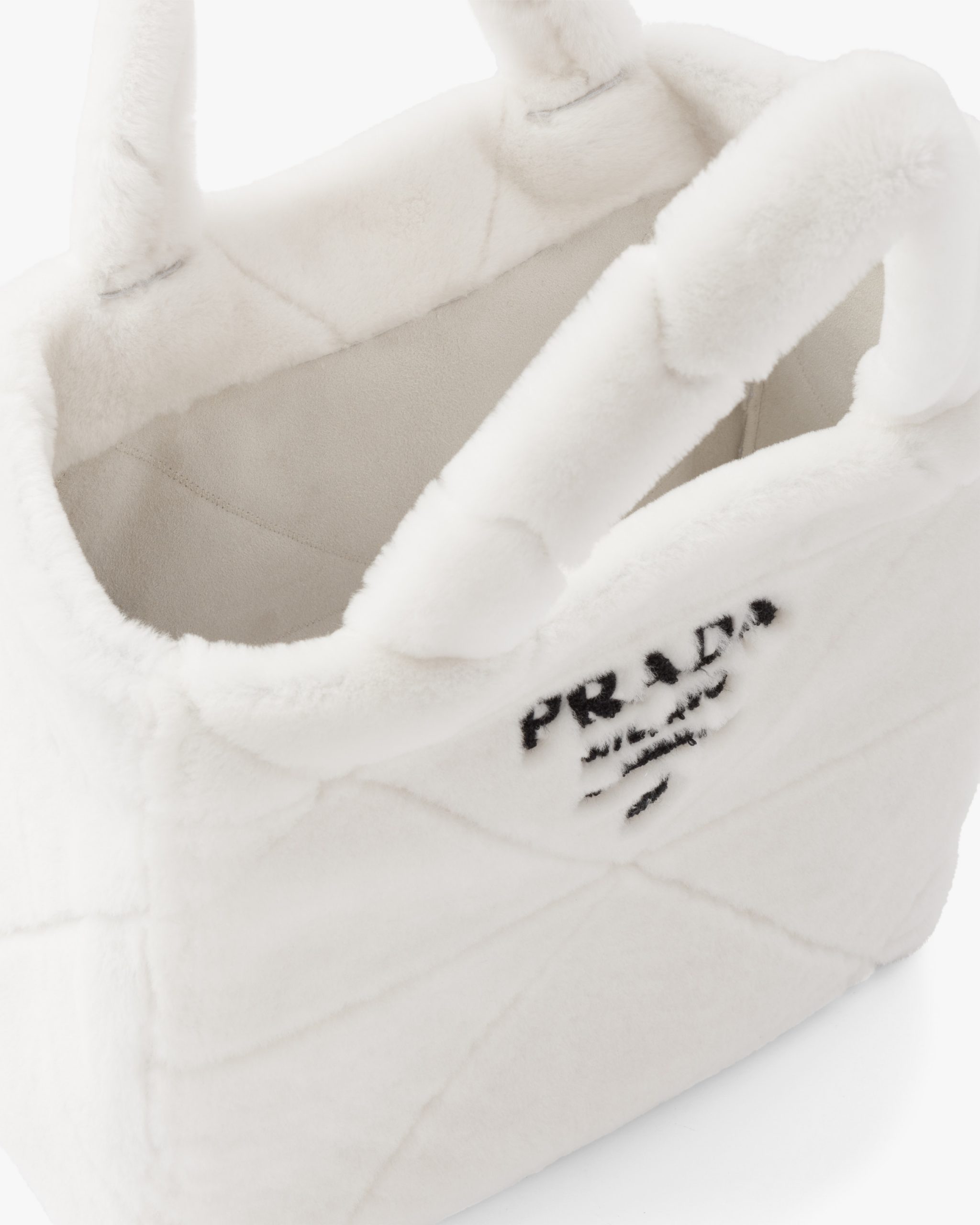 The cushy soft touch of shearling enhances the design with winter allure of this tote bag characterized by the quilted motif that recalls Prada’s iconic triangle. The embroidered lettering logo is framed by the triangle at the center, creating a refined three-dimensional effect.