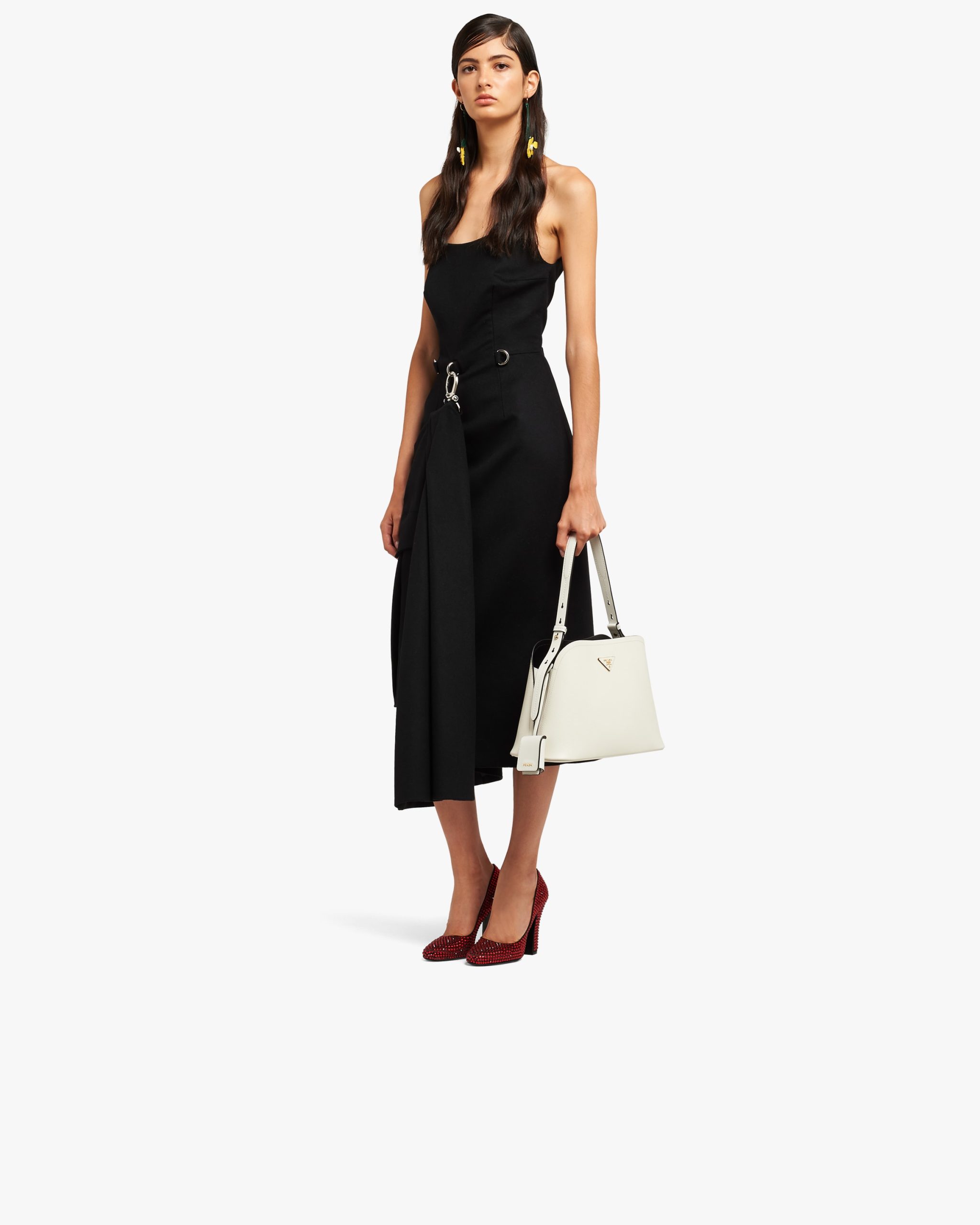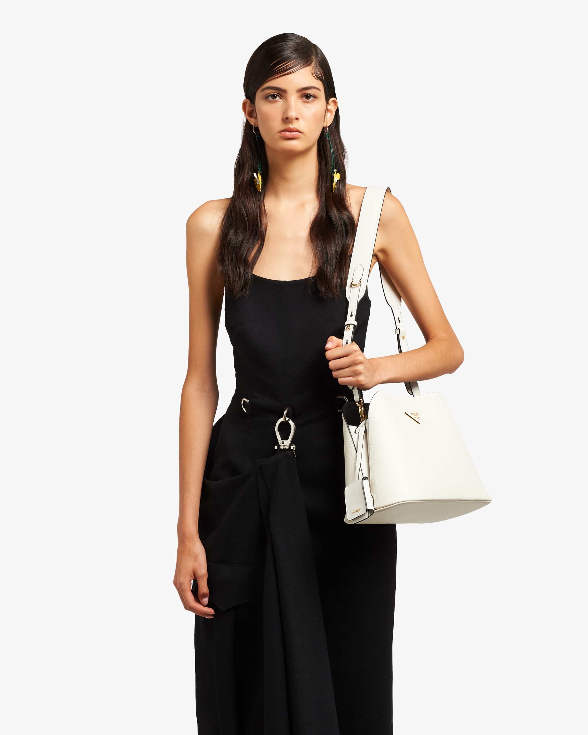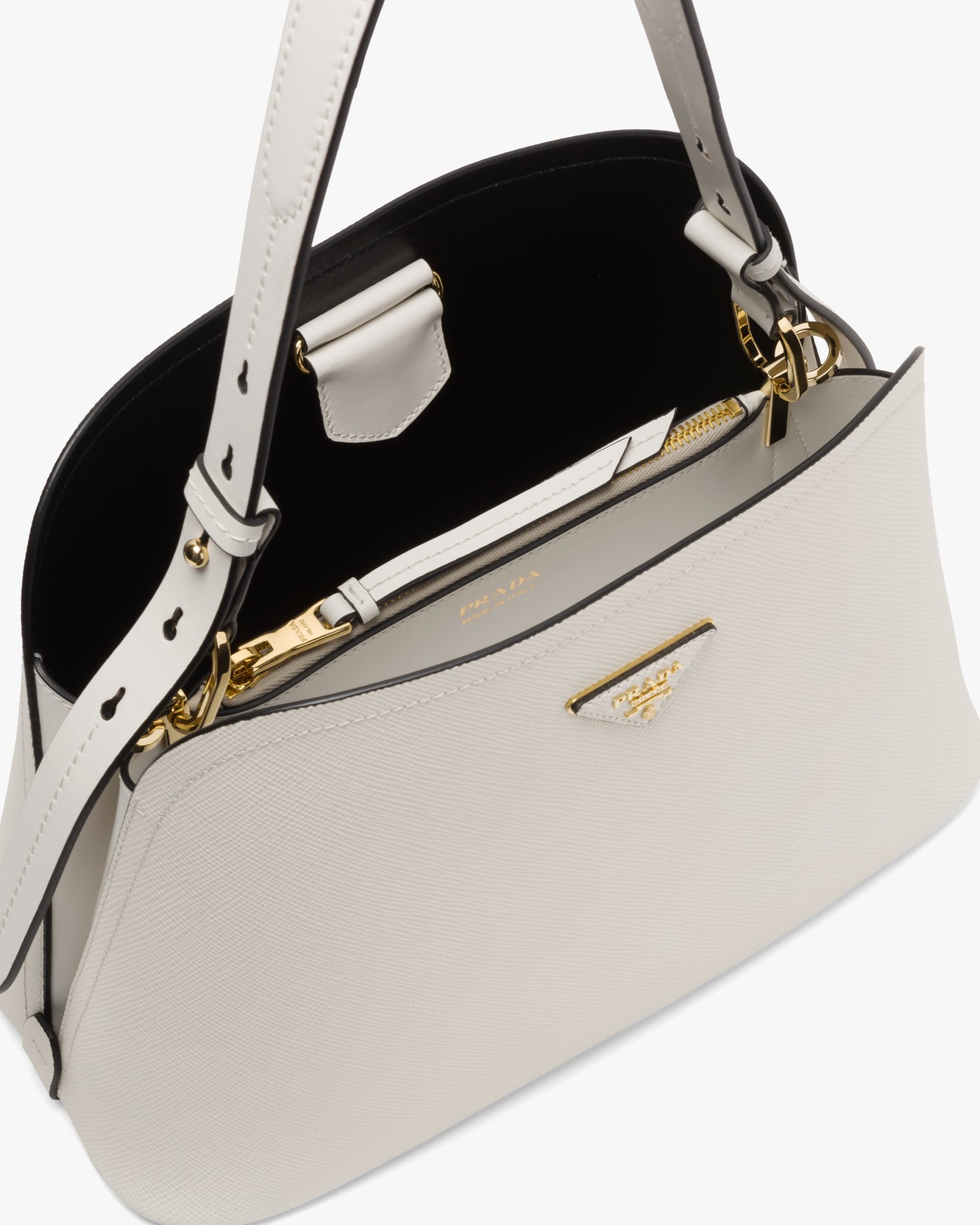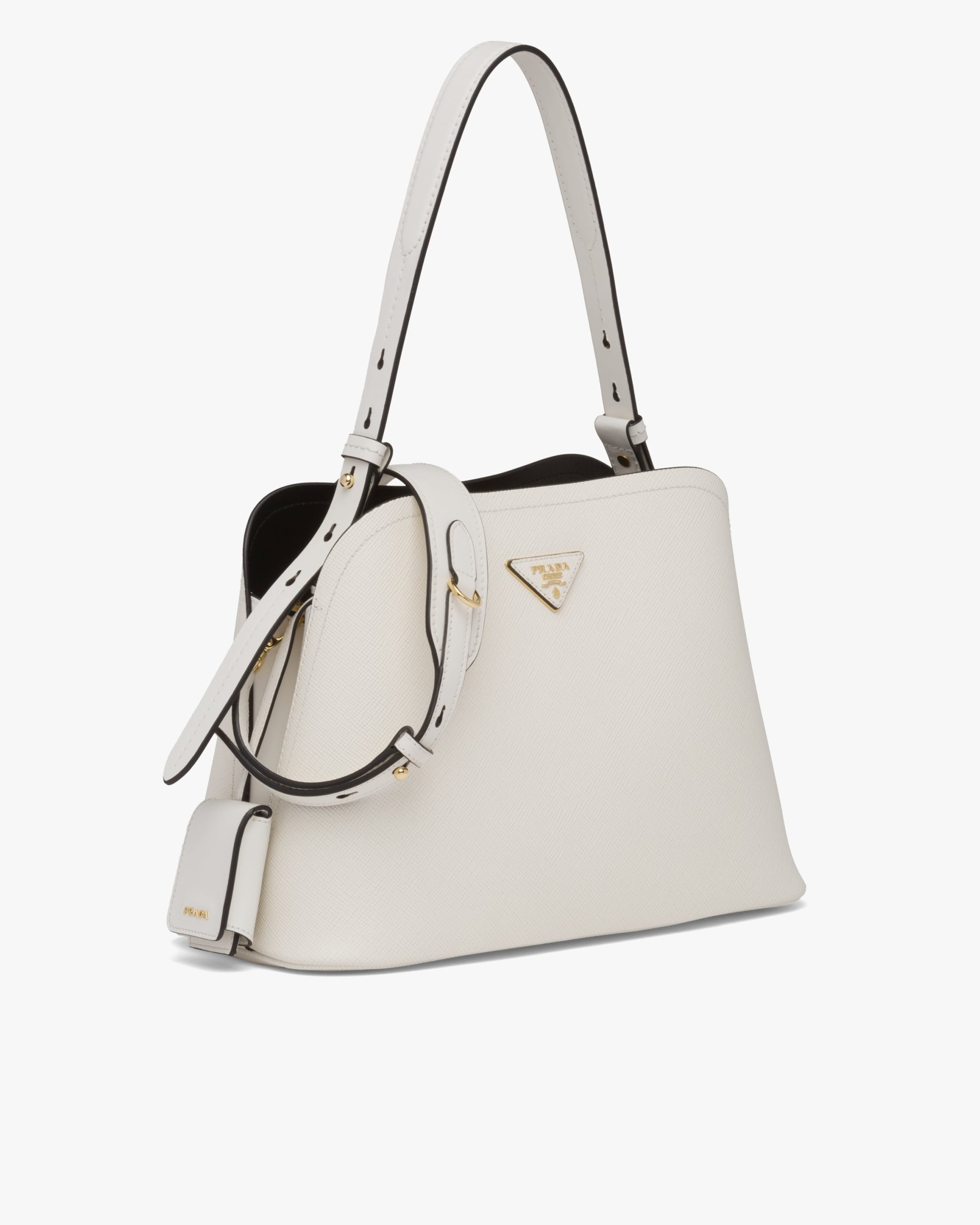 The Prada Matin?e bag in Saffiano leather stands out for its elegant silhouette. The bag has a leather shoulder strap.
