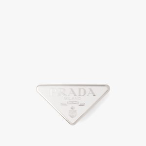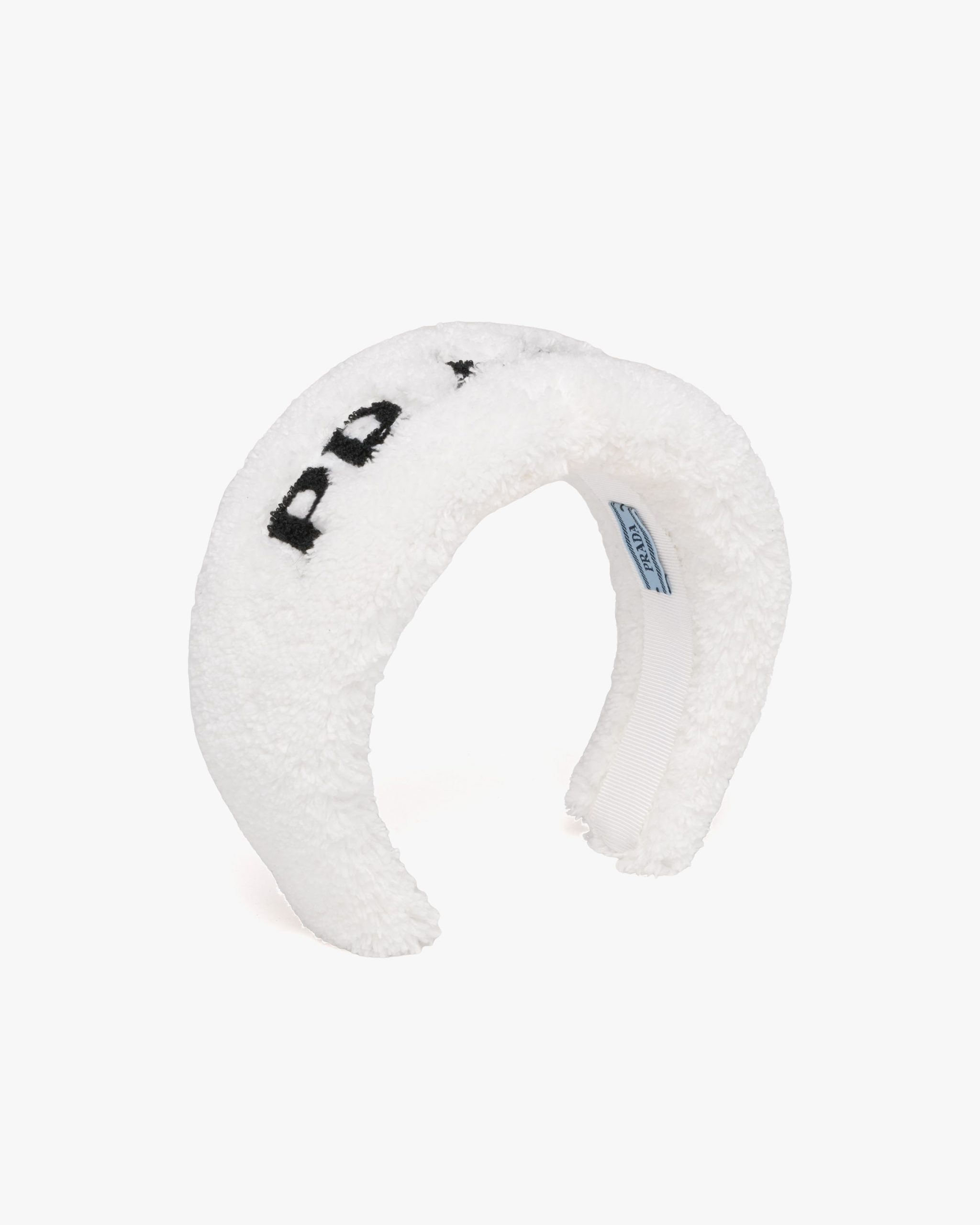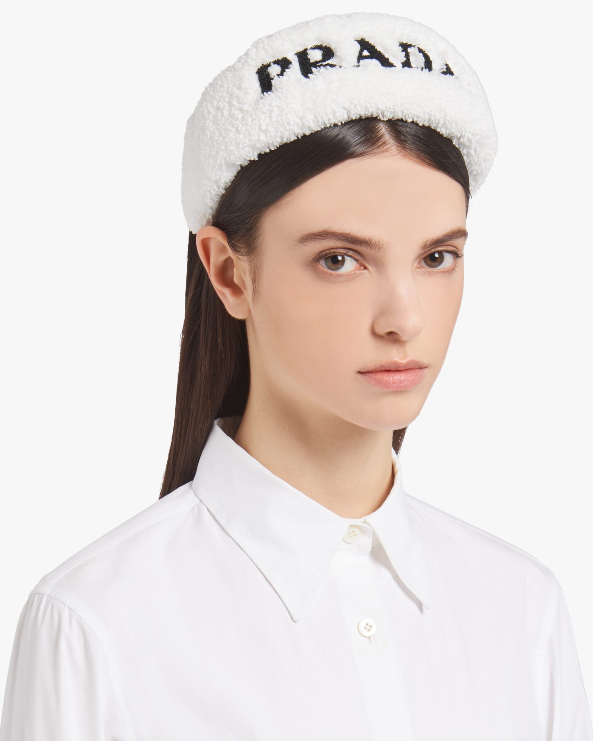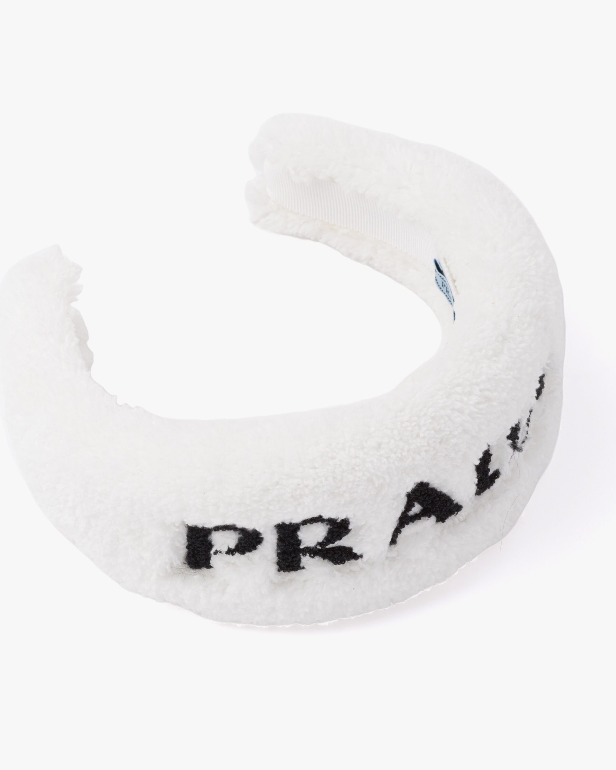 A sophisticated and emblematic accessory of Prada collectsions, the puffy headband with a beguiling rounded design is reinvented in a hybrid way that recalls the terry headbands of vintage sportswear. The maxi lettering logo embroidered in a contrasting color decorates the accessory.