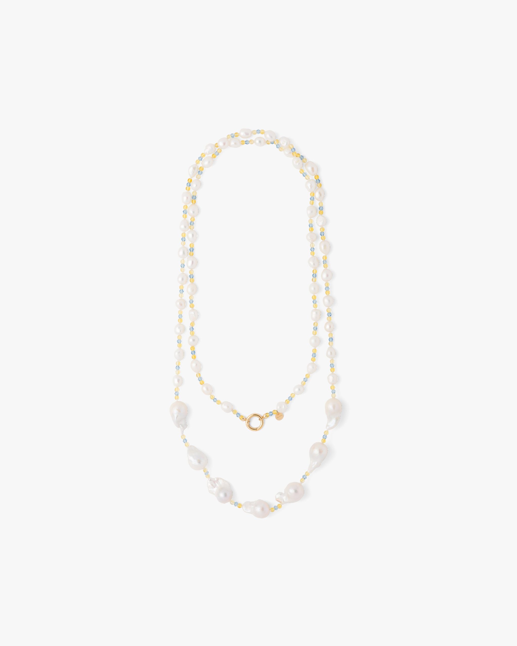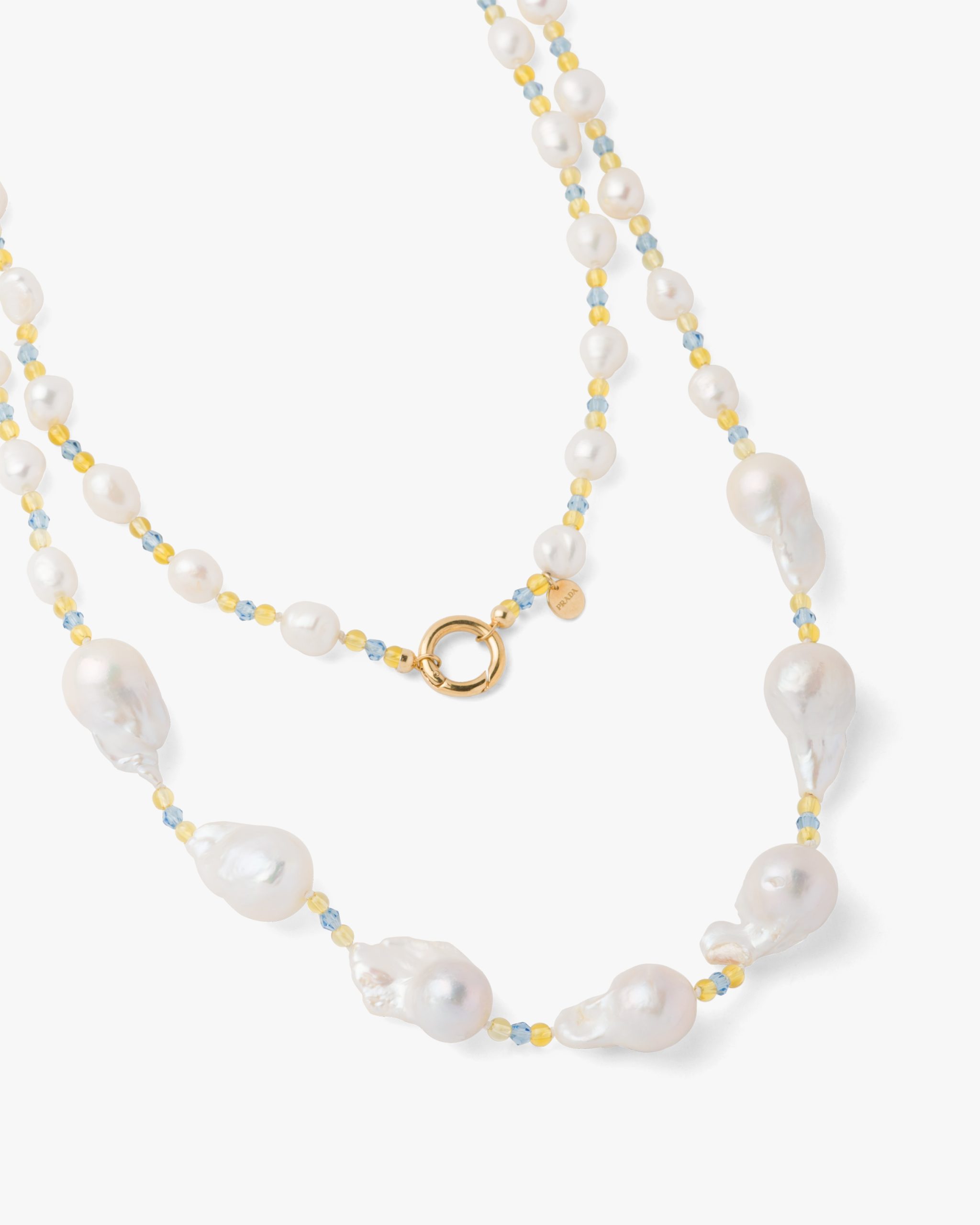 Colored by citrine and sky blue topaz beads, this gold necklace is decorated with baroque pearls.