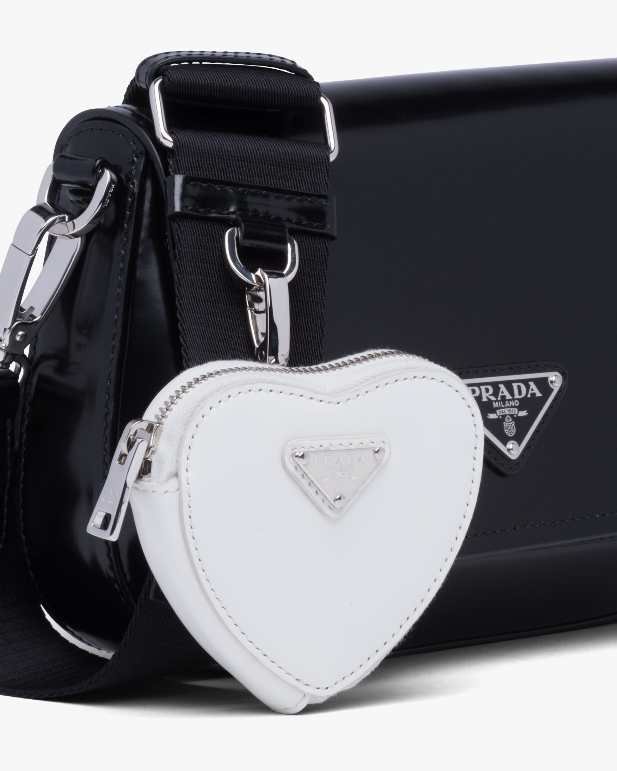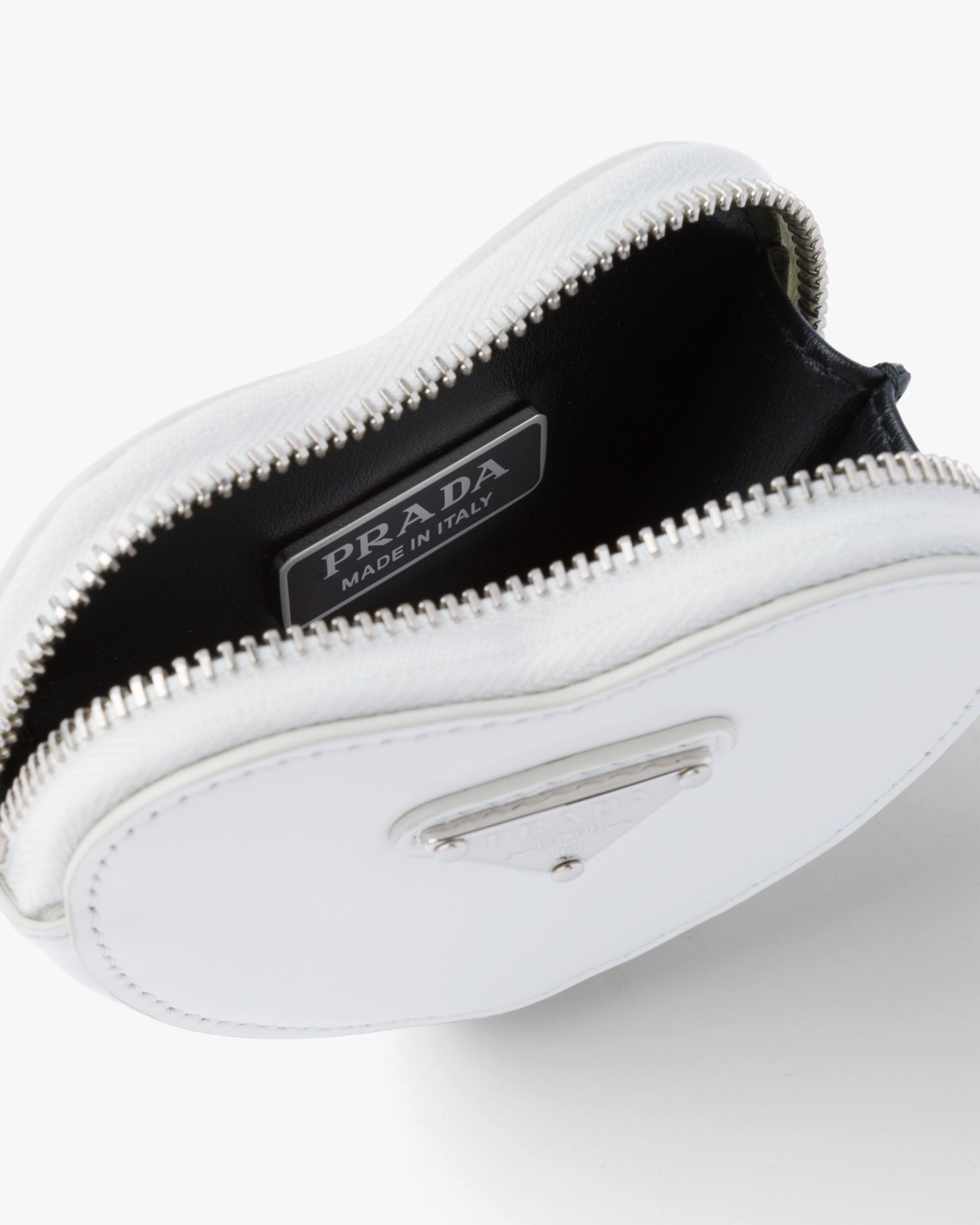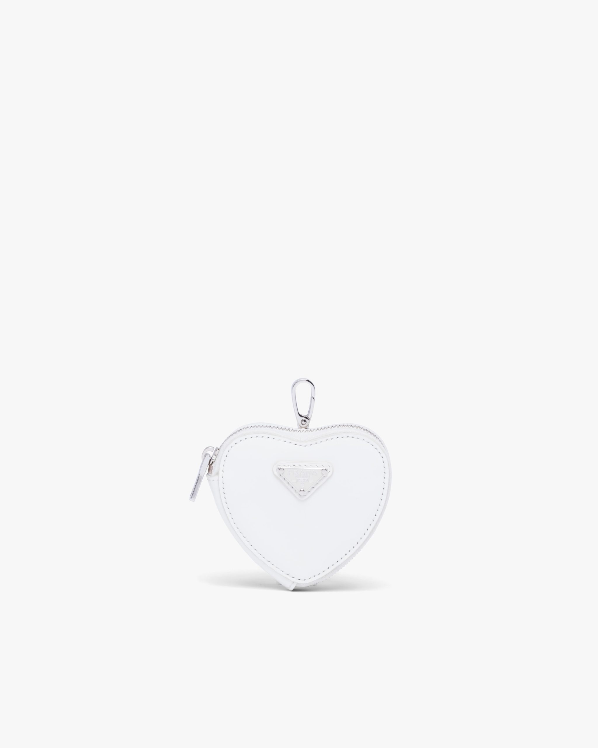 This heart-shaped mini pouch is made from brushed leather, an exquisite and classic material that Prada has been reinterpreting in unusual designs since the nineties, creating a hybrid result that reflects the dual nature of the brand. The enameled metal triangle logo adorns the accessory.