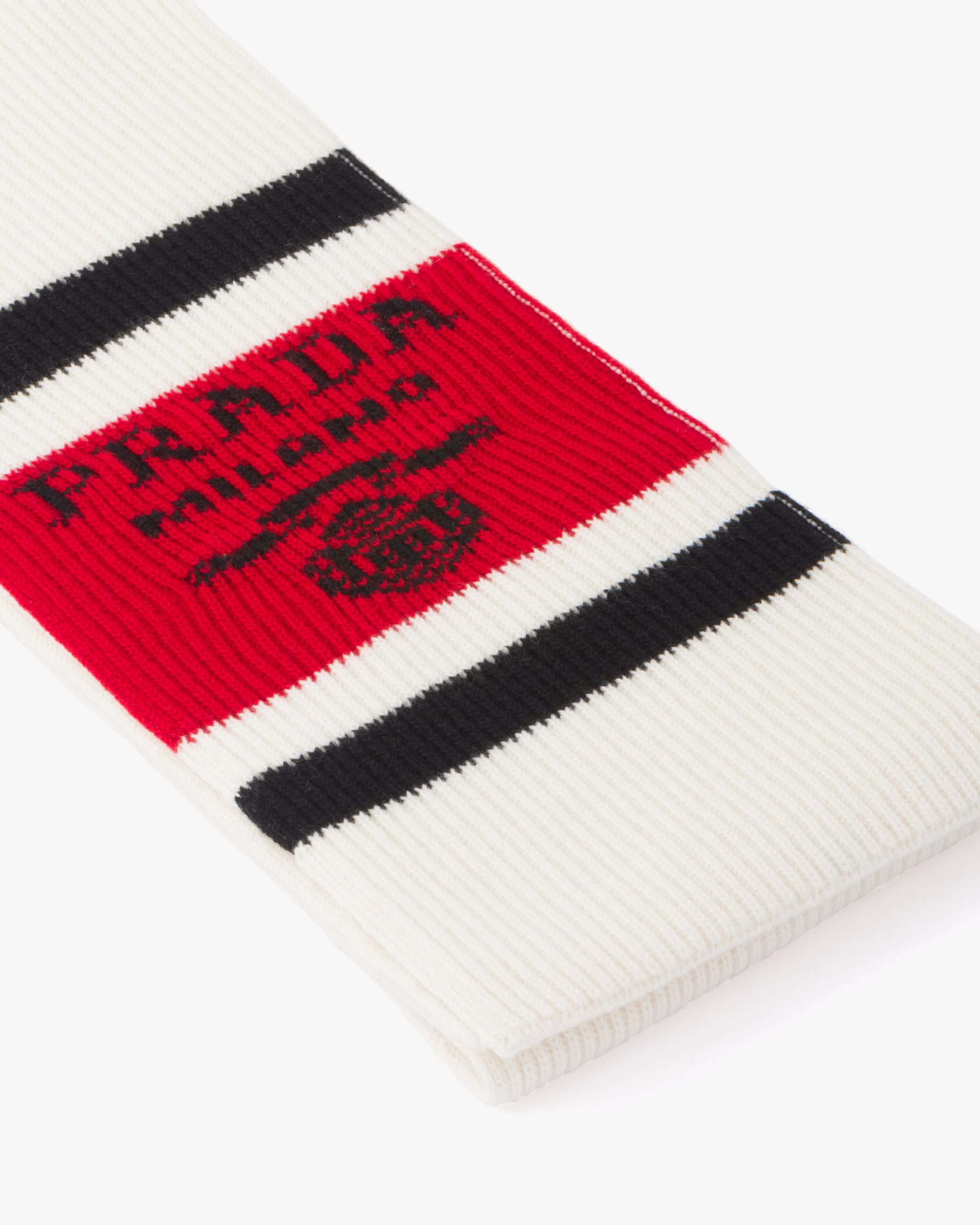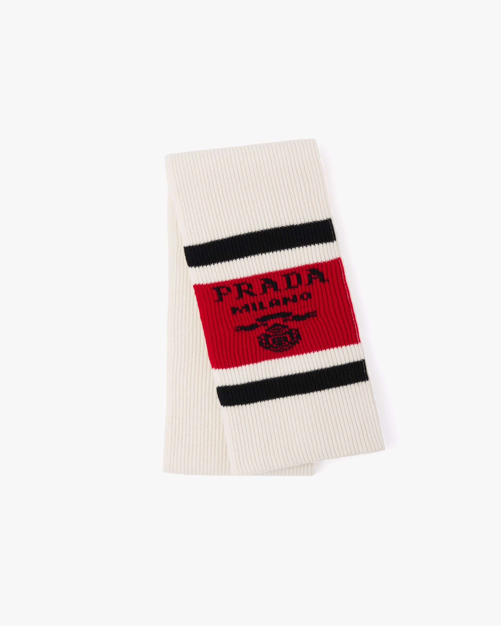 This sporty yet refined scarf is made of soft, fine cashmere. The accessory that recalls a vintage design of an alpine wardrobe is decorated with the jacquard lettering logo.
