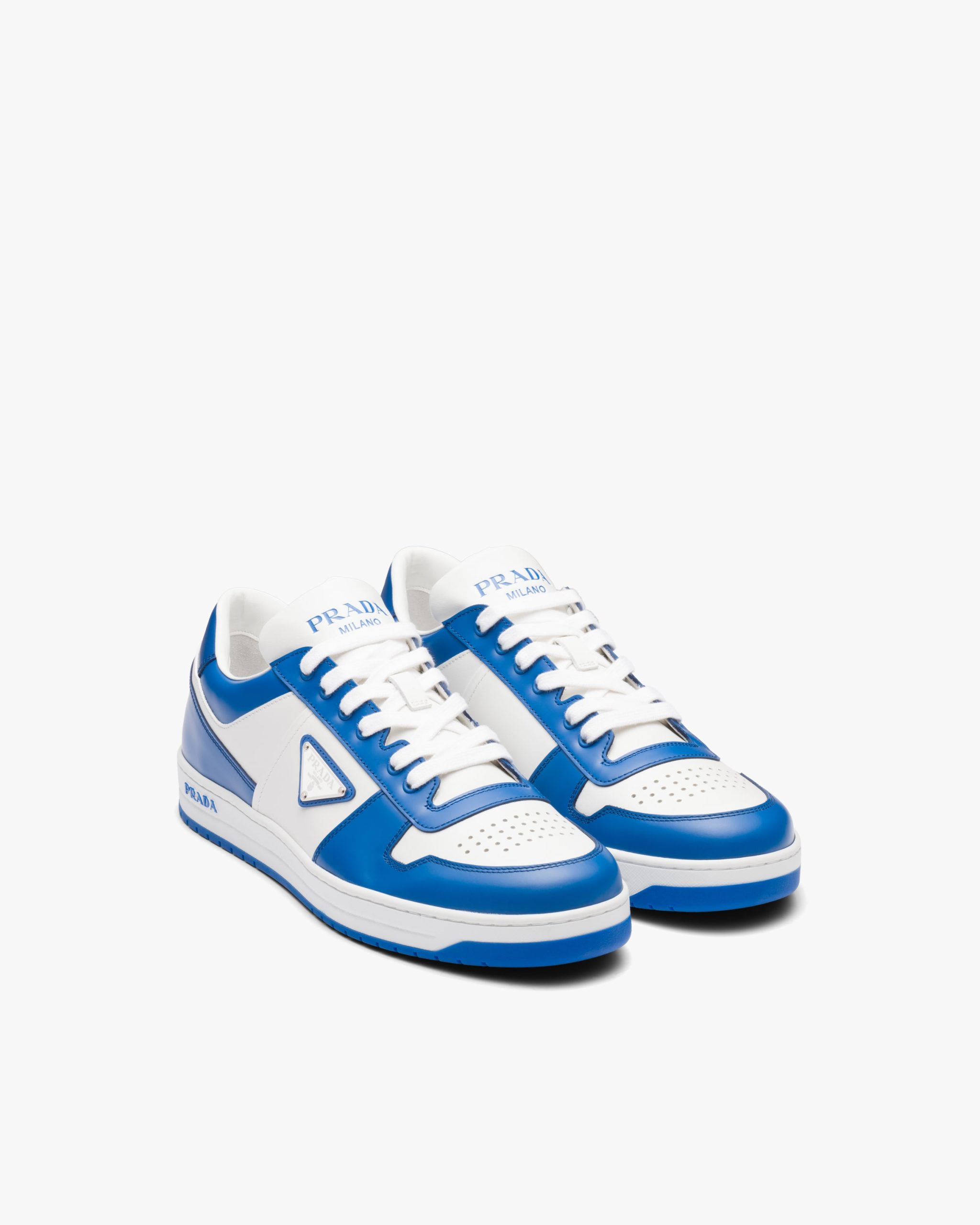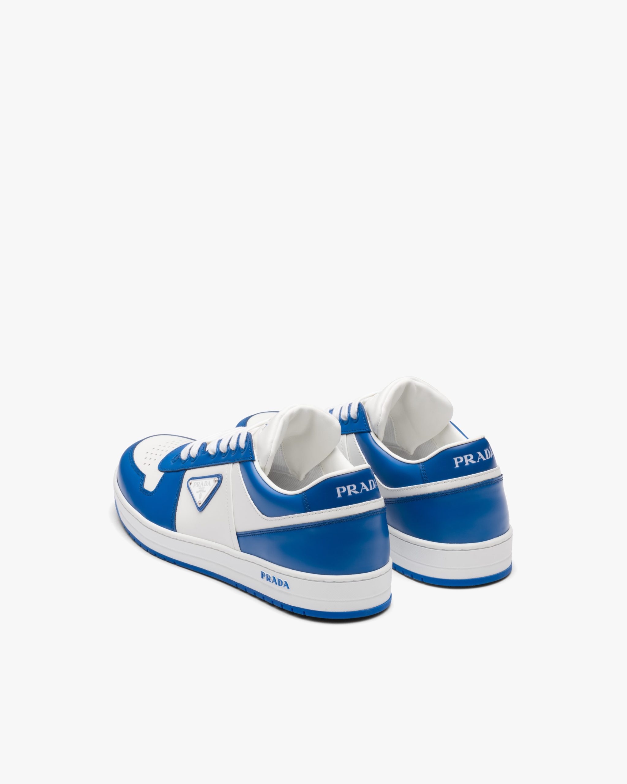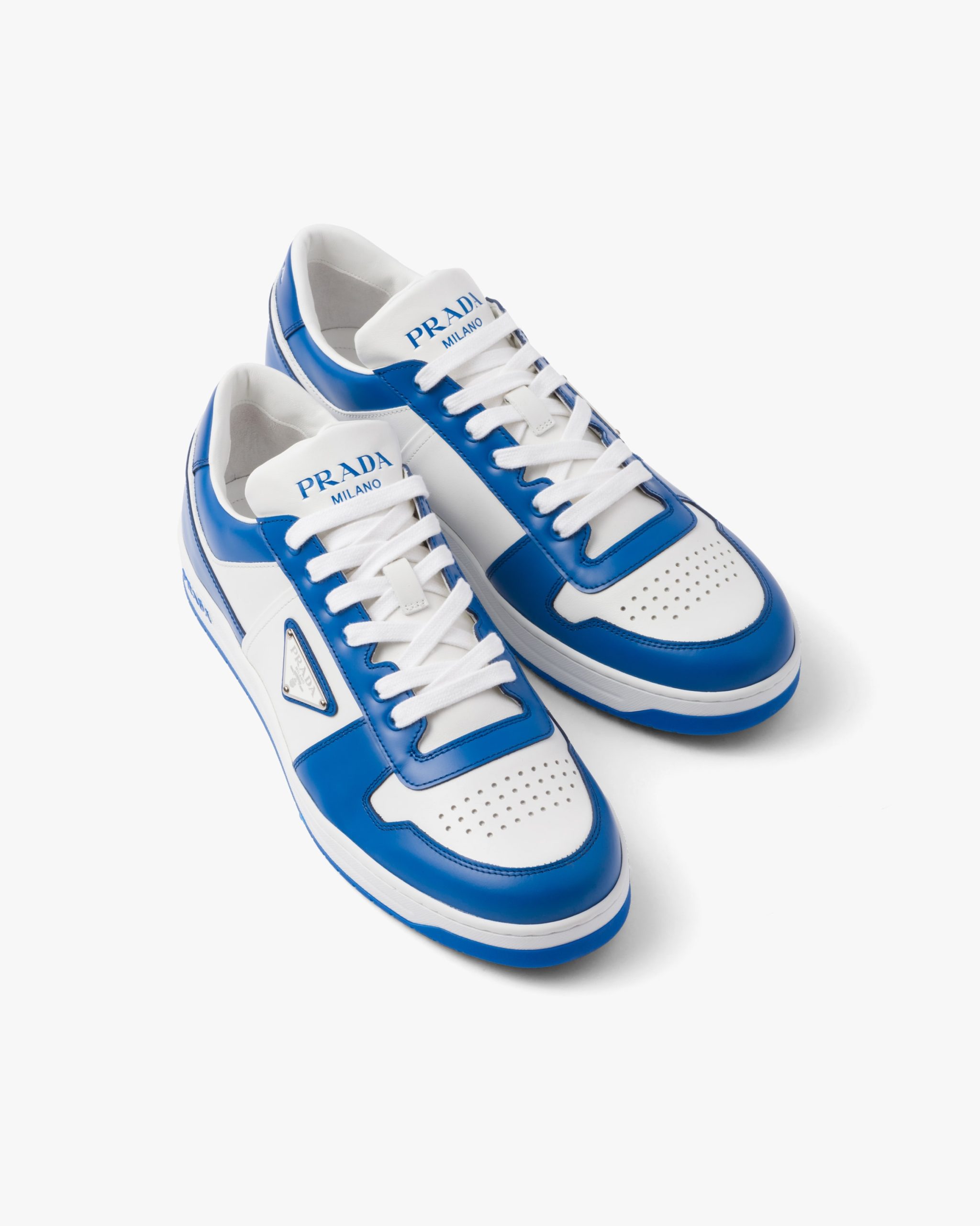 These sporty leather sneakers are accented with different interpretations of the Prada logo that appears on the tongue, along the light rubber sole, and as the iconic enameled metal triangle decorating the side of the upper.
