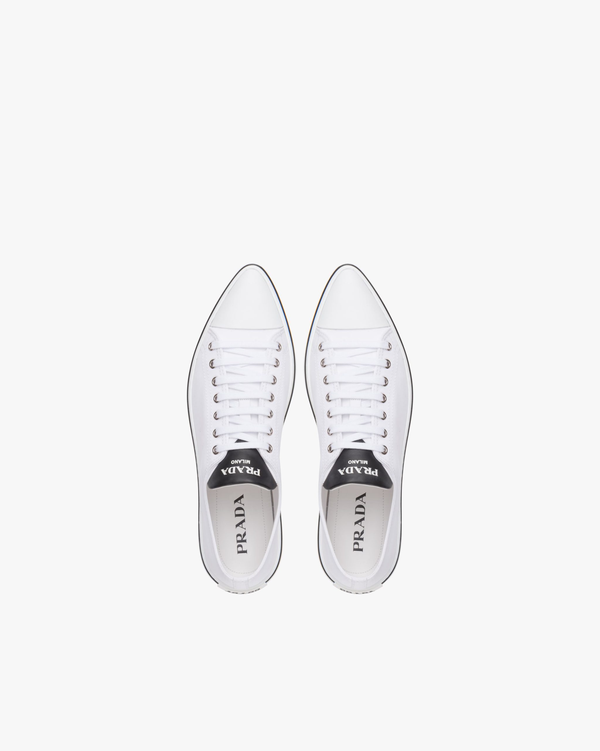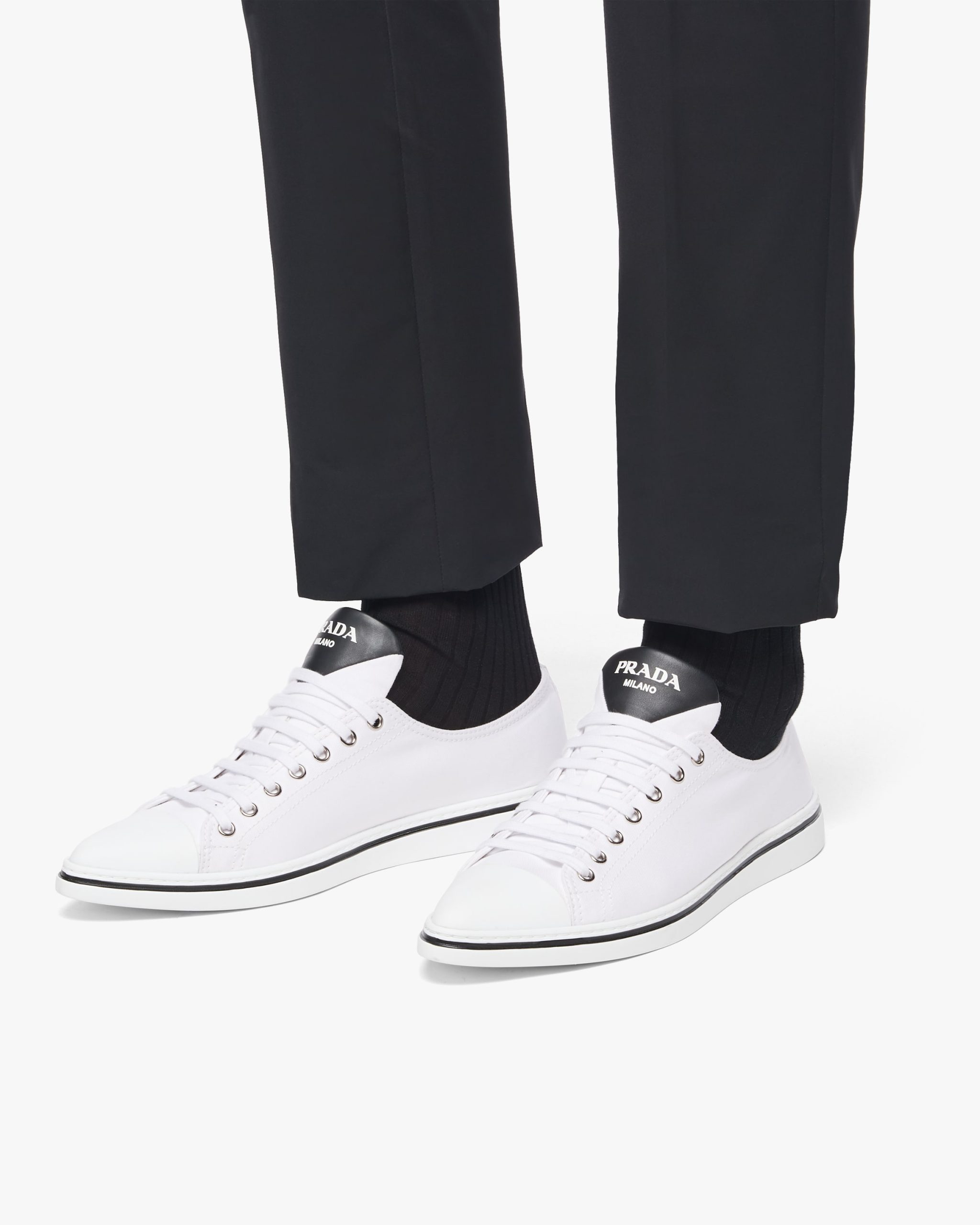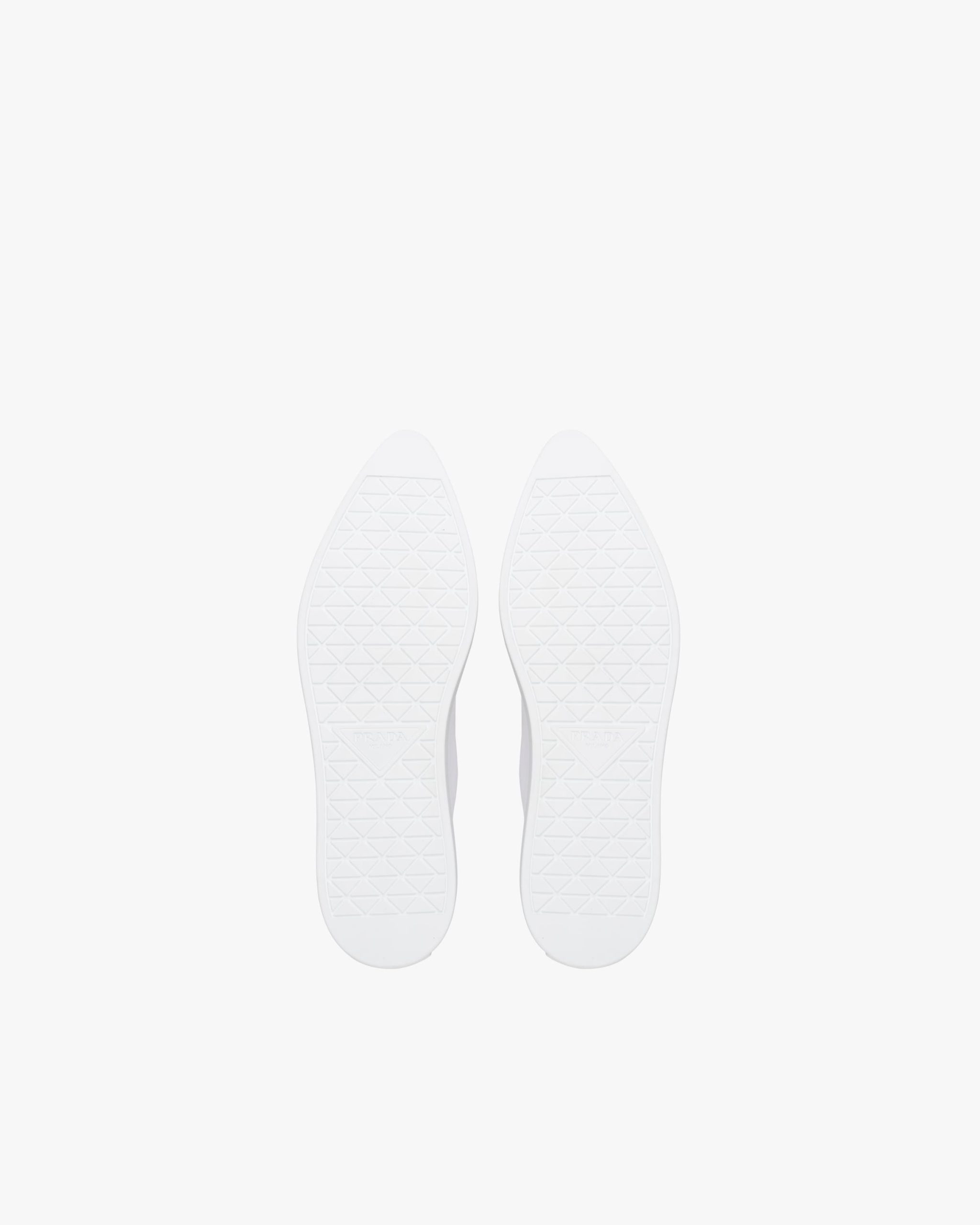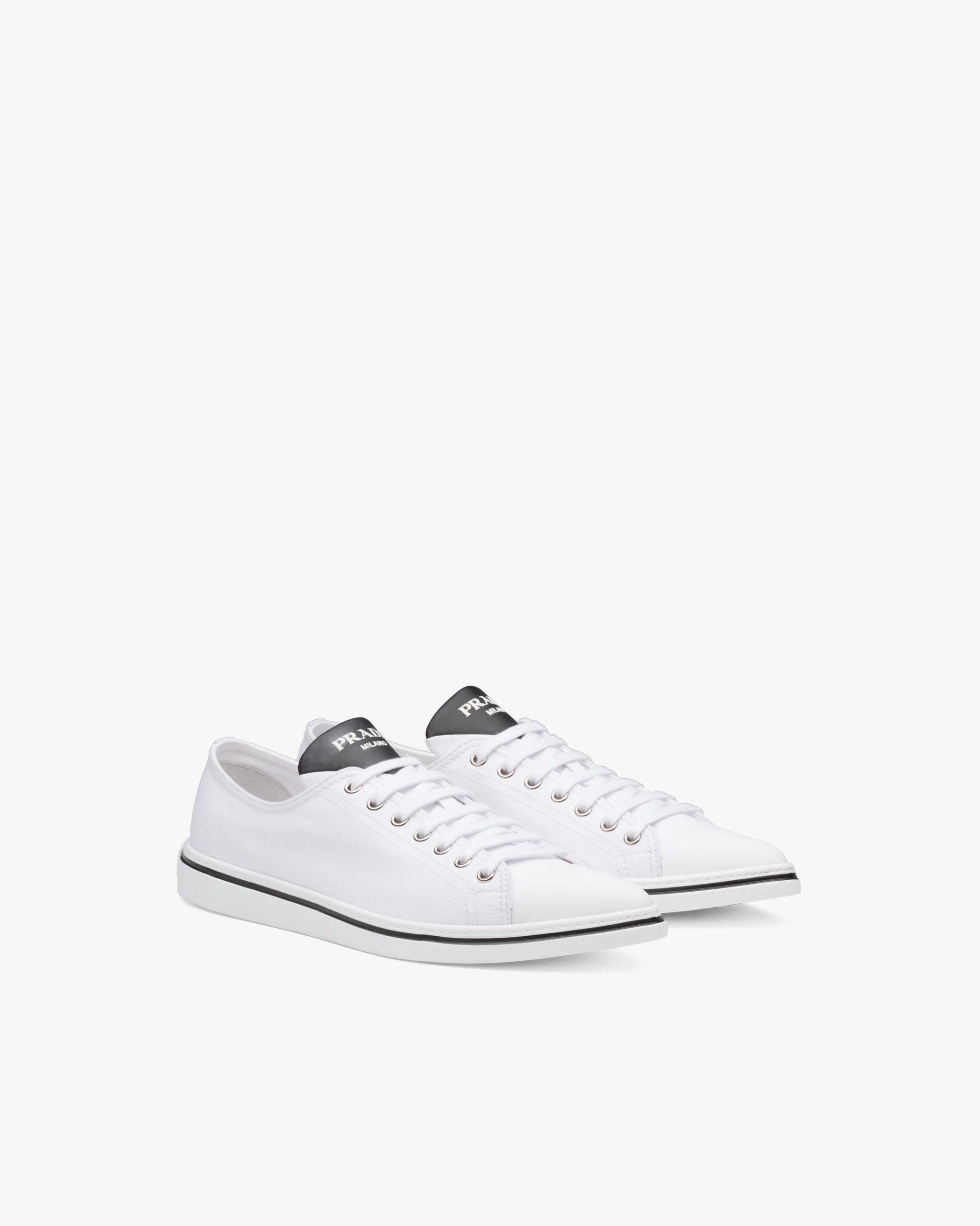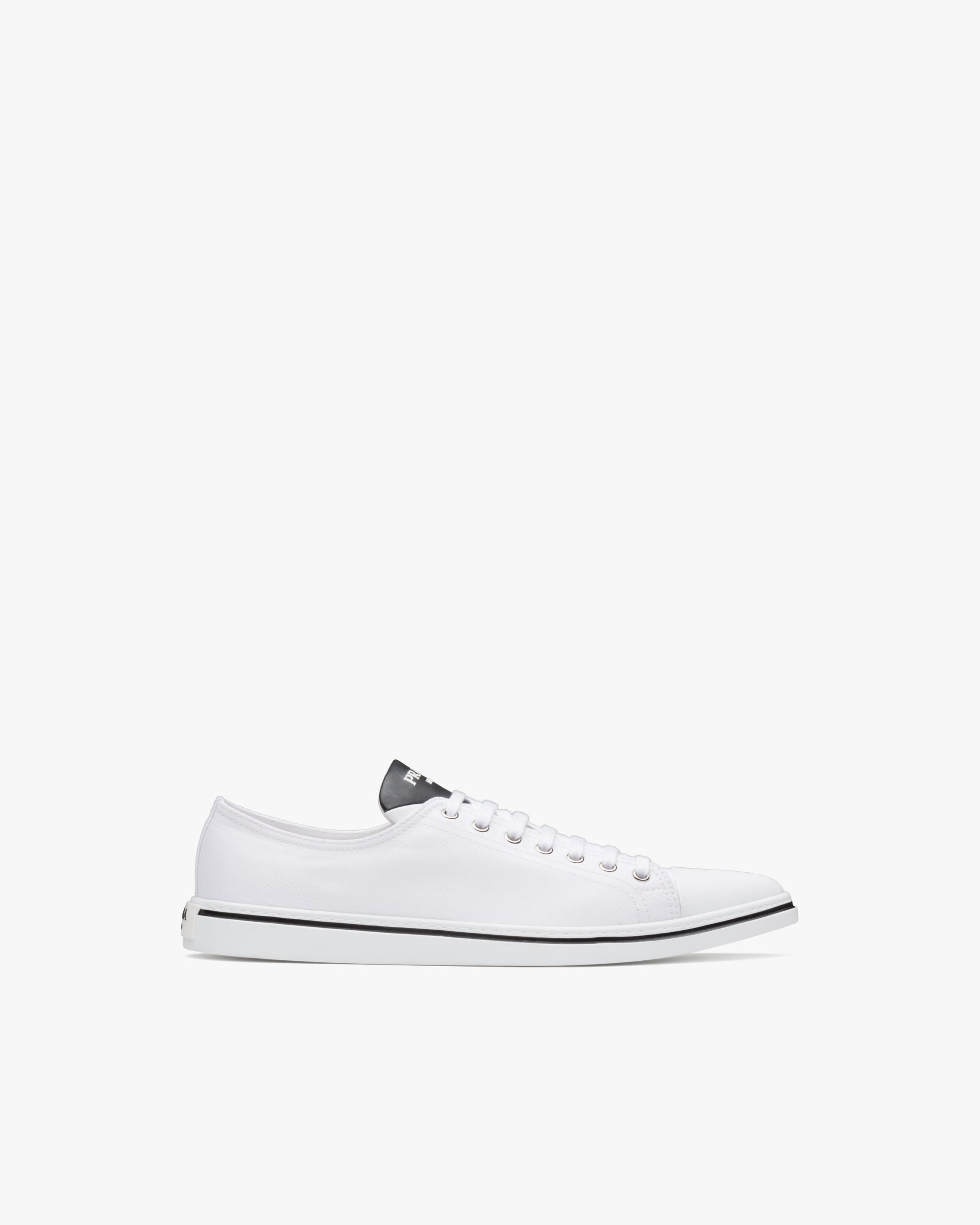 The classic sneaker is re-imagined in this cotton gabardine version with rubber toecap and tapered silhouette, decorated with the Prada logo on the tongue.