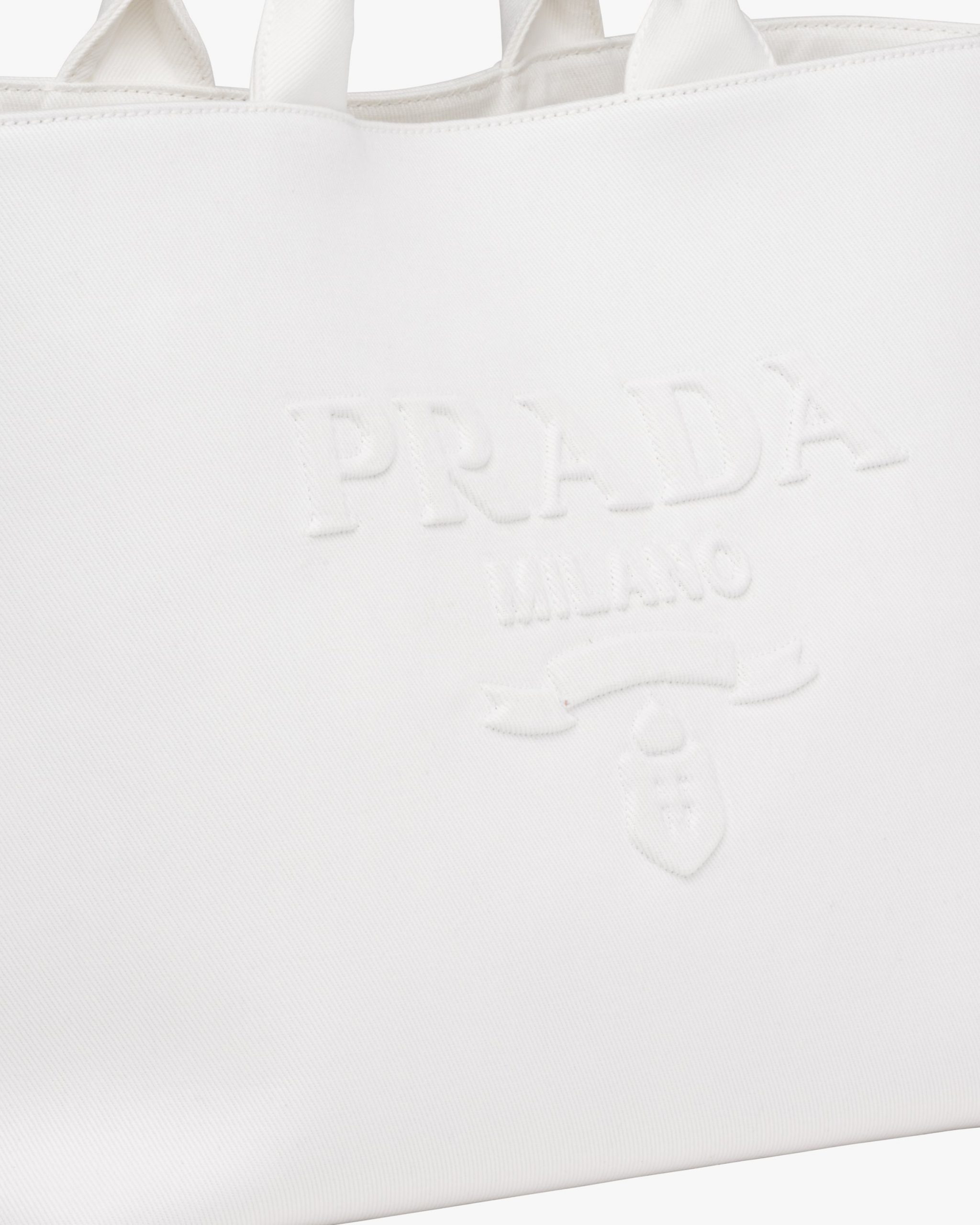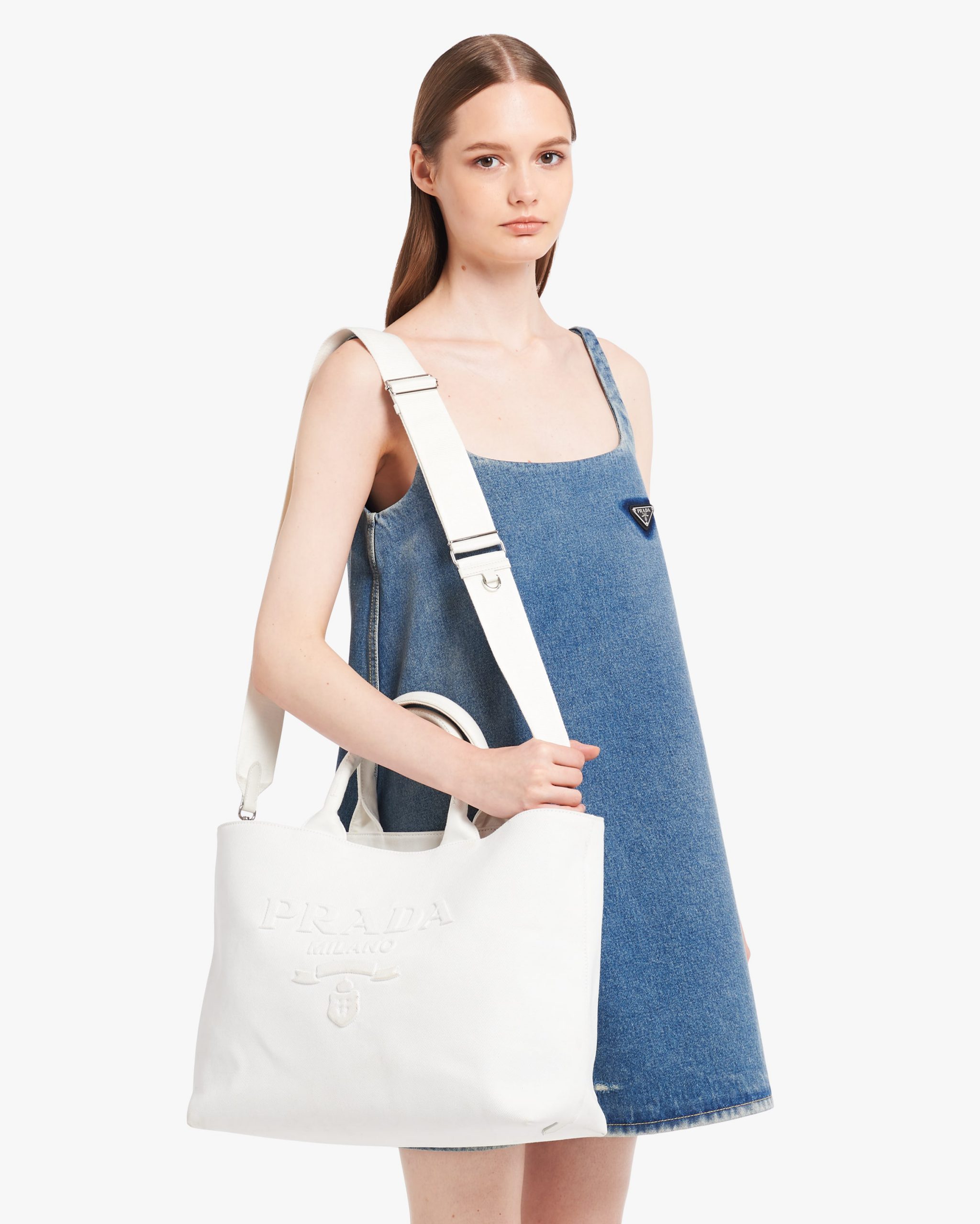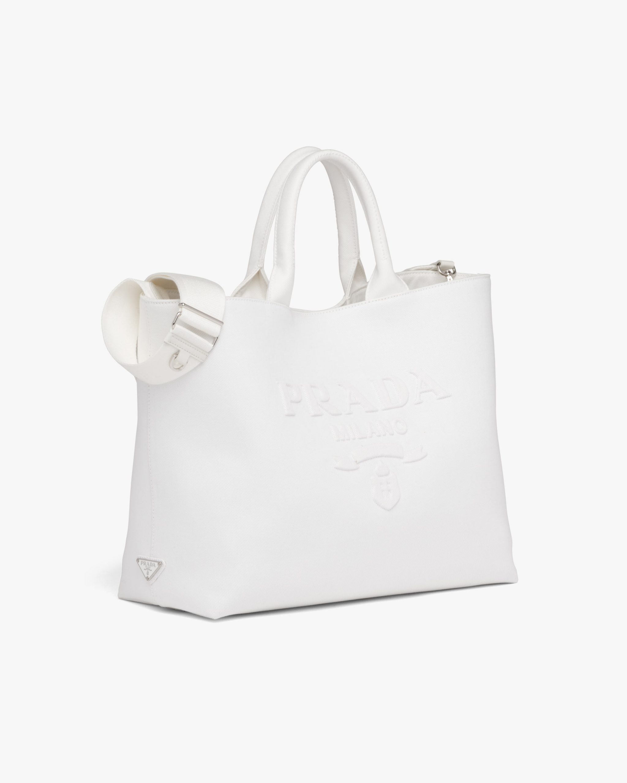 In this contemporary reinterpretation, a macro version of the Prada triangle logo stands out in relief on this drill tote bag with a structured design. A detachable adjustable shoulder strap gives the accessory a versatile soul, making it possible to carry by hand or wear as a crossbody bag.