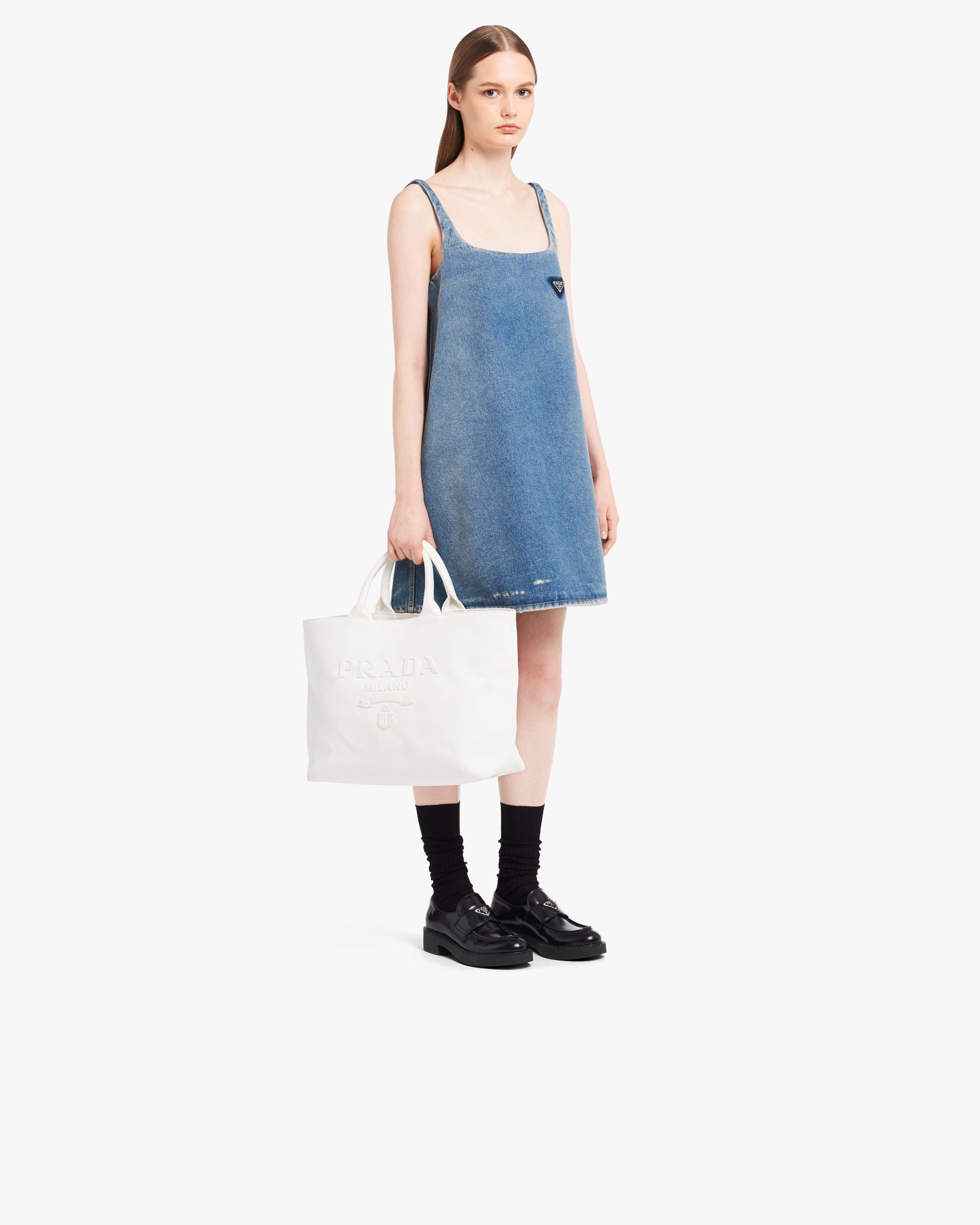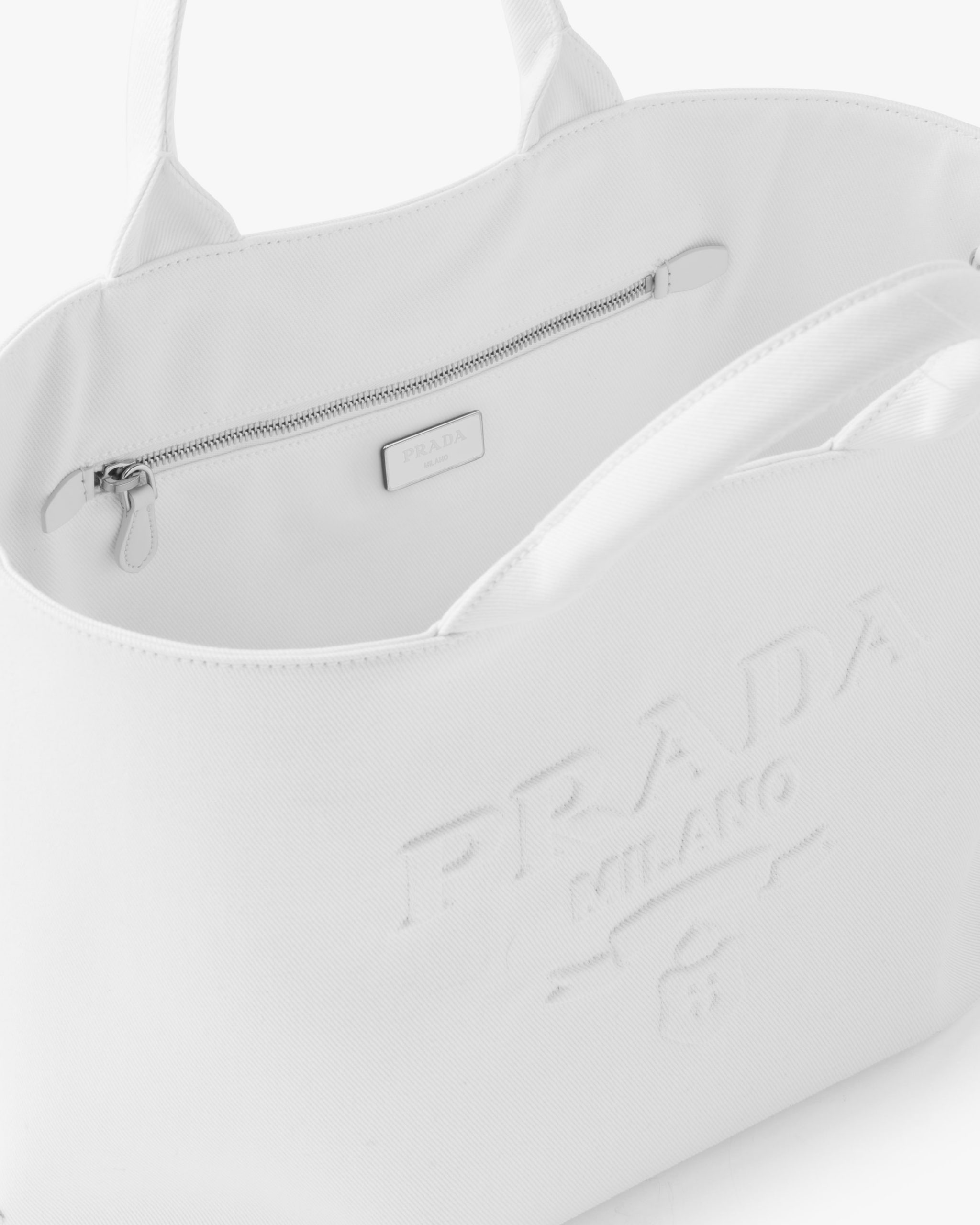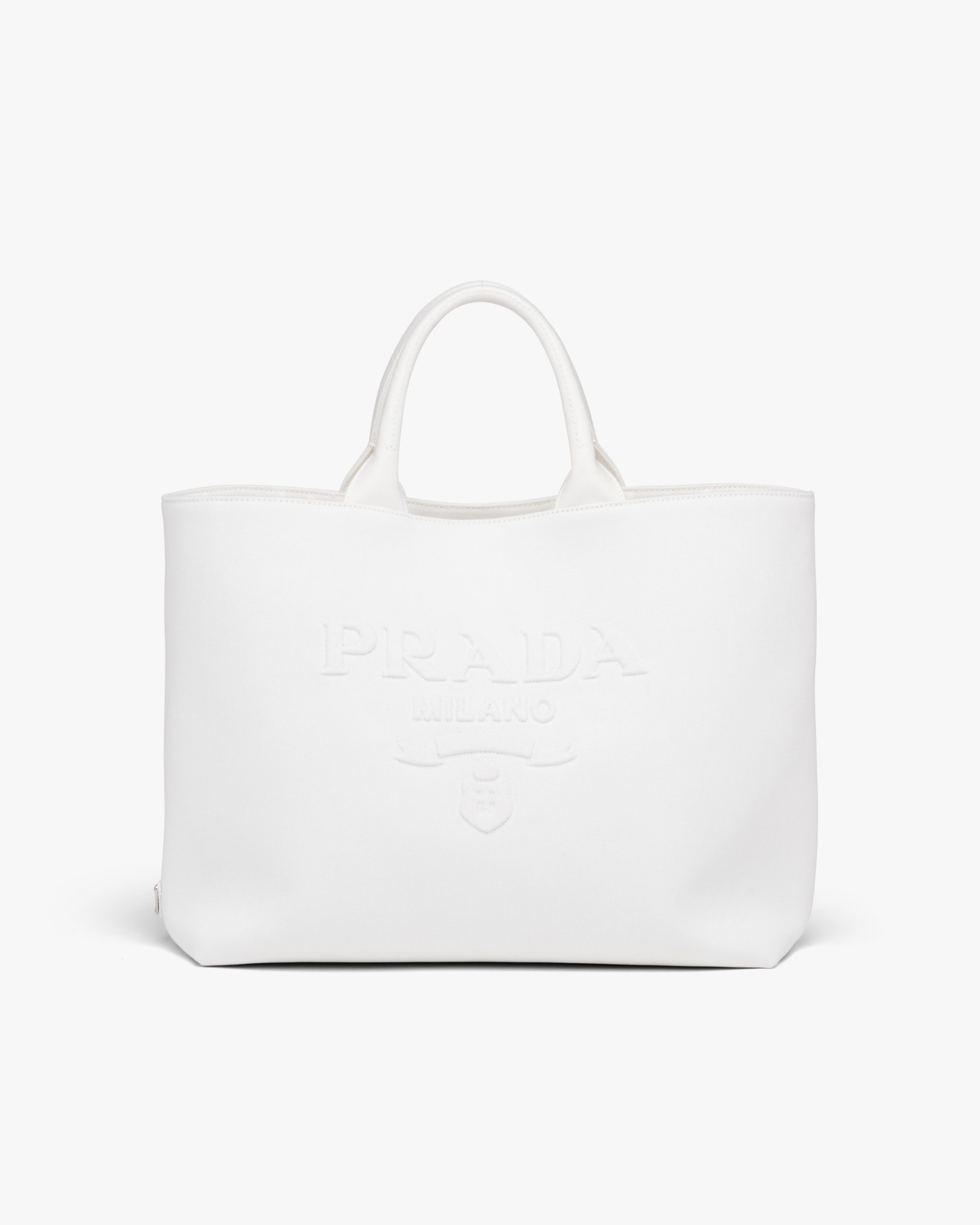 In this contemporary reinterpretation, a macro version of the Prada triangle logo stands out in relief on this drill tote bag with a structured design. A detachable adjustable shoulder strap gives the accessory a versatile soul, making it possible to carry by hand or wear as a crossbody bag.