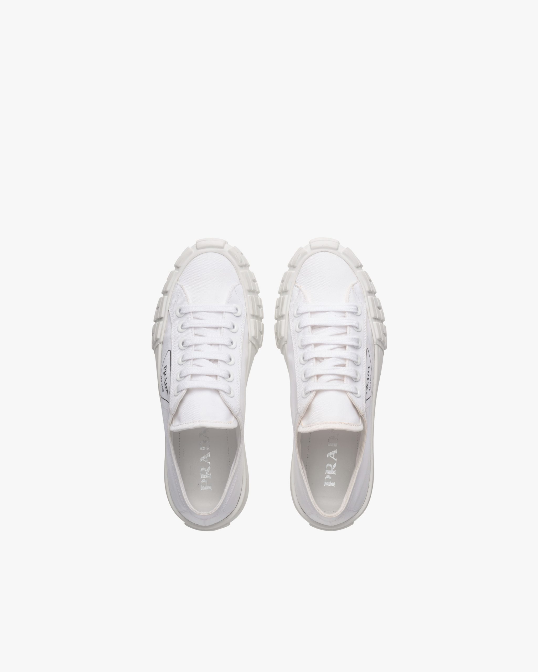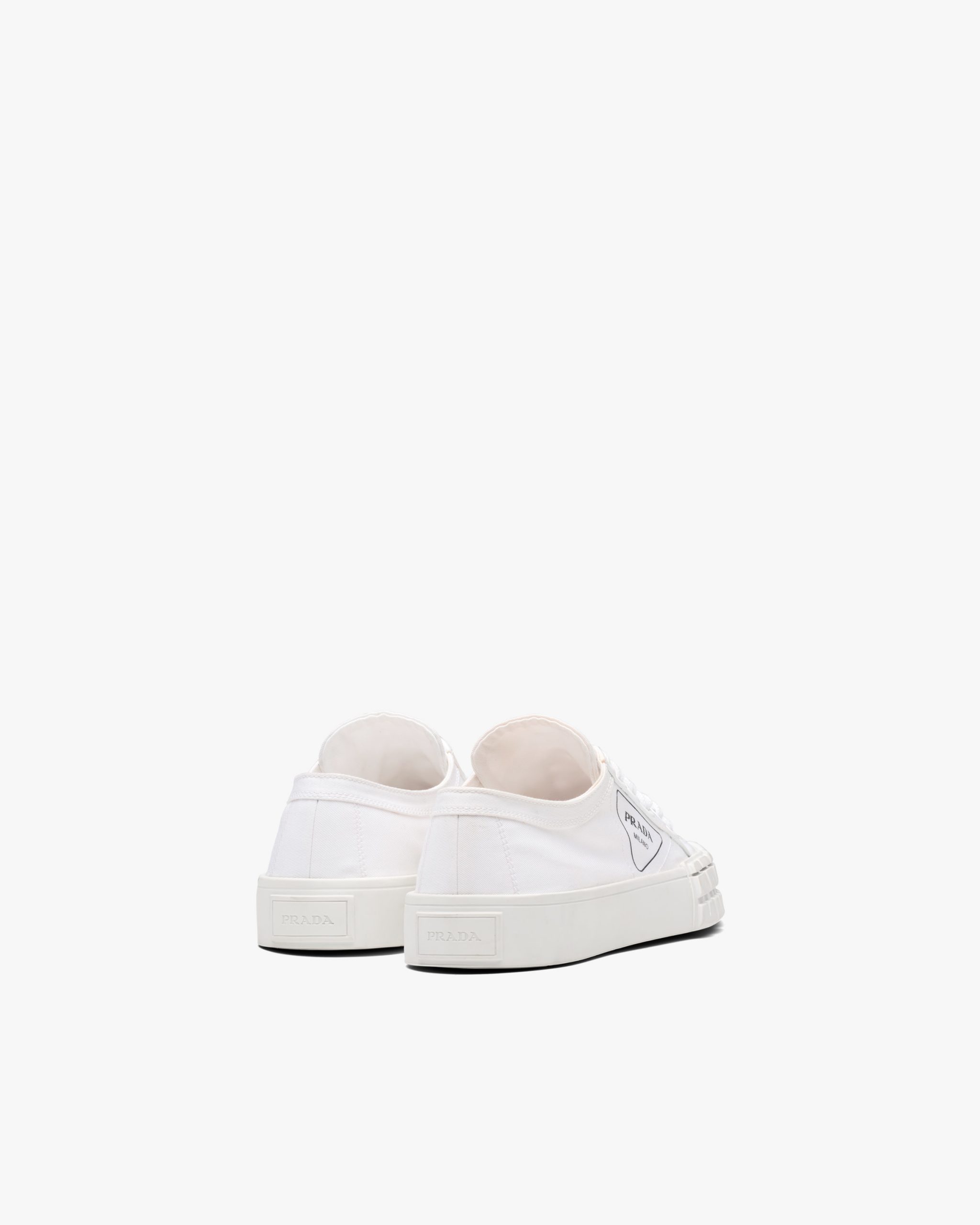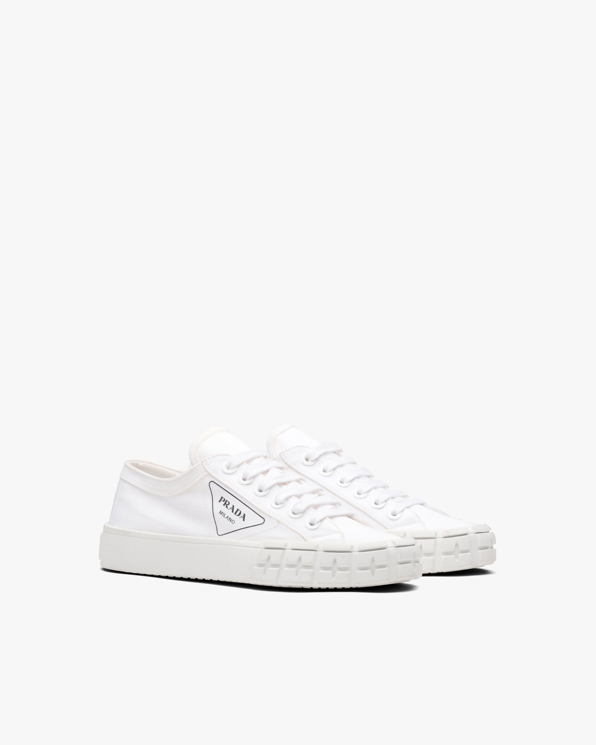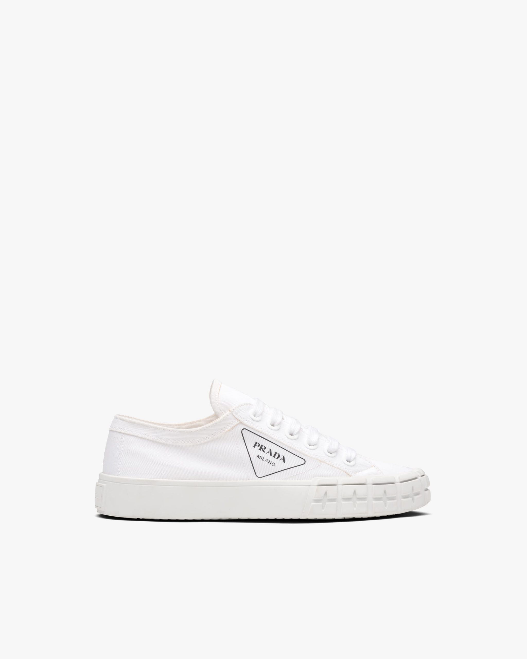 These gabardine fabric sneakers have a rubber sole with an innovative design. They have cotton laces and are decorated with the printed triangle logo.