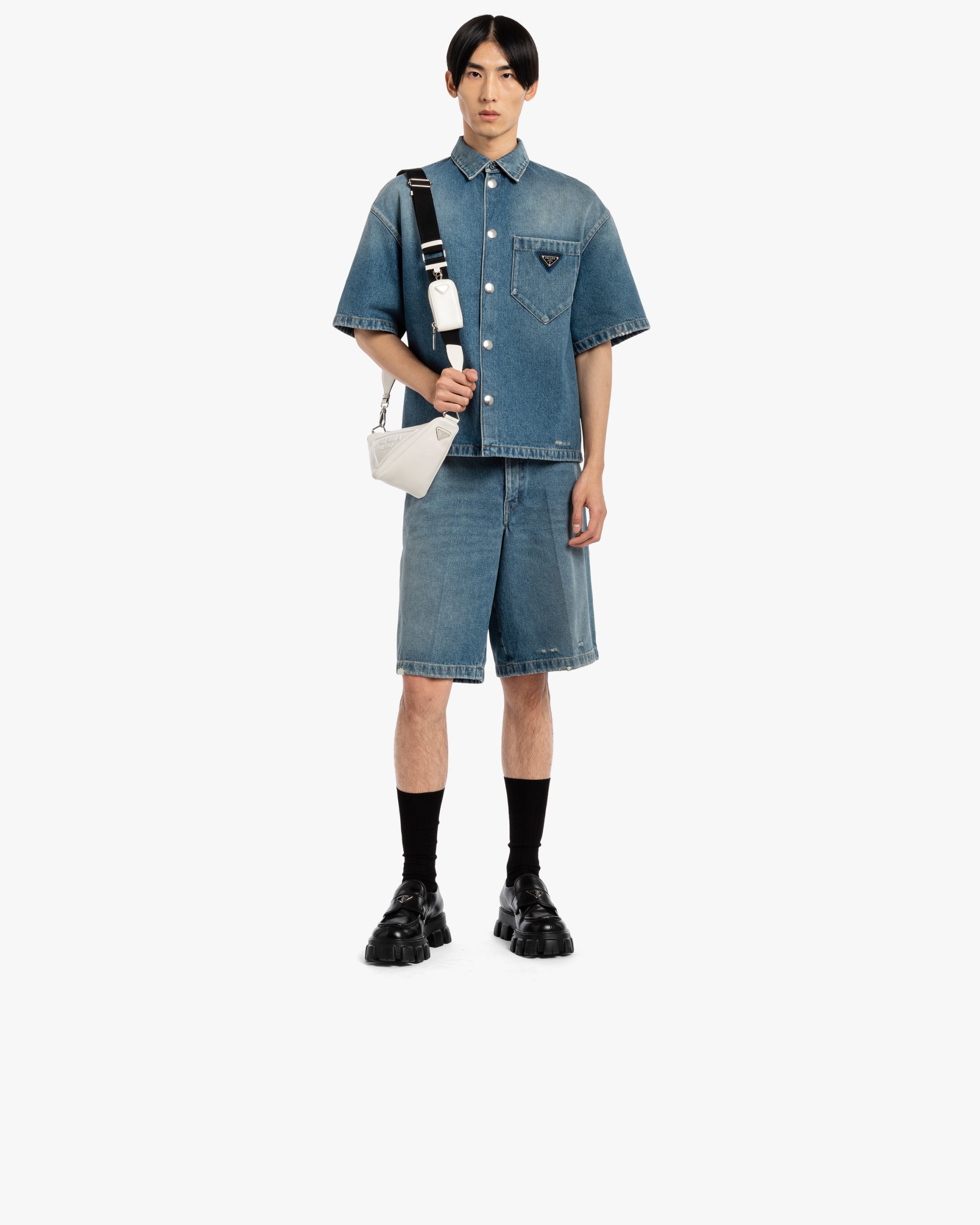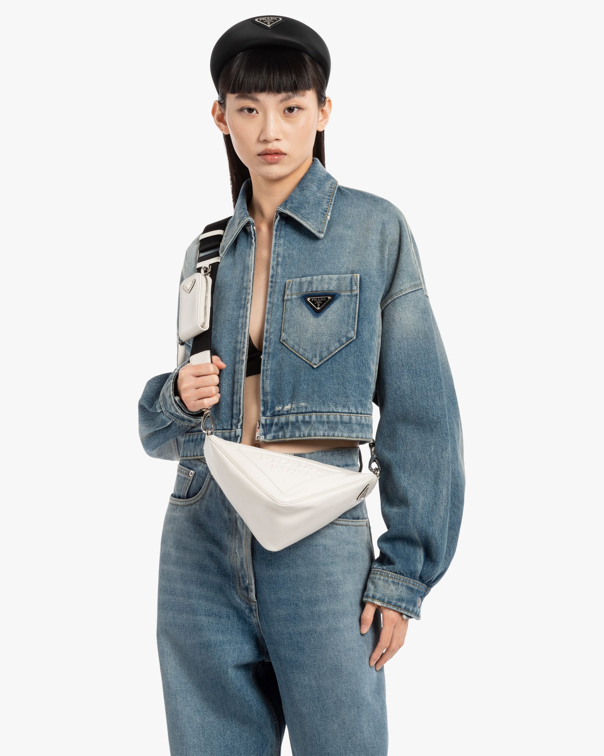 A study of the triangle inspires new geometric elements and novel interpretations of Prada’s historic stylistic code. The iconic shape is presented again in this shoulder bag with sleek lines that comes with a strap for versatility. The tonal embossed logo and the enameled metal triangle logo on the back enhance the minimalist aesthetics.