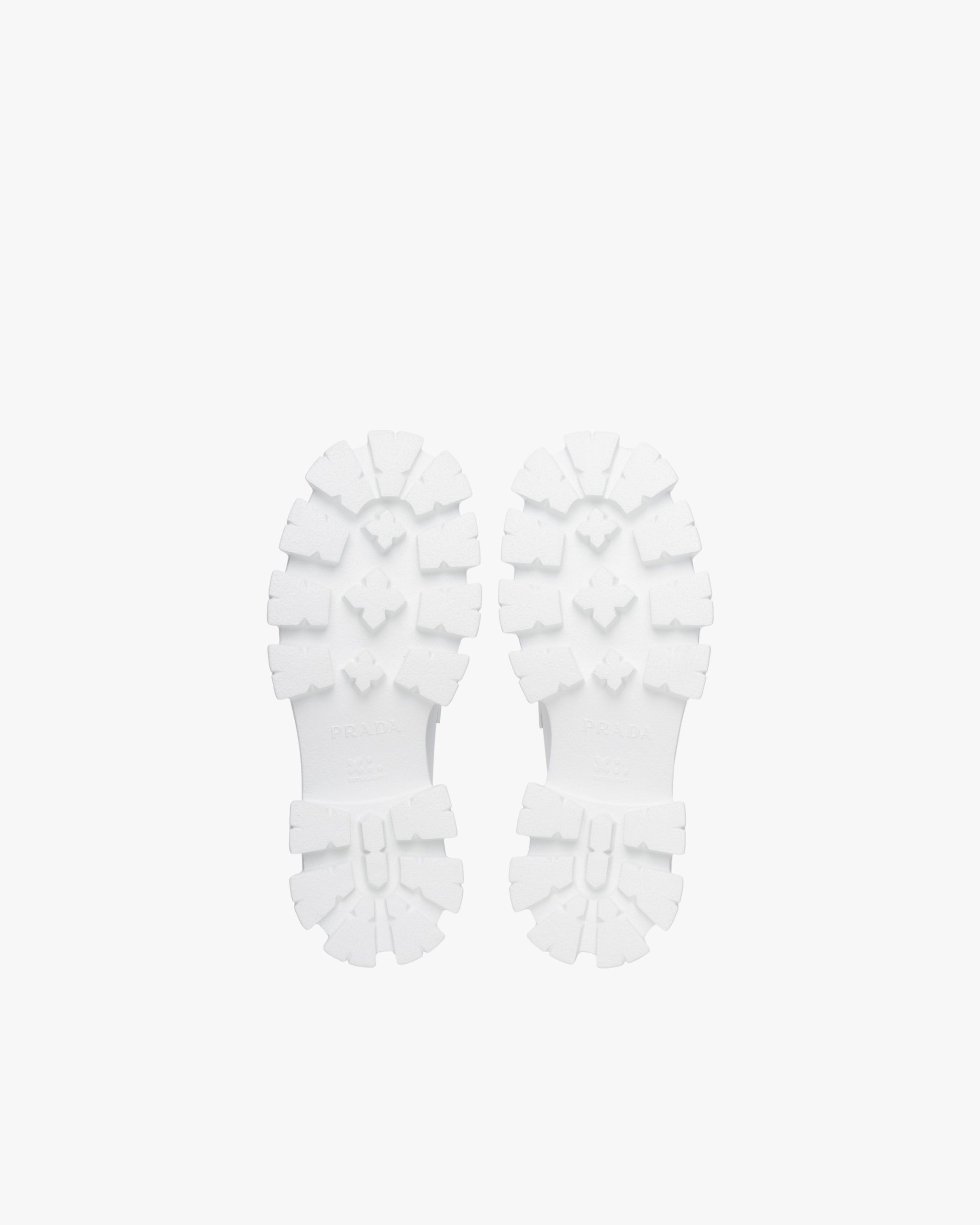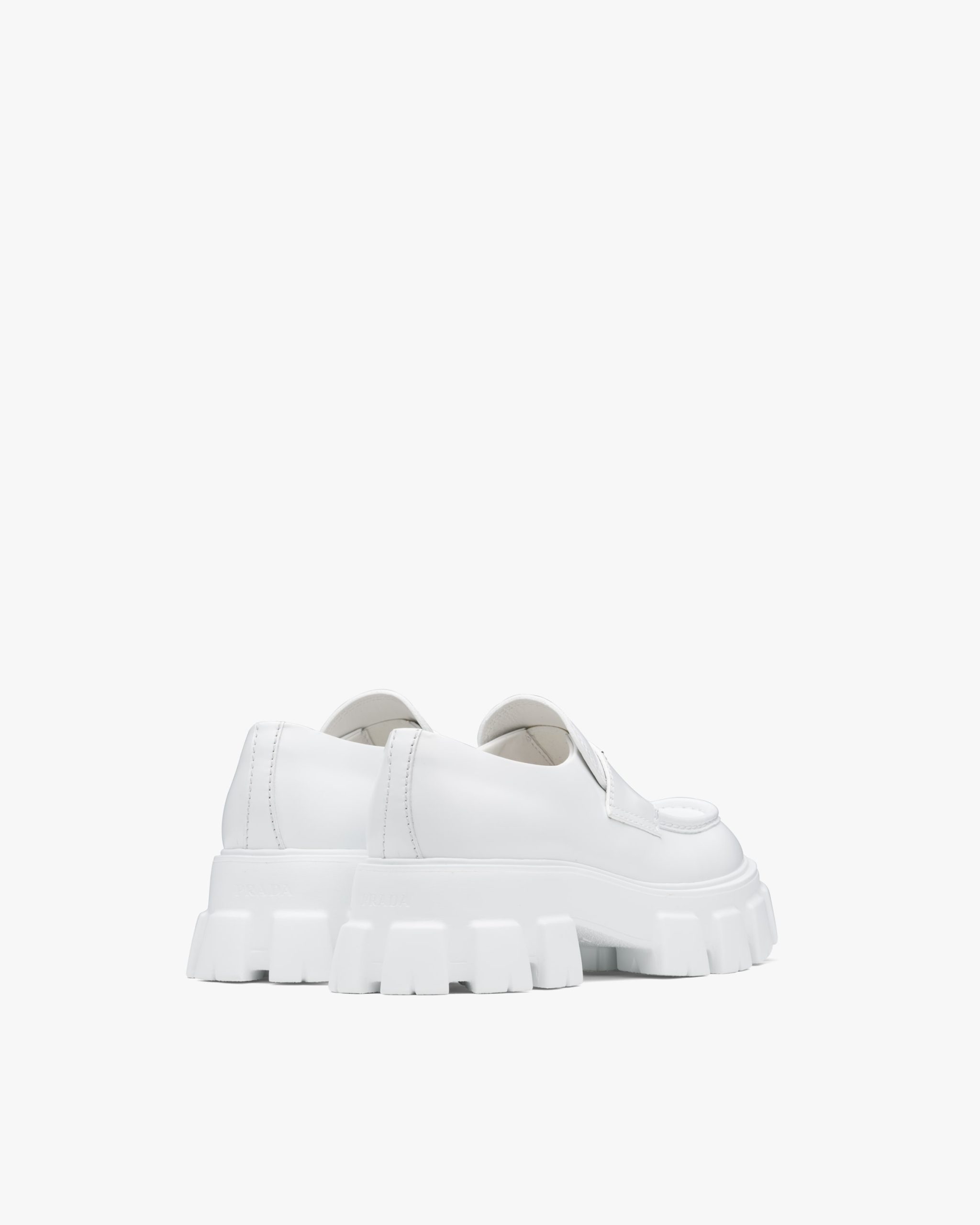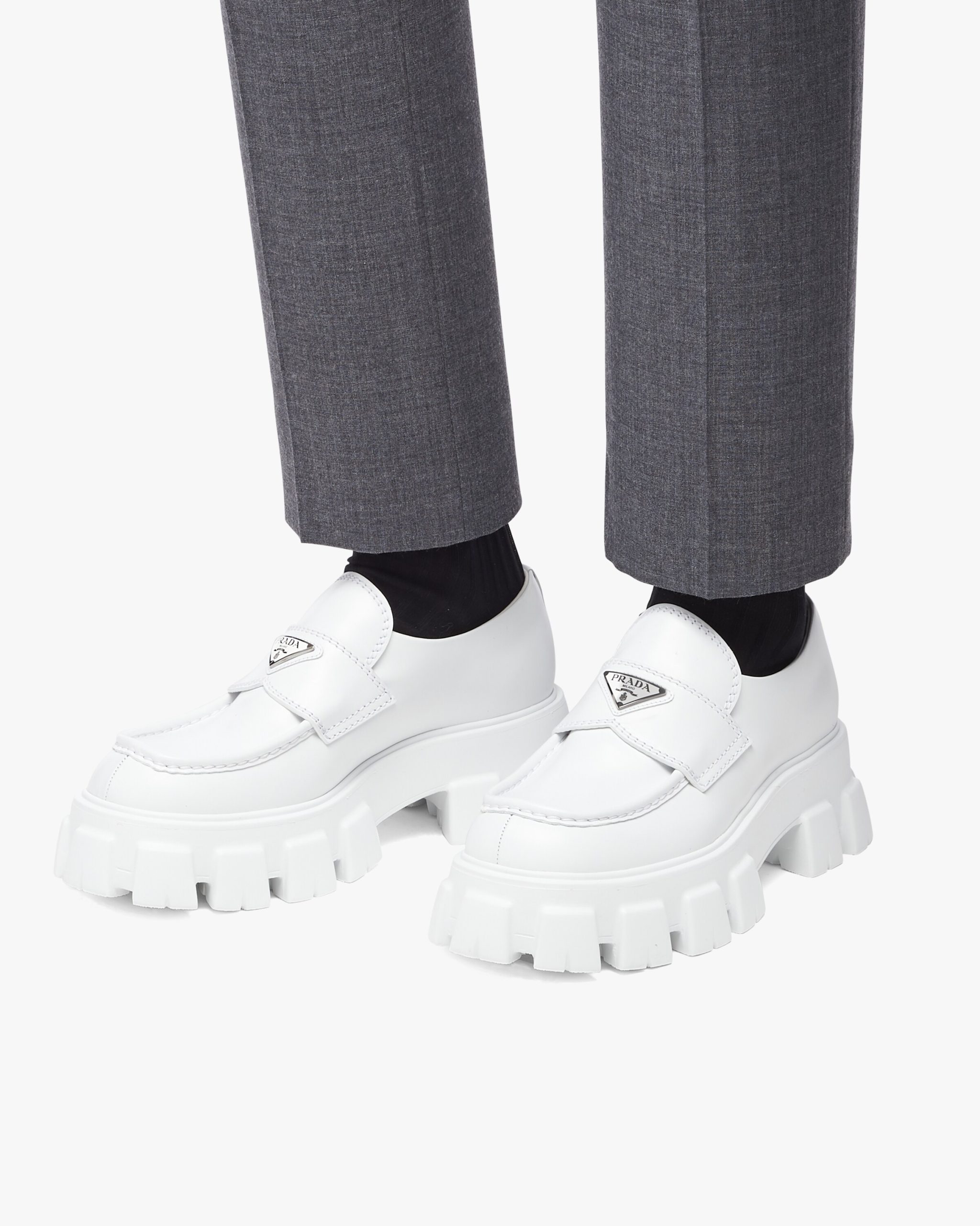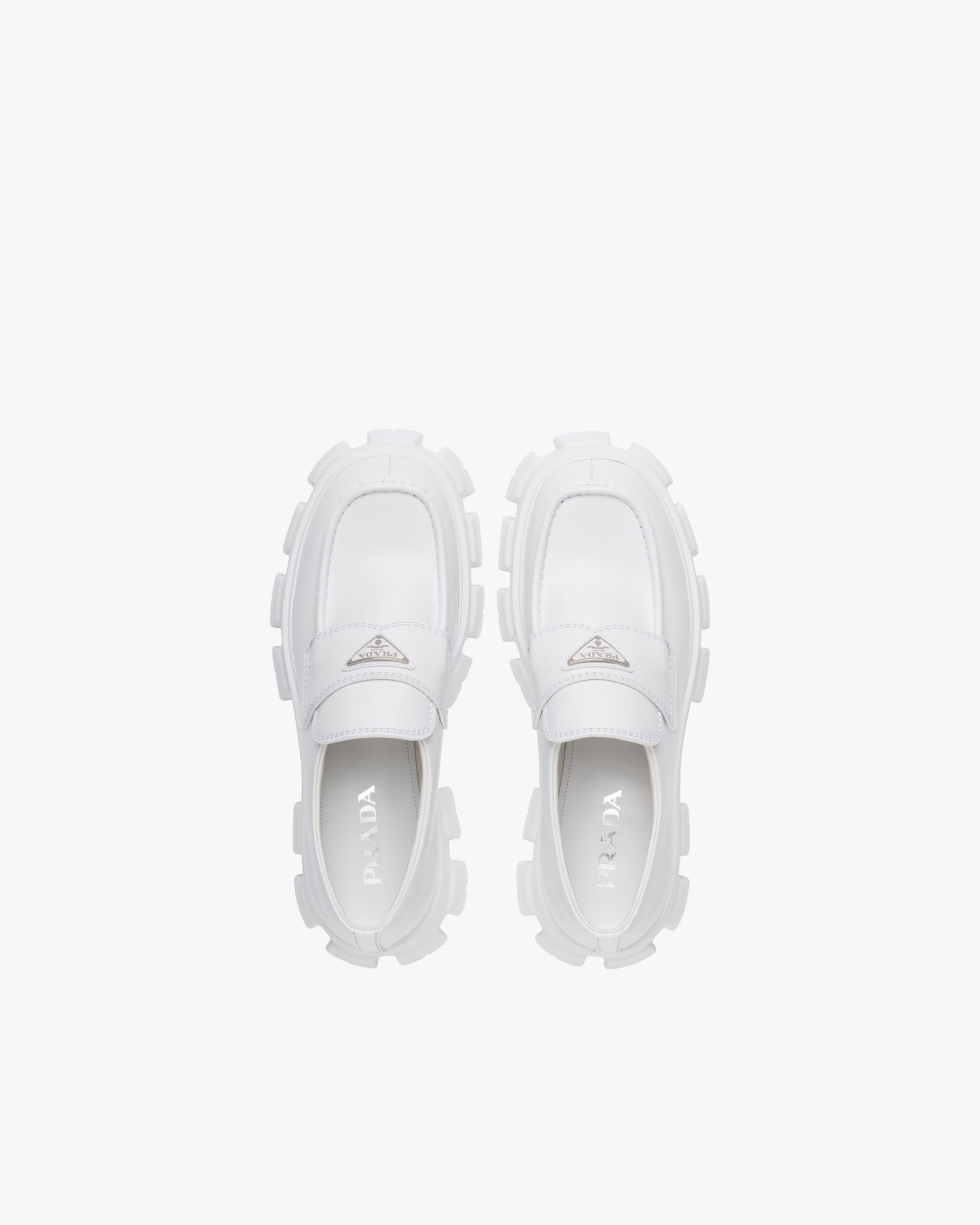 Unique and bold, this shoe emphasizes the concept of duality, which is essential in the aesthetics of the brand. The modernist maxi sole with a unique monolithic design creates a dialog with the brushed leather upper featuring a rigorous look and polished finish. A hybrid yet harmonious soul characterizes the Monolith line that combines diametrically opposed images to create a timeless silhouette. The loafers are decorated with the iconic enameled metal triangle logo.