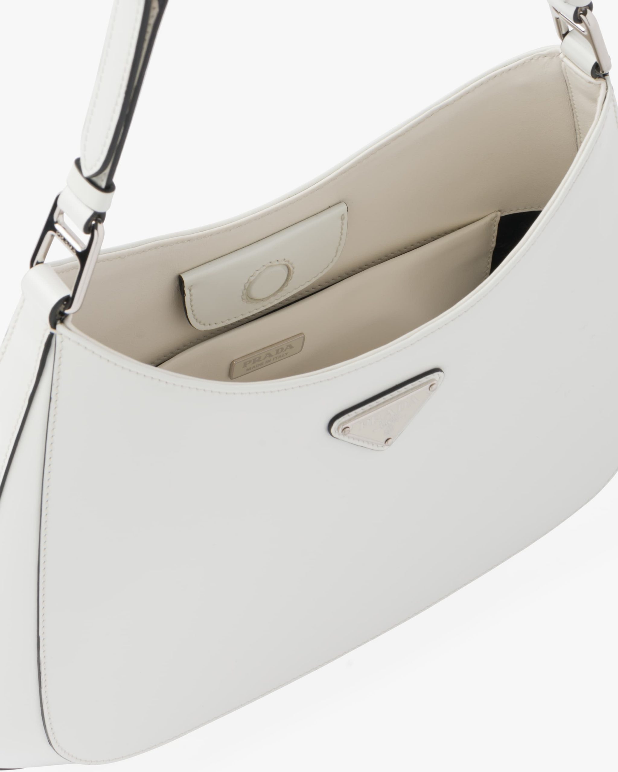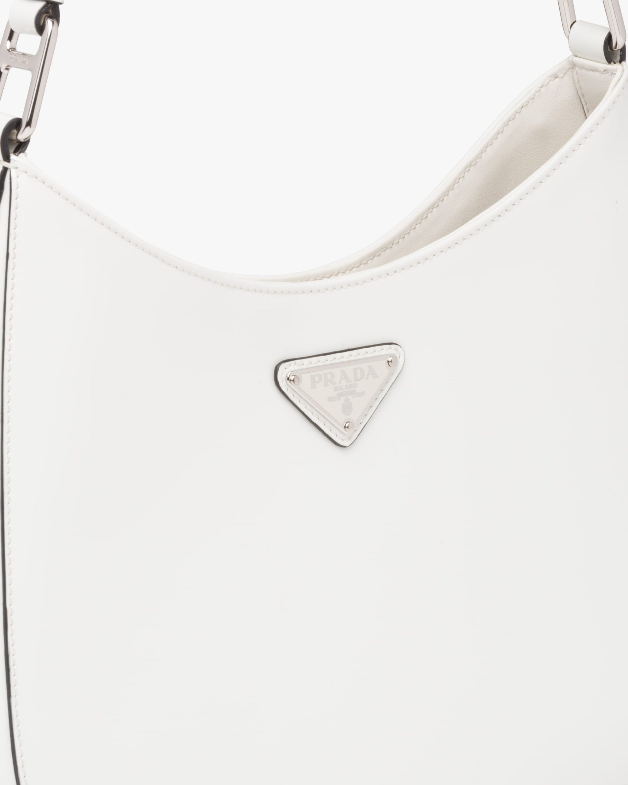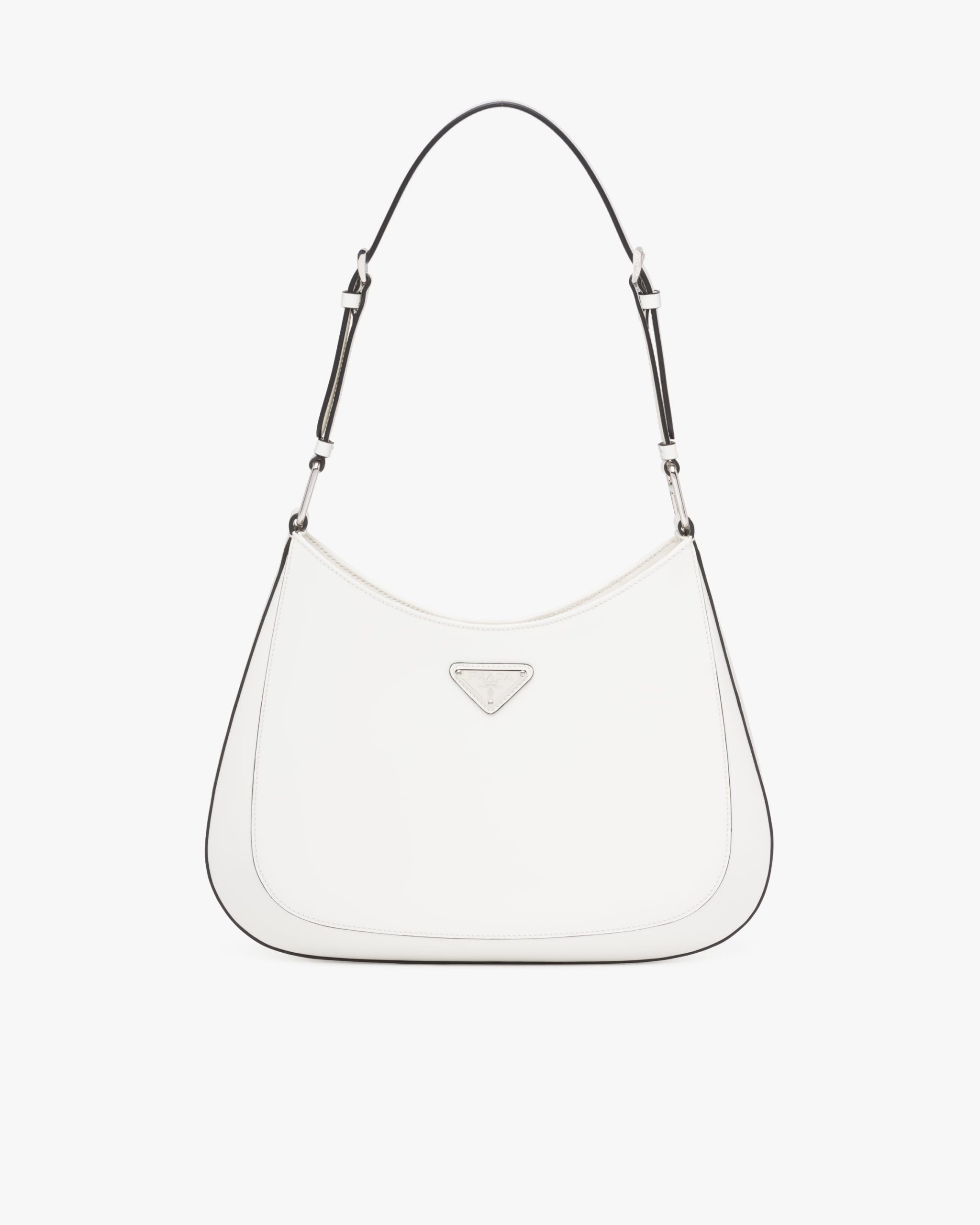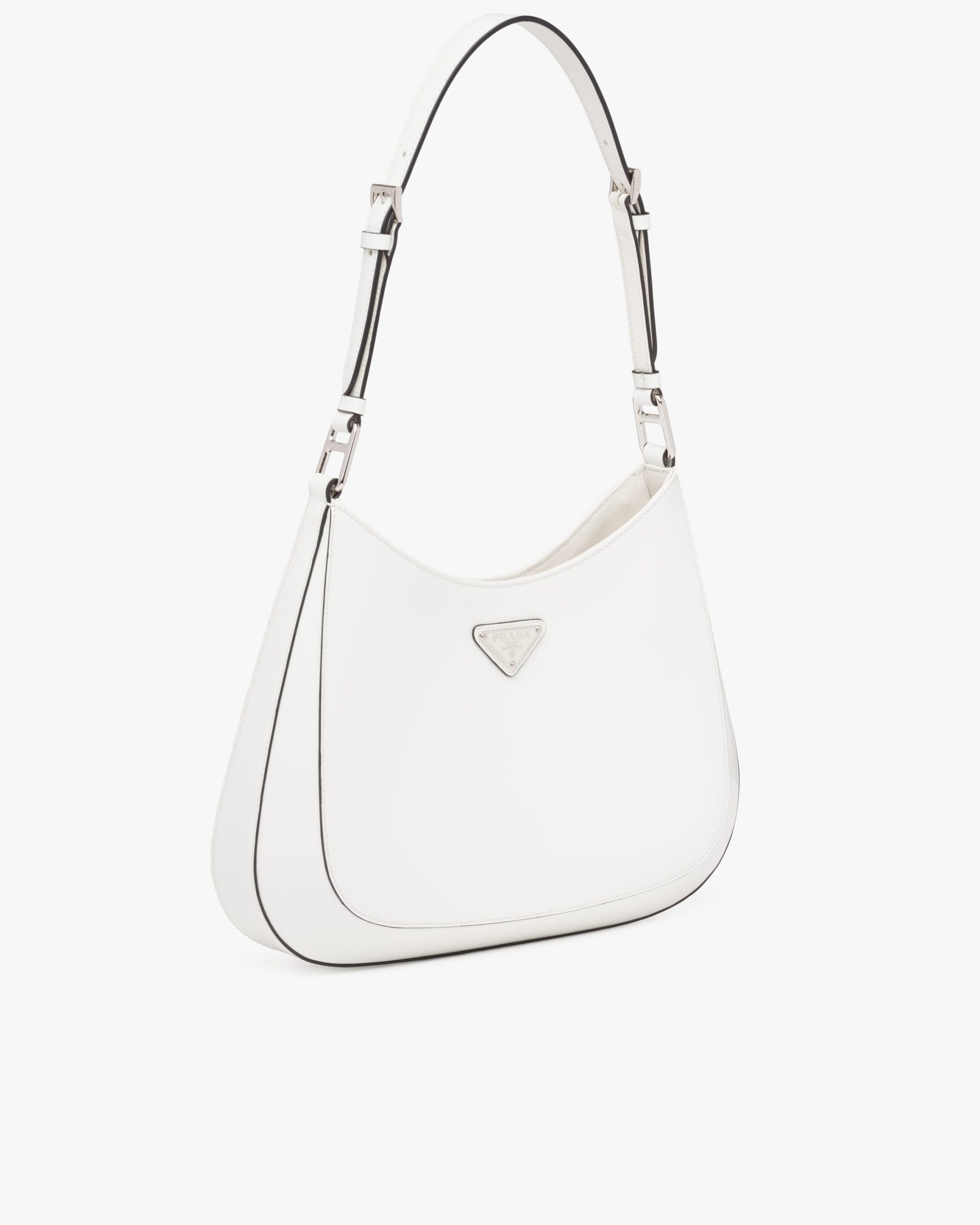 The Prada Cleo bag with sophisticated allure reinterprets an iconic design of the brand from the nineties. The sleek, curved lines emphasized by the particular sloped construction of the bottom and sides give this hobo bag a soft, light look. Brushed leather, a distinctive element of Prada collectsions, is a modern and versatile material that lends itself to always new combinations and contrasts. The enamel triangle logo decorates the silhouette.