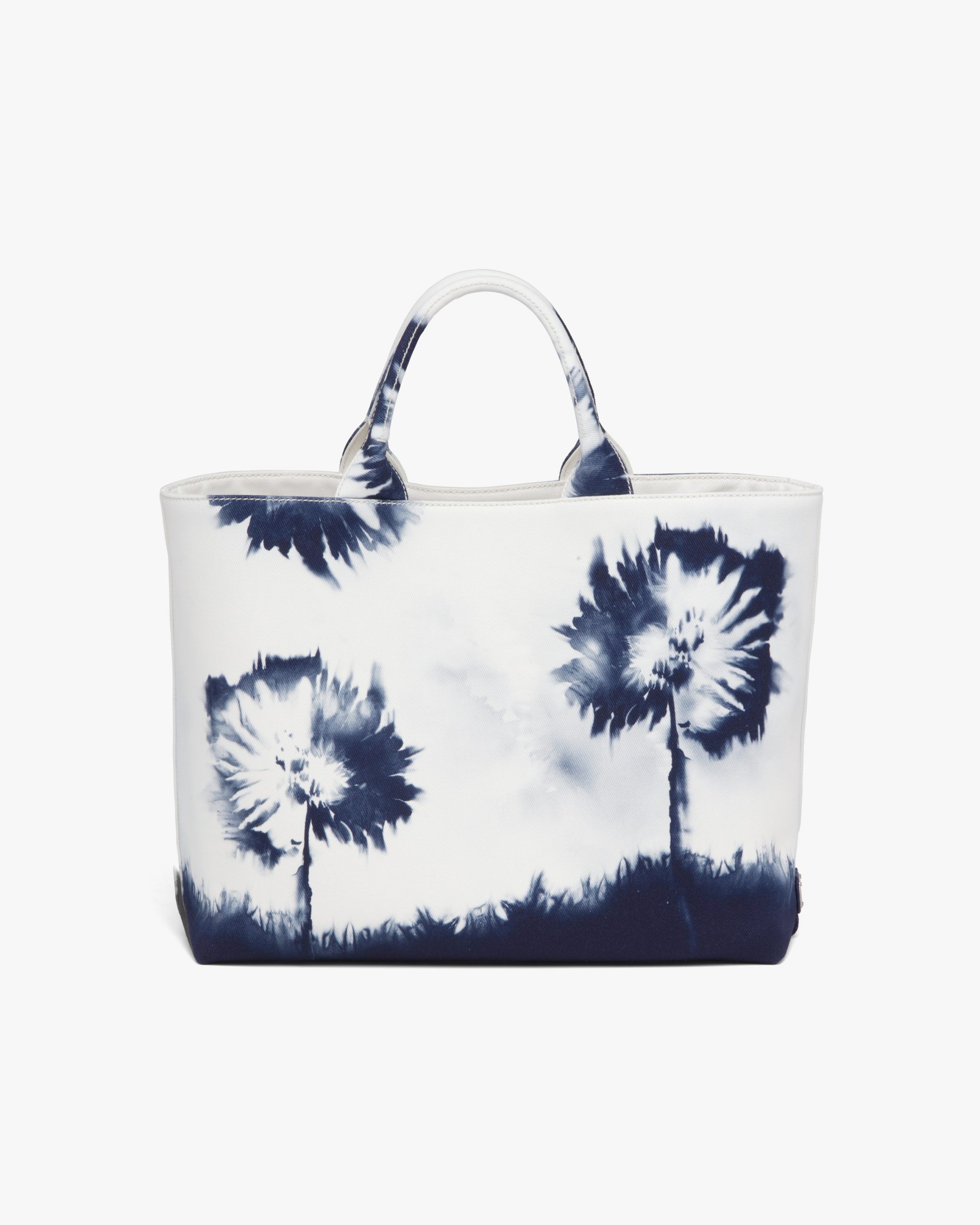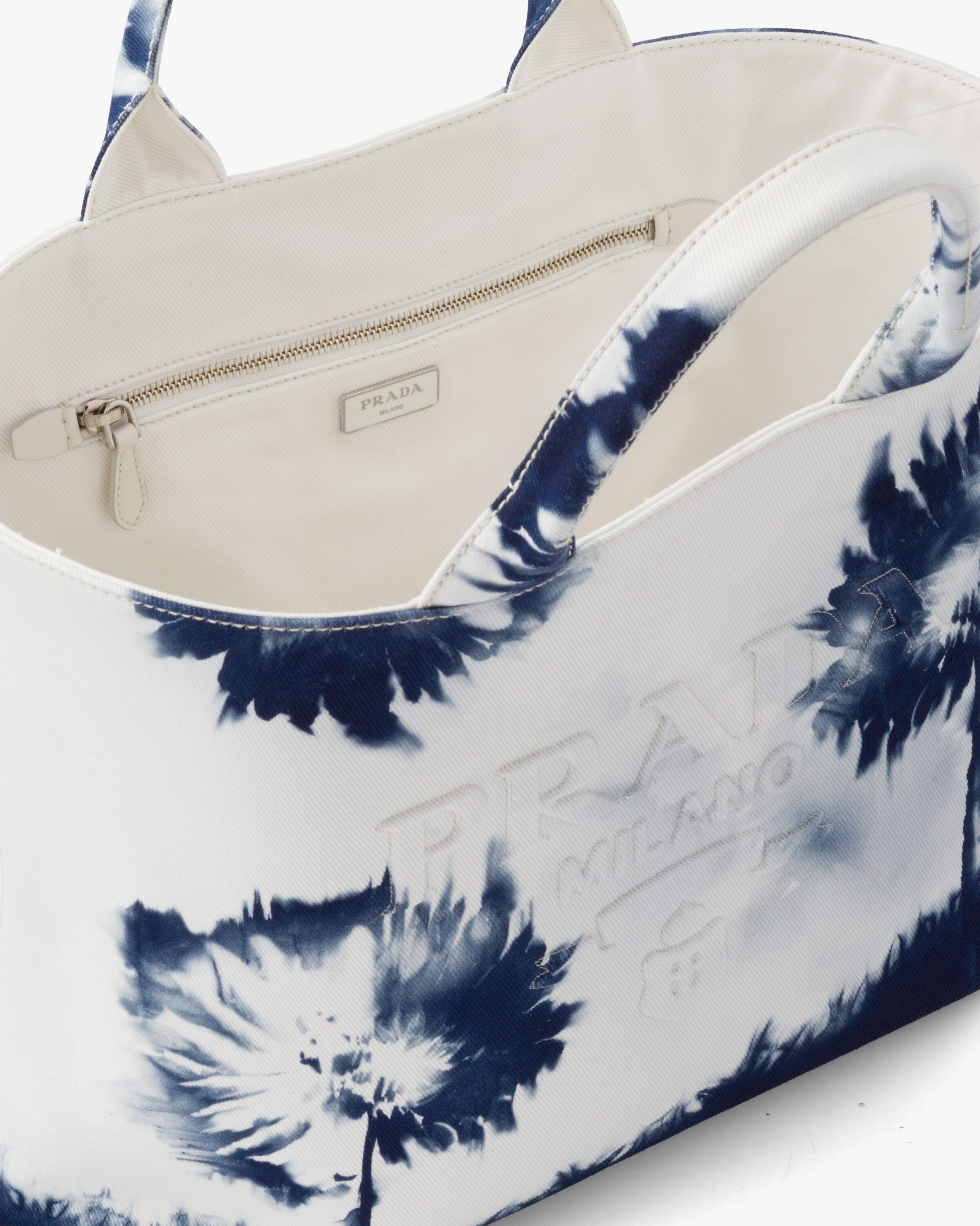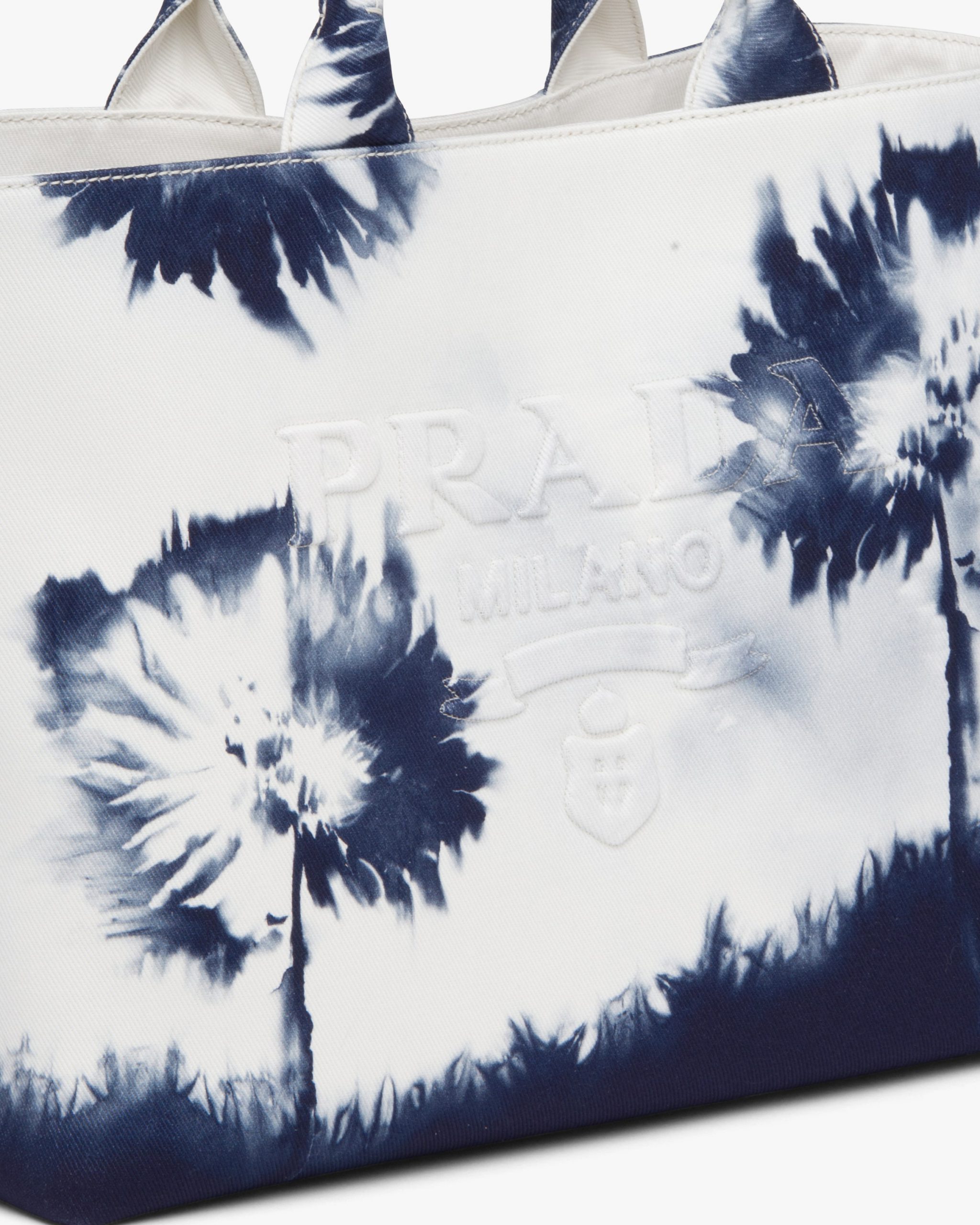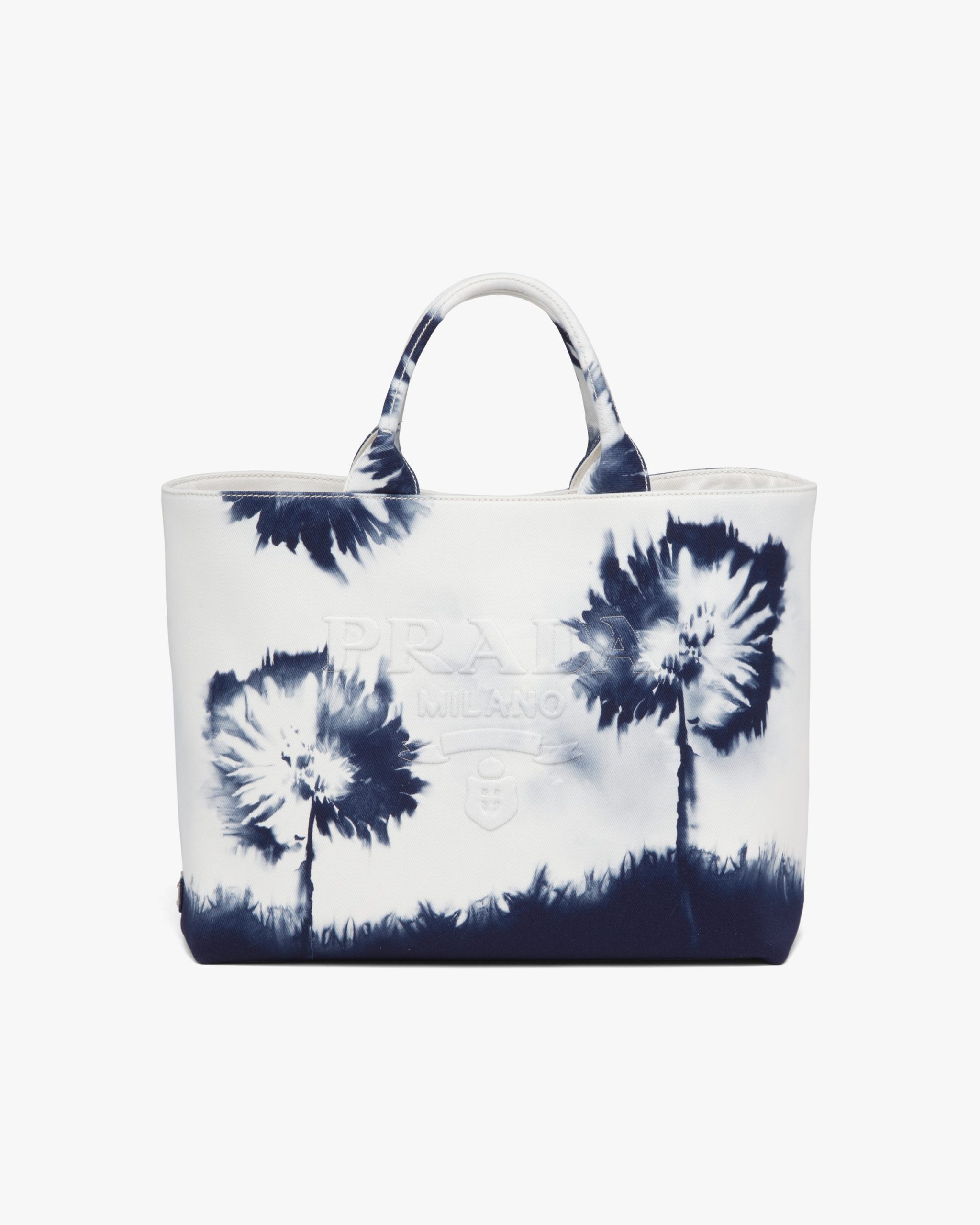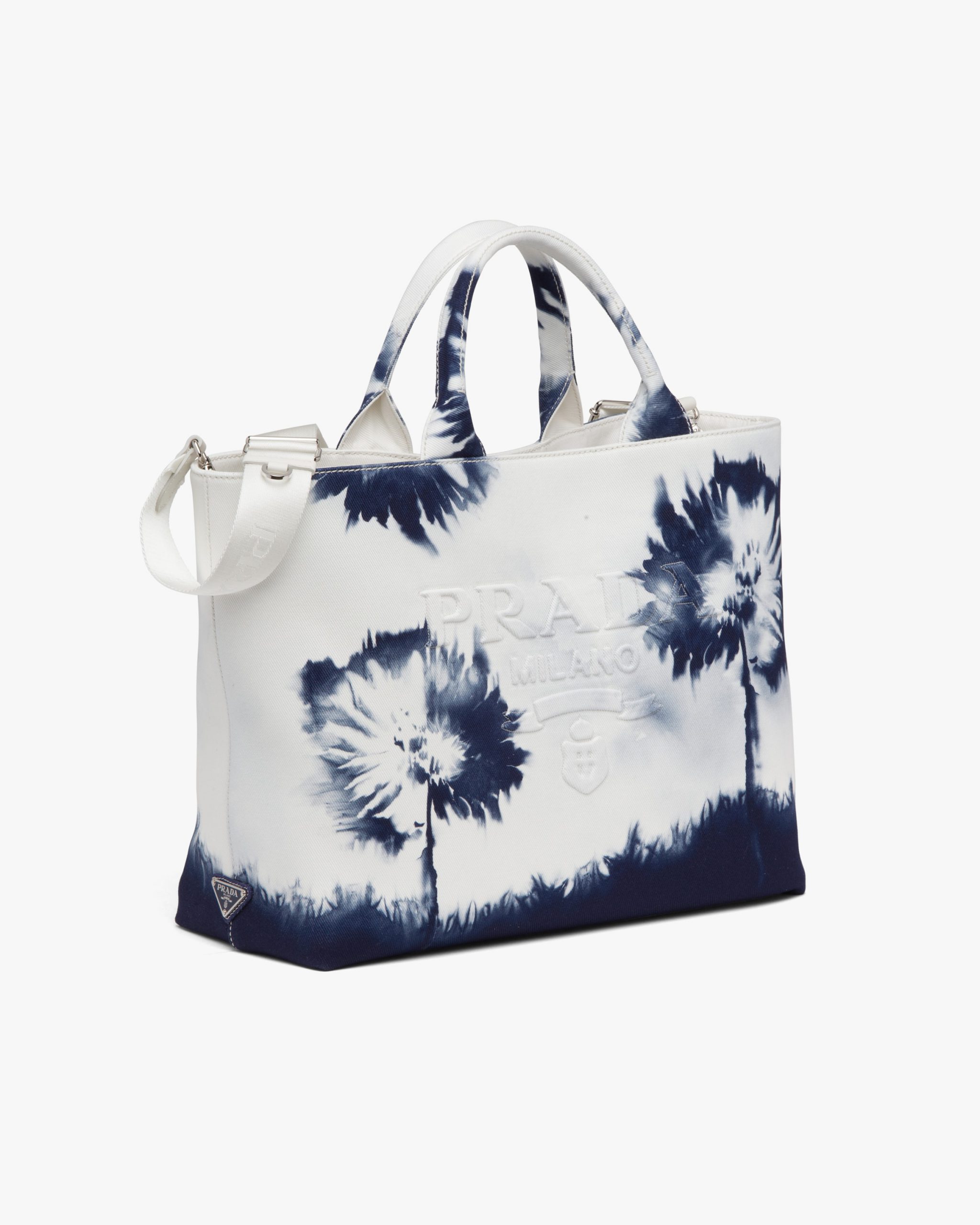 In this contemporary reinterpretation, a macro version of the Prada triangle logo stands out in relief on this drill tote bag emphasized by an abstract floral print with a pictorial effect. Part of Prada’s genetic code, recognizable and timeless prints have identified the collectsions of the brand since the ’90s, generating bold combinations or emphasizing designs with traditional allure.