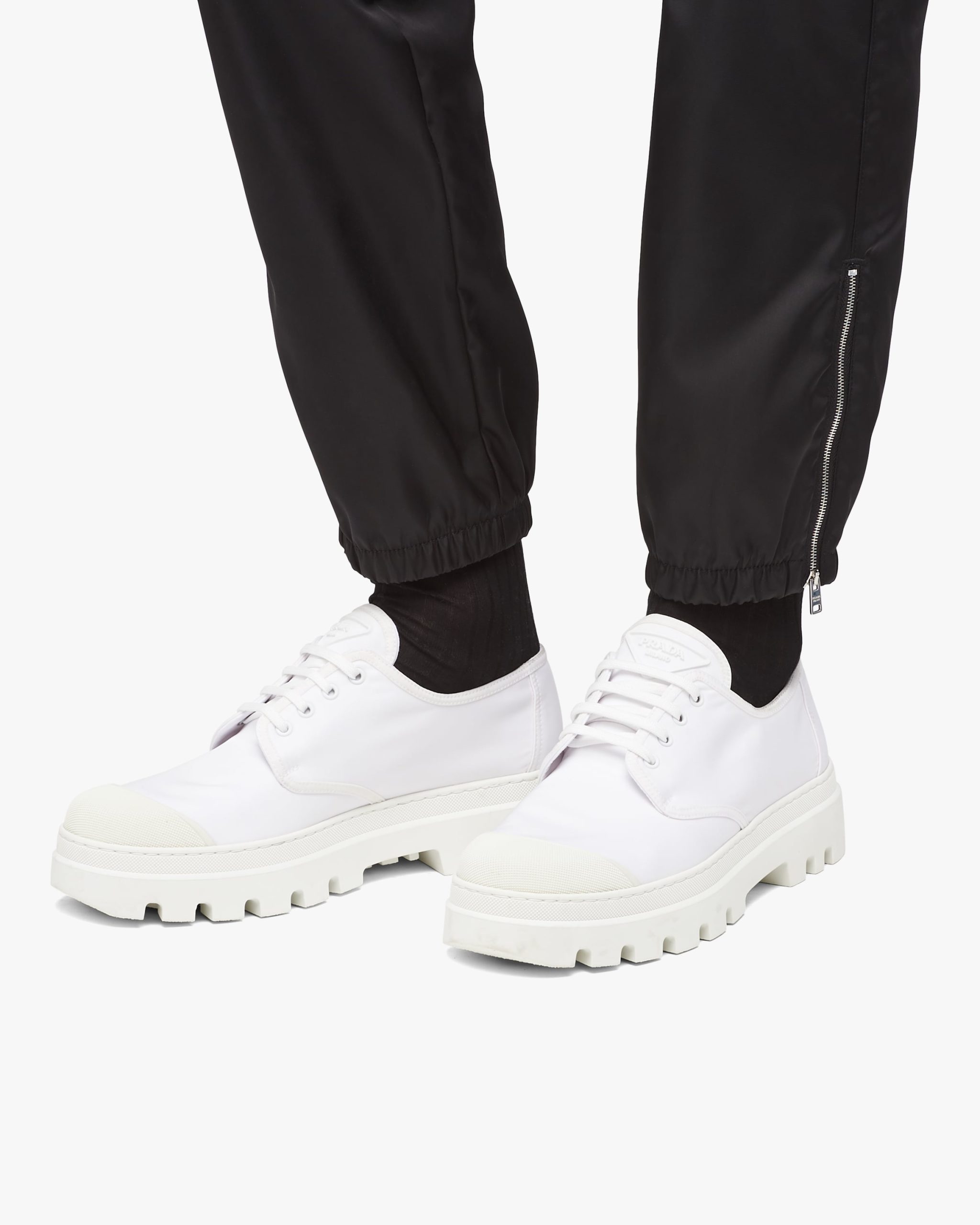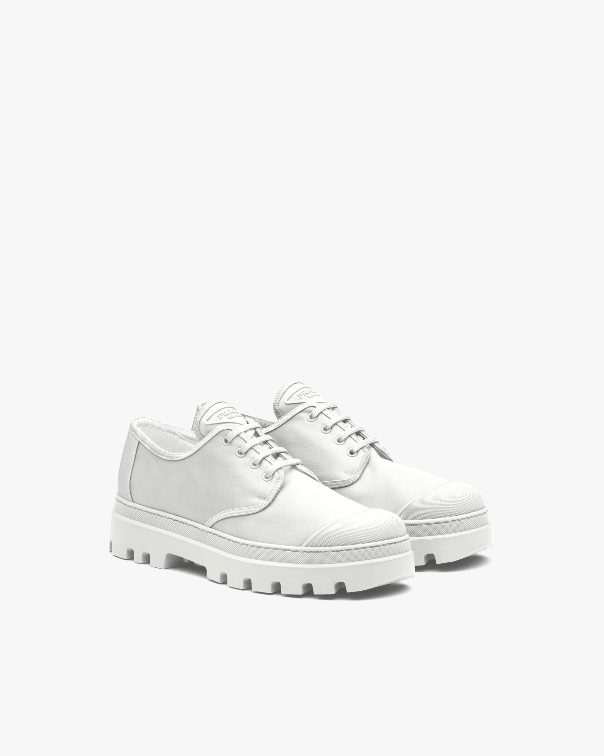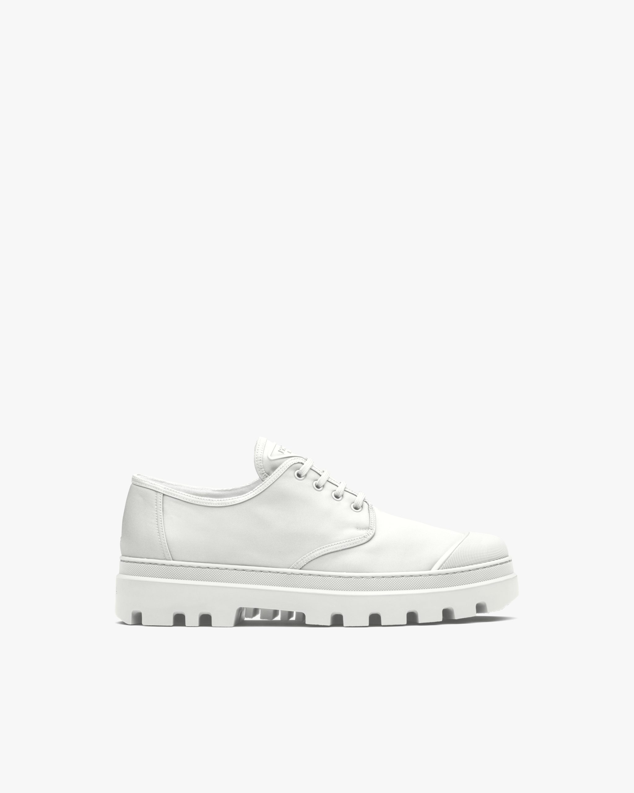 The lace-up Derby shoe is given a contemporary update with a play of different volumes and materials. The distinctive rubber toe cap contrasts with the nylon upper decorated with the triangle logo on the tongue. A thick rubber tread sole completes the shoe.