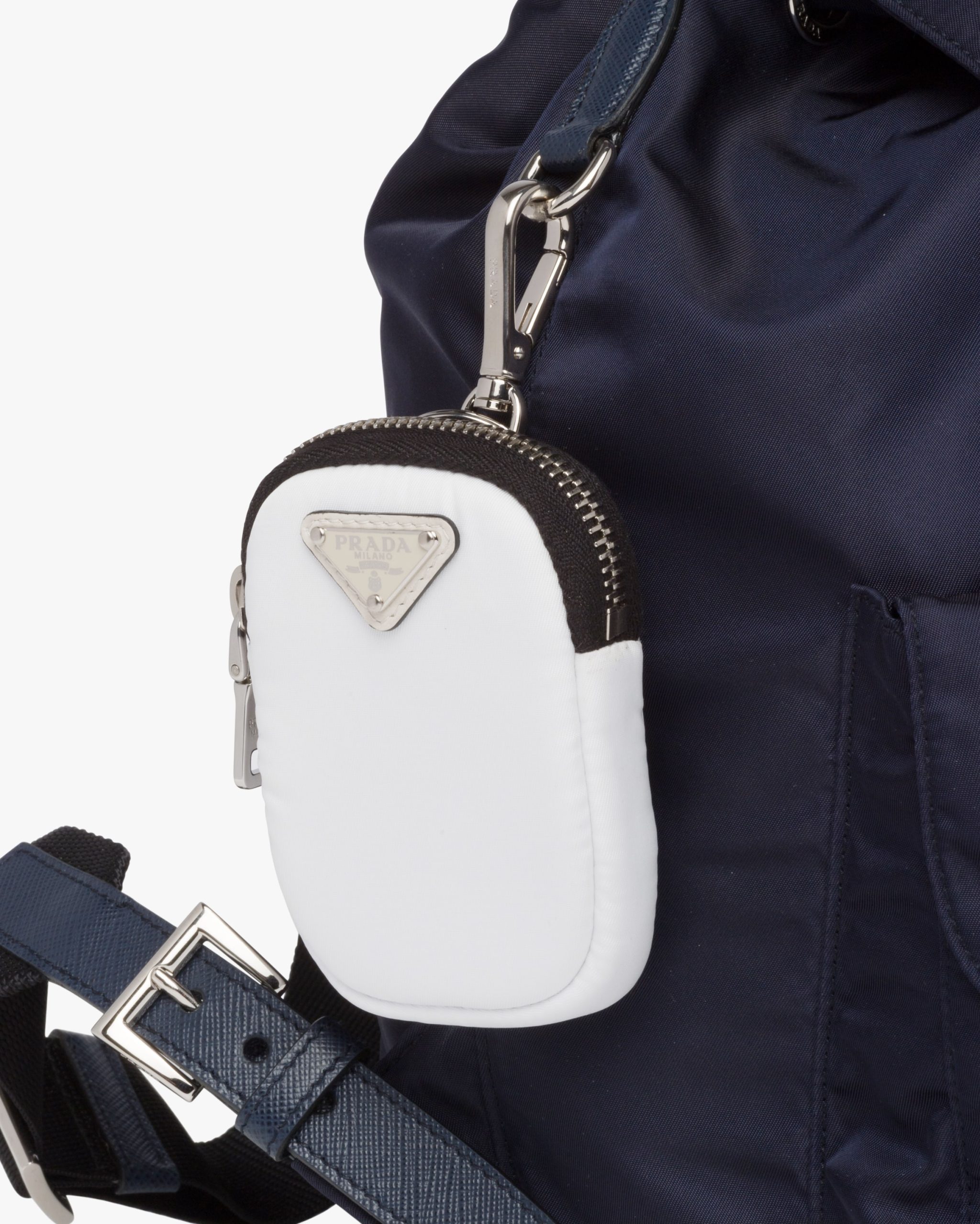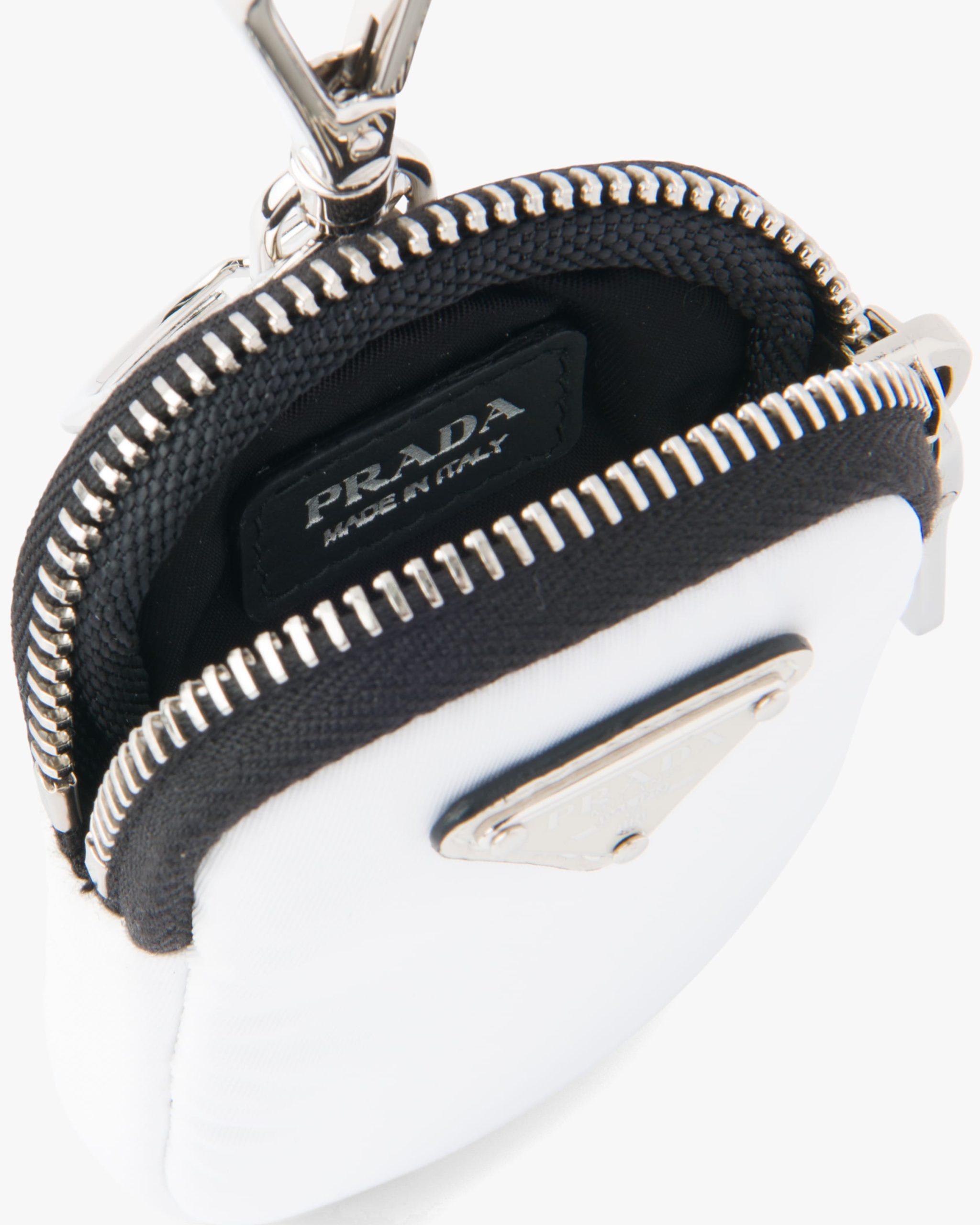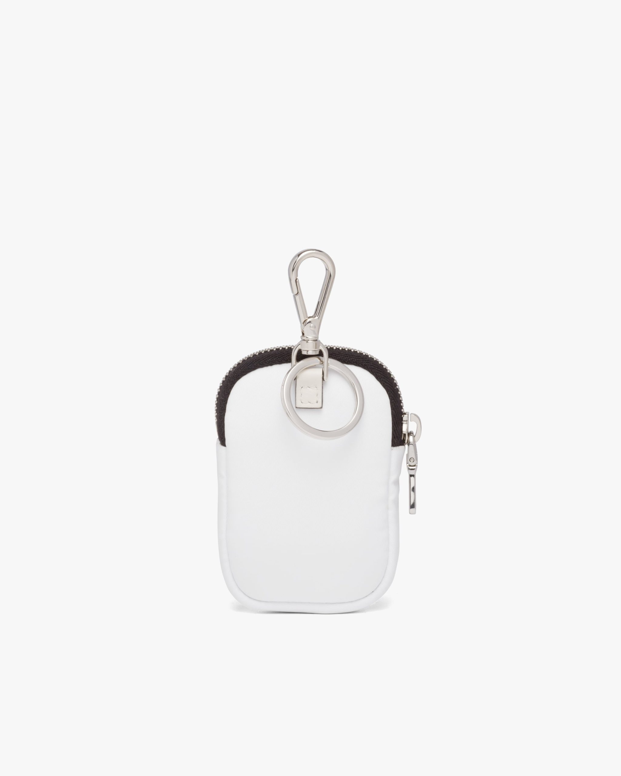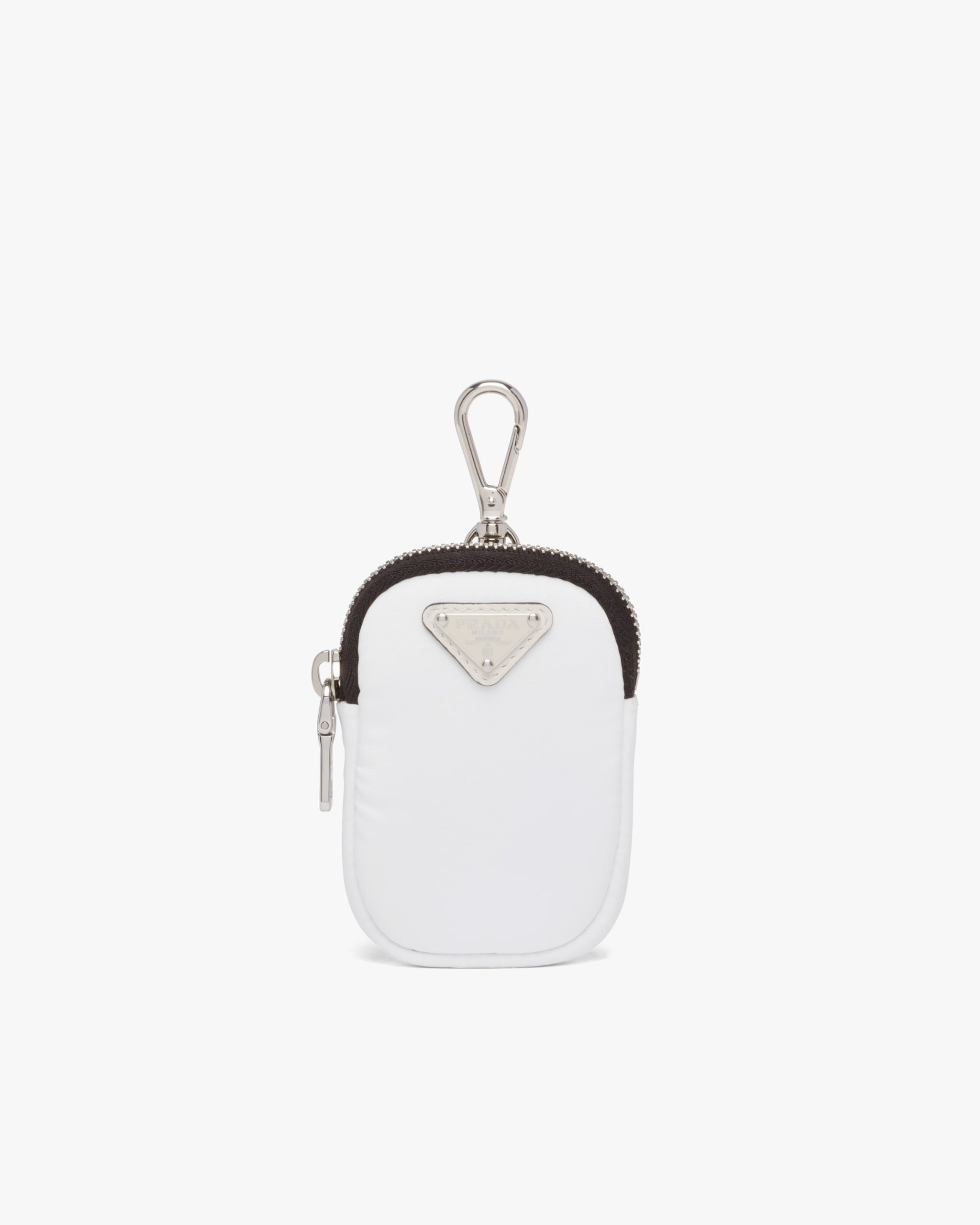 This quilted nylon mini-pouch with a compact, minimalist design is decorated with the metal triangle logo. The accessory is completed by the ring, snap-hook and zipper closure.