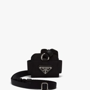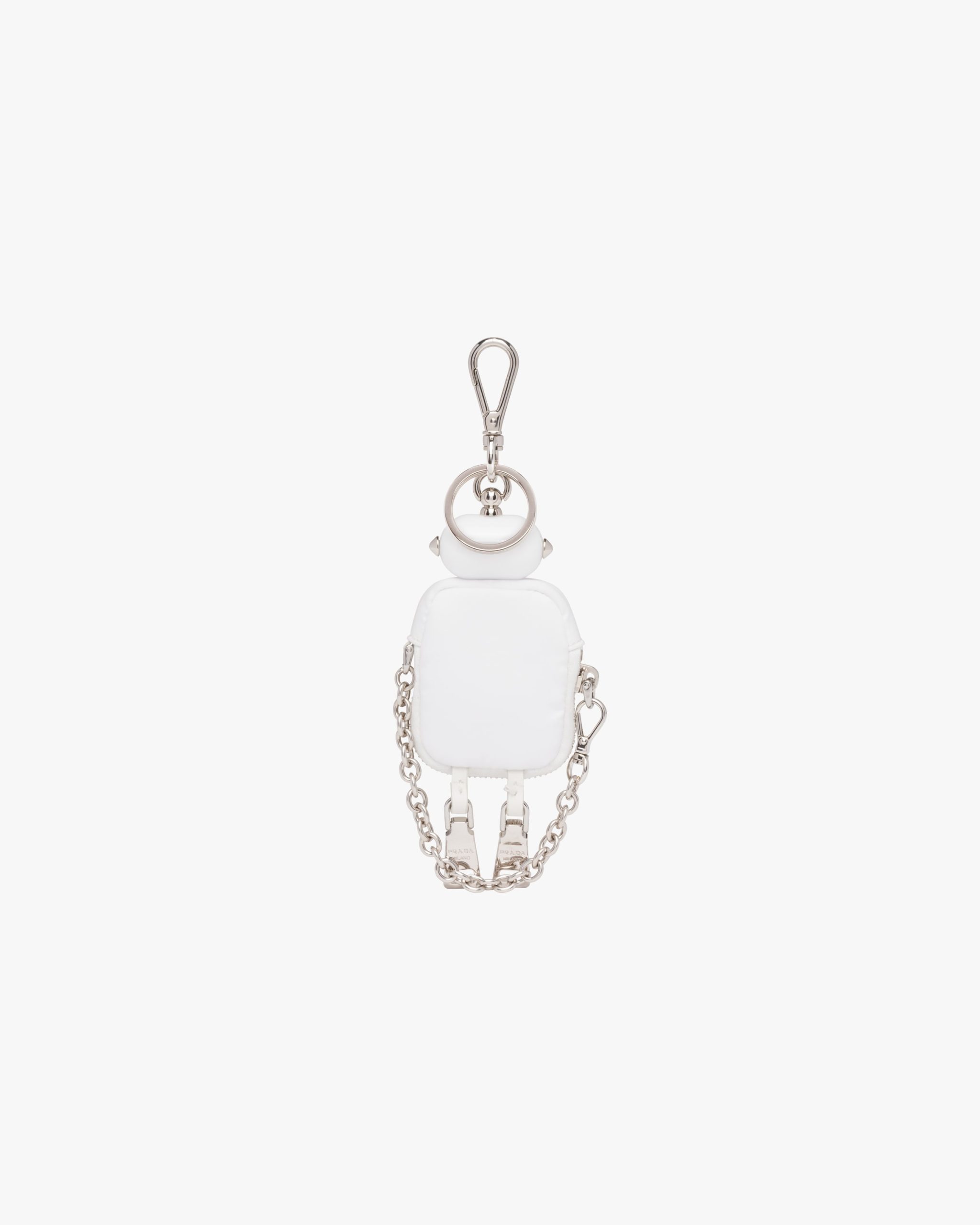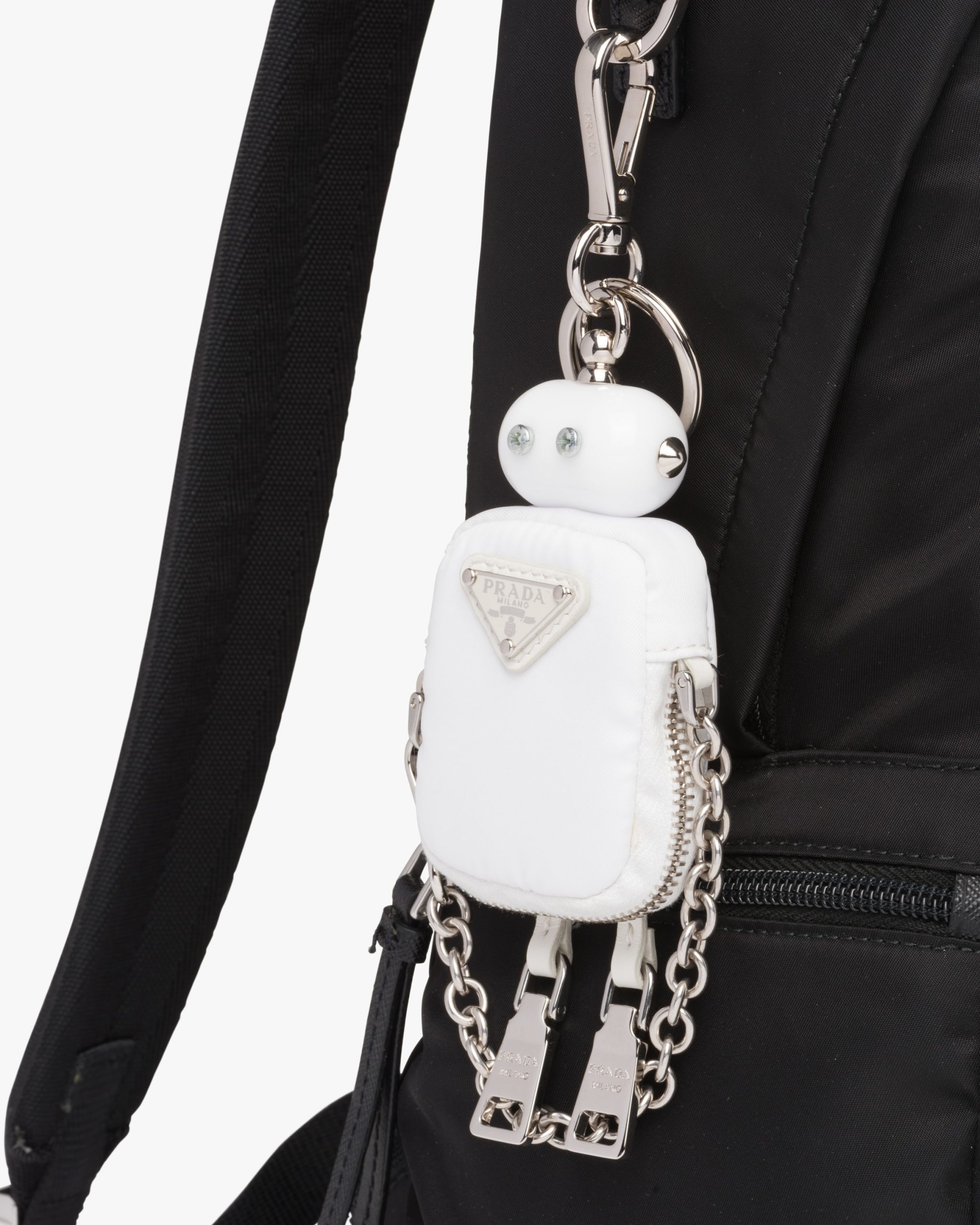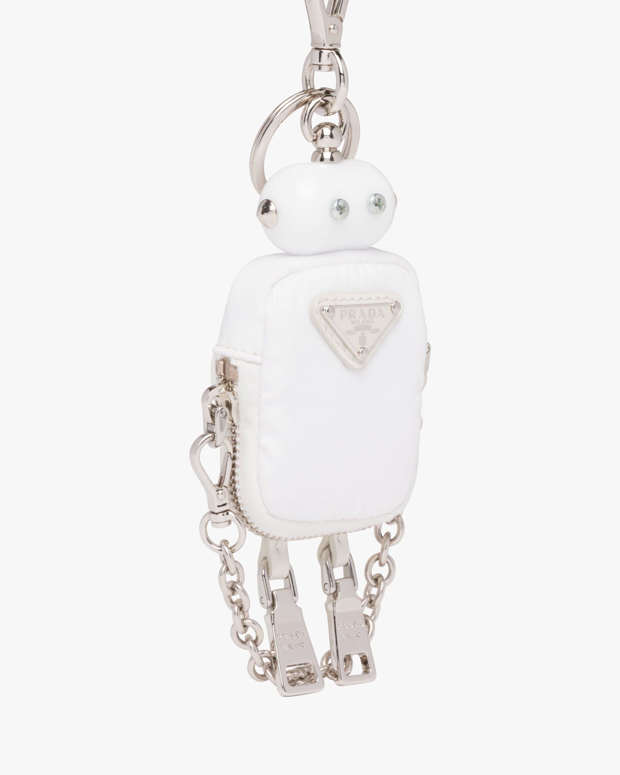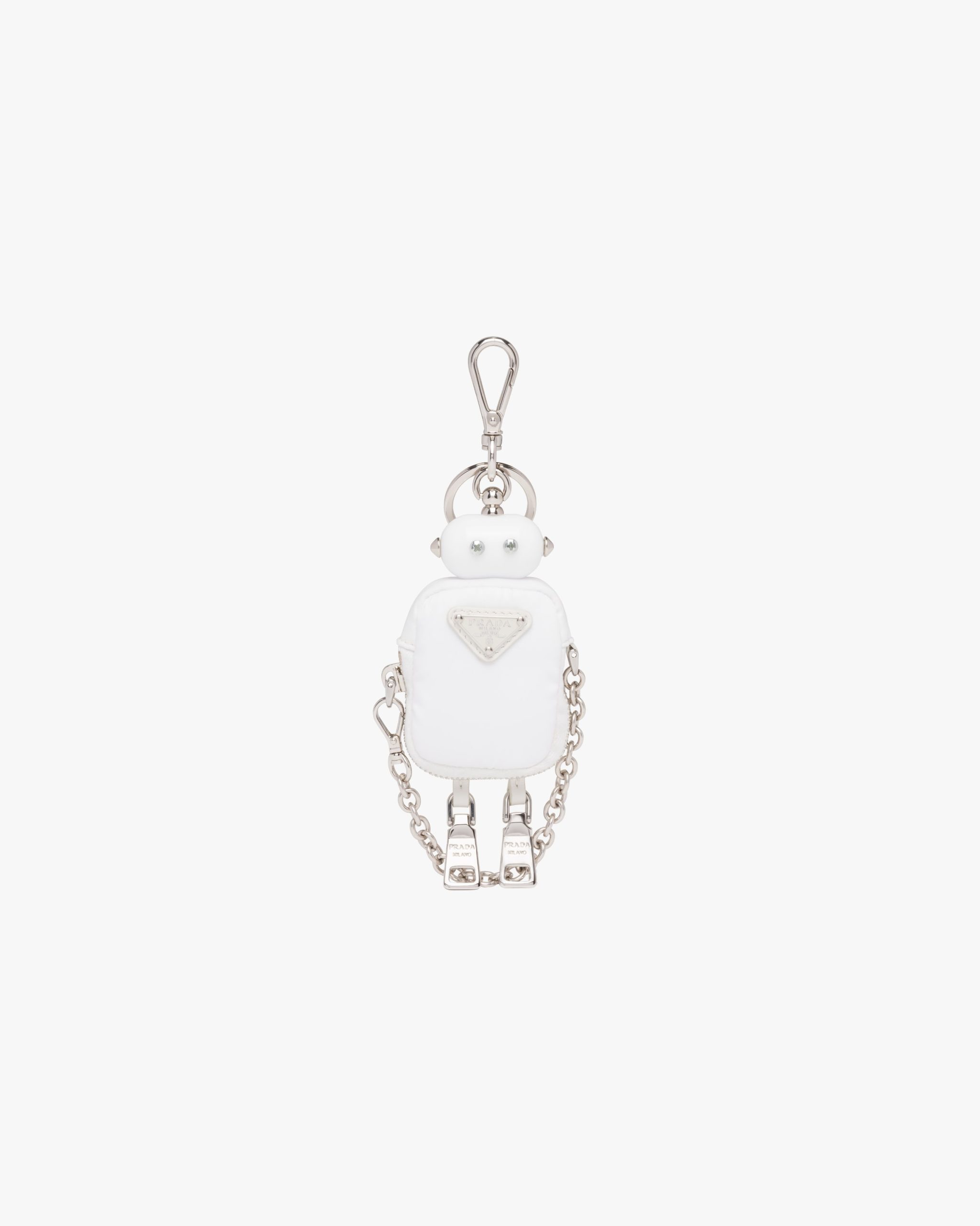 Among Prada’s distinctive accessories, the robot keychain trick is redesigned with a nylon body, a mini-pouch with zipper closure. The metal arms are connected with a chain, while the legs are created by the zipper pulls. Decorated with classic enameled metal triangle logo, the design is completed with a snap-hook and ring.