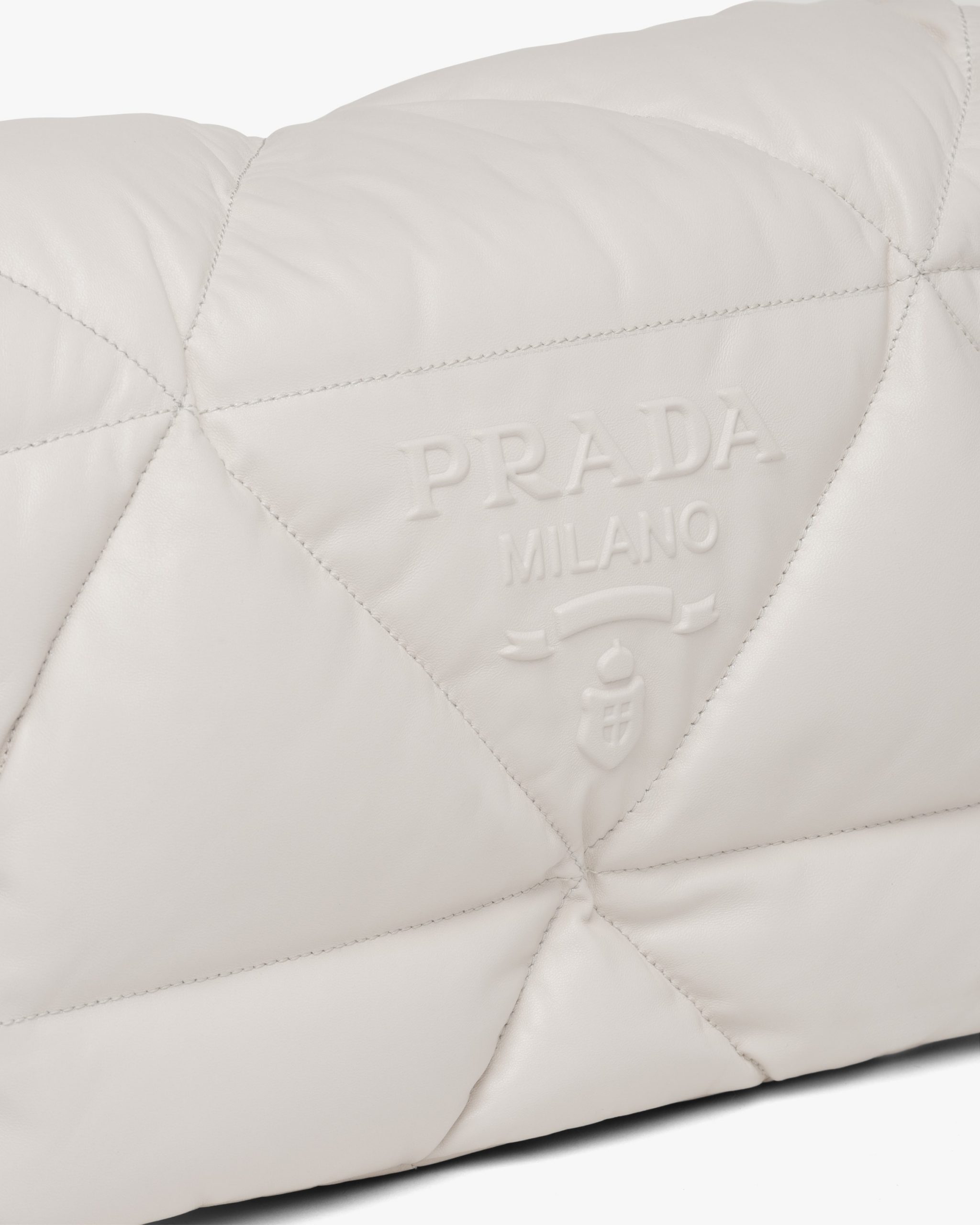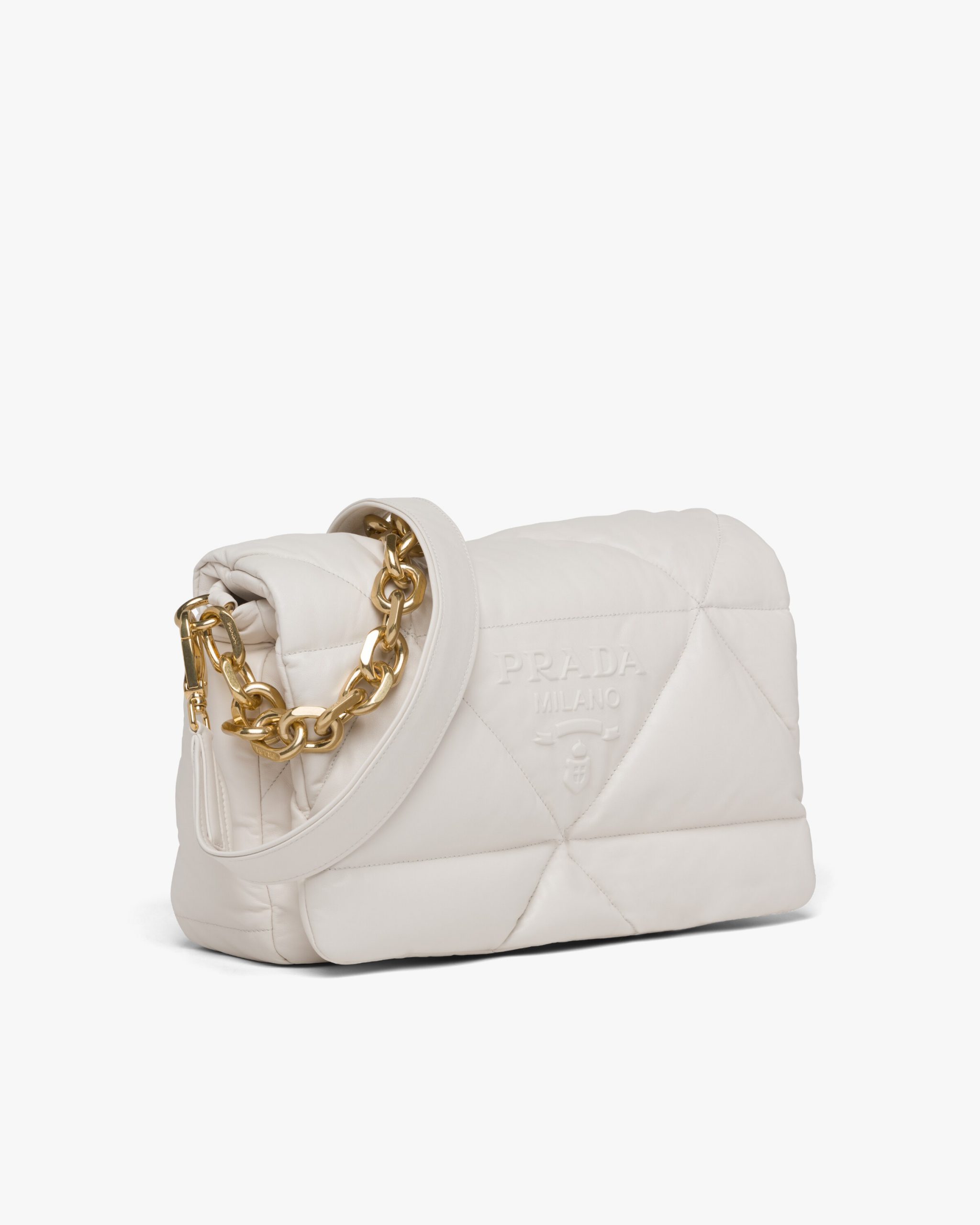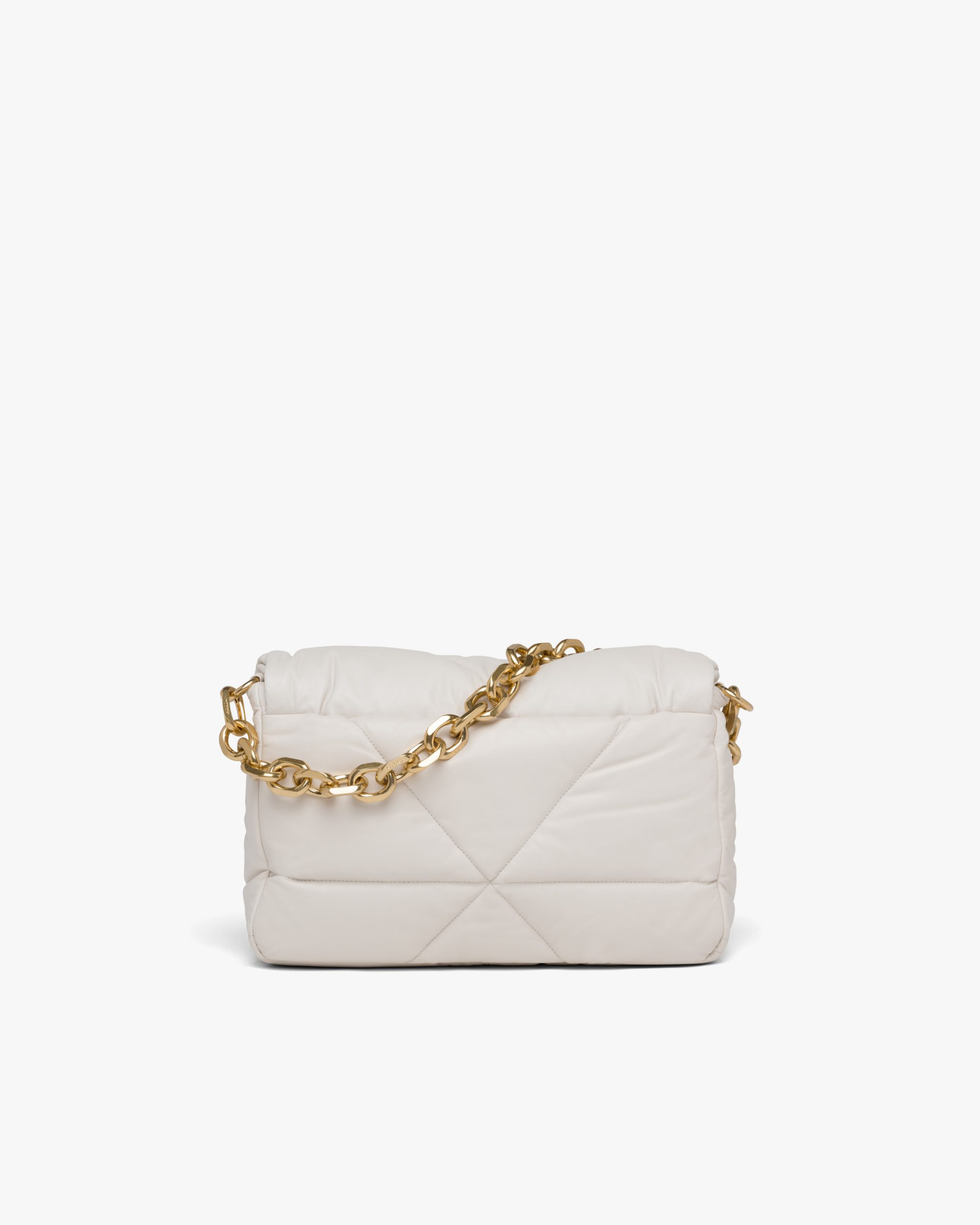 Reinterpreted in always new ways, Prada’s iconic triangle is repeated in the quilted motif of this soft padded nappa leather bag to create a patchwork motif. The chain handle is decorated with the engraved lettering logo.