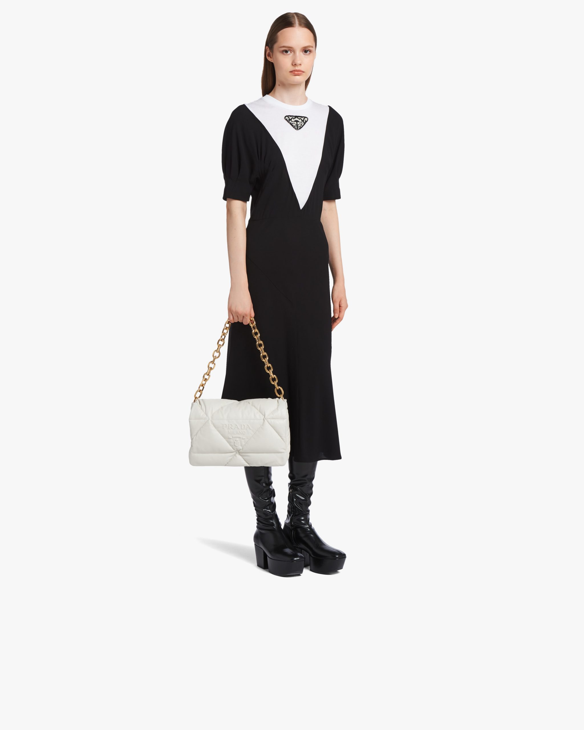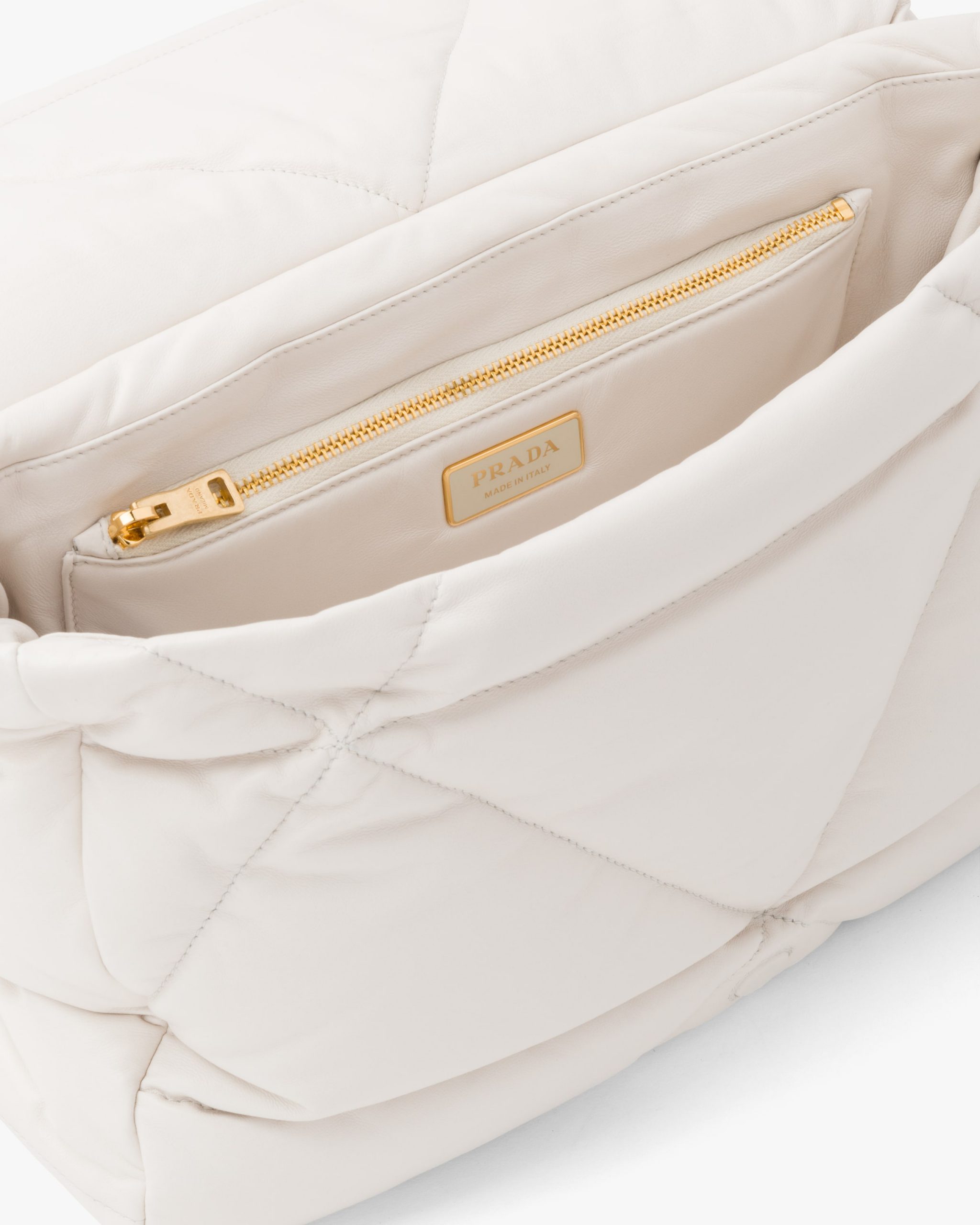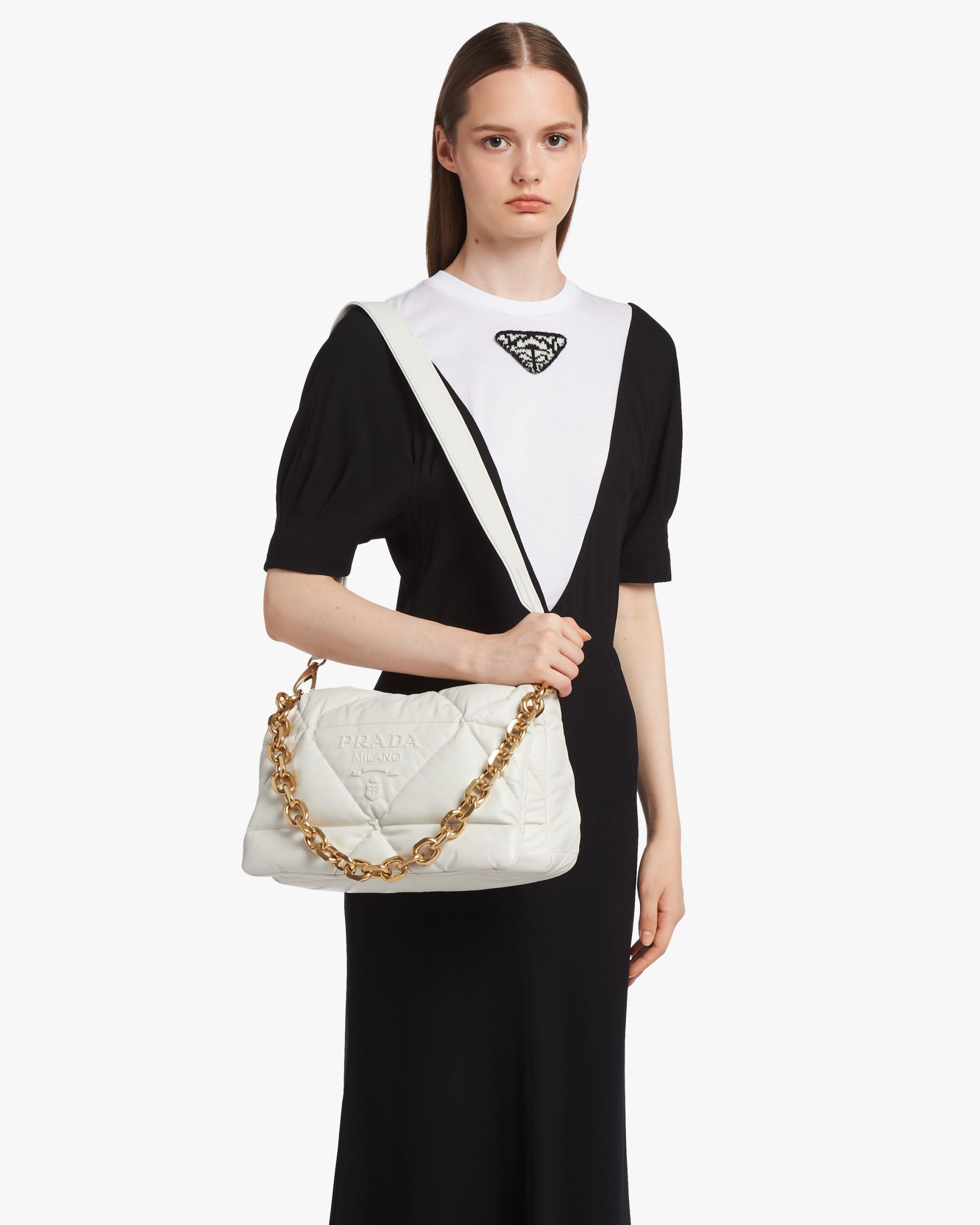 Reinterpreted in always new ways, Prada’s iconic triangle is repeated in the quilted motif of this soft padded nappa leather bag to create a patchwork motif. The chain handle is decorated with the engraved lettering logo.