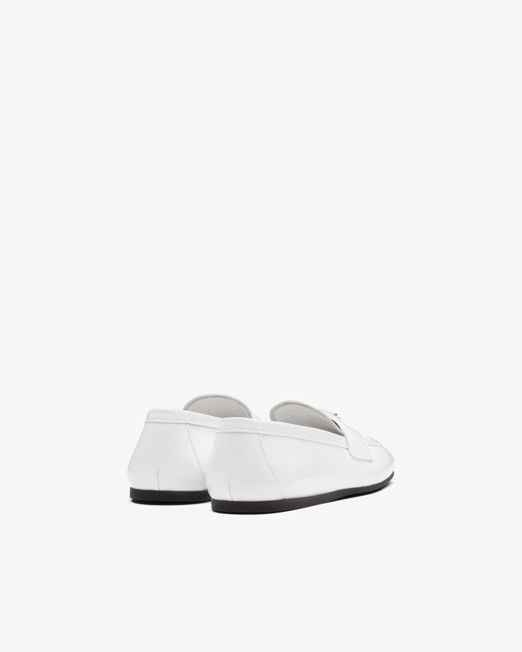 These patent leather loafers incarnate Prada elegance. The metal triangle logo decorates the shoe.