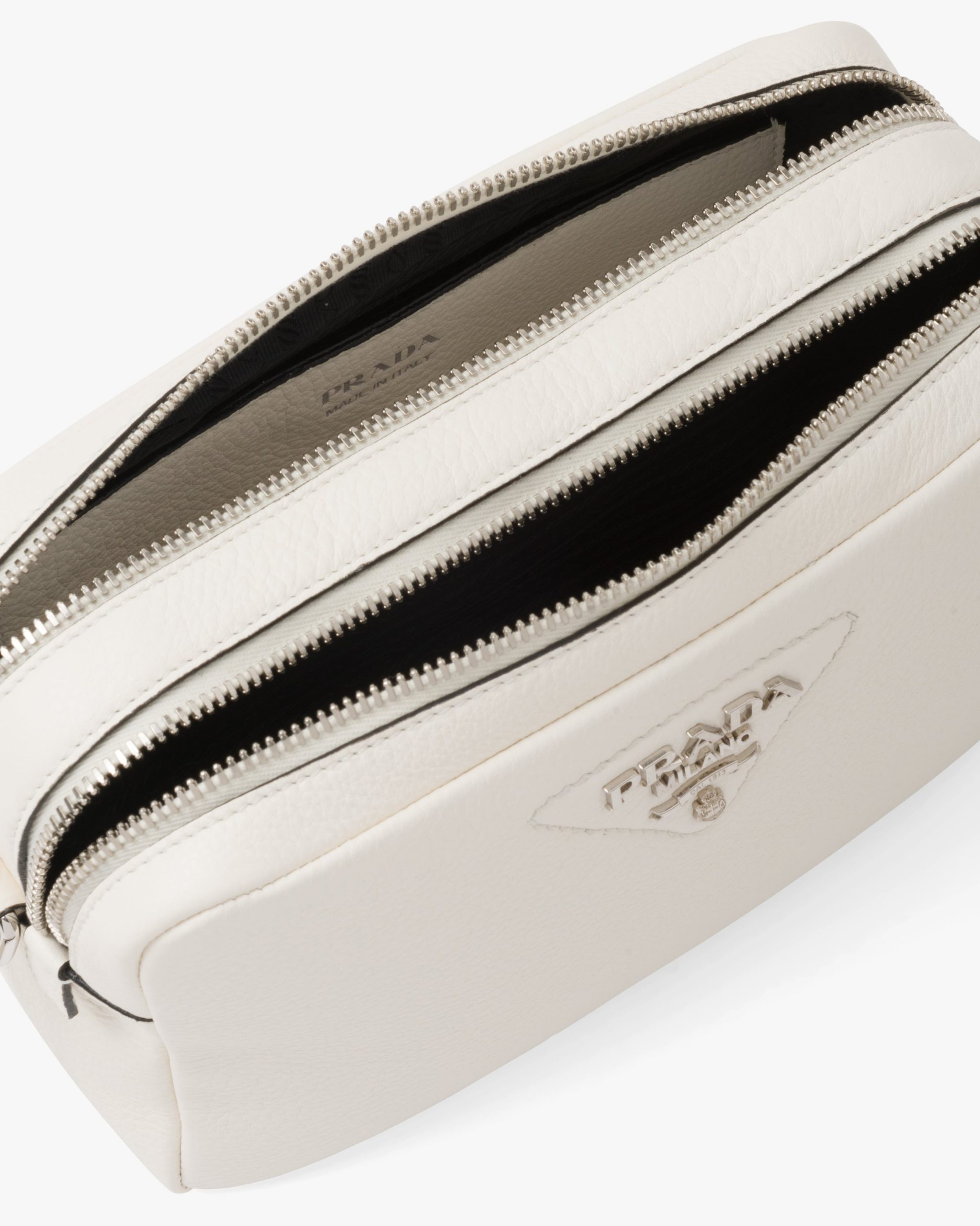 This Prada Flou leather shoulder bag with a double zipper is made of soft leather and illuminated by metal hardware for a modern accent. The accessory is completed by the detachable woven tape shoulder strap embroidered with the logo in a contrasting color, that makes it wearable as a crossbody or shoulder bag.