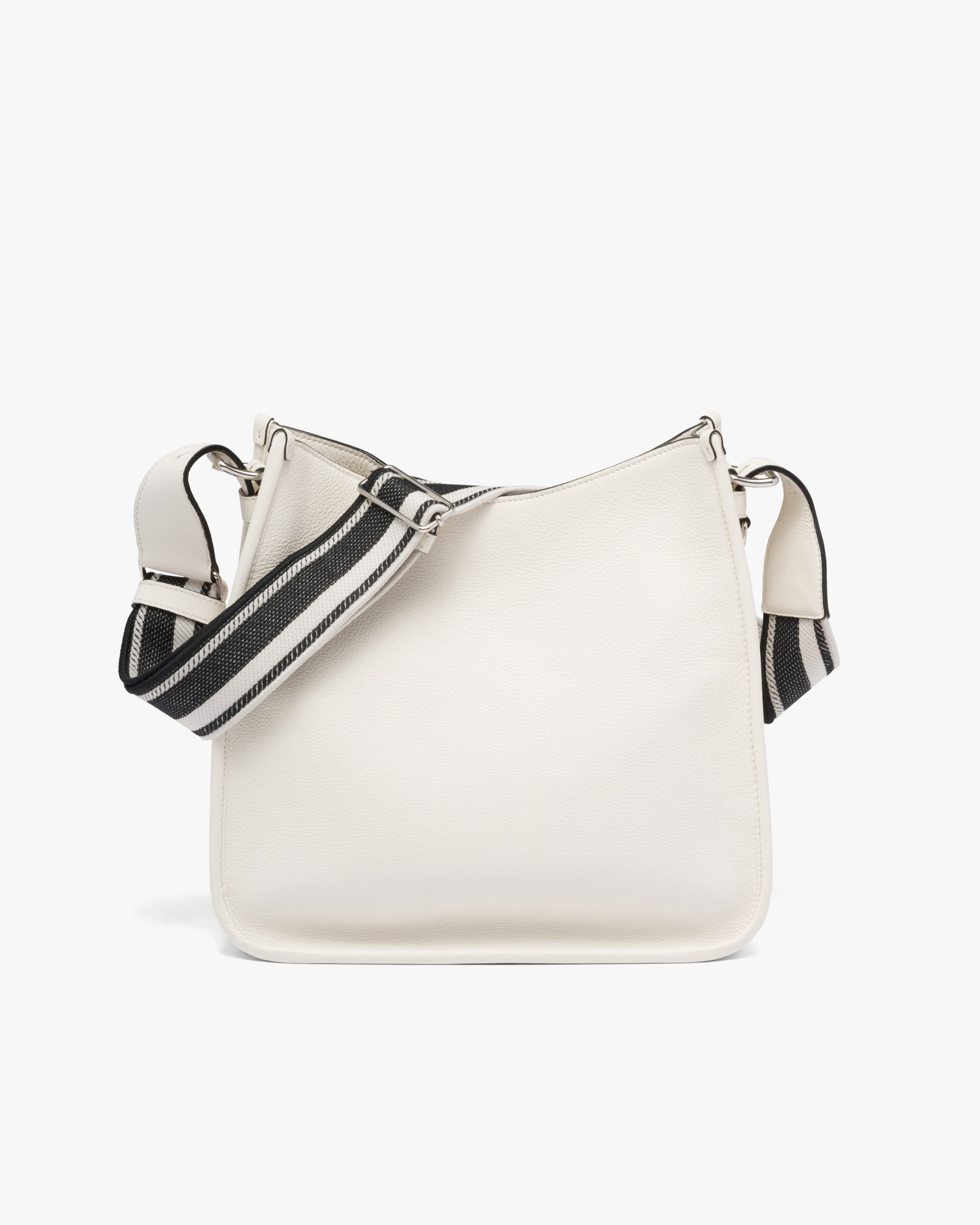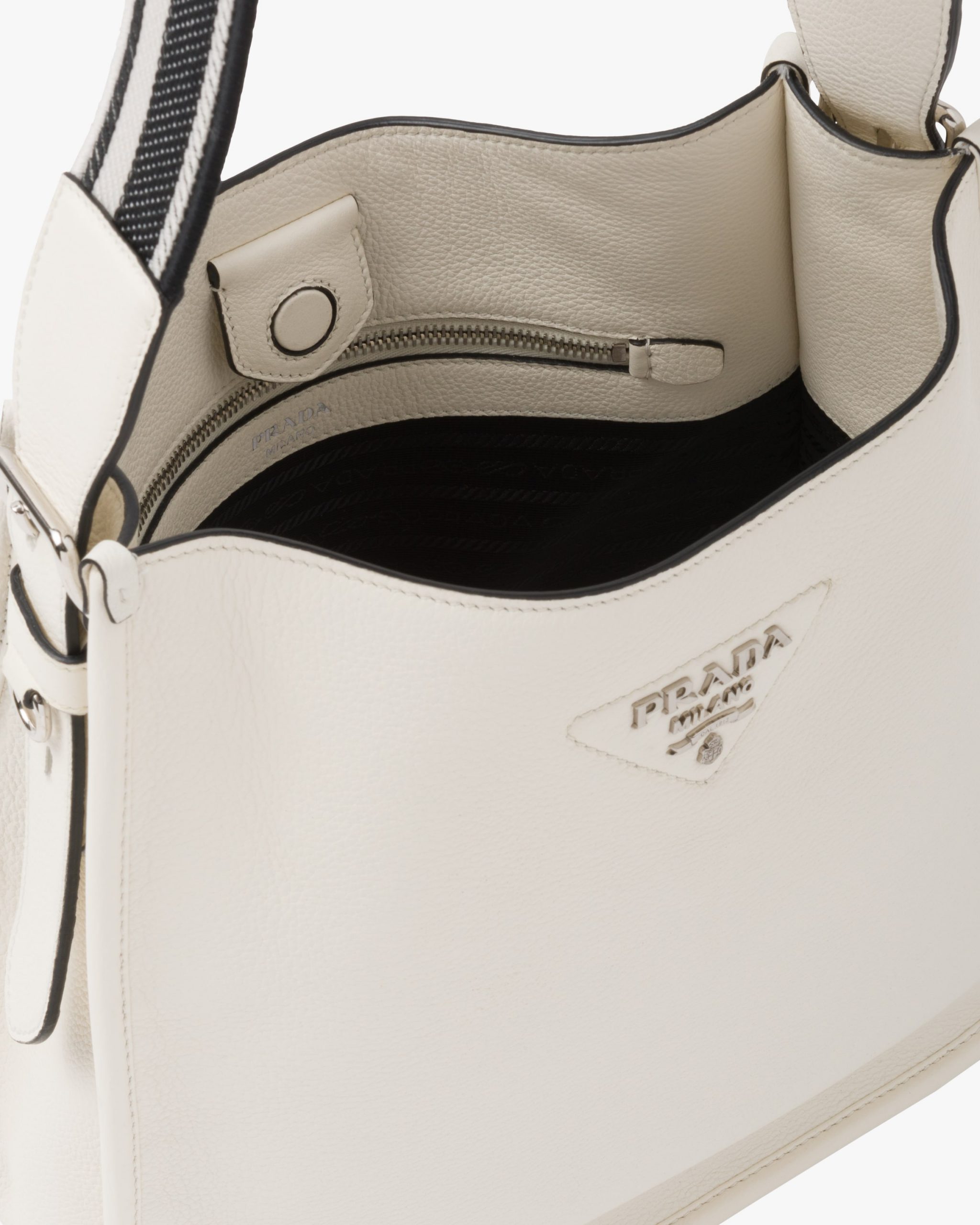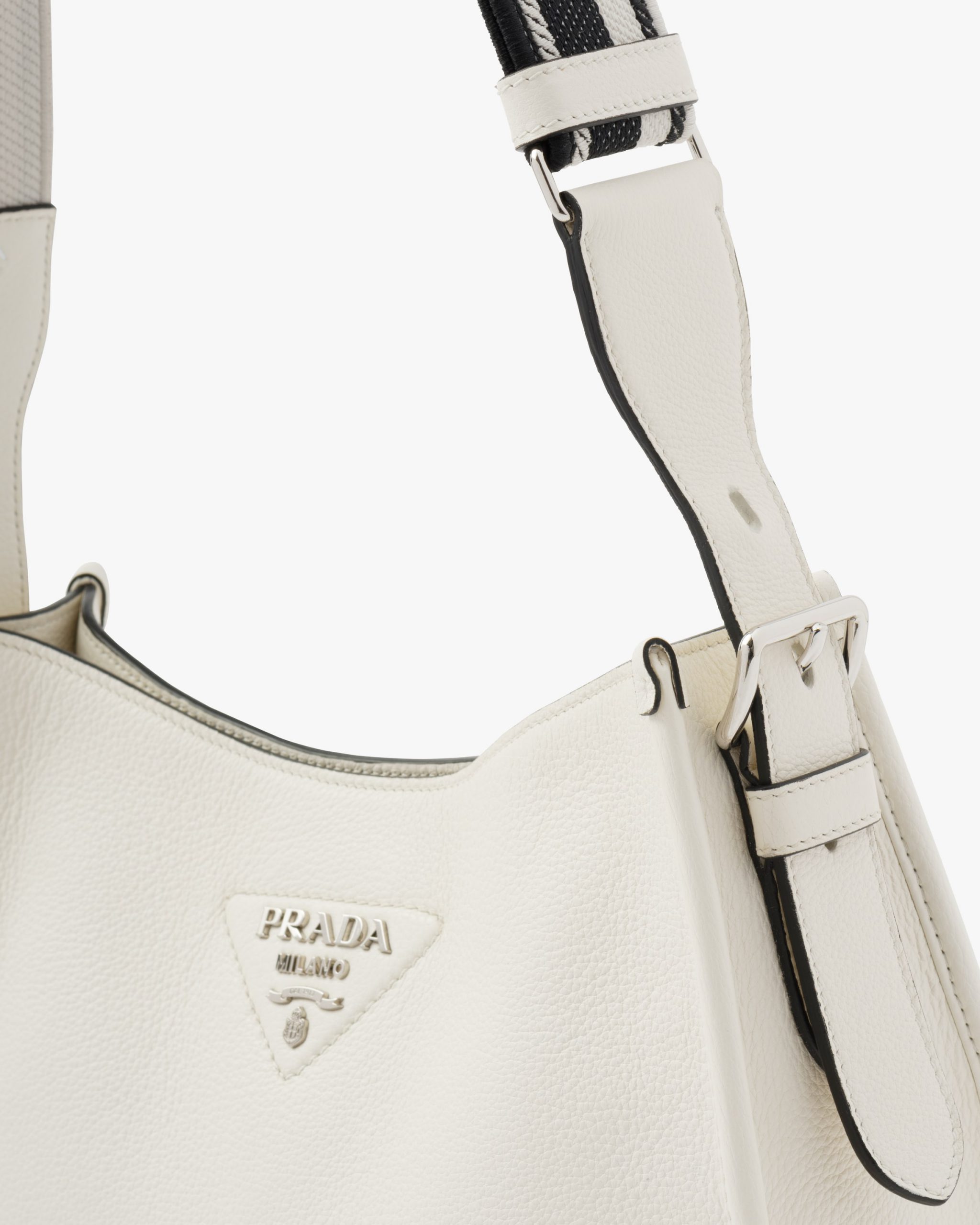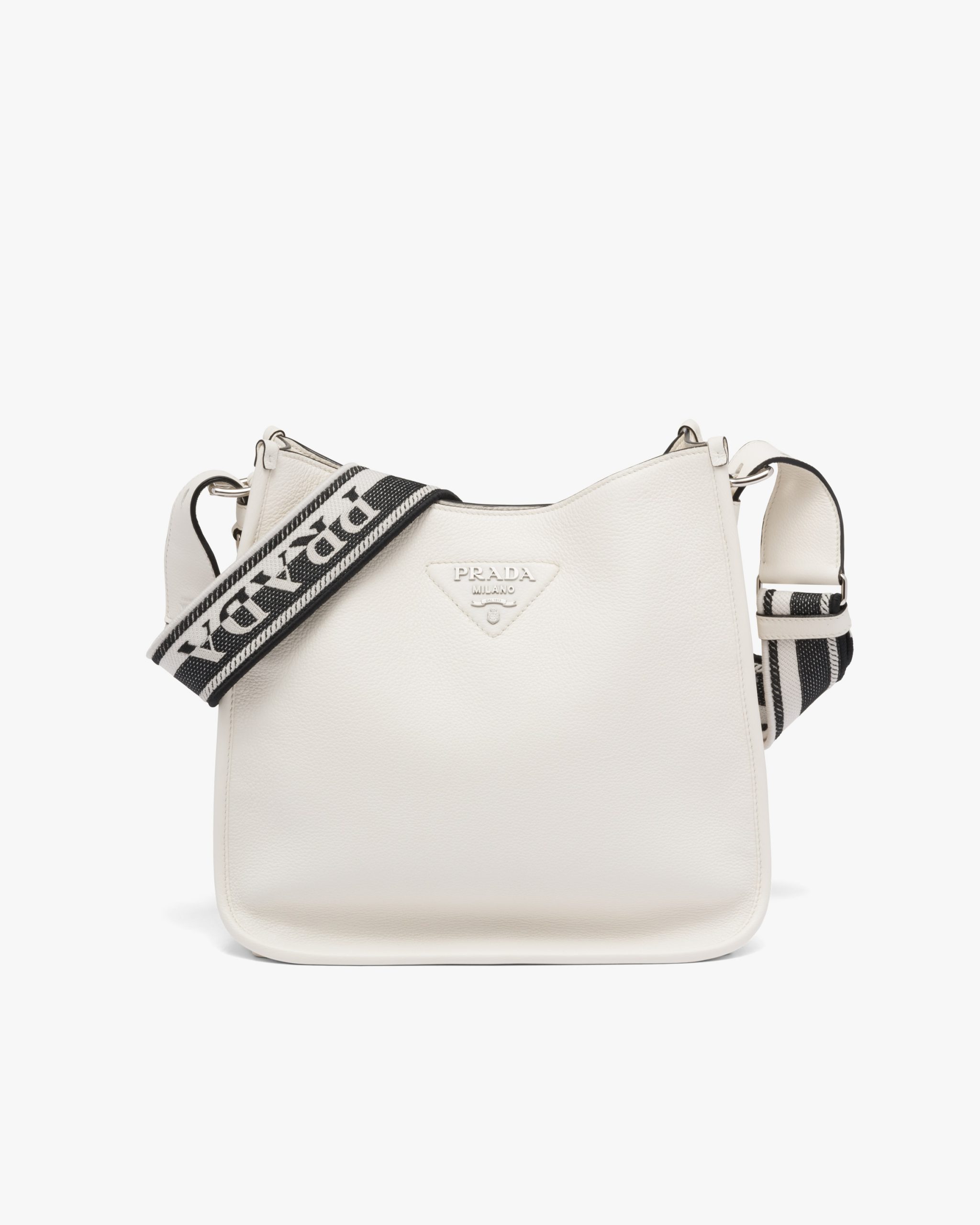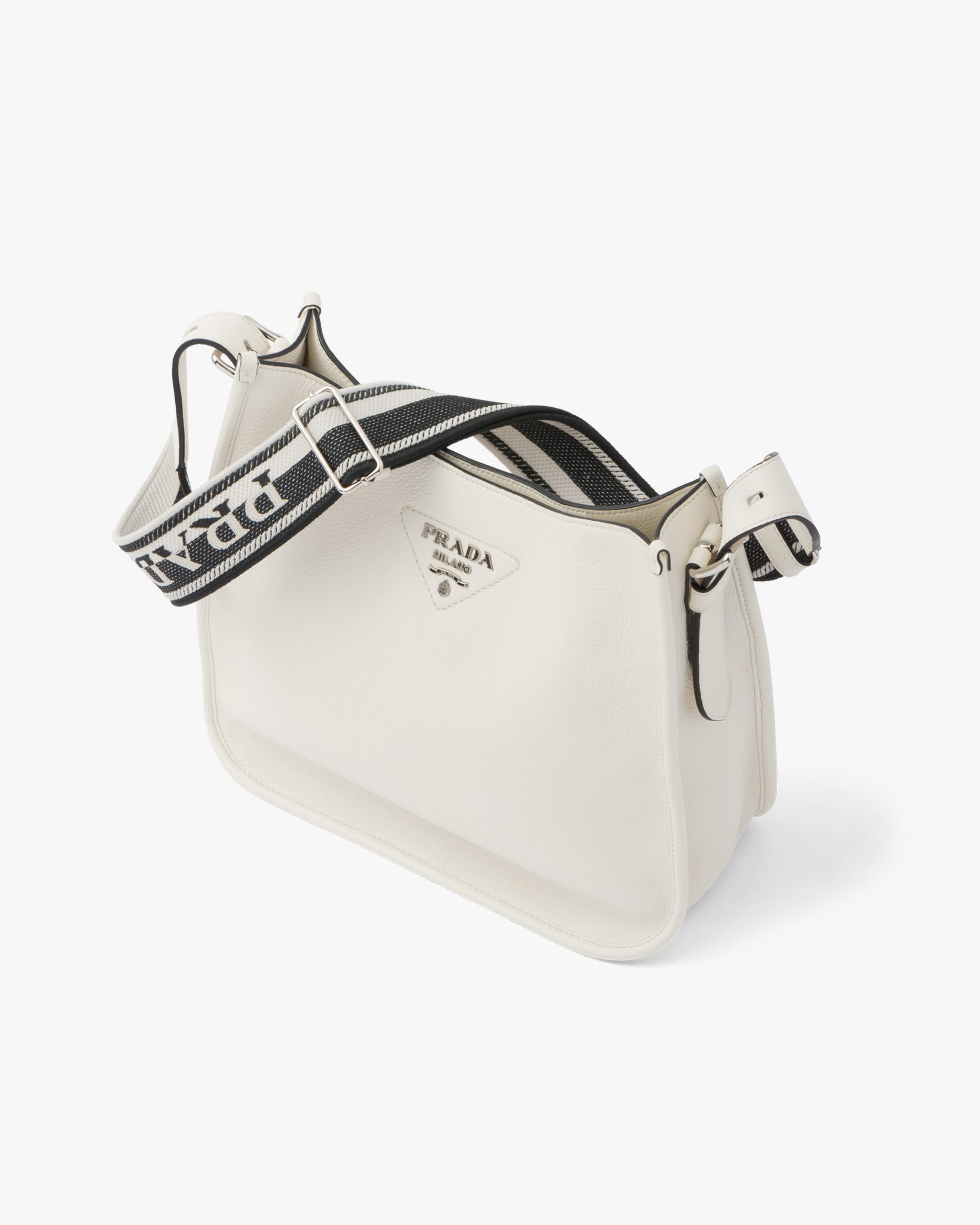 This soft Prada Flou leather hobo bag with modern elegance is adorned with the metal lettering logo illuminating the front. The adjustable embroidered logo-print woven tape shoulder strap adds a sporty note.