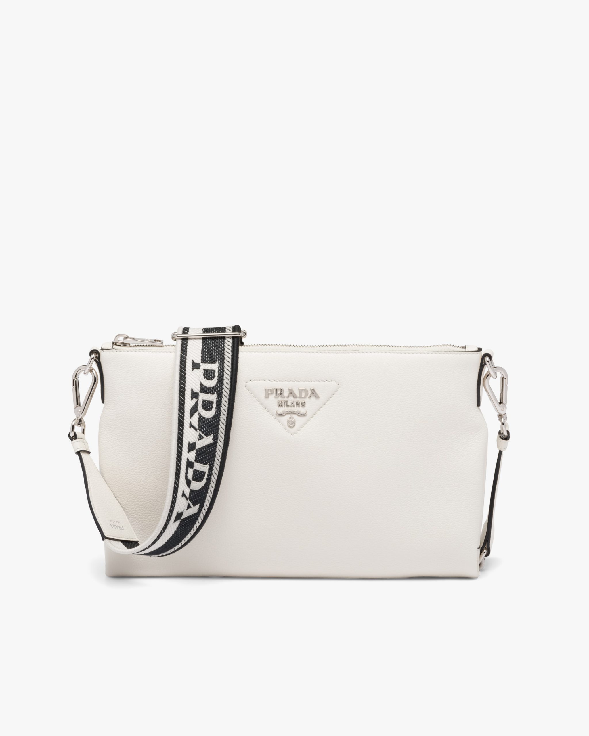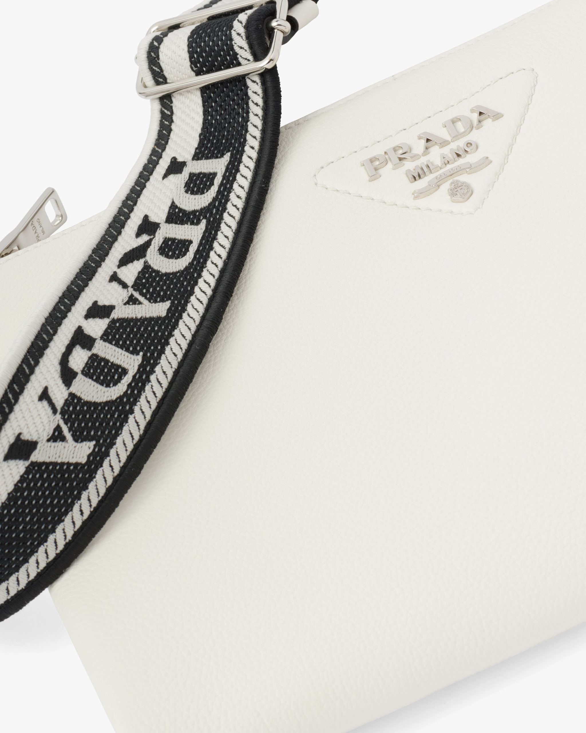 A geometric minimalist shape characterizes this Prada Flou small leather bag illuminated with the metal lettering logo on the front. The accessory is completed by the detachable woven tape shoulder strap embroidered with the logo in a contrasting color, that makes it wearable as a crossbody or shoulder bag.