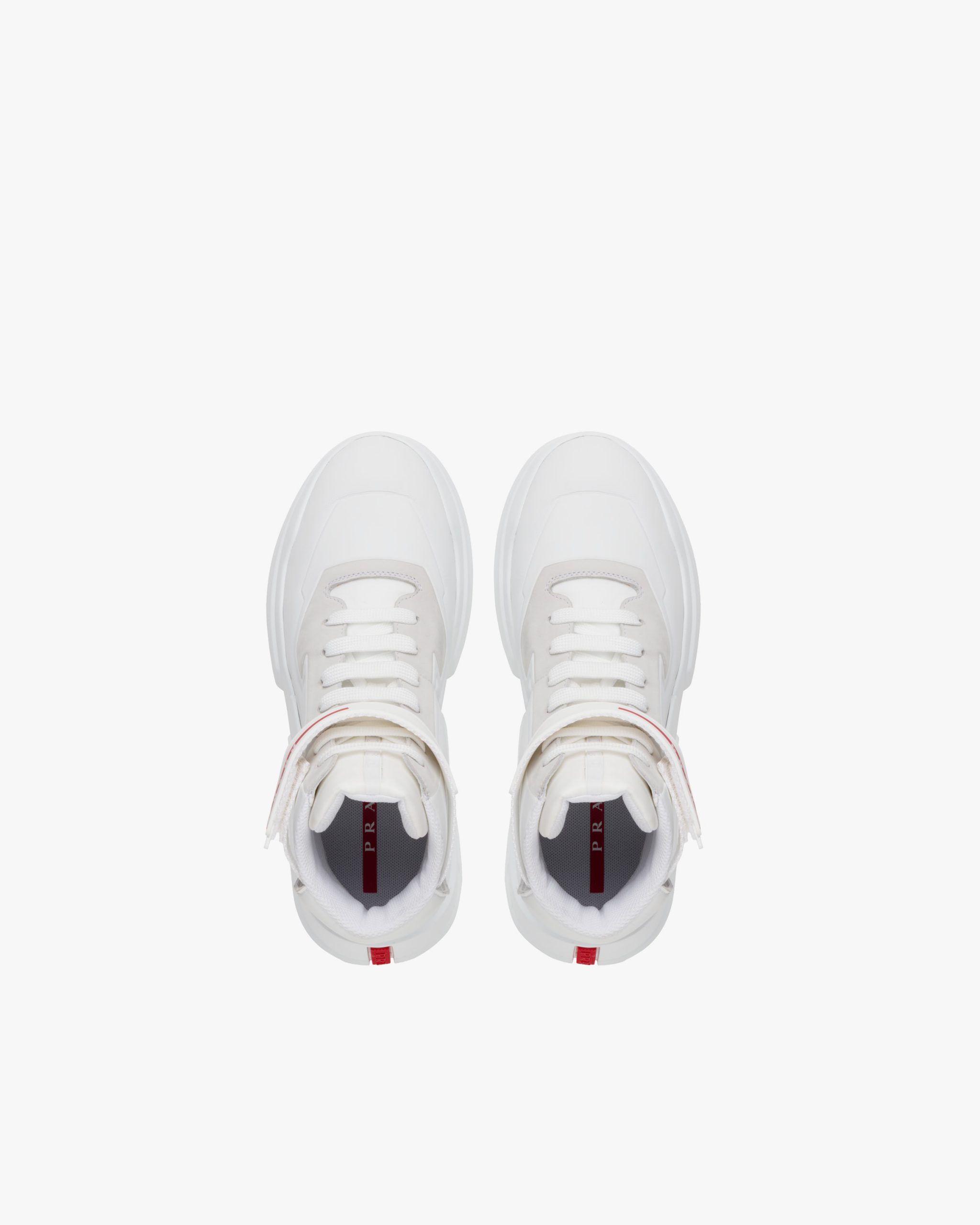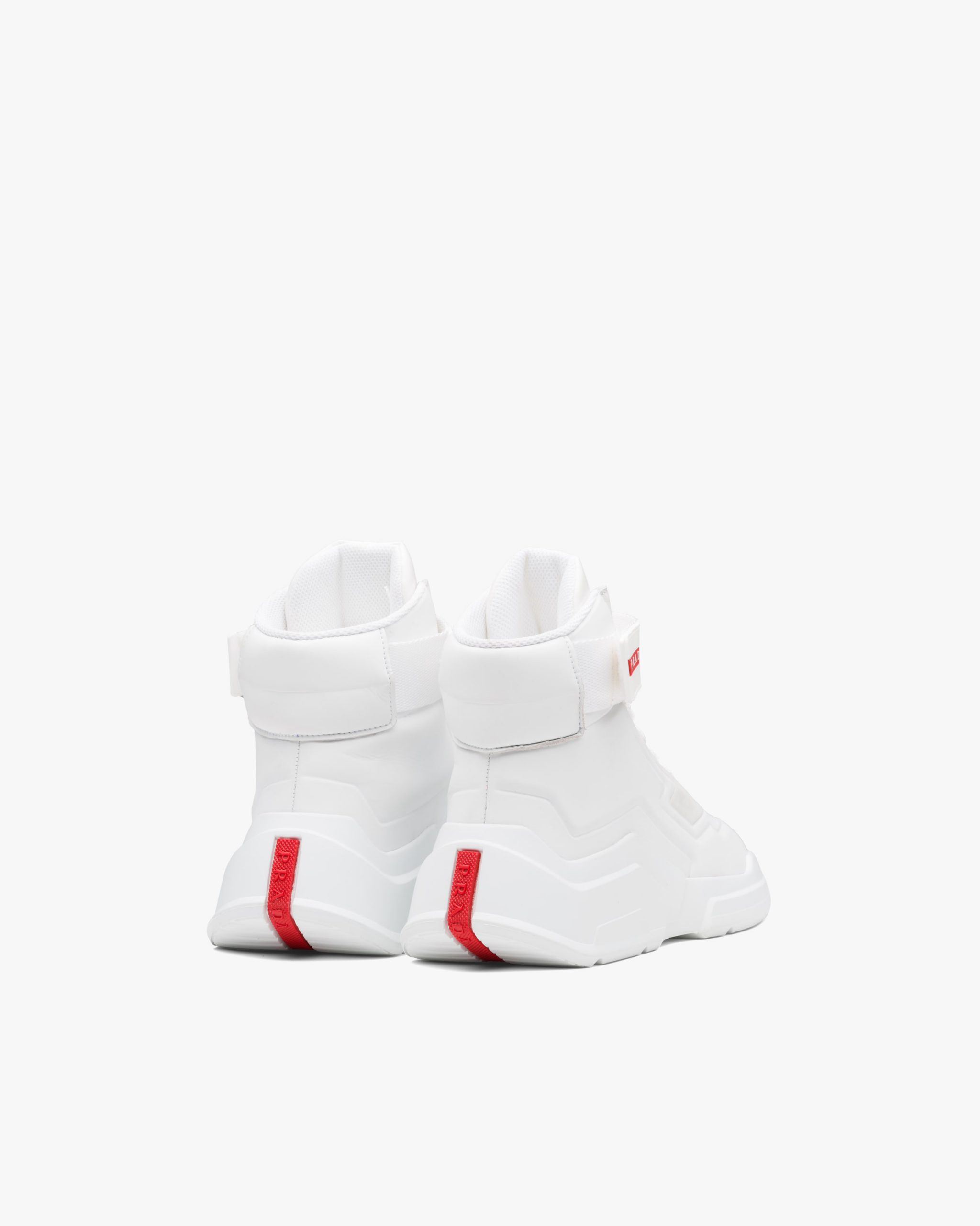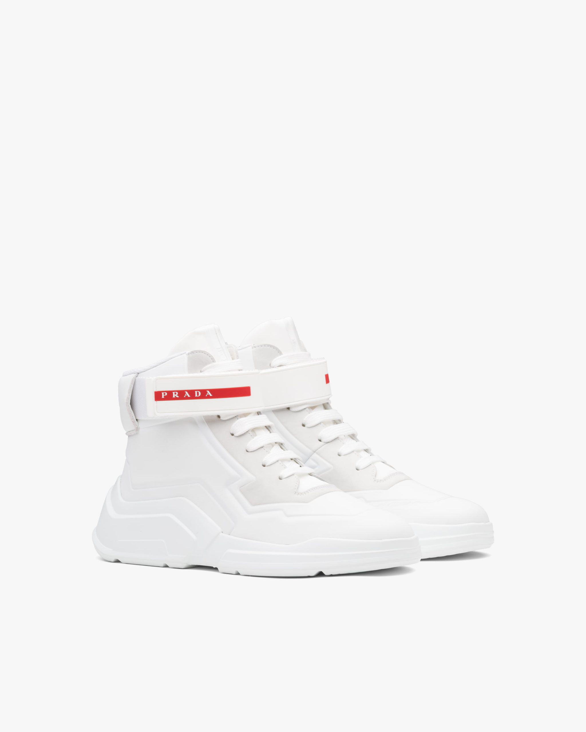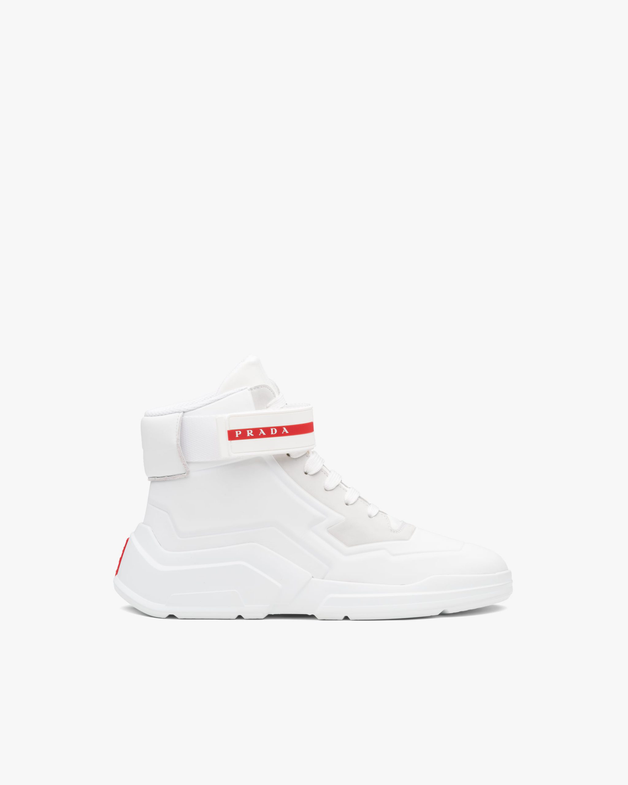 These leather high-top sneakers characterized by the hook and loop fastener strap with Prada Linea Rossa logo have a futuristic design.