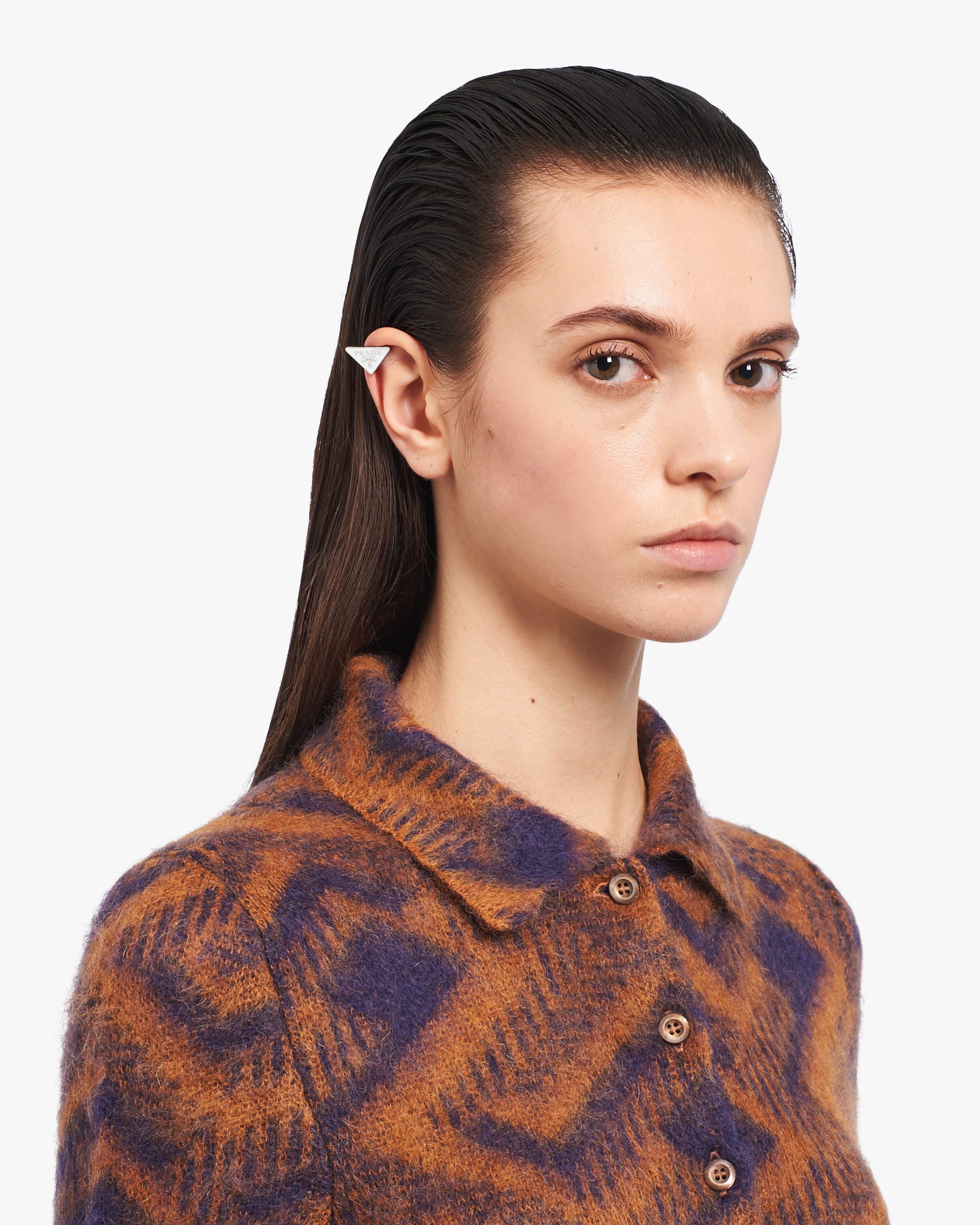 The sleek, iconic triangle logo is the protagonist of a new jewelry line made of 925 sterling silver that reinterprets punk influences in a modern way. Prada’s historic code with an enamel finish defines this single clip earring.