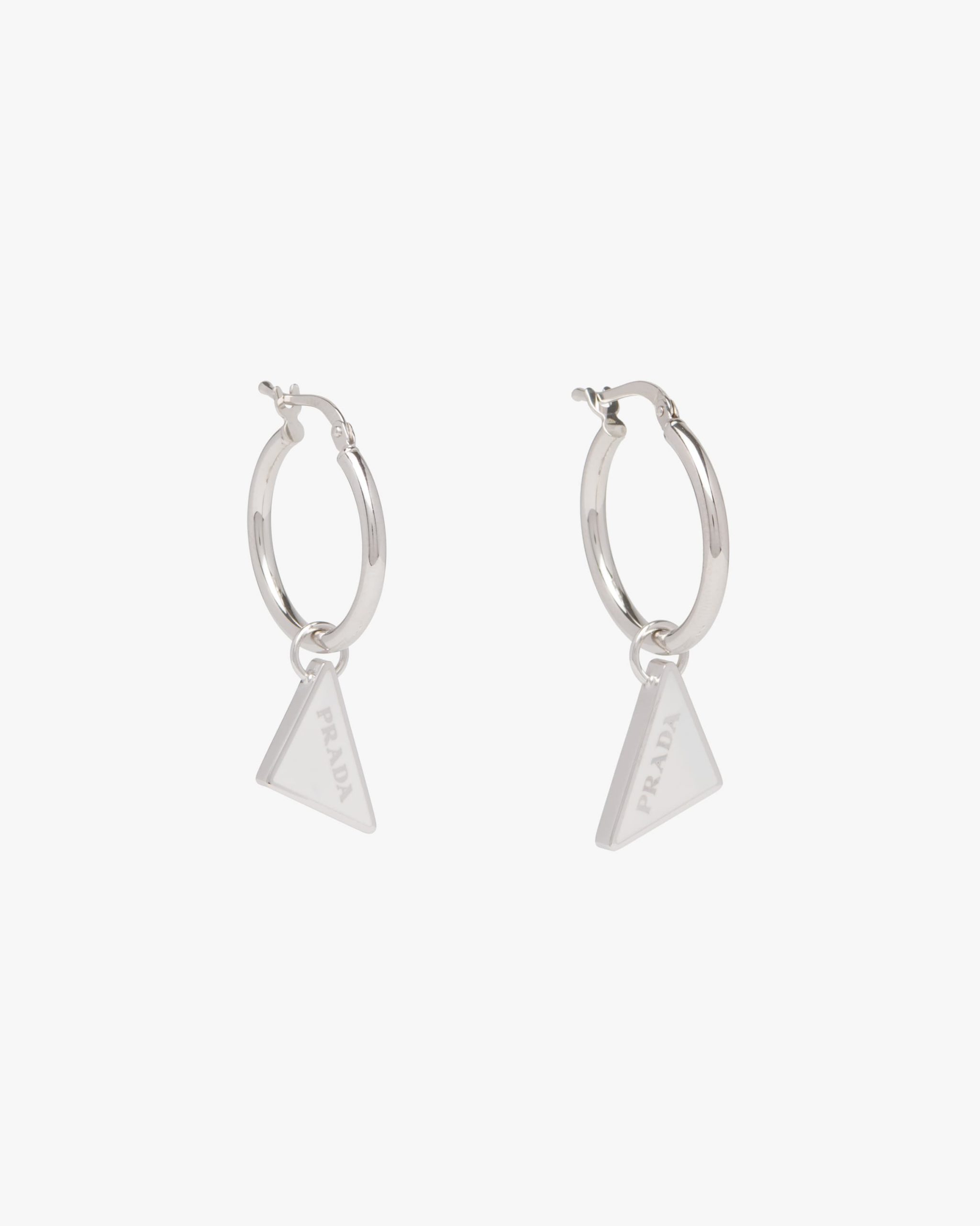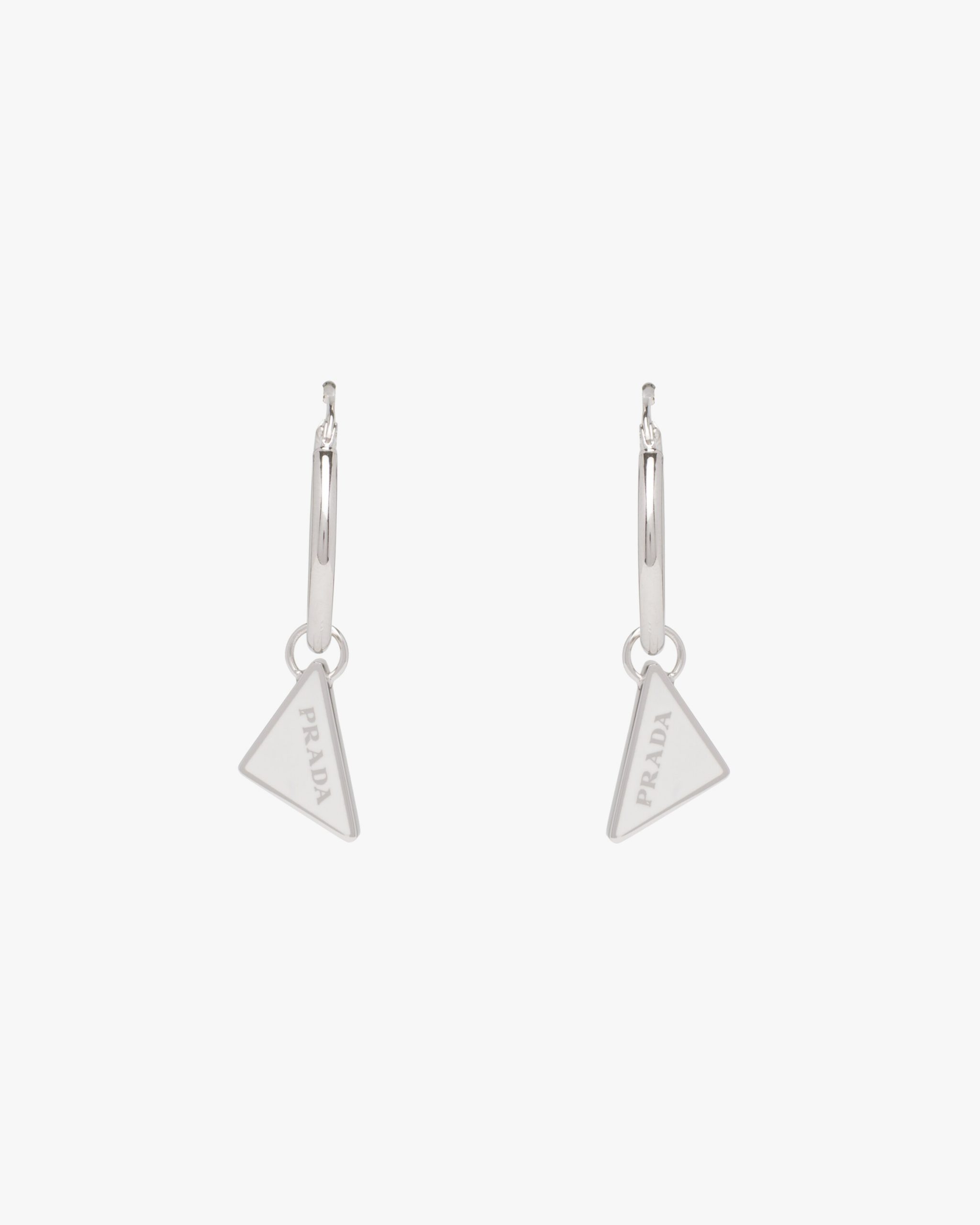 The Prada enamel triangle logo returns as a delicate detail on these delicate enameled drop earrings. Iconic and sleek in form, the triangle logo is the protagonist of a new line of jewels made of 925 sterling silver, which reinterprets punk influences in a modern way.