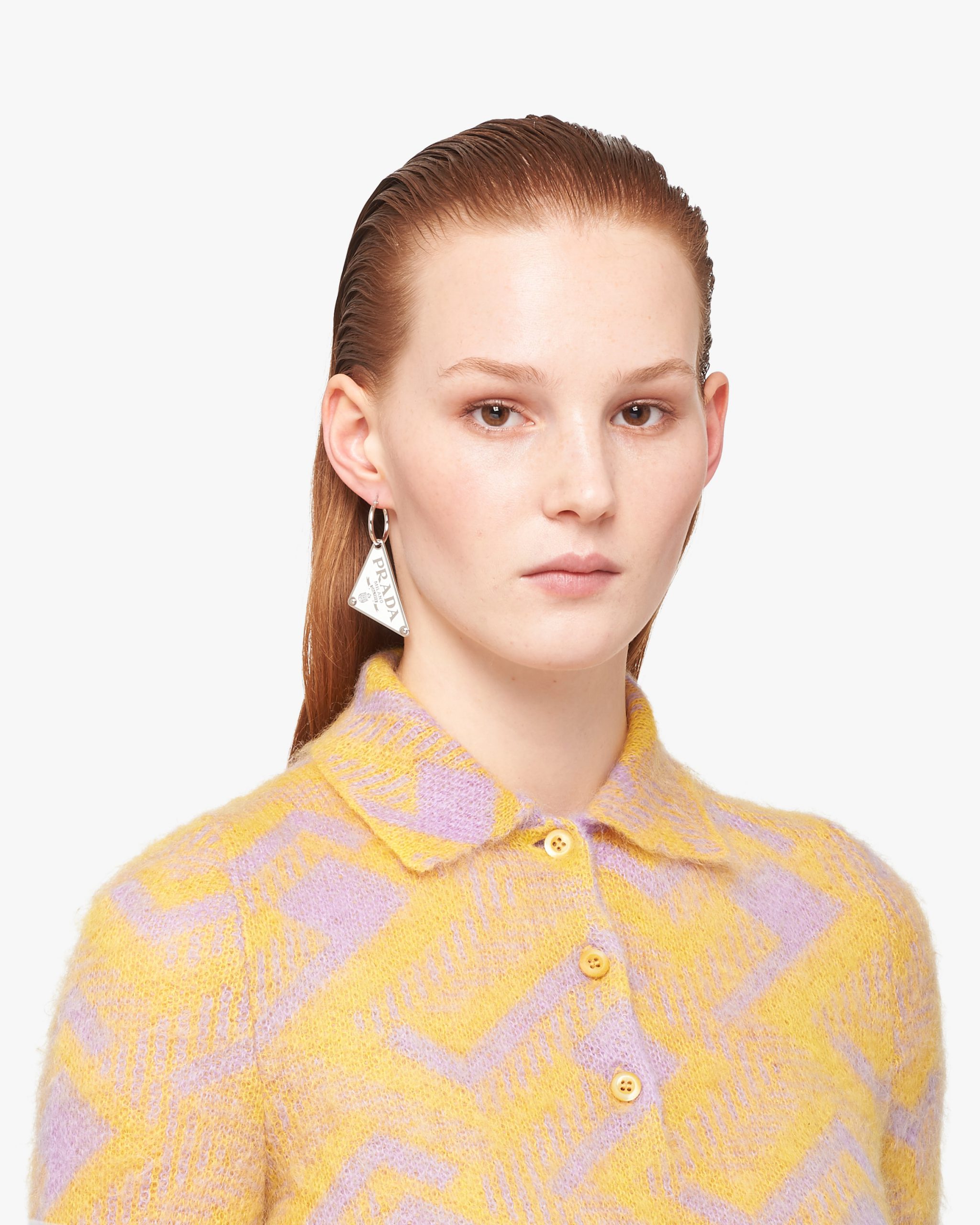 Iconic and sleek, the triangle logo is the protagonist of a new line of jewelry made of 925 sterling silver that reinterprets punk influences in a modern way. Prada’s historic symbol decorated with enamel defines this single earring.
