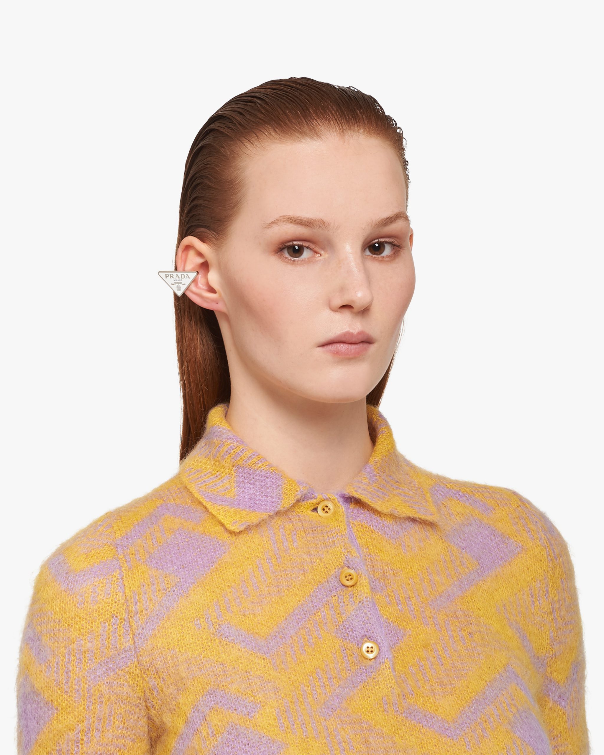 Prada’s historic symbol decorated with enamel defines this single earring worn on the right. Iconic and sleek, the triangle logo is the protagonist of a new line of jewelry made of 925 sterling silver that reinterprets punk influences in a modern way.