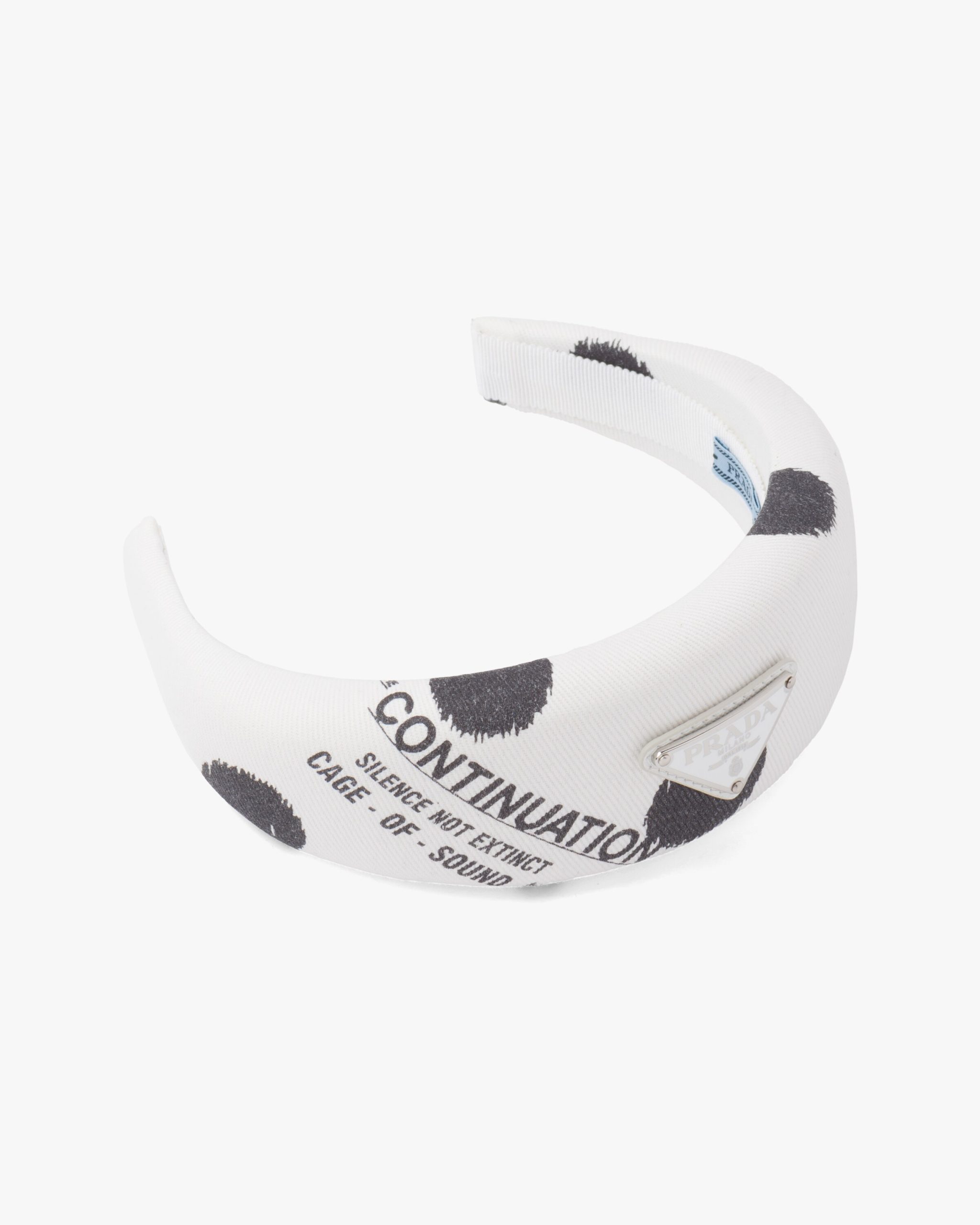 A sophisticated and emblematic accessory of Prada collectsions, the puffy headband with a beguiling rounded design presents always new reinterpretations. A maxi dot print decorates this accessory in Re-Nylon, a regenerated nylon yarn made of recycled, purified plastic materials collectsed in the ocean, fishing nets, and textile waste fibers. The prints are transformed into contrasting graphic tools that interrupt and break up uniform surfaces.